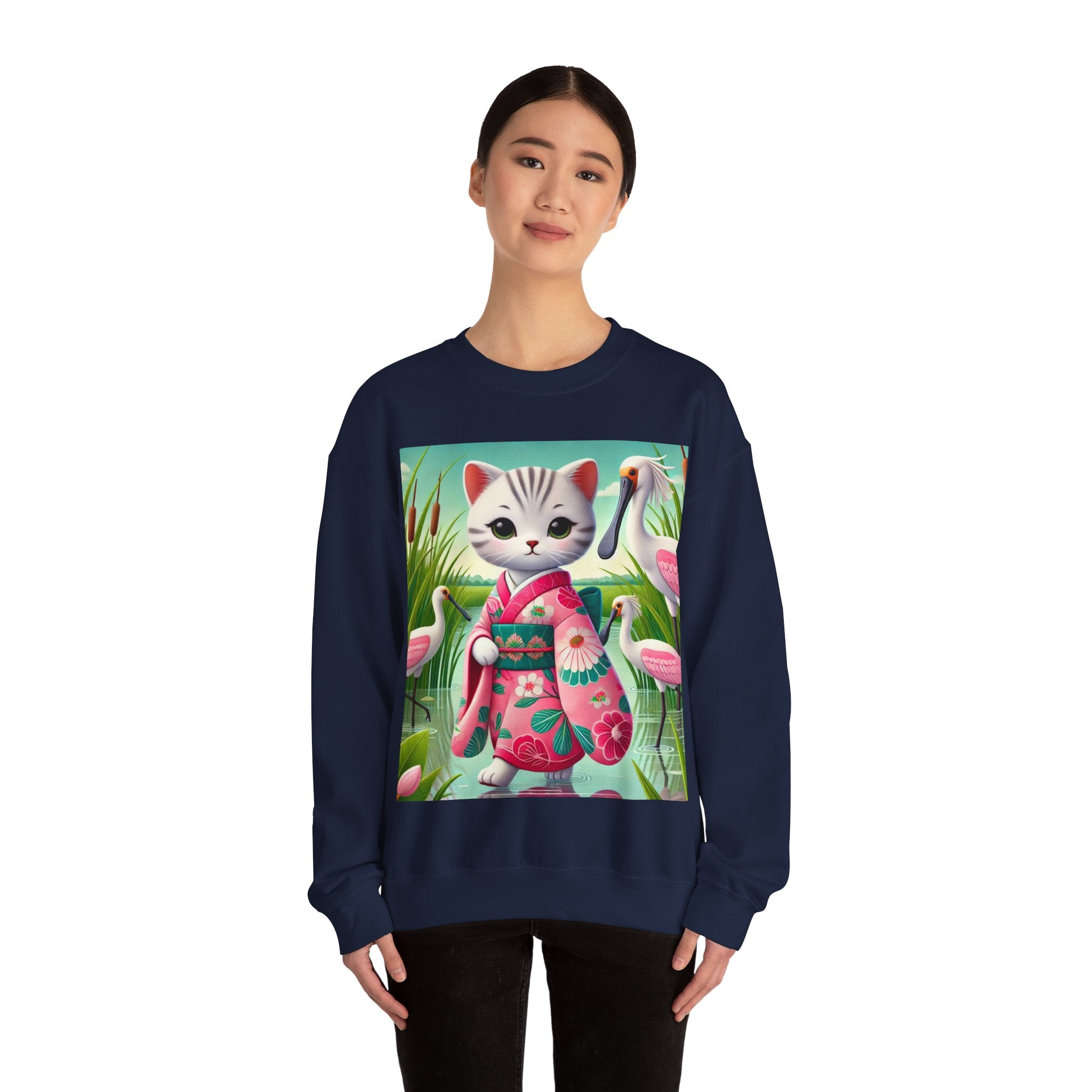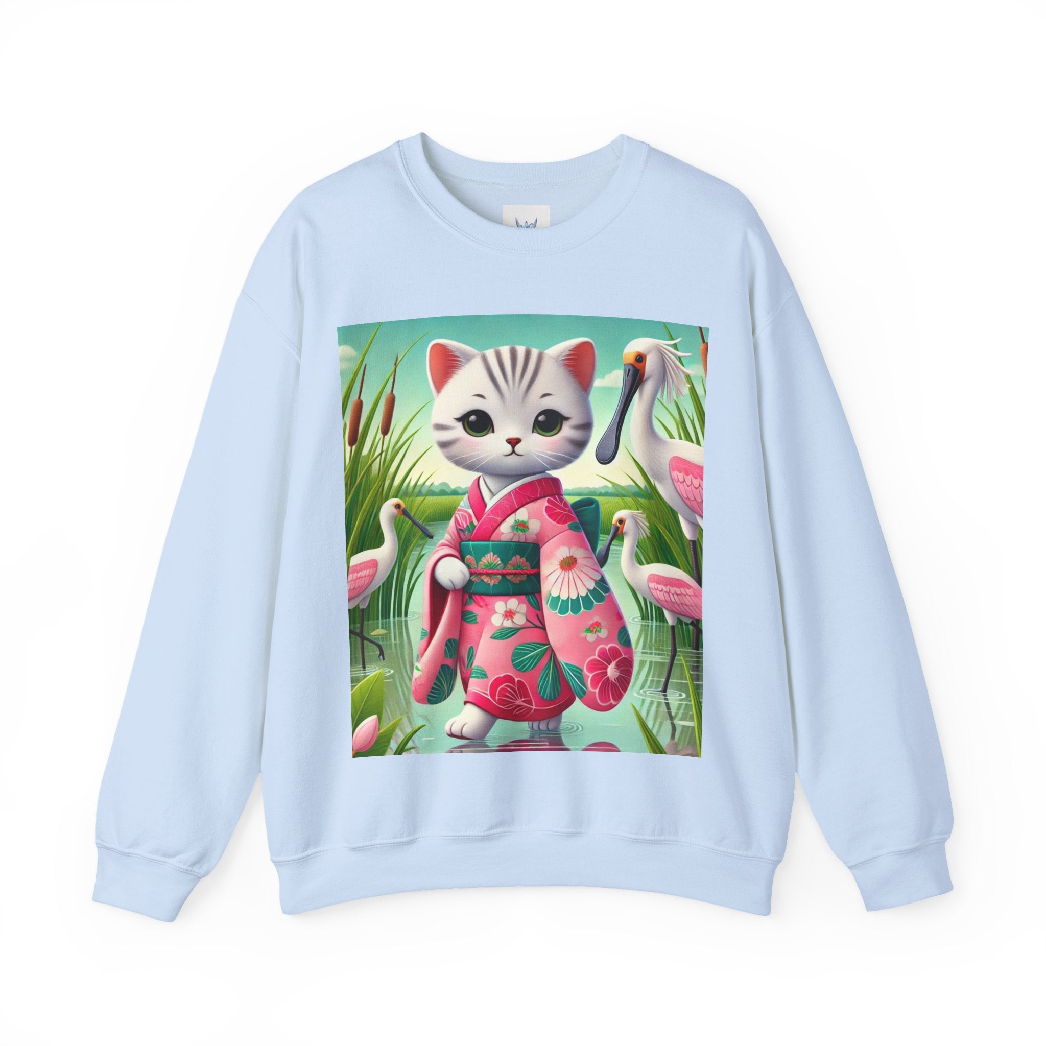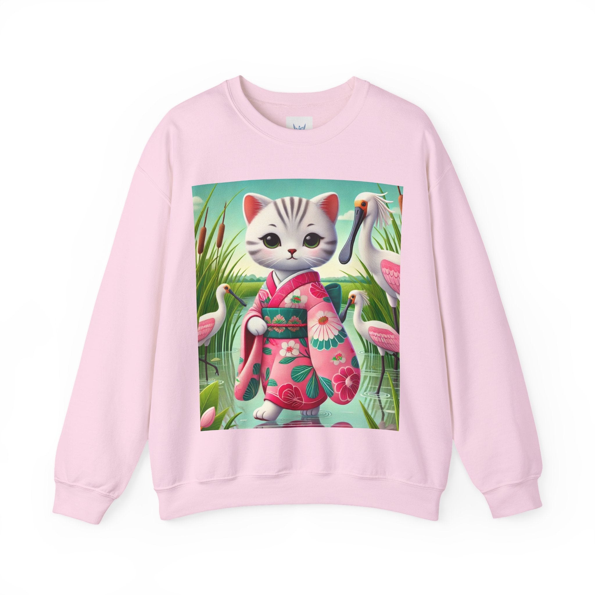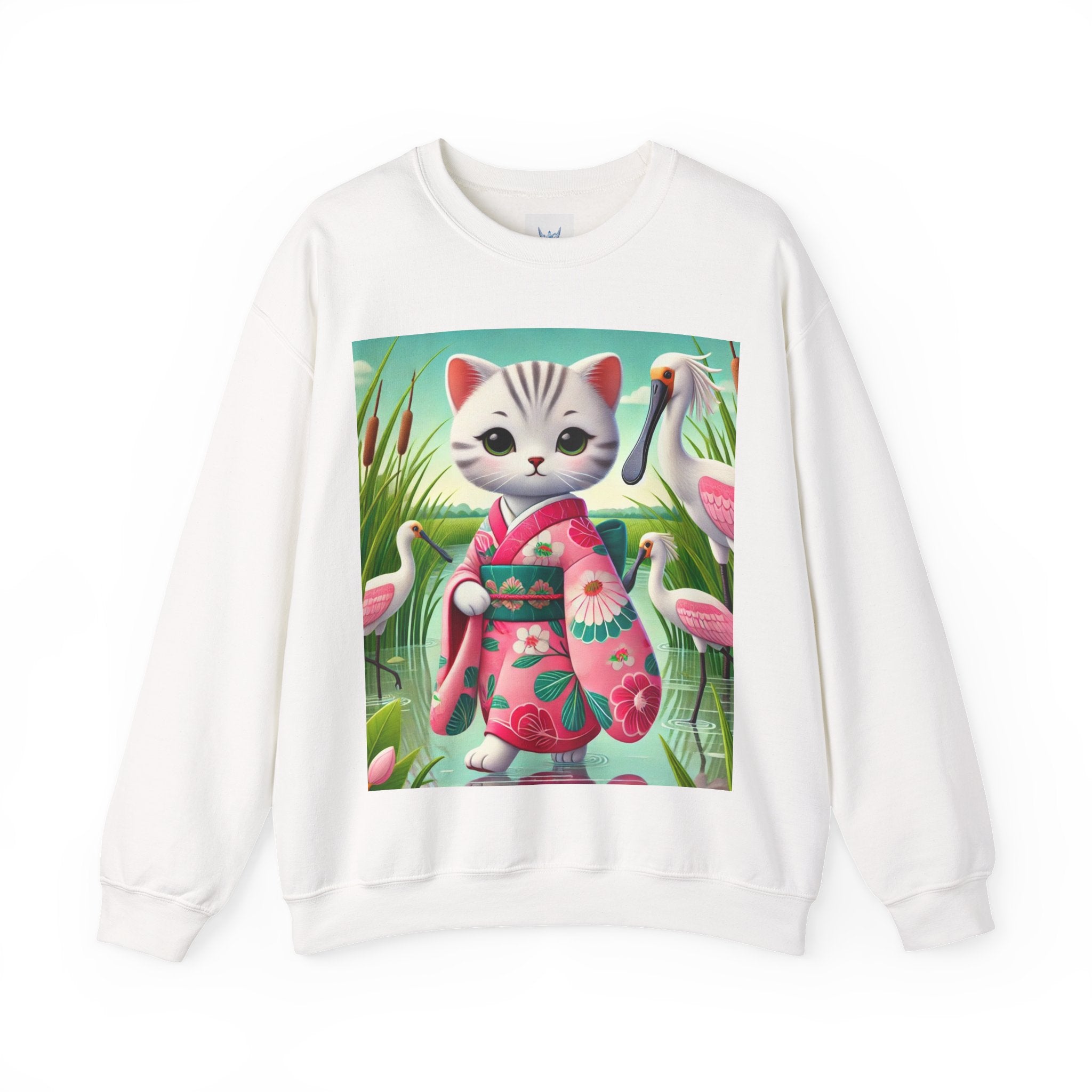 Geisha Kitten Strolls Among the Spoonbills Unisex Heavy Blend™ Crewneck Sweatshirt brings a touch of serene charm and whimsical elegance to everyday wear. This Gildan 18000 sweatshirt is a unisex heavy blend crewneck made from a 50/50 cotton-polyester fabric, combining softness with lasting durability. Its smooth surface supports crisp, vibrant prints, while the seamless body design helps reduce irritation. A ribbed-knit collar and reinforced cuffs help the fit hold steady through repeated wear, making it a practical and comfortable layer for cooler days.