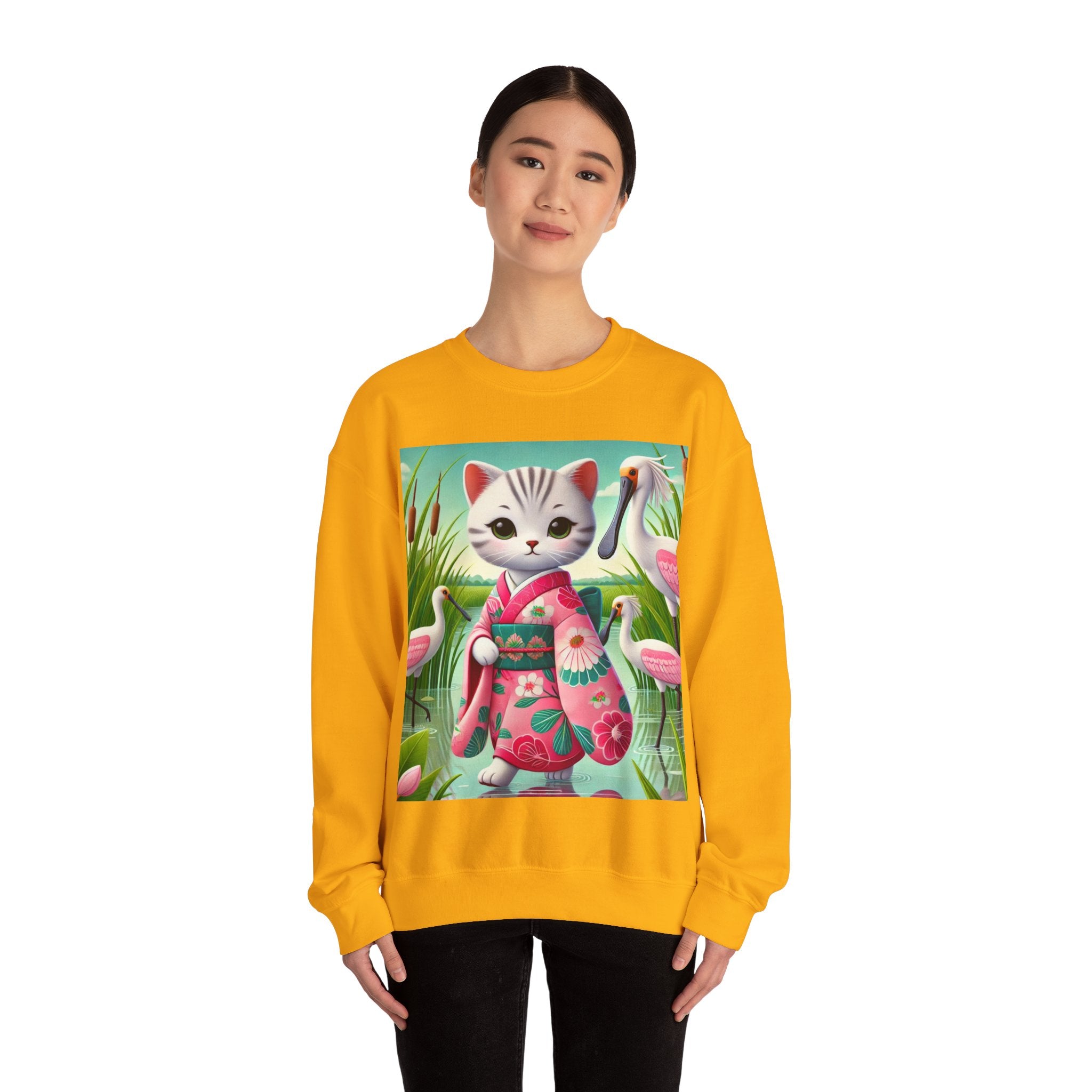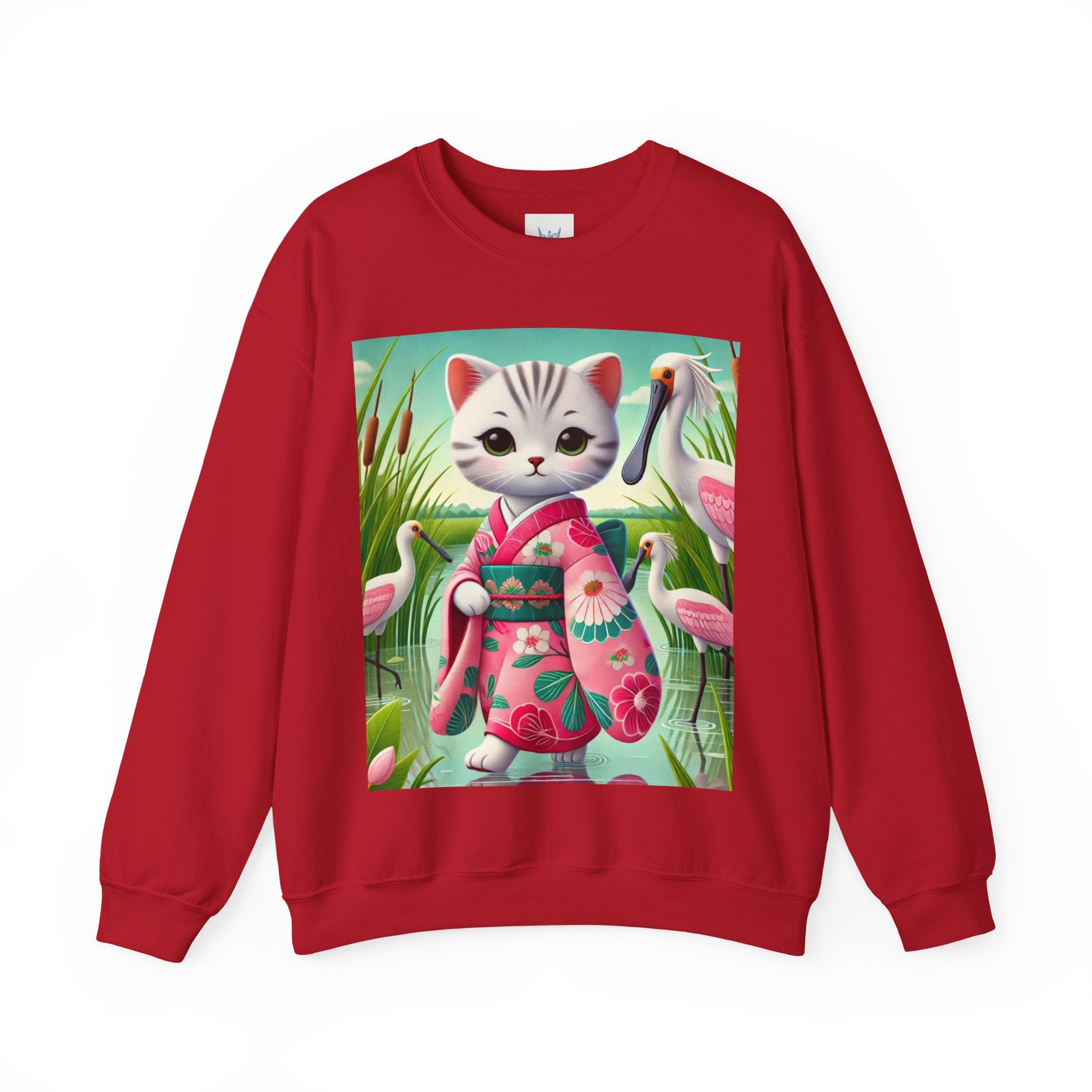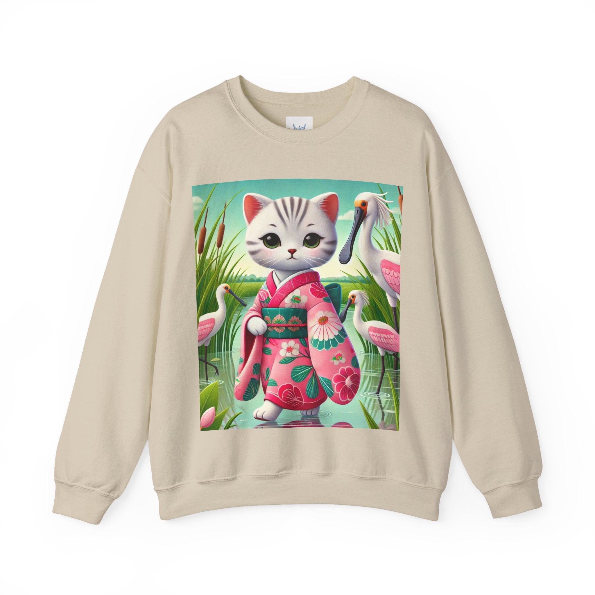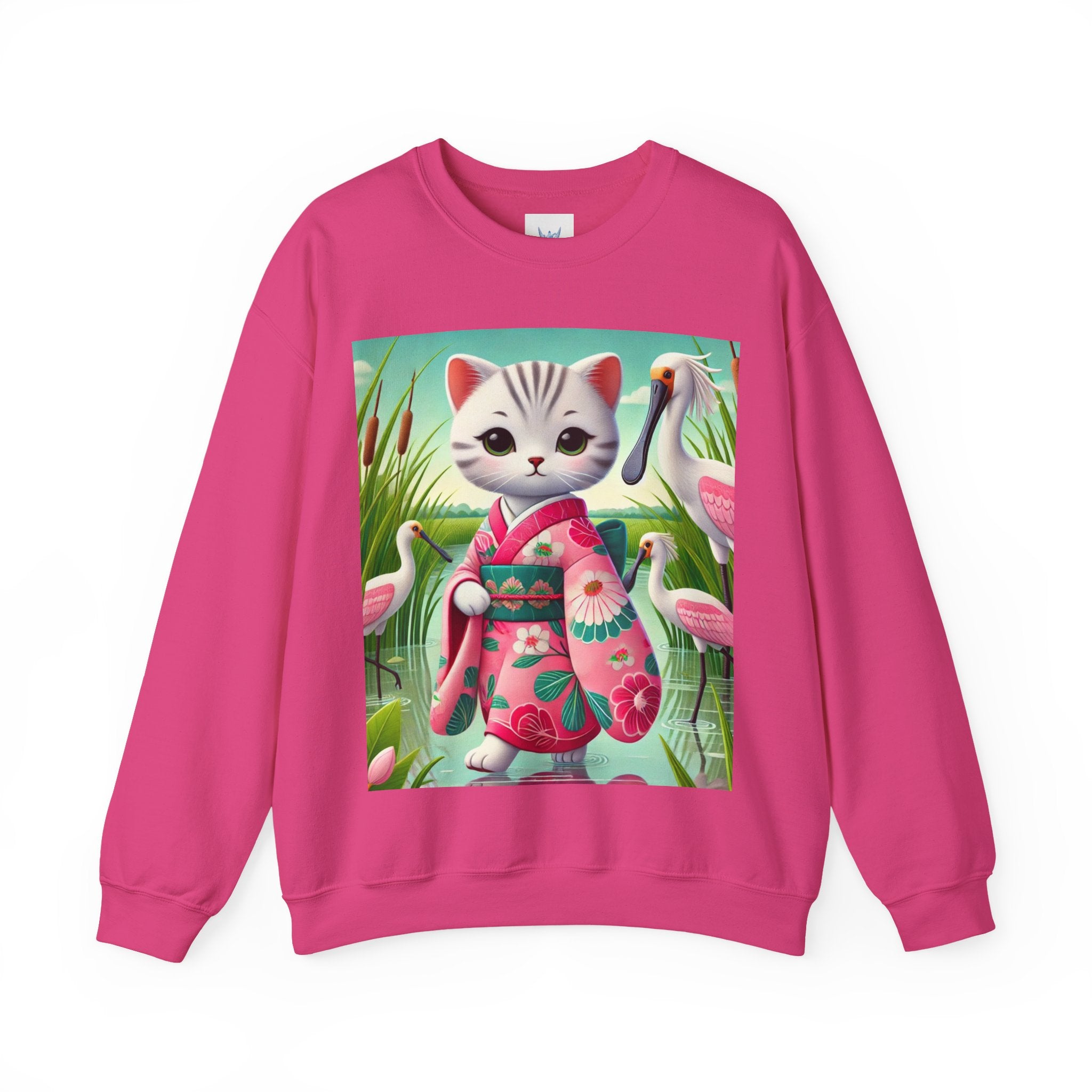 Geisha Kitten Strolls Among the Spoonbills Unisex Heavy Blend™ Crewneck Sweatshirt brings a touch of serene charm and whimsical elegance to everyday wear. This Gildan 18000 sweatshirt is a unisex heavy blend crewneck made from a 50/50 cotton-polyester fabric, combining softness with lasting durability. Its smooth surface supports crisp, vibrant prints, while the seamless body design helps reduce irritation. A ribbed-knit collar and reinforced cuffs help the fit hold steady through repeated wear, making it a practical and comfortable layer for cooler days.