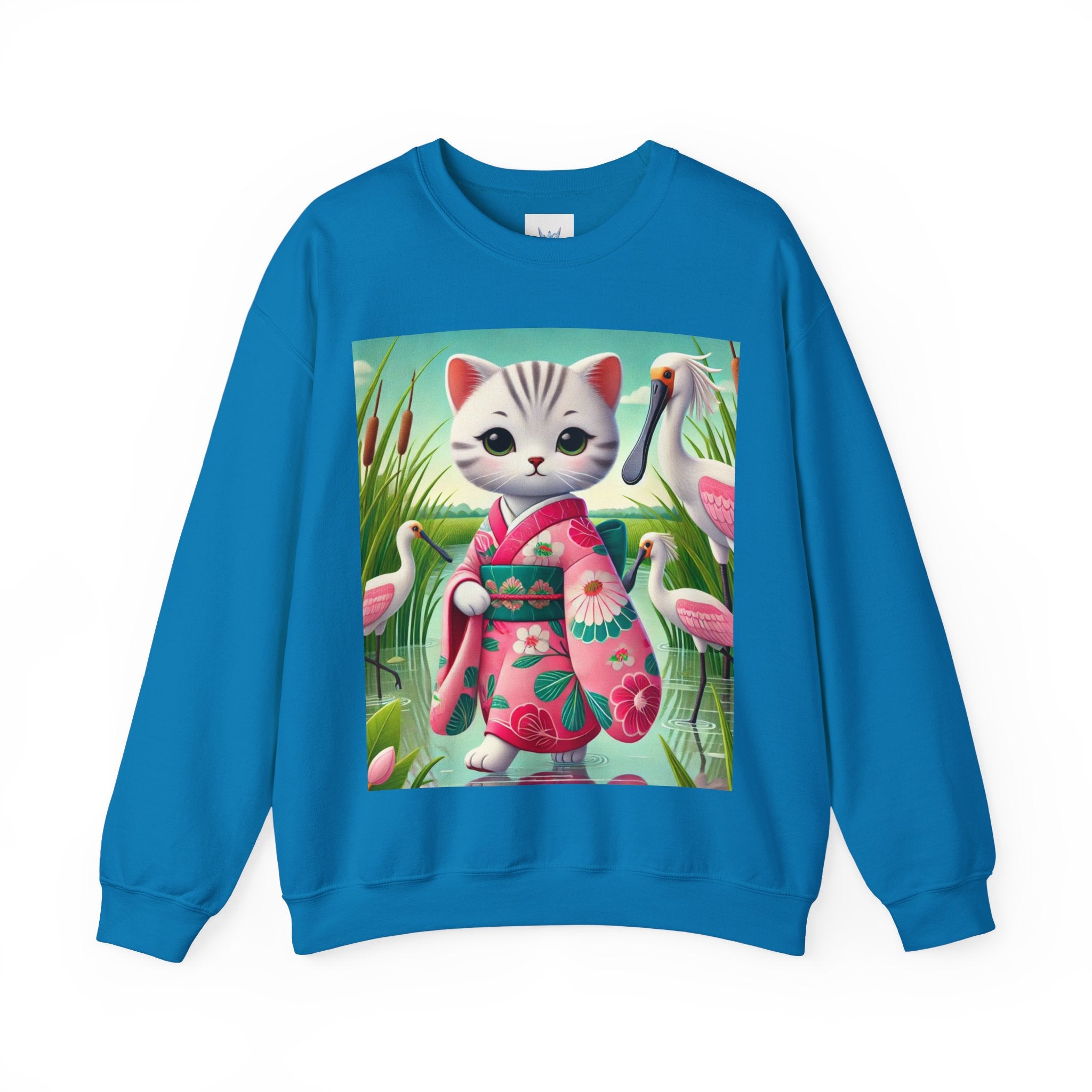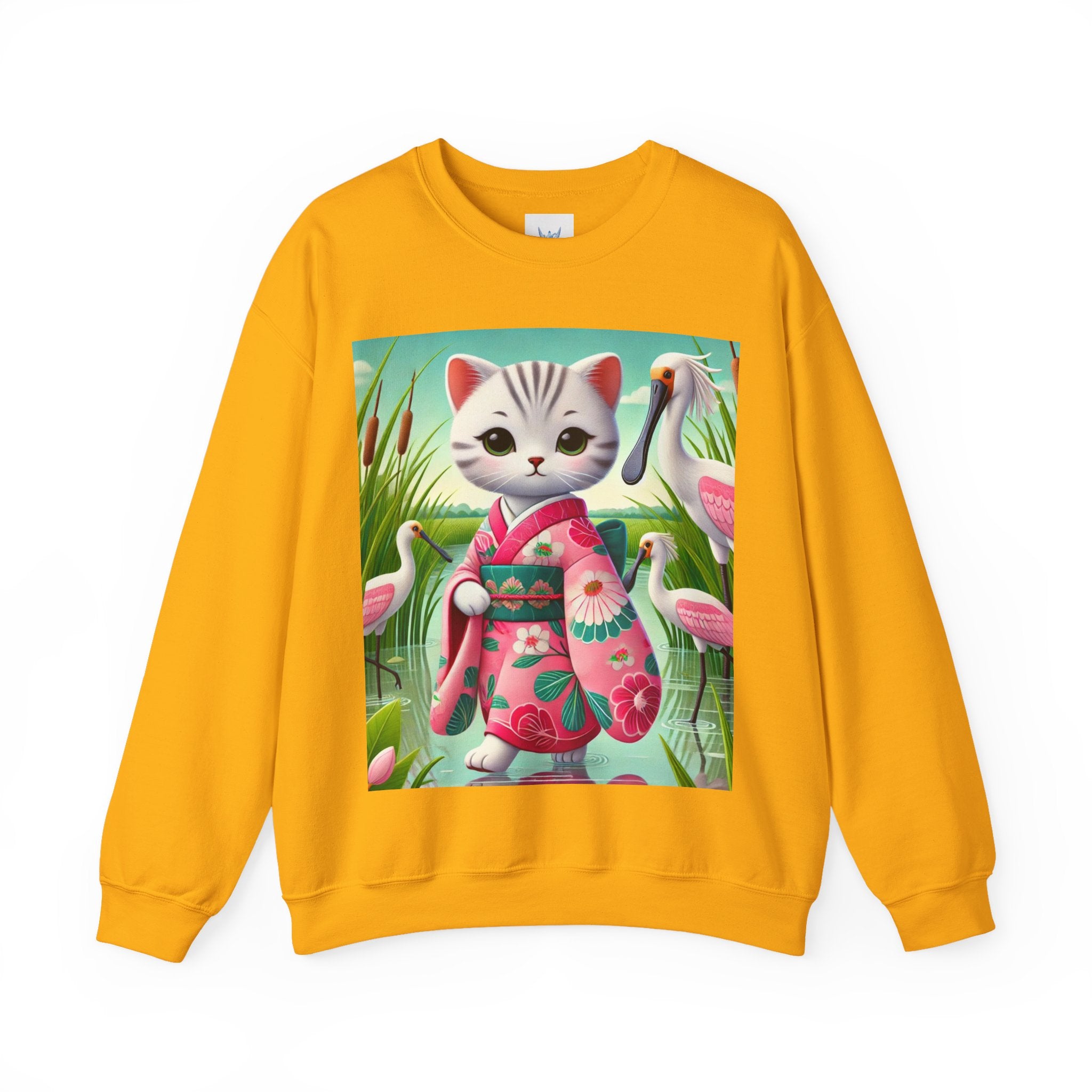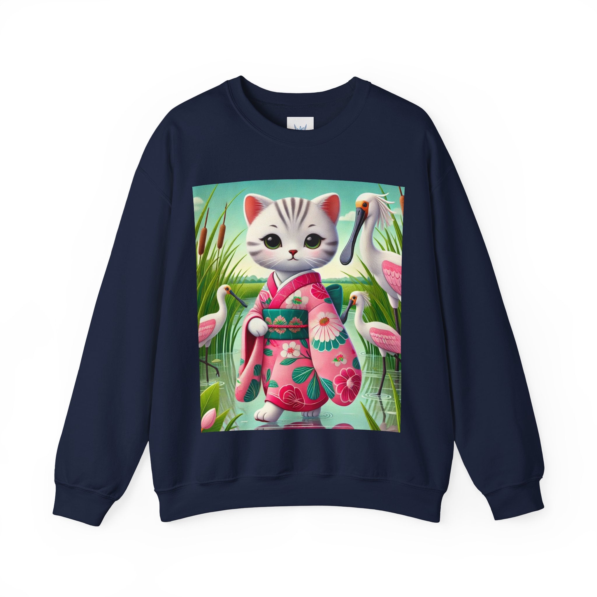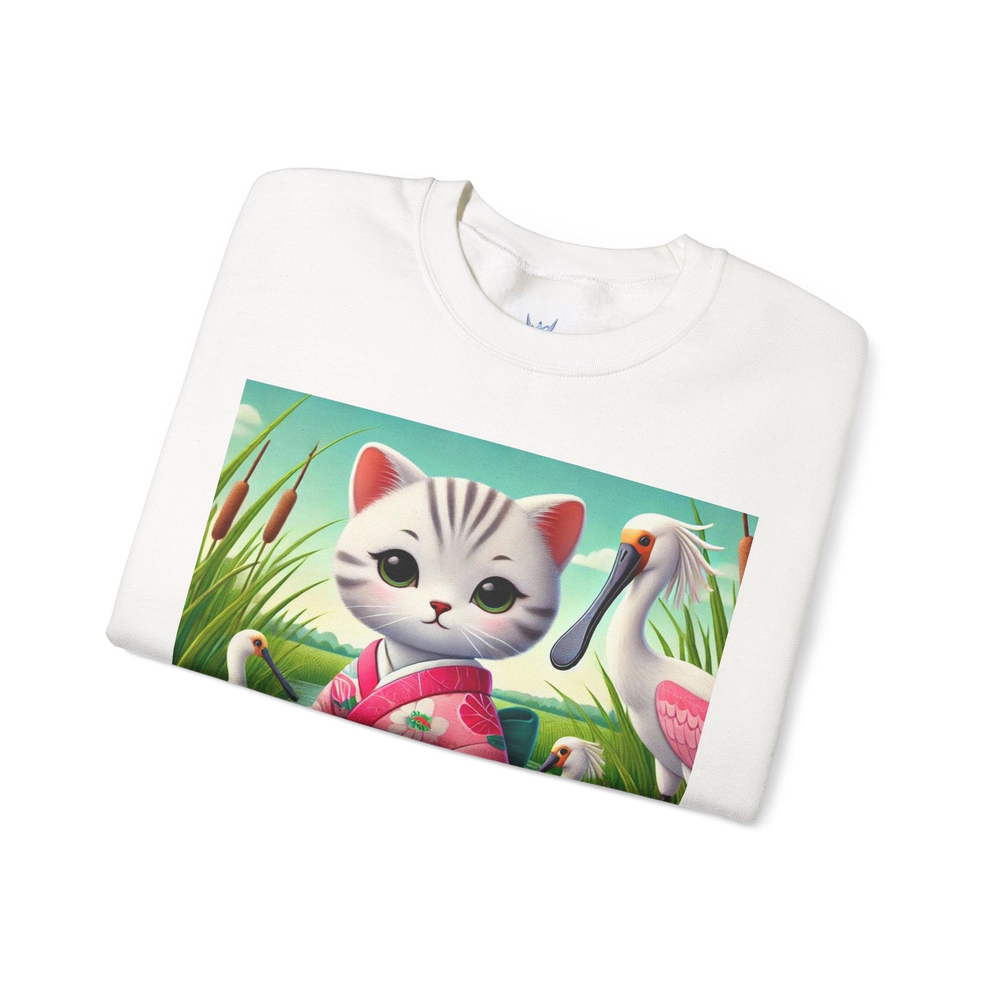 Geisha Kitten Strolls Among the Spoonbills Unisex Heavy Blend™ Crewneck Sweatshirt brings a touch of serene charm and whimsical elegance to everyday wear. This Gildan 18000 sweatshirt is a unisex heavy blend crewneck made from a 50/50 cotton-polyester fabric, combining softness with lasting durability. Its smooth surface supports crisp, vibrant prints, while the seamless body design helps reduce irritation. A ribbed-knit collar and reinforced cuffs help the fit hold steady through repeated wear, making it a practical and comfortable layer for cooler days.