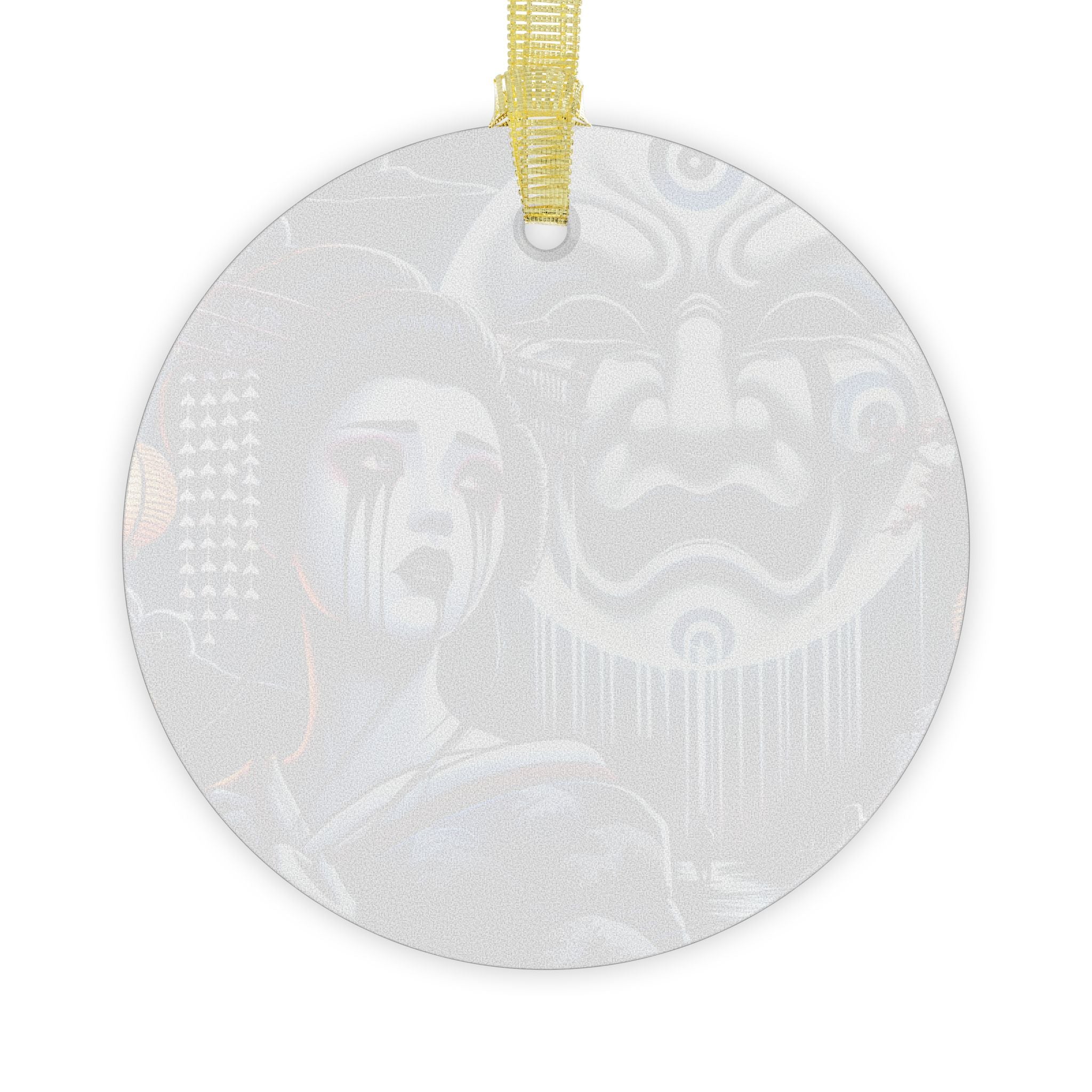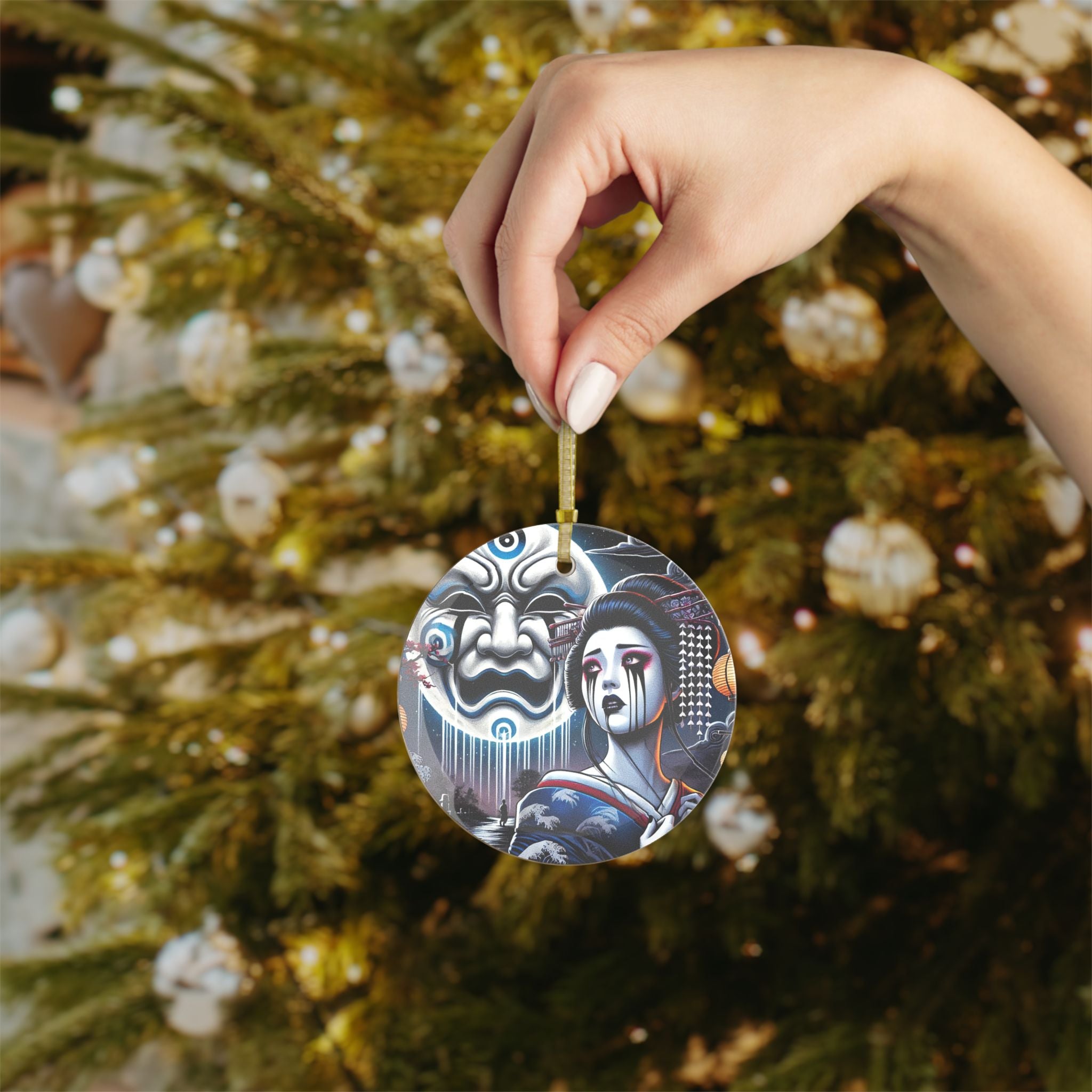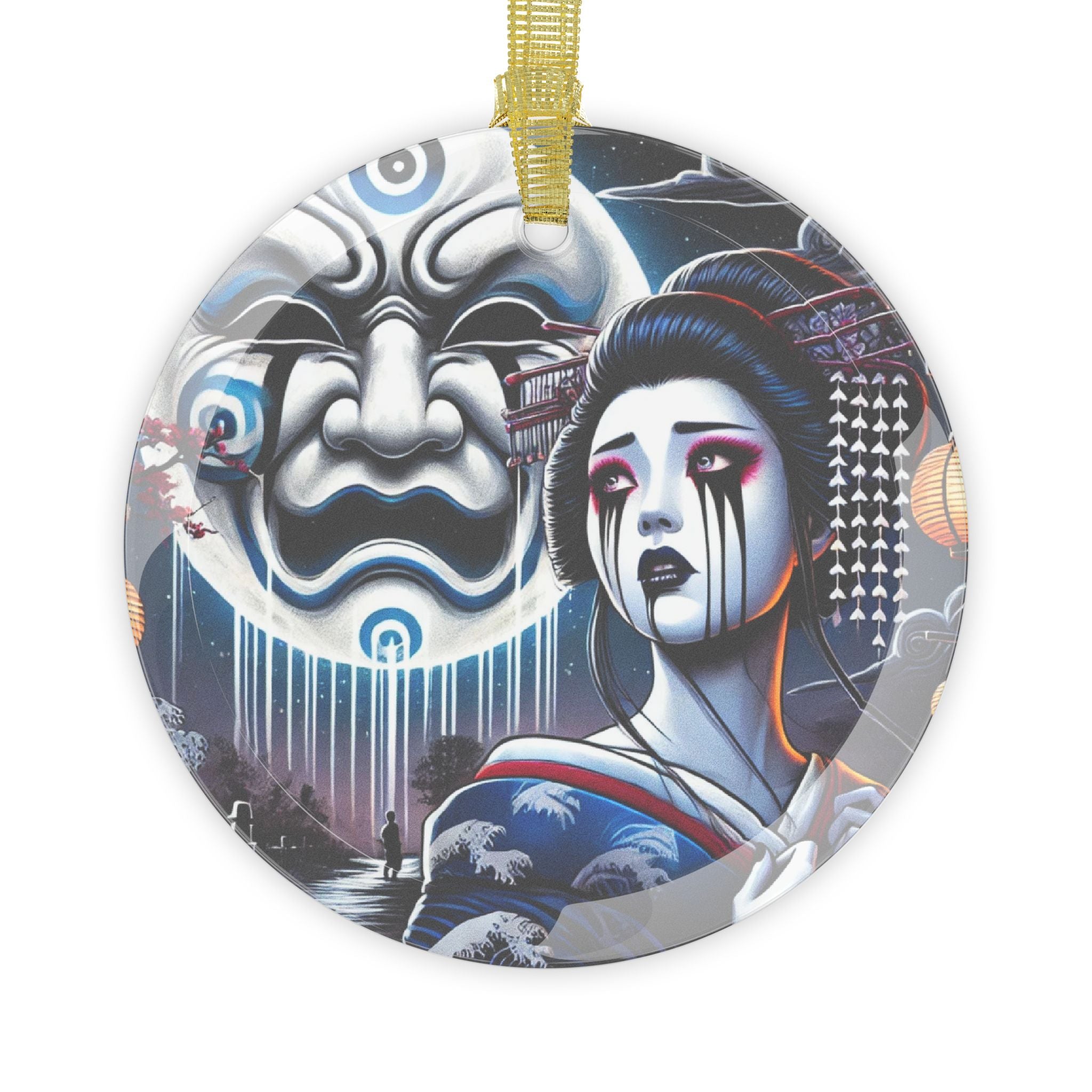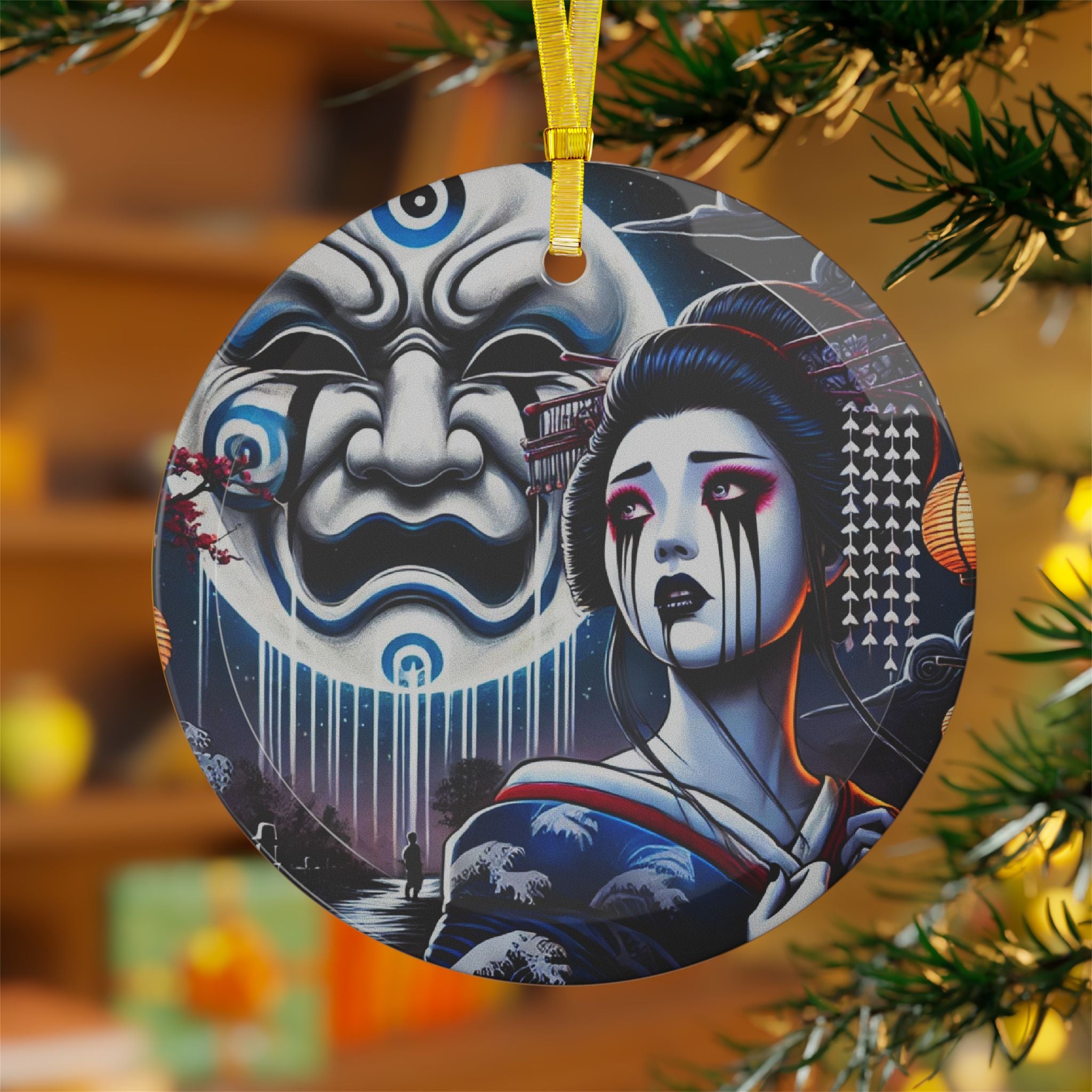 Bring elegance and emotion to your seasonal décor with this 100% glass ornament featuring the Geisha’s Black Ink Tears design. Measuring 3.5" (88.9mm) with beveled edges and finished with a gold ribbon for extra flair, each ornament is a timeless piece of artistry. The high-quality print, visible from one side, captures a haunting scene: a geisha weeping black ink tears beneath the looming presence of a giant kabuki moon mask. Suspended in the sky like a watchful guardian, the mask’s theatrical expression casts mystery and sorrow over the composition. The delicate grace of the geisha contrasts with the bold drama of kabuki, creating a surreal blend of tradition and emotion. More than a decoration, this ornament transforms any tree or display into a stage of beauty, melancholy, and enchantment.