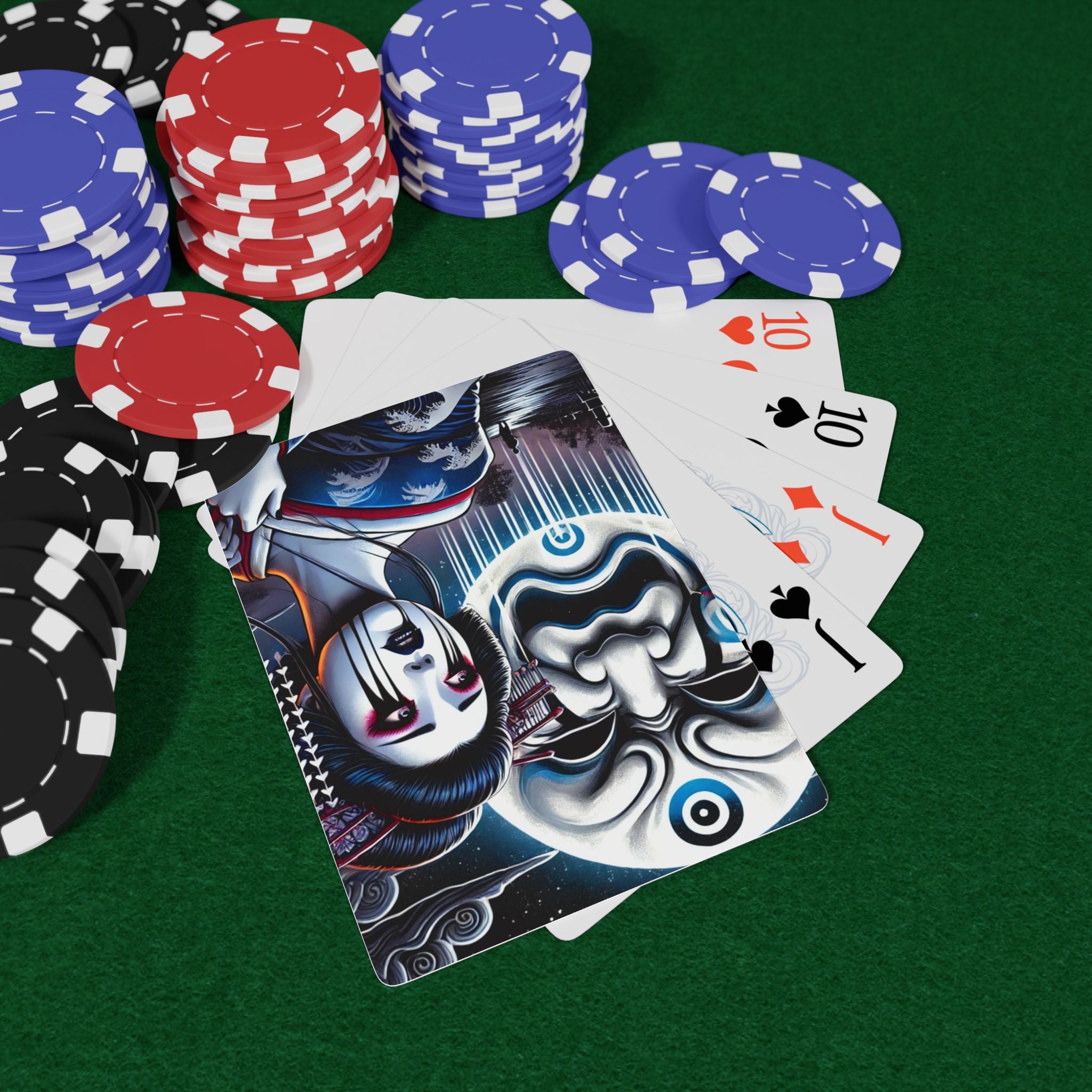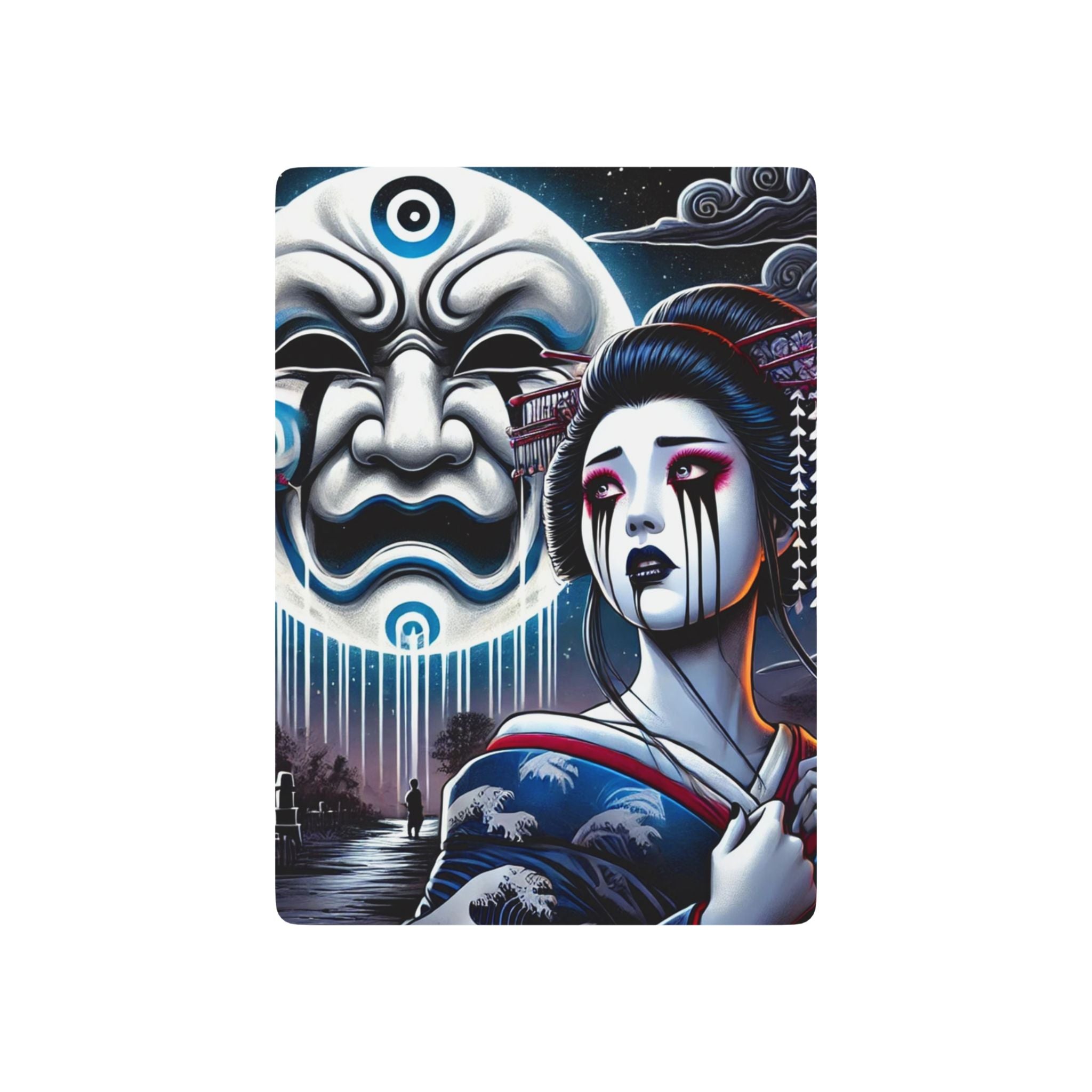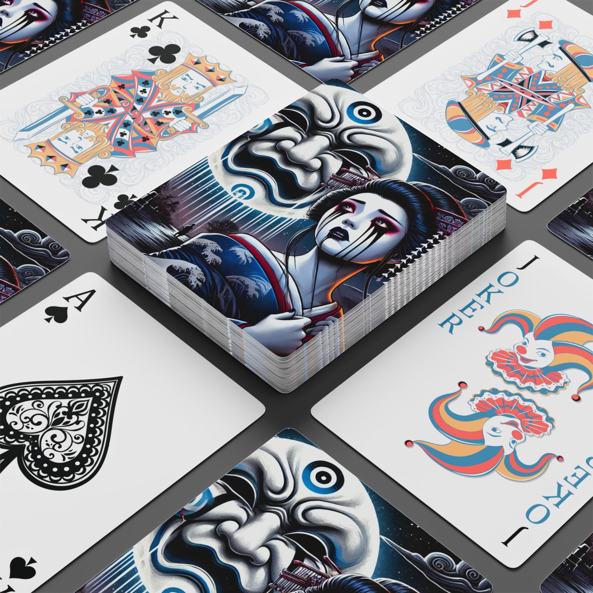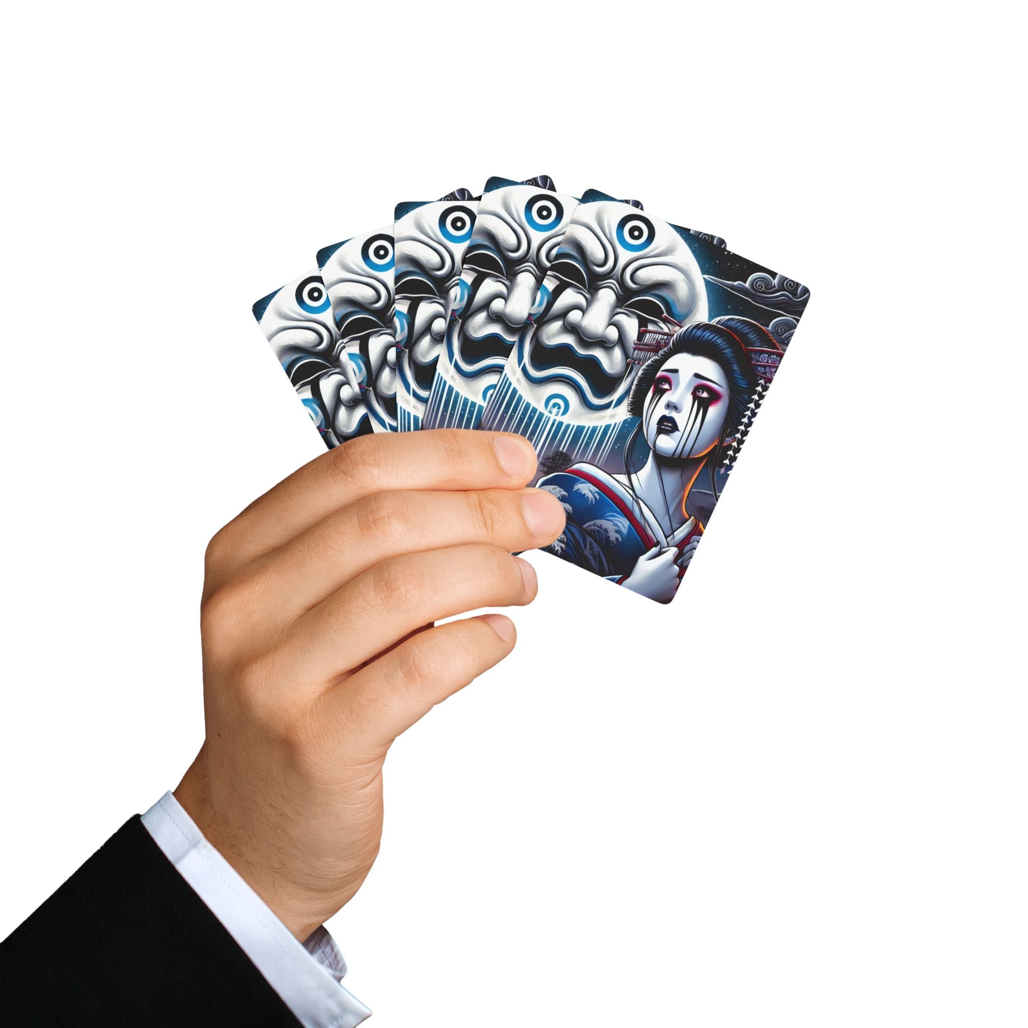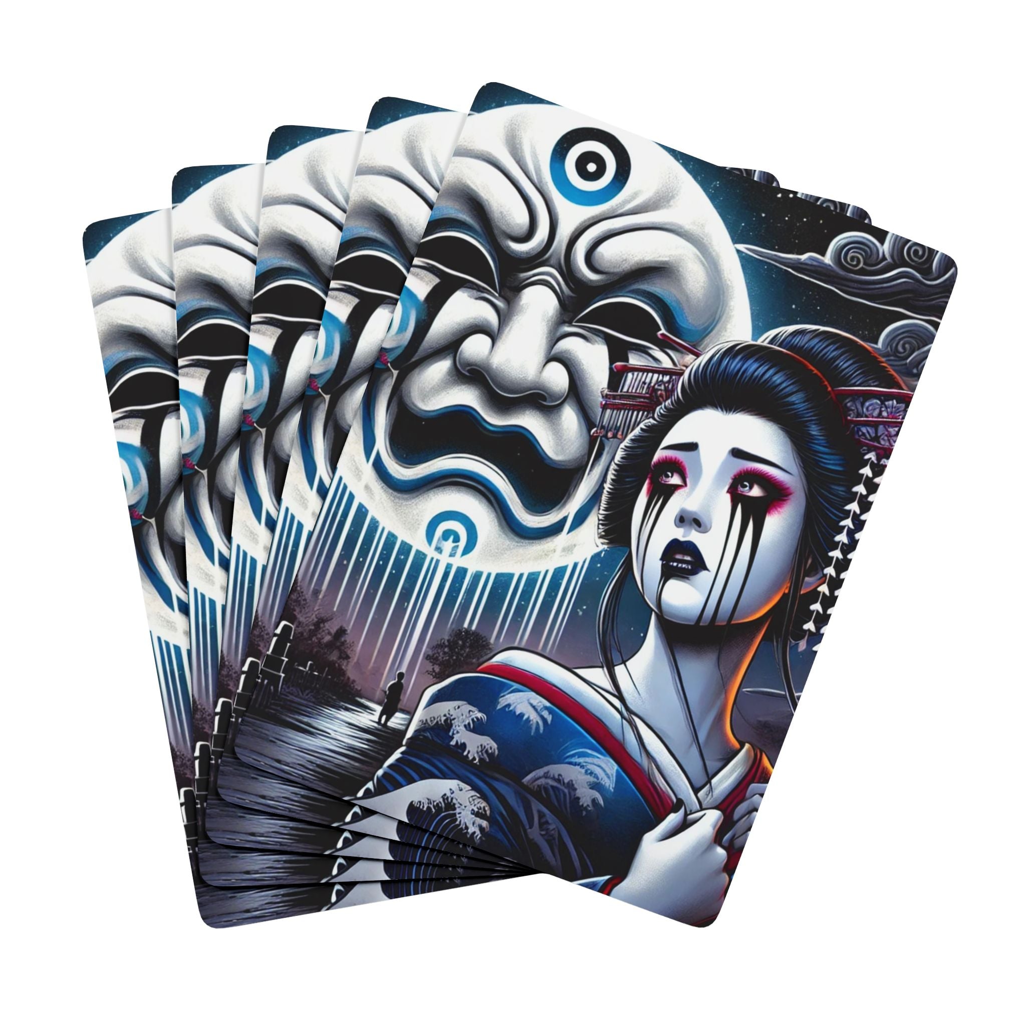 Across the back of each card unfolds a hauntingly beautiful scene: a geisha weeps black ink tears beneath the looming Kabuki moon mask. The mask hovers in the night sky like a watchful guardian, its theatrical expression casting mystery and sorrow over the scene. The delicate grace of the geisha contrasts with the dramatic boldness of Kabuki, creating a powerful fusion of tradition and surreal emotional depth. More than just playing cards, this deck becomes a stage for cultural artistry, gothic elegance, and imagination.