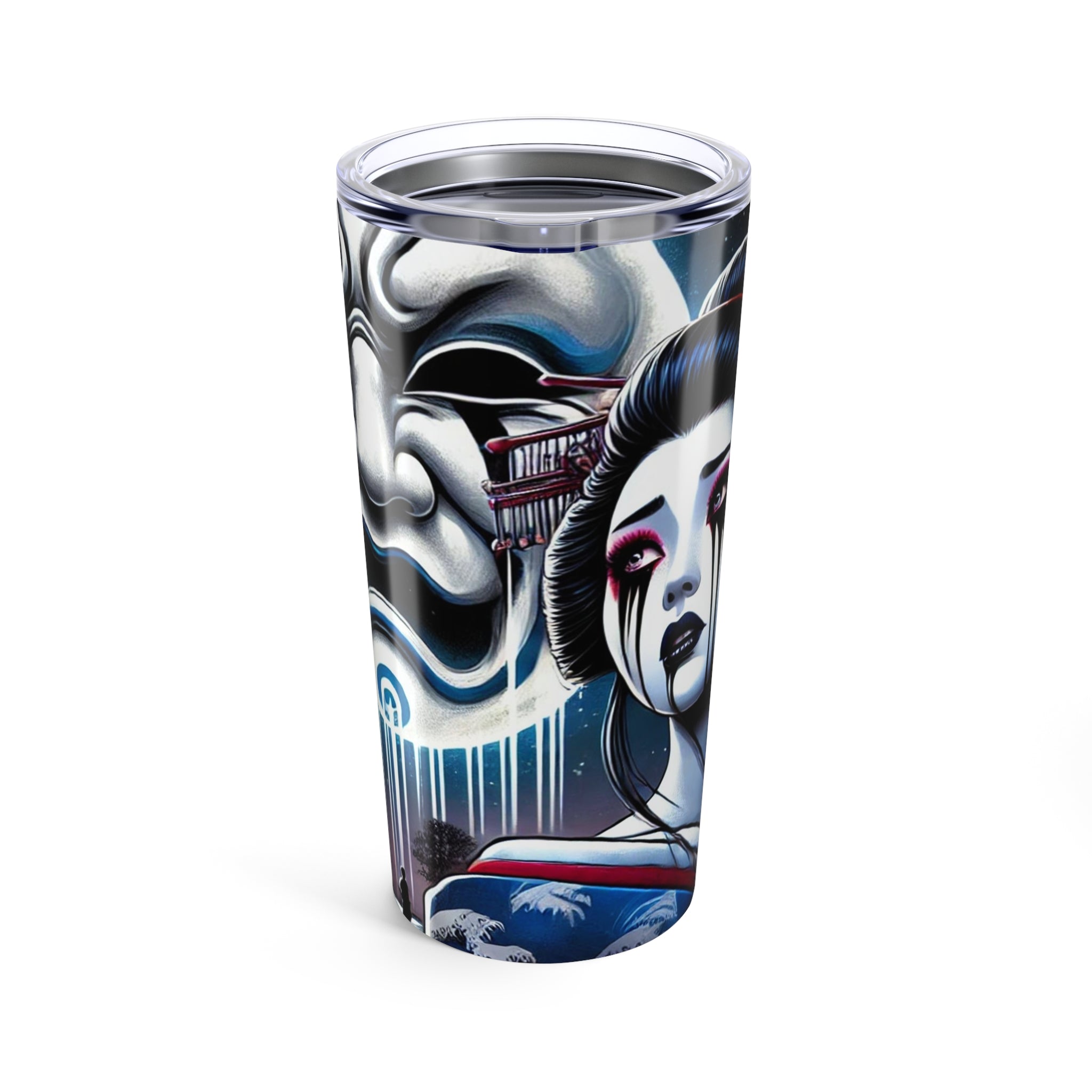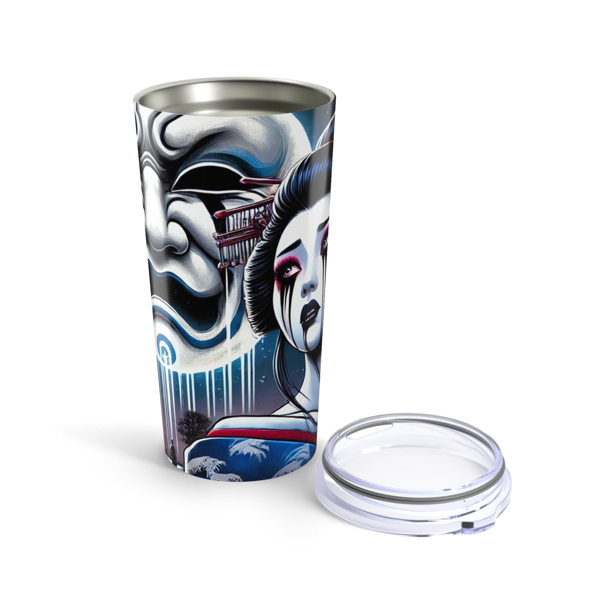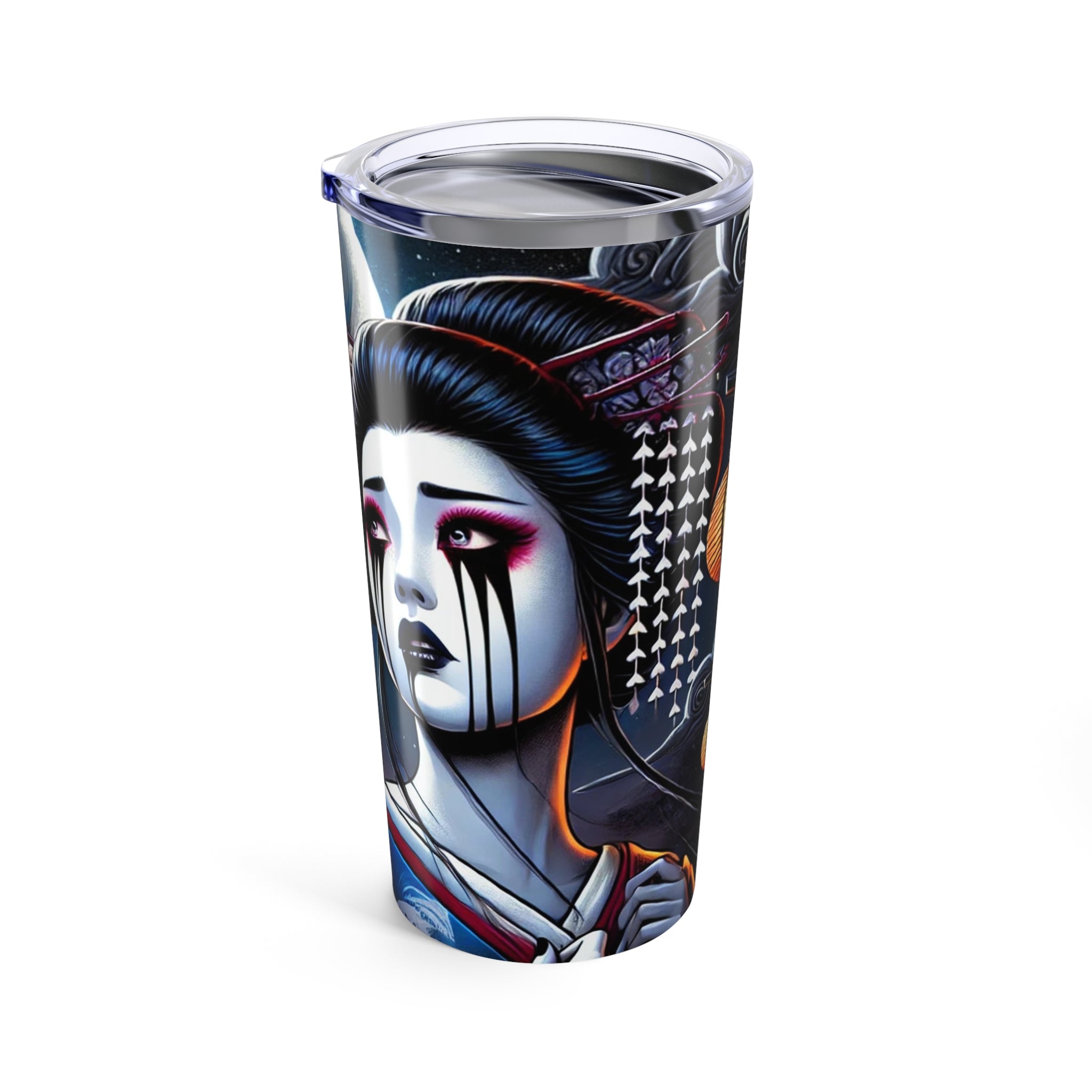 Carry a piece of theater with you every day with this 20oz stainless steel tumbler. Its double-wall insulation keeps drinks hot or cold for hours, while the durable, dishwasher-safe build ensures it can withstand daily rituals. The sleek form becomes the perfect stage for a kabuki-inspired vision: a geisha weeping black ink tears beneath the looming Kabuki moon mask.
