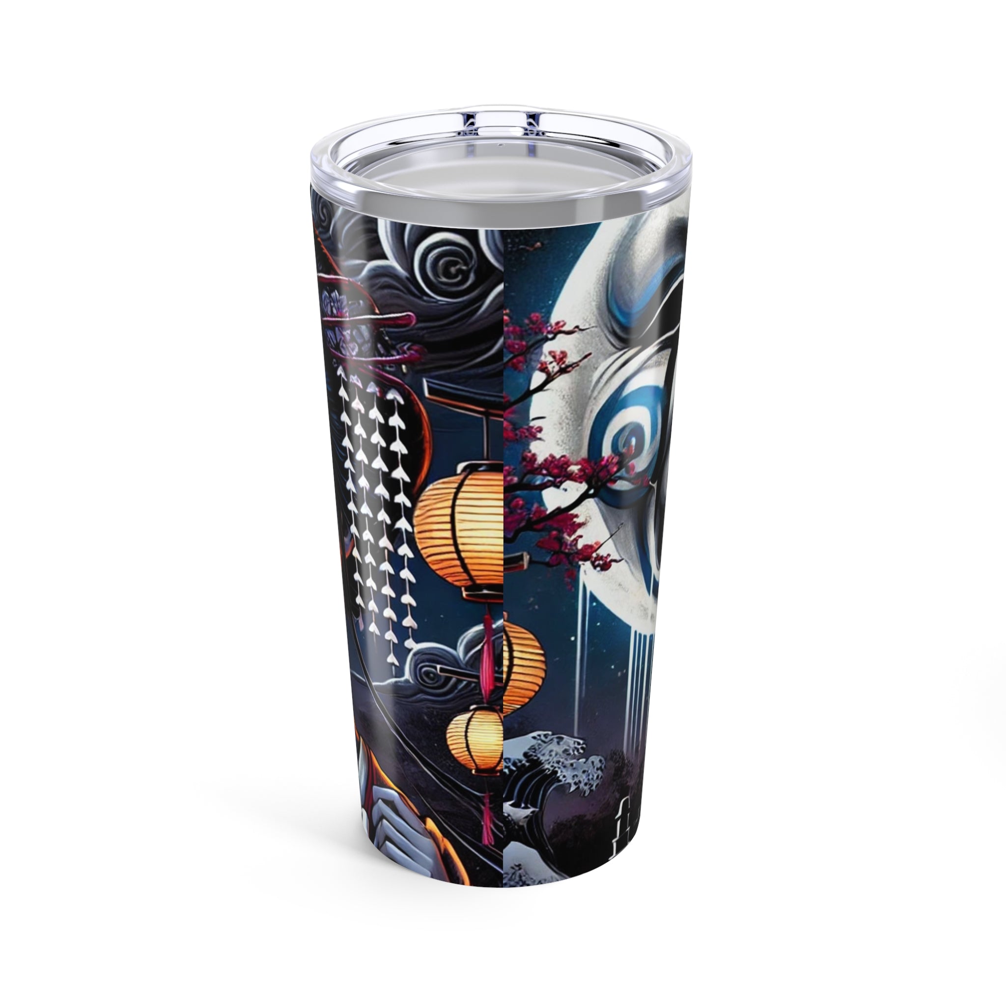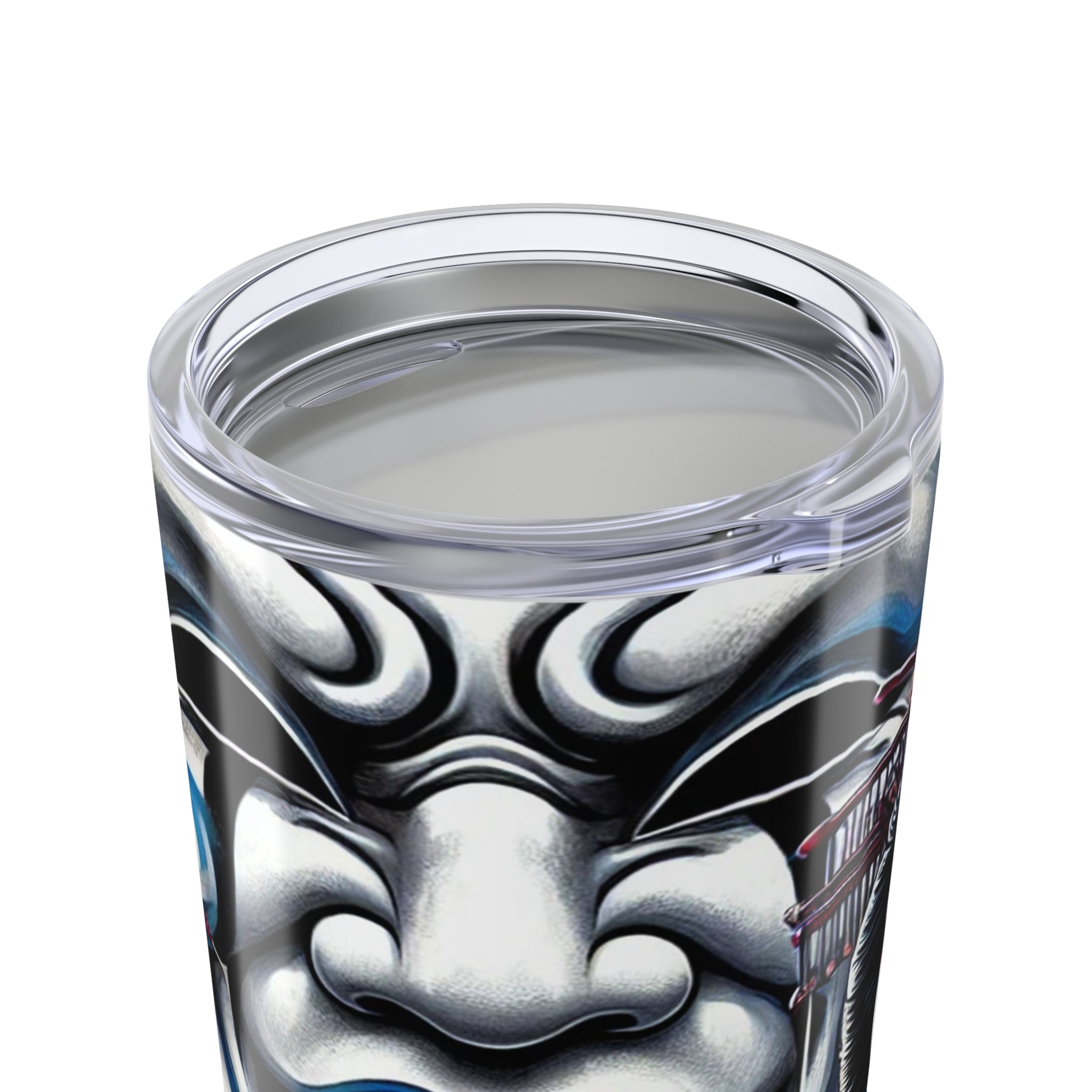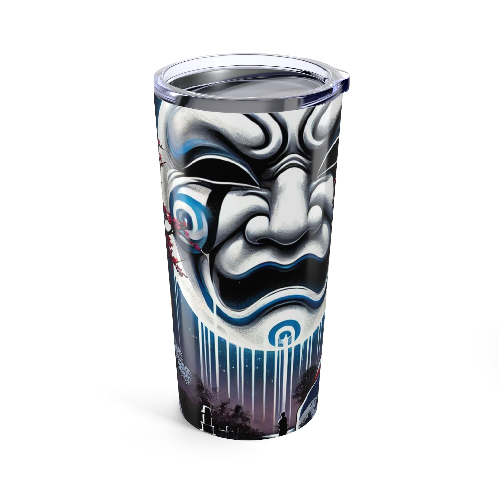 Carry a piece of theater with you every day with this 20oz stainless steel tumbler. Its double-wall insulation keeps drinks hot or cold for hours, while the durable, dishwasher-safe build ensures it can withstand daily rituals. The sleek form becomes the perfect stage for a kabuki-inspired vision: a geisha weeping black ink tears beneath the looming Kabuki moon mask.