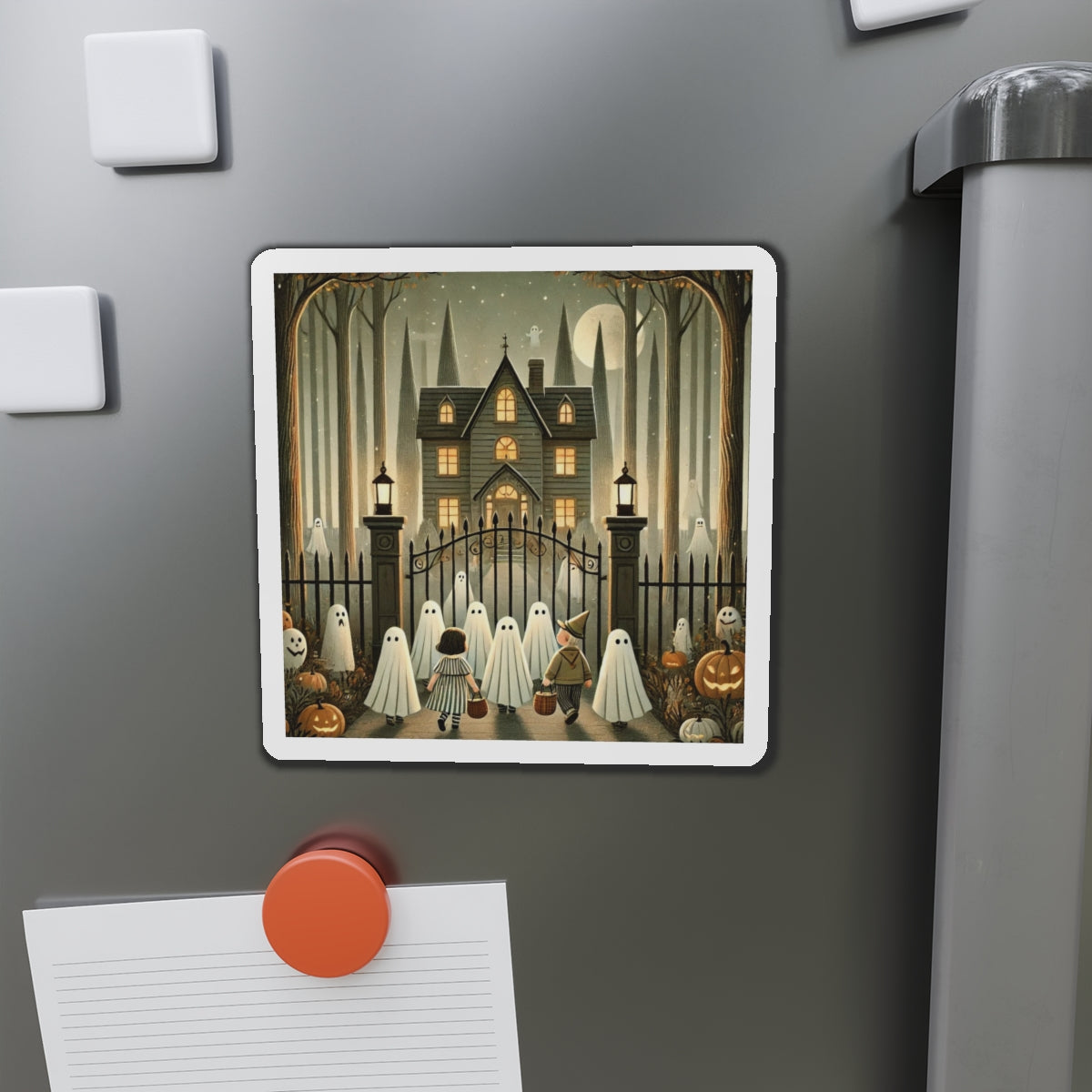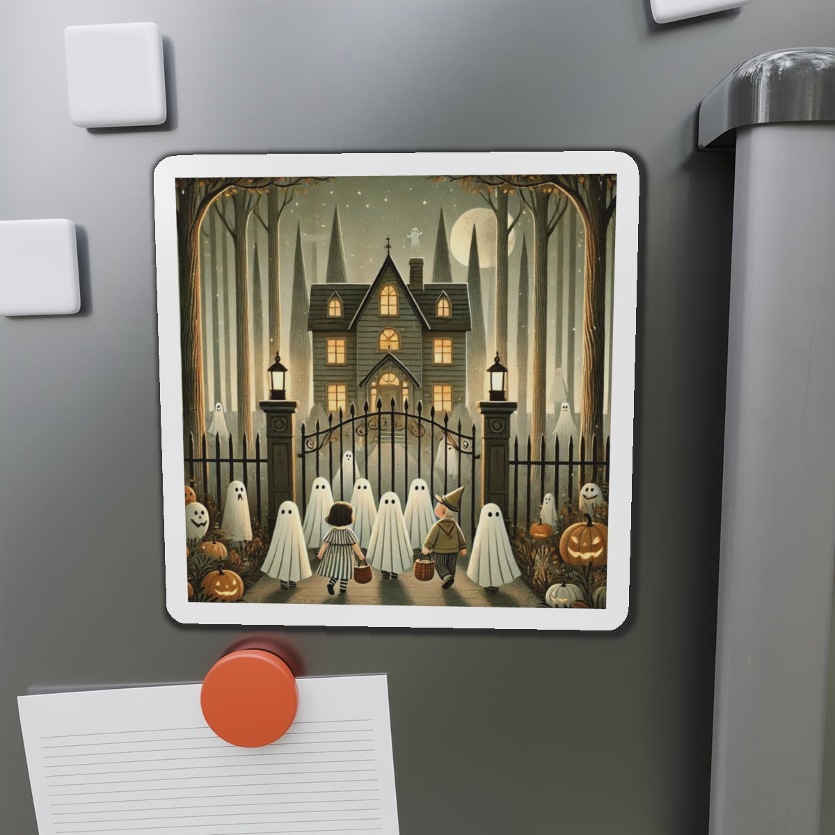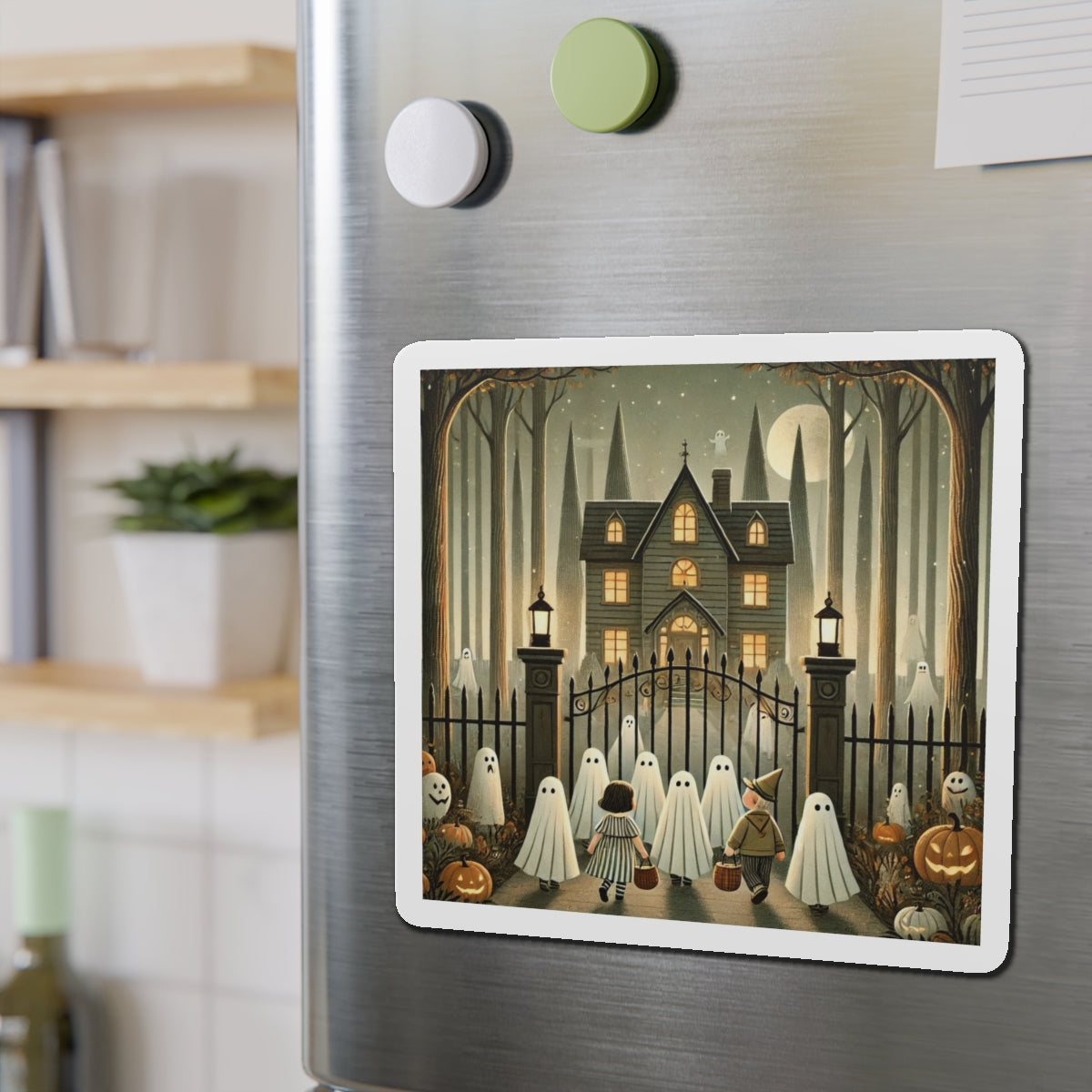 Across their glossy surface, a haunting yet heartwarming Halloween story unfolds: two children walk toward the wrought-iron gate of a gothic home beneath the night sky. Along their path, glowing pumpkins cast a warm, inviting light, while playful young ghosts drift gently forward to greet the visitors. The scene blends mystery and charm, capturing the very essence of Halloween with a balance of gothic enchantment and whimsical magic. More than magnets, they are miniature works of art—bringing seasonal wonder, storytelling, and a touch of fantasy into everyday spaces.