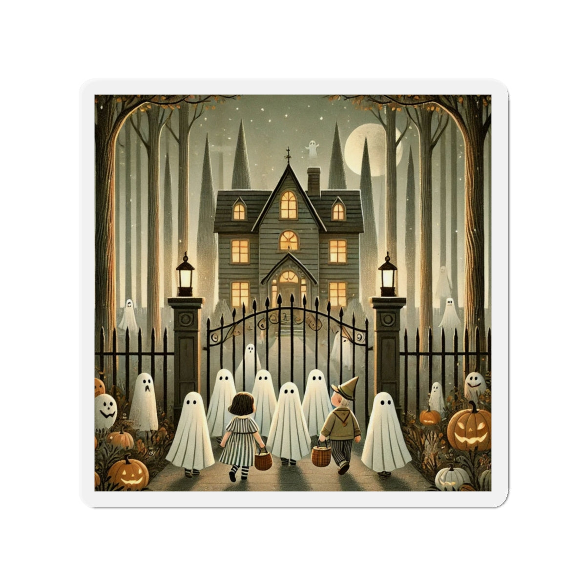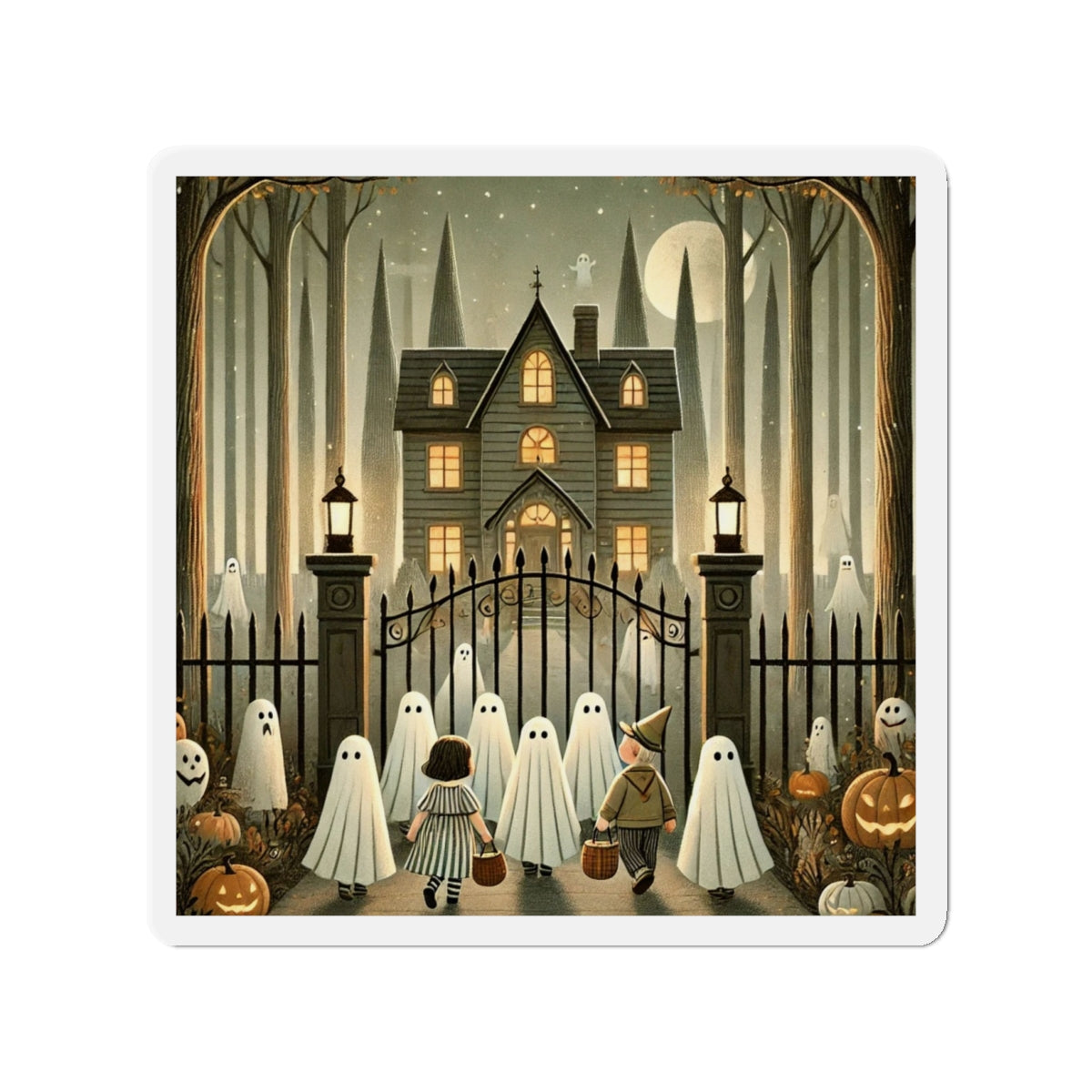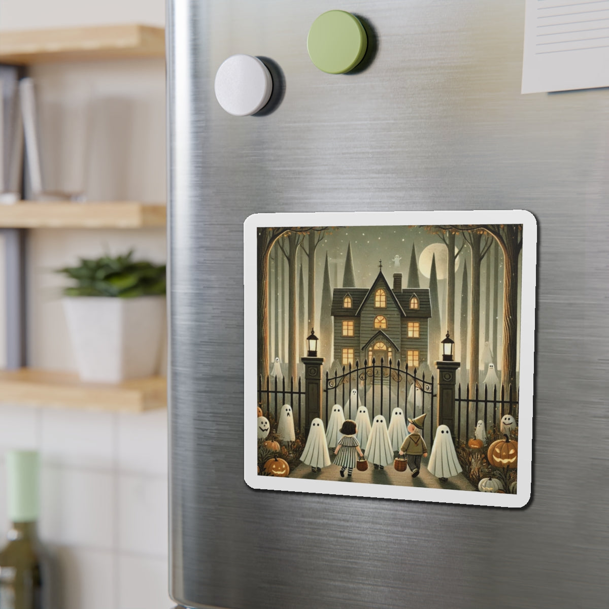 Across their glossy surface, a haunting yet heartwarming Halloween story unfolds: two children walk toward the wrought-iron gate of a gothic home beneath the night sky. Along their path, glowing pumpkins cast a warm, inviting light, while playful young ghosts drift gently forward to greet the visitors. The scene blends mystery and charm, capturing the very essence of Halloween with a balance of gothic enchantment and whimsical magic. More than magnets, they are miniature works of art—bringing seasonal wonder, storytelling, and a touch of fantasy into everyday spaces.