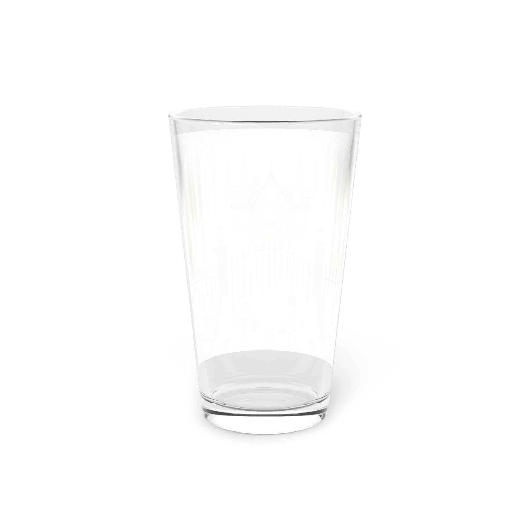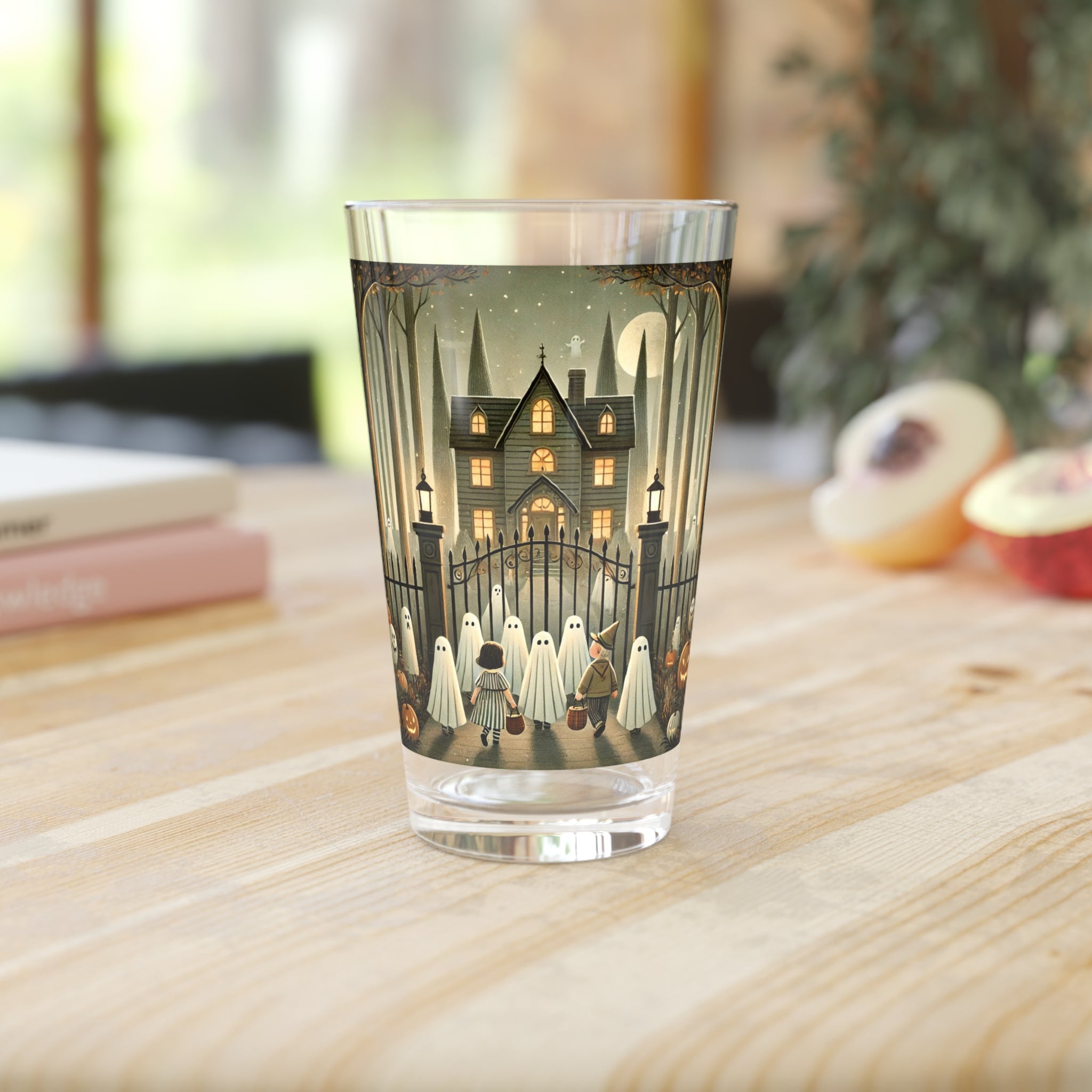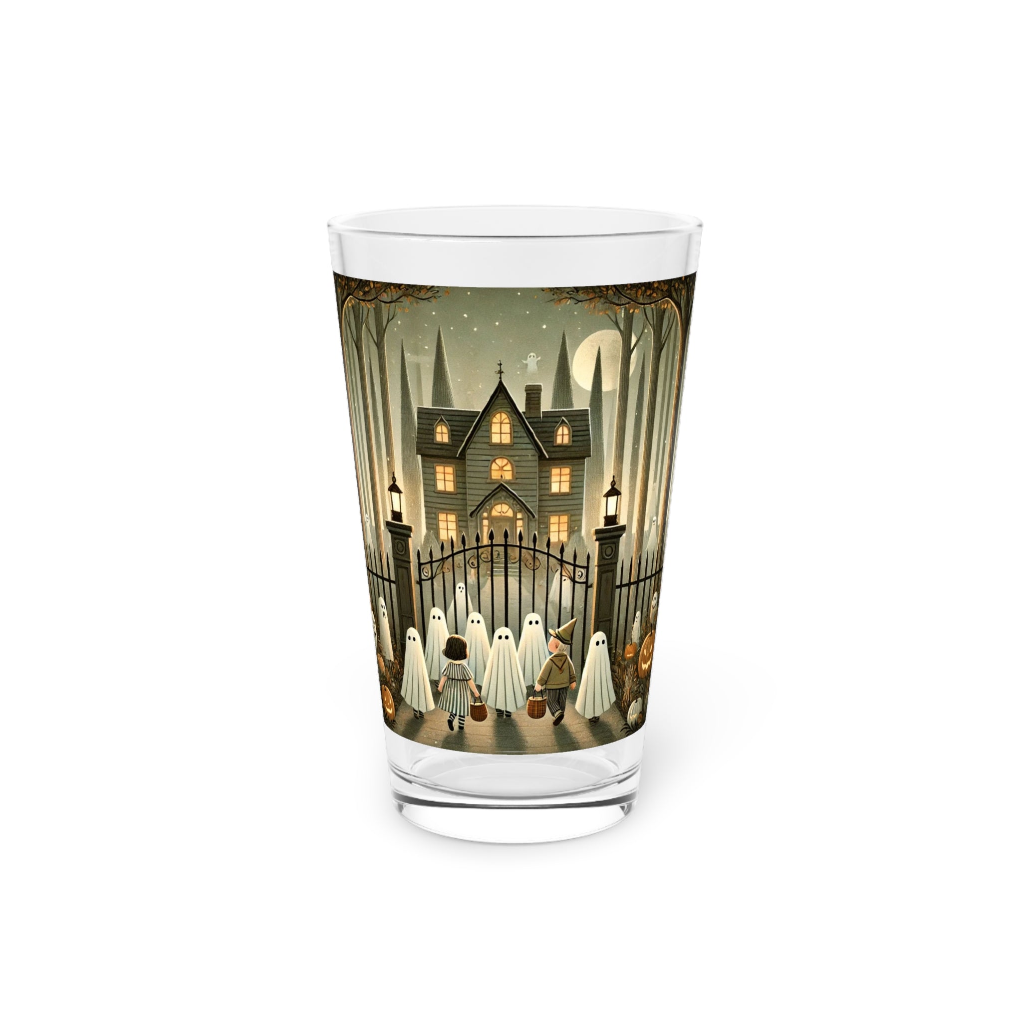 Add a touch of gothic enchantment to your table with this 16oz Halloween pint glass. Crafted from clear, durable glass, it’s perfect for everything from water and iced tea to seasonal cocktails, and versatile enough to make a charming housewarming gift. The design features a haunting yet heartwarming scene of two children approaching the wrought-iron gate of a gothic home under the night sky. Glowing pumpkins cast their light along the path while playful young ghosts drift forward to greet them, creating an atmosphere that blends mystery, whimsy, and Halloween magic. More than just drinkware, it’s a piece of seasonal artistry that brings festive charm to every sip.