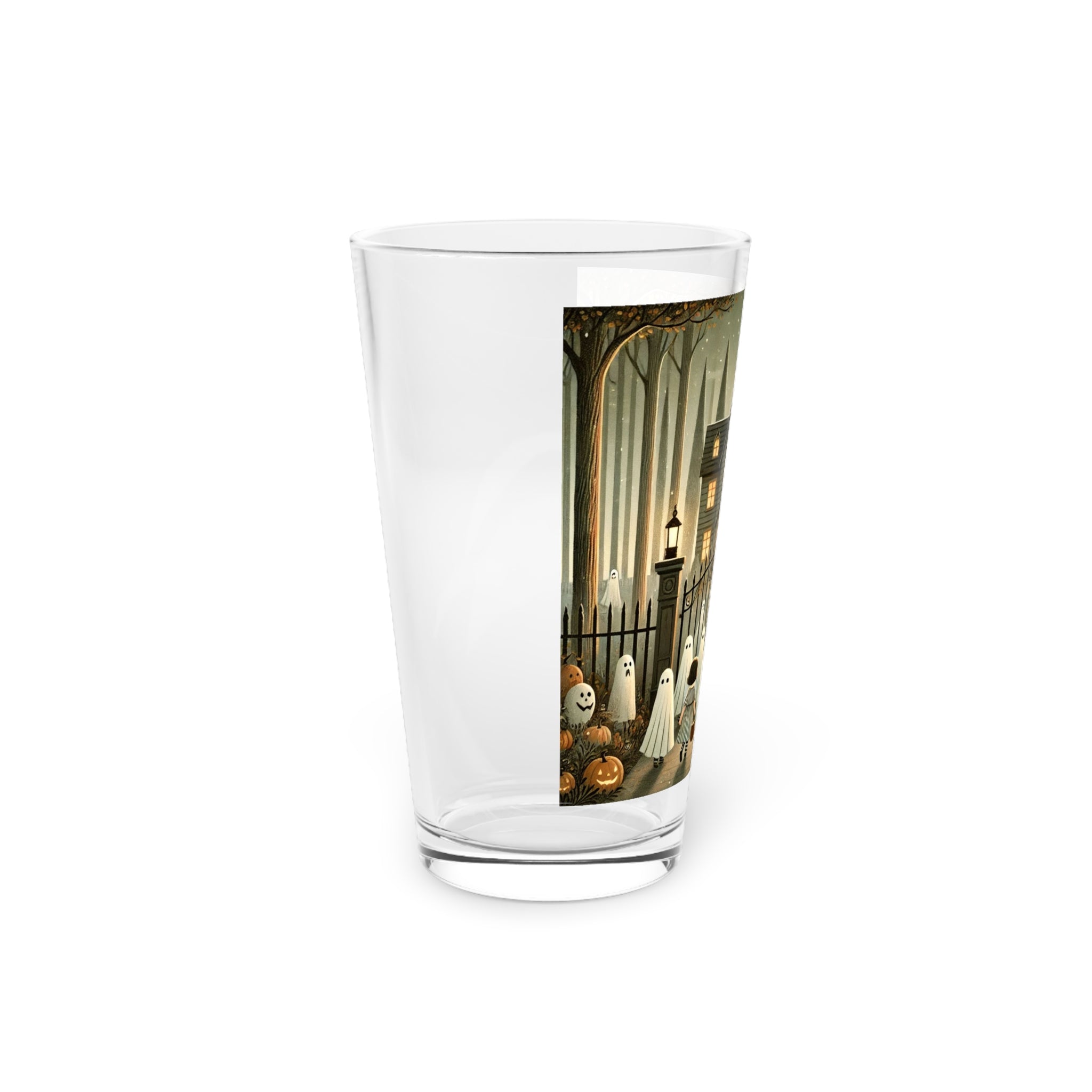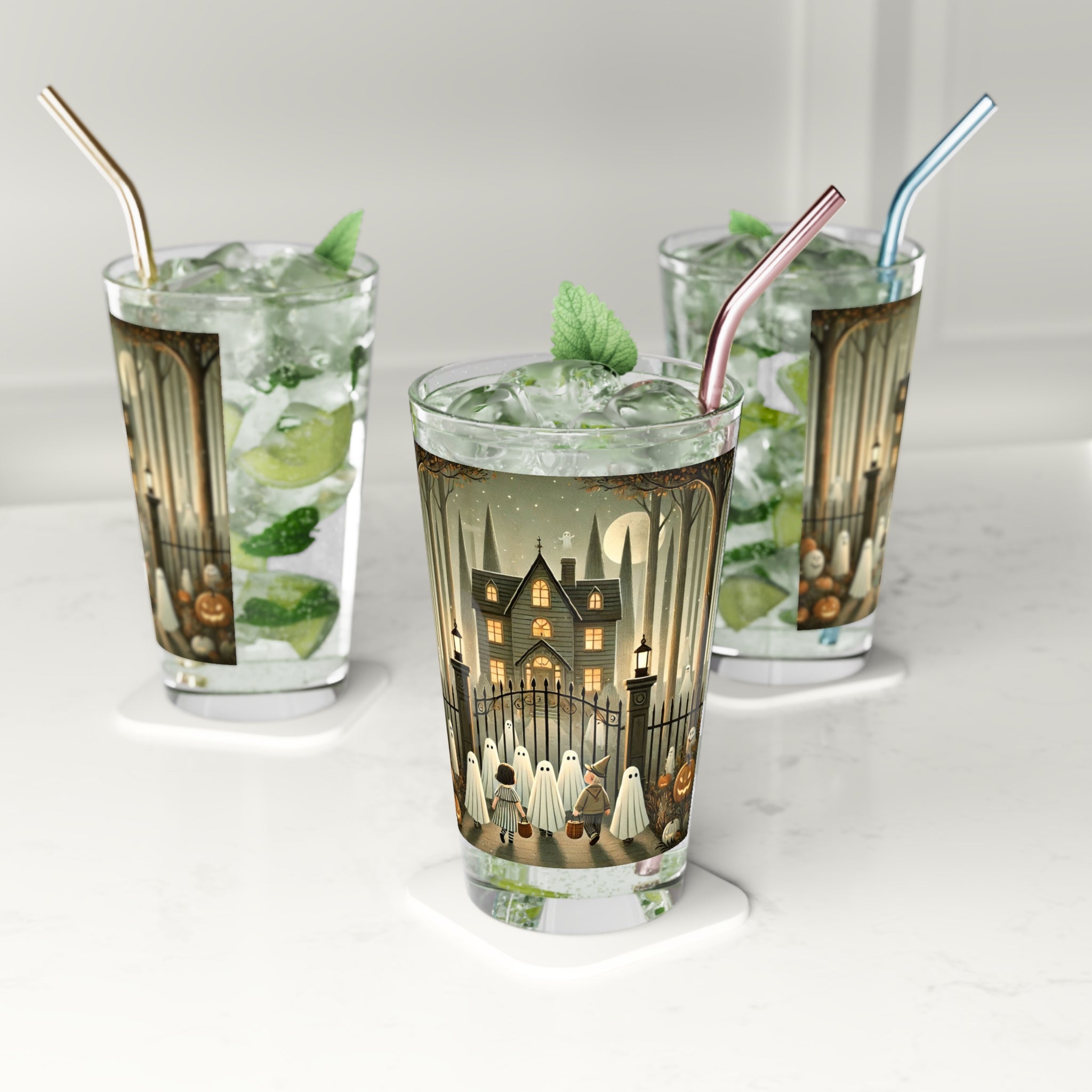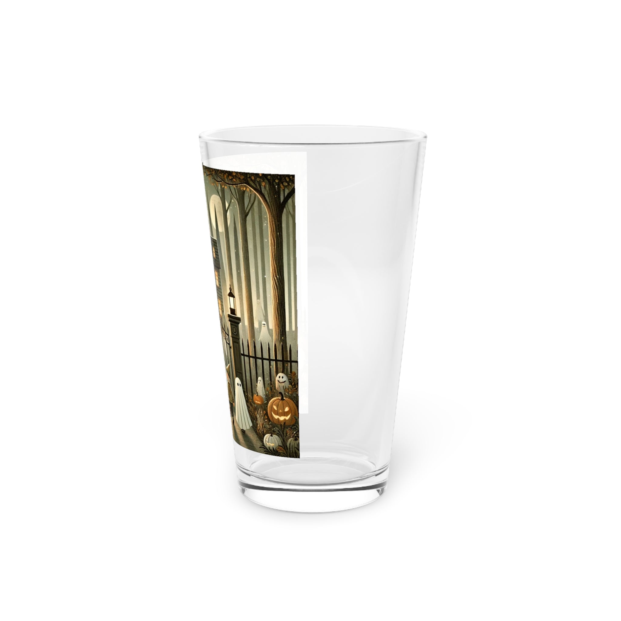Add a touch of gothic enchantment to your table with this 16oz Halloween pint glass. Crafted from clear, durable glass, it’s perfect for everything from water and iced tea to seasonal cocktails, and versatile enough to make a charming housewarming gift. The design features a haunting yet heartwarming scene of two children approaching the wrought-iron gate of a gothic home under the night sky. Glowing pumpkins cast their light along the path while playful young ghosts drift forward to greet them, creating an atmosphere that blends mystery, whimsy, and Halloween magic. More than just drinkware, it’s a piece of seasonal artistry that brings festive charm to every sip.
