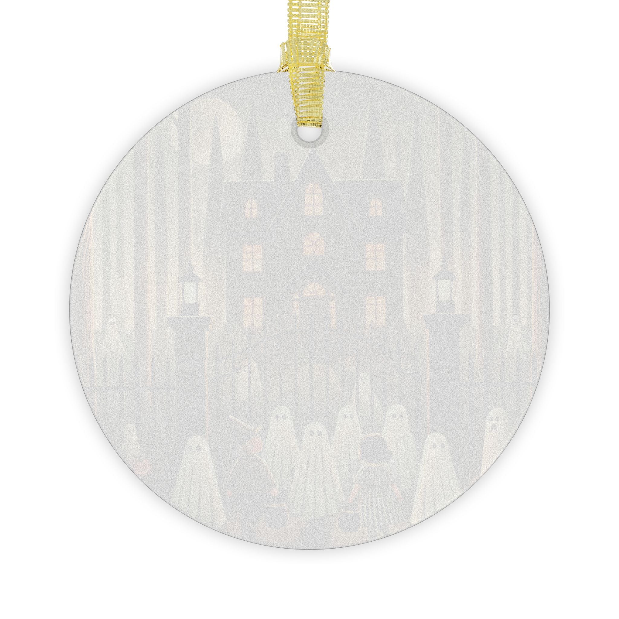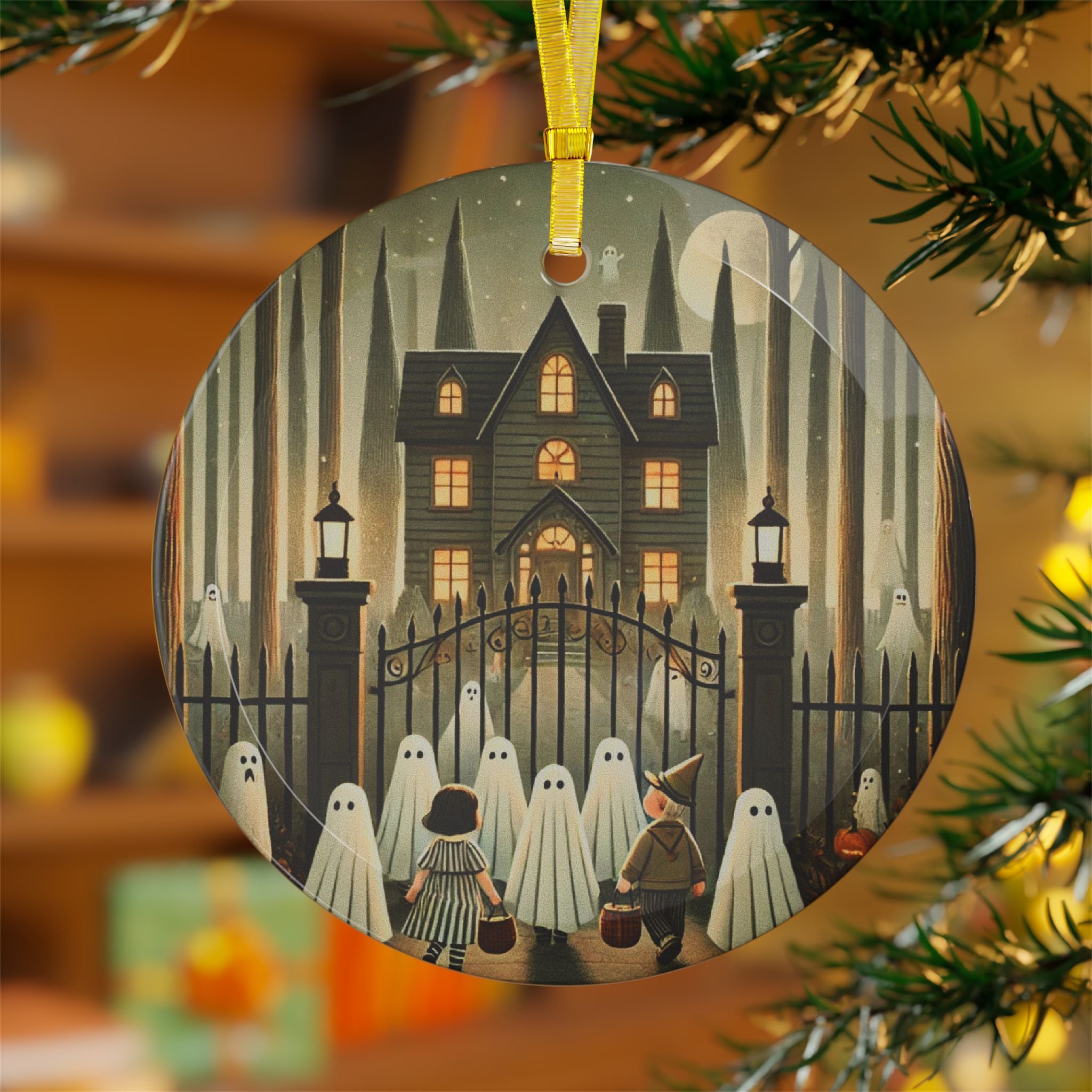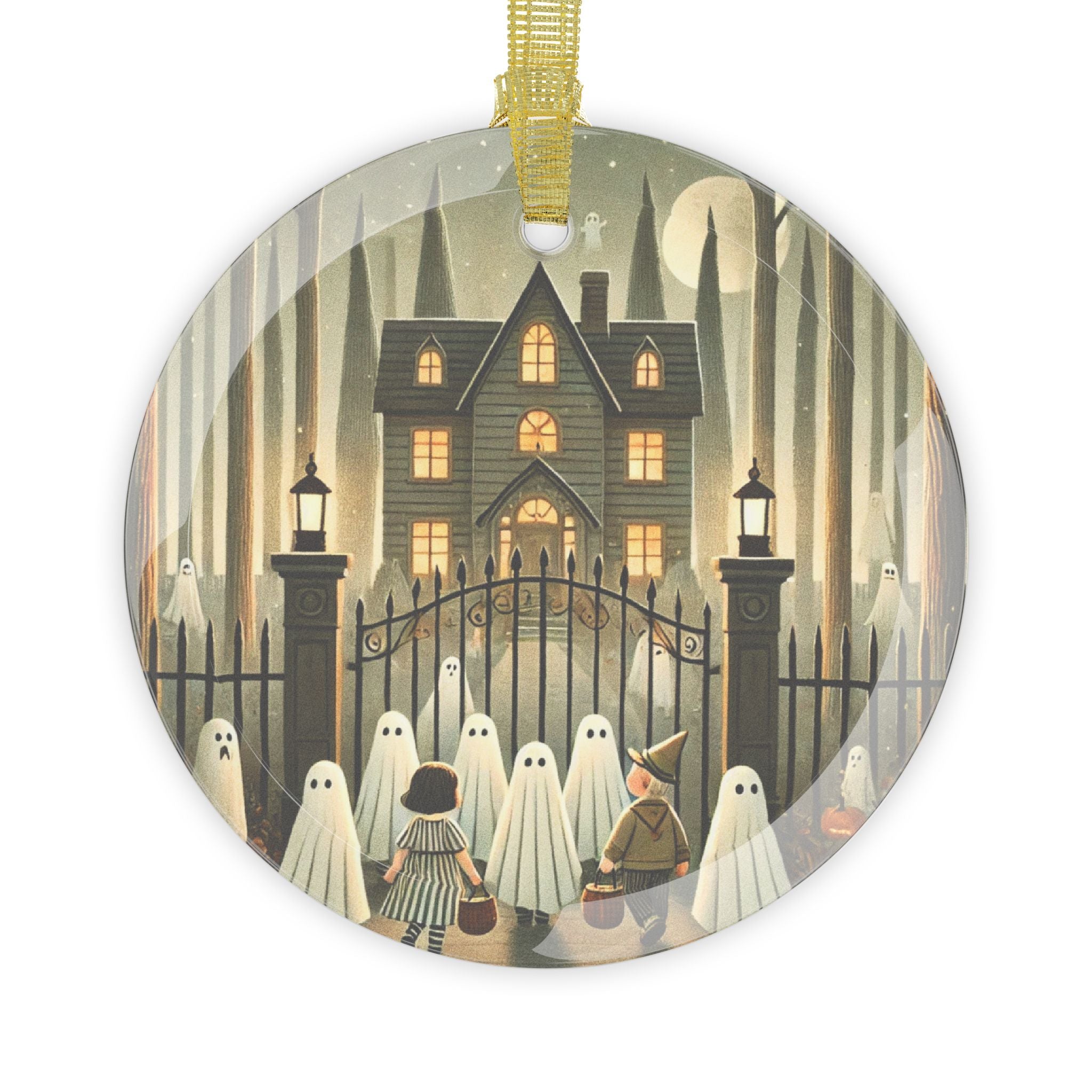 Bring gothic charm and Halloween whimsy to your décor with this 3.5" glass ornament, crafted with beveled edges and finished with a gold ribbon for elegant display. The high-quality print captures a haunting yet heartwarming scene: two children approach the wrought-iron gate of a gothic home beneath a starry night sky, while glowing pumpkins light the path and playful young ghosts drift forward in welcome. Blending mystery, enchantment, and seasonal magic, this ornament transforms classic Halloween imagery into a keepsake piece that feels both spooky and heartwarming. Available as a single ornament. Made from 100% glass.
