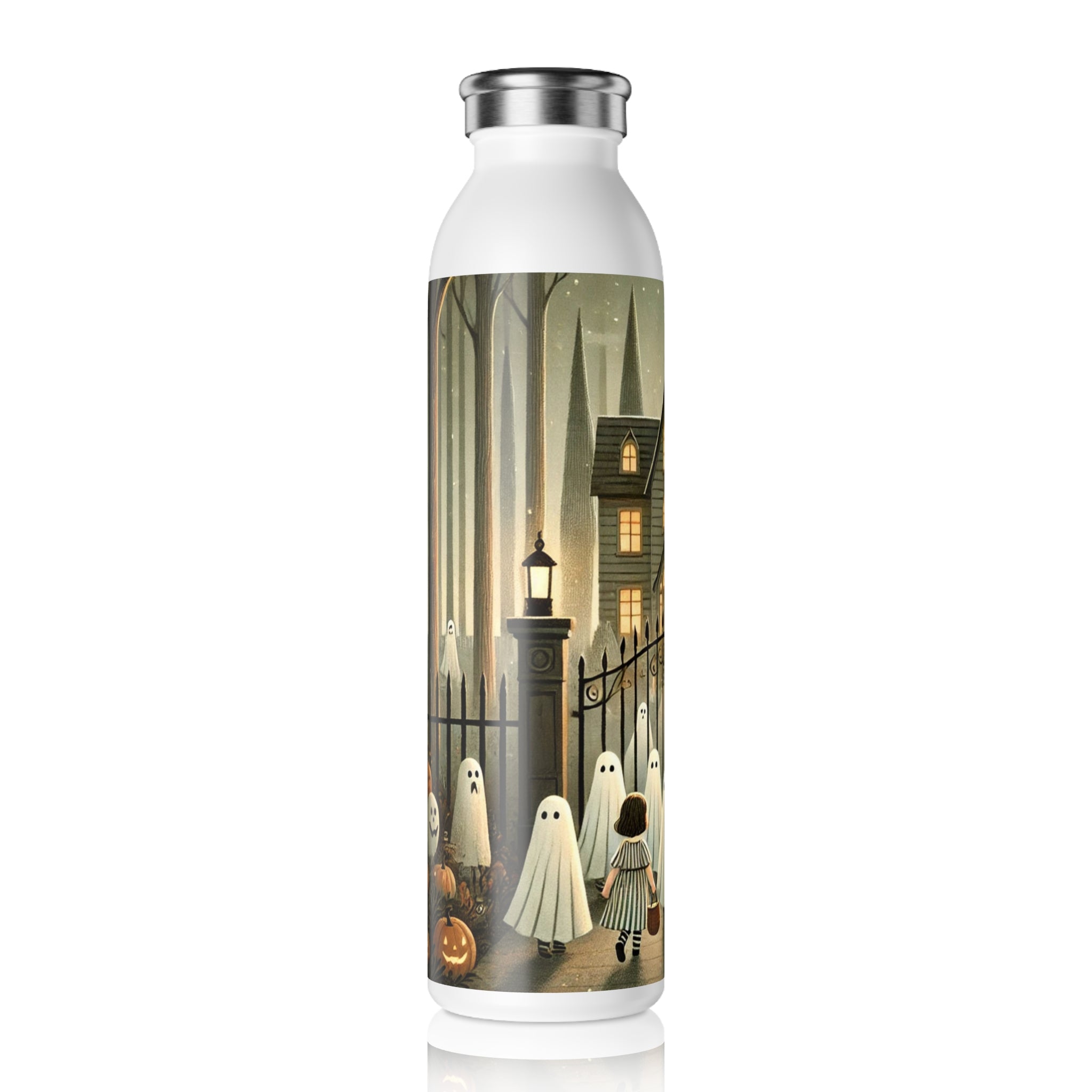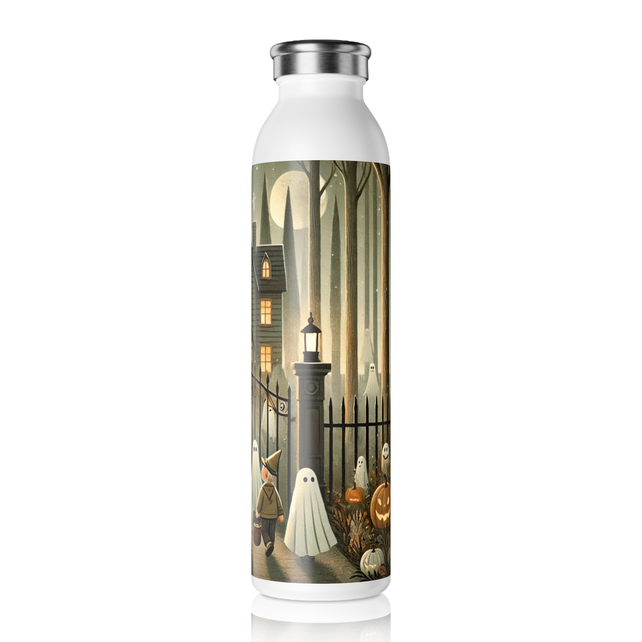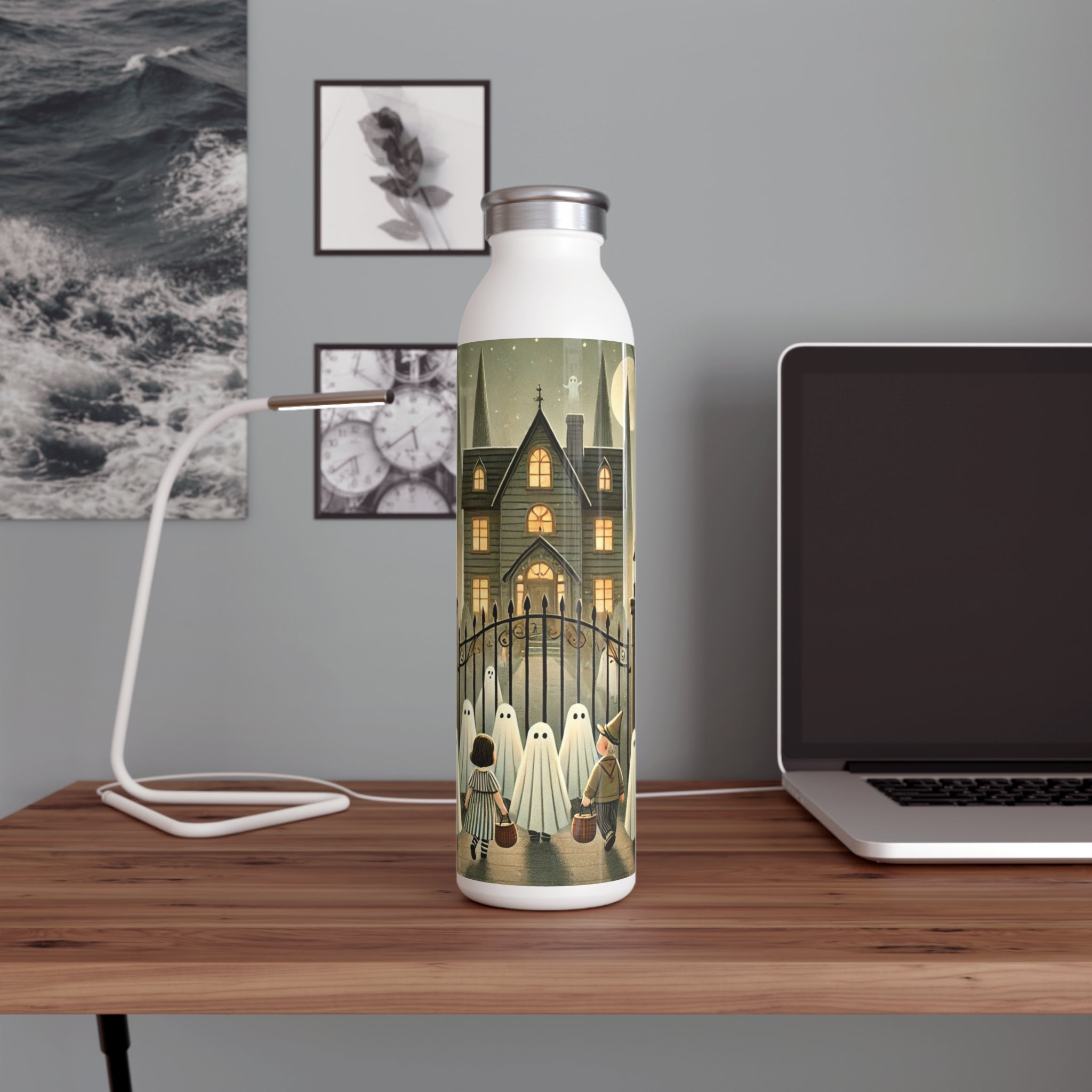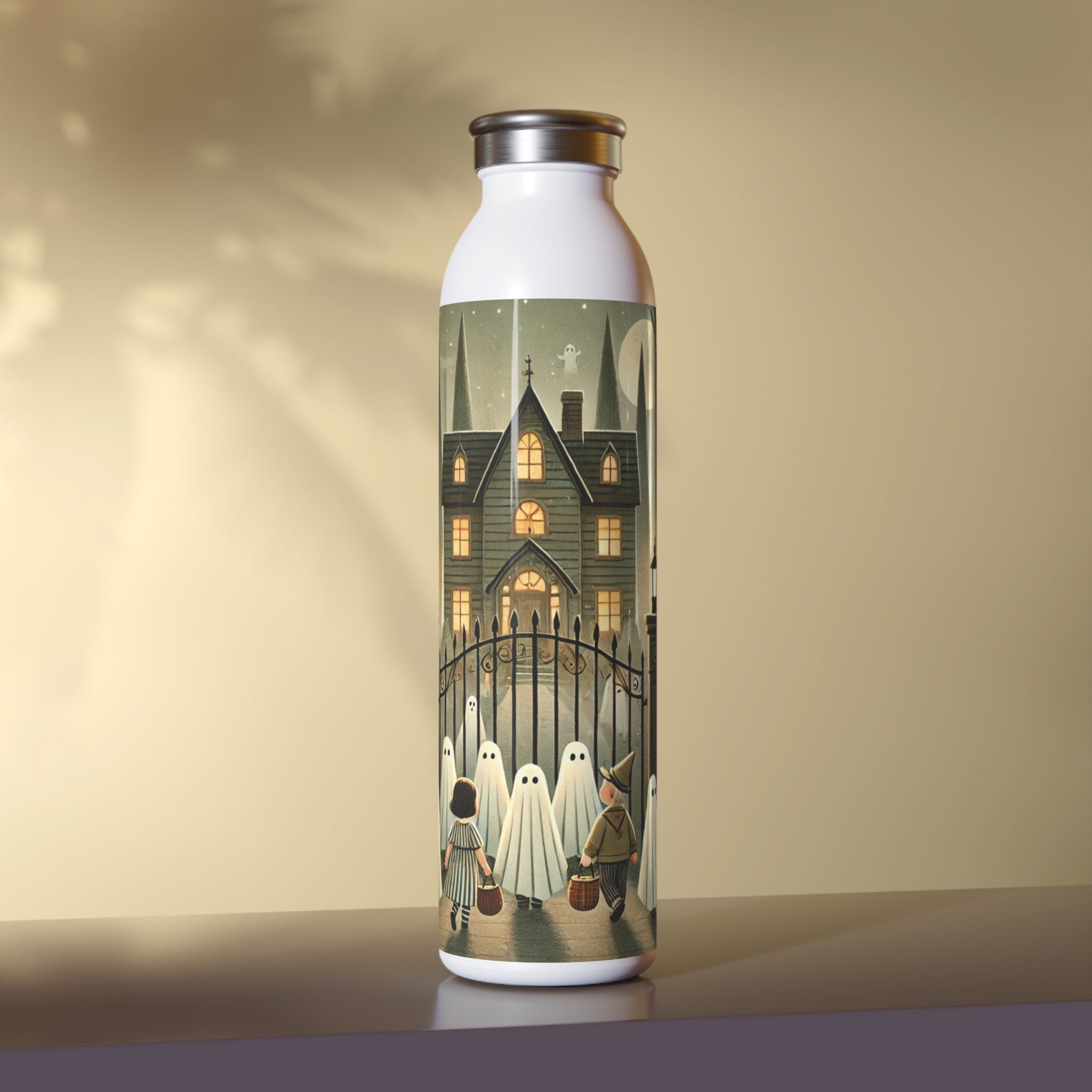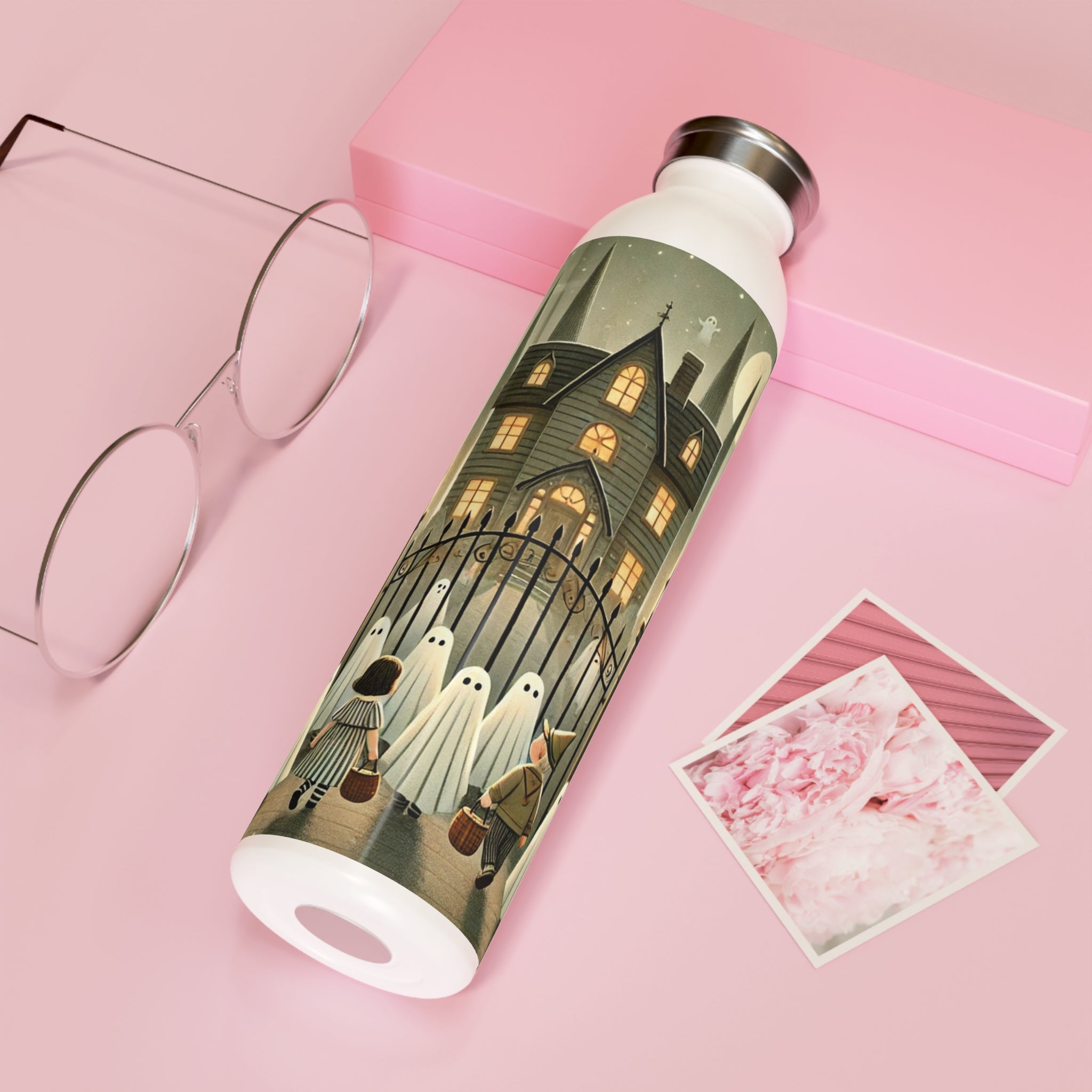 Across the sleek frame, two children step toward the wrought-iron gate of a gothic home under the glowing night sky. Pumpkins light their path with a warm golden glow, while playful young ghosts drift forward in a gentle welcome. Just as the bottle preserves warmth and coolness within, the scene blends gothic enchantment with whimsical magic, turning everyday hydration into a celebration of Halloween’s spirit.