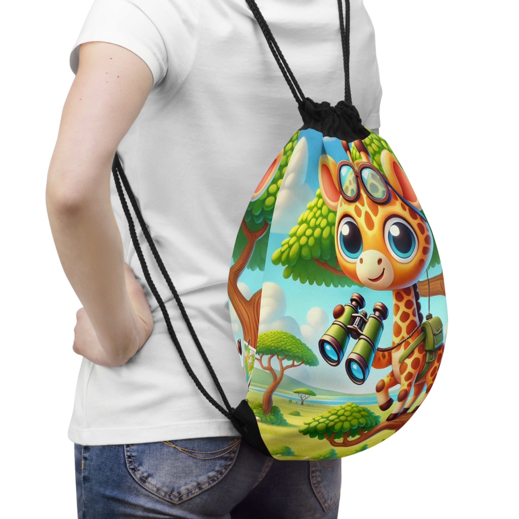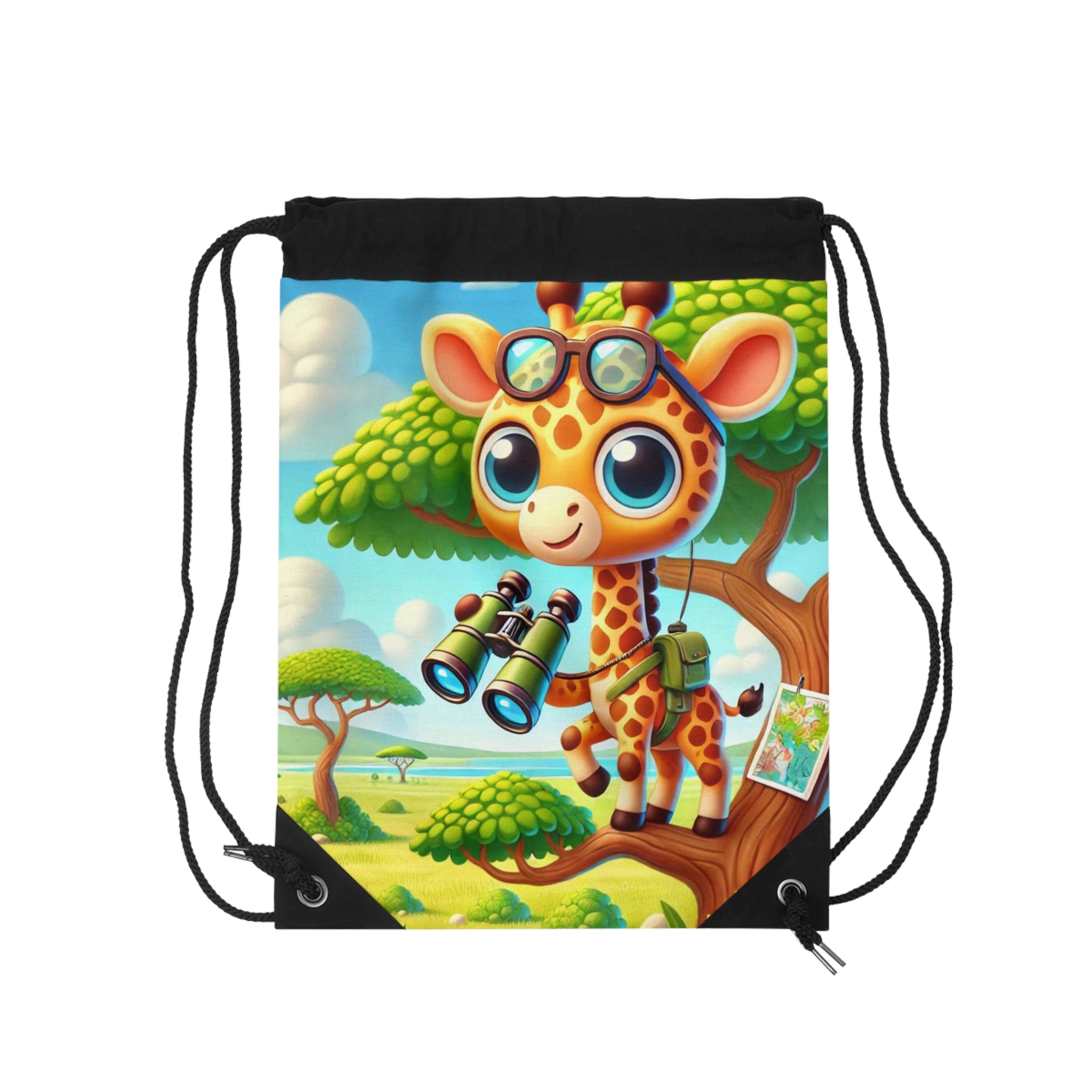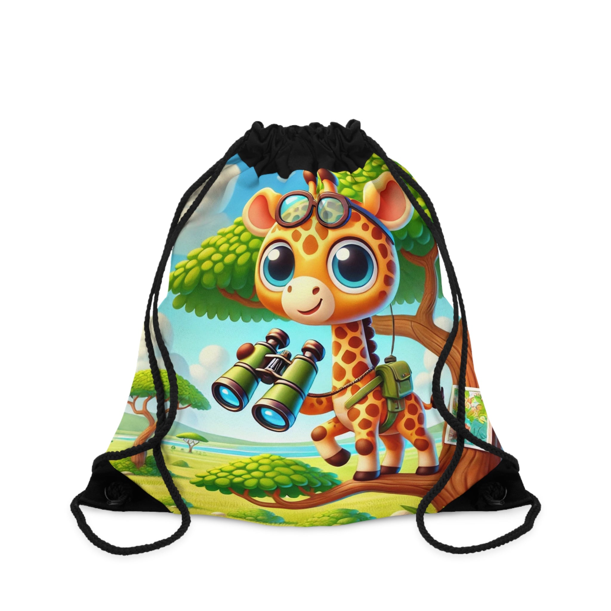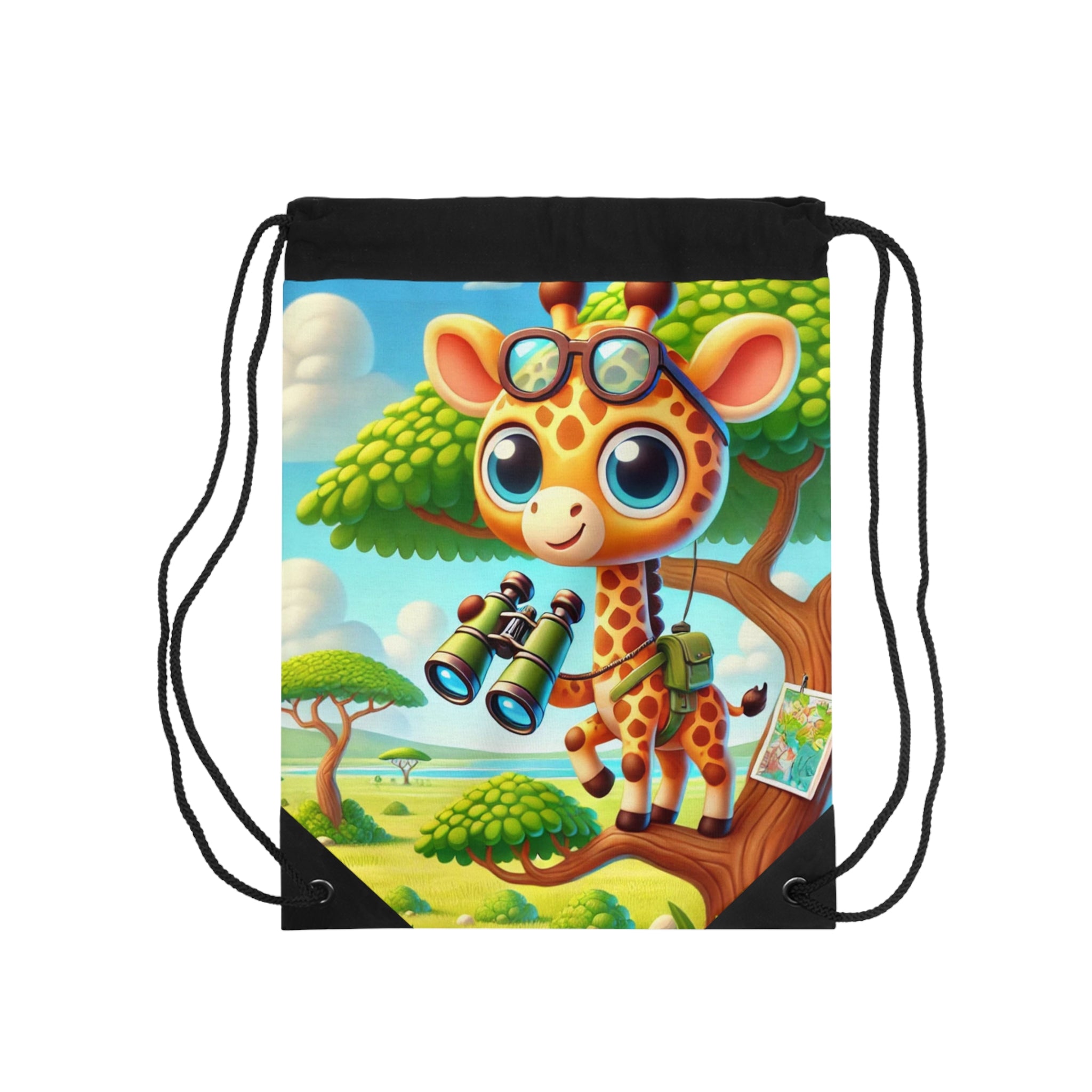 Giraffe Lookout Drawstring Bag captures adventure, curiosity, and charm in a lightweight, durable design. Perfect for quick trips to the gym, store, or beach, this versatile drawstring bag combines practicality with playful artistry for light and easy travels. The Giraffe Lookout artwork features a tall, inquisitive giraffe perched at a tree-top lookout, holding a map and binoculars as it surveys the vast landscape below. The scene brims with whimsy and imagination, brought to life with expressive details and cheerful tones that evoke the spirit of exploration. This delightful design transforms a simple accessory into a joyful celebration of discovery and creativity.