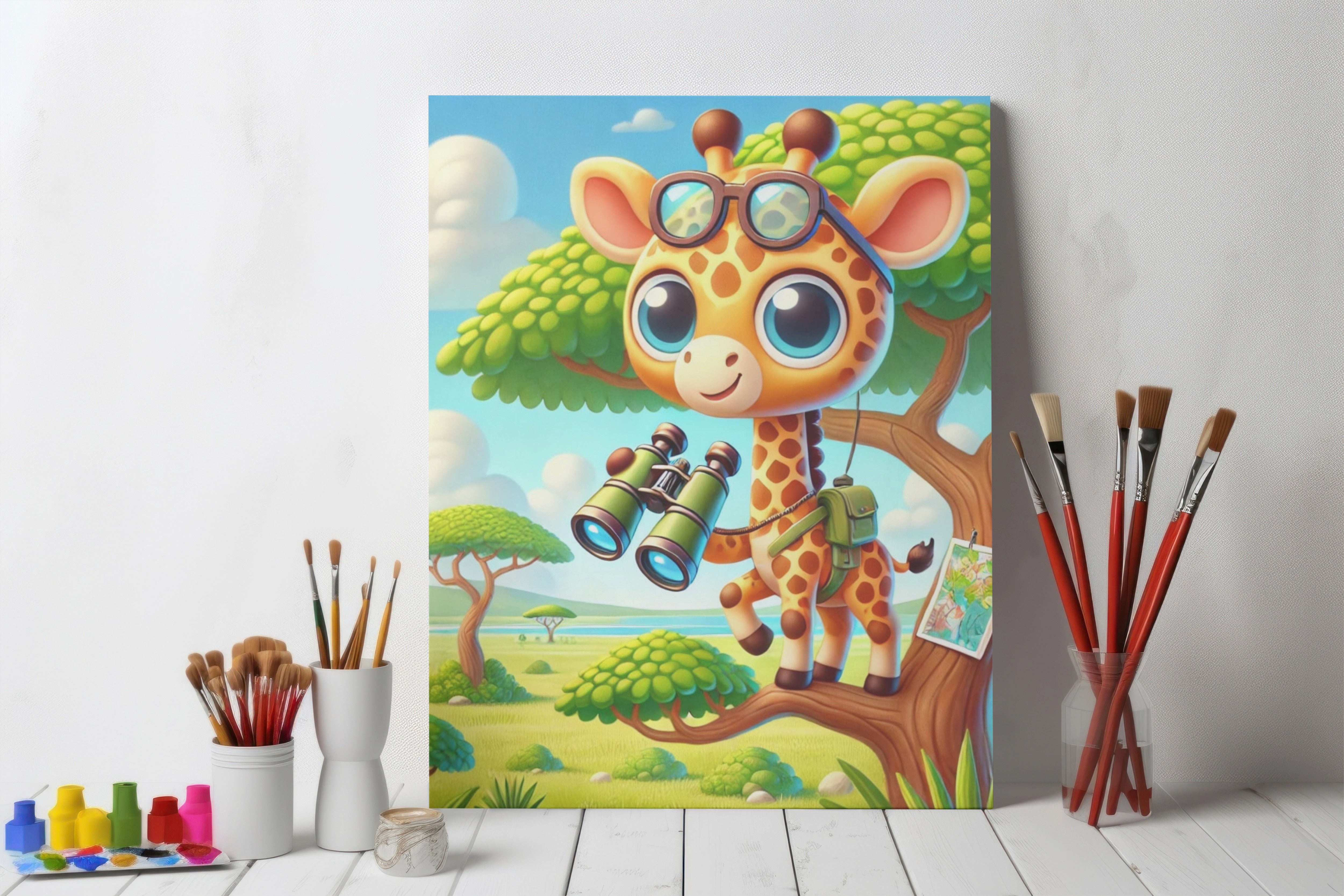 The enchanting artwork, Giraffe Lookout, features a tall, inquisitive giraffe perched high in a treetop with a map and binoculars in hand, surveying the horizon for discovery. The scene radiates playfulness and imagination, blending humor with elegance in a lighthearted composition. With its warm tones and expressive detail, this piece captures the spirit of adventure and wonder, making it a perfect addition to any space that celebrates creativity and joy.