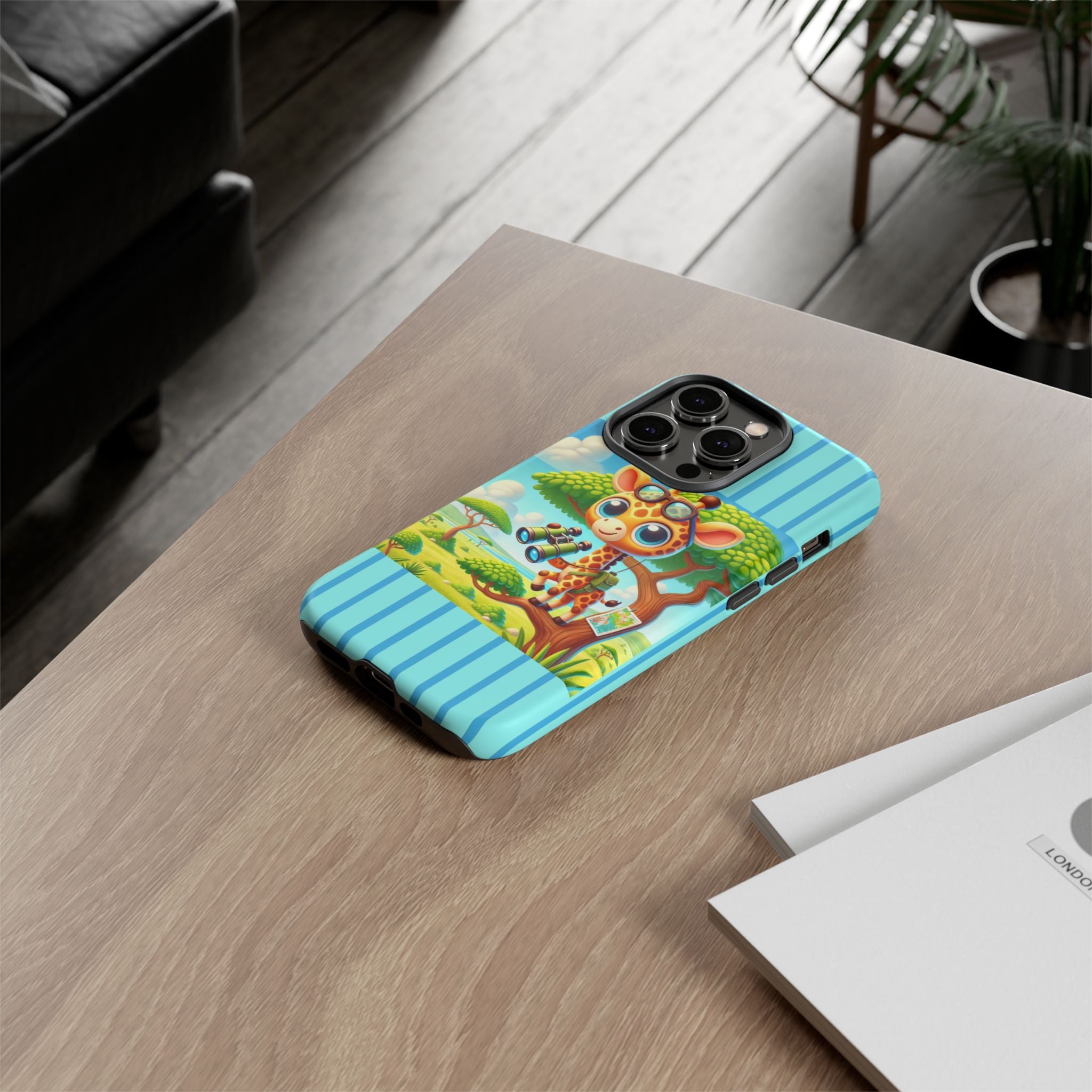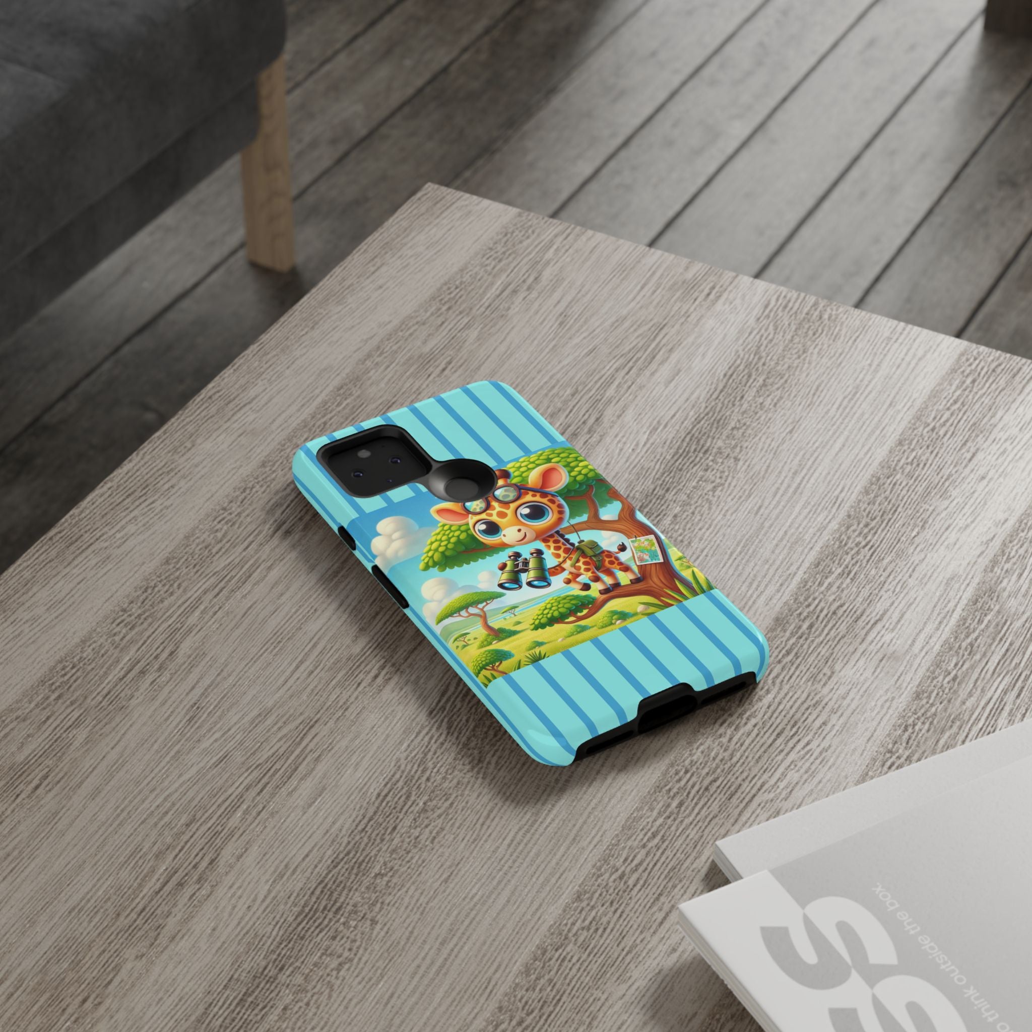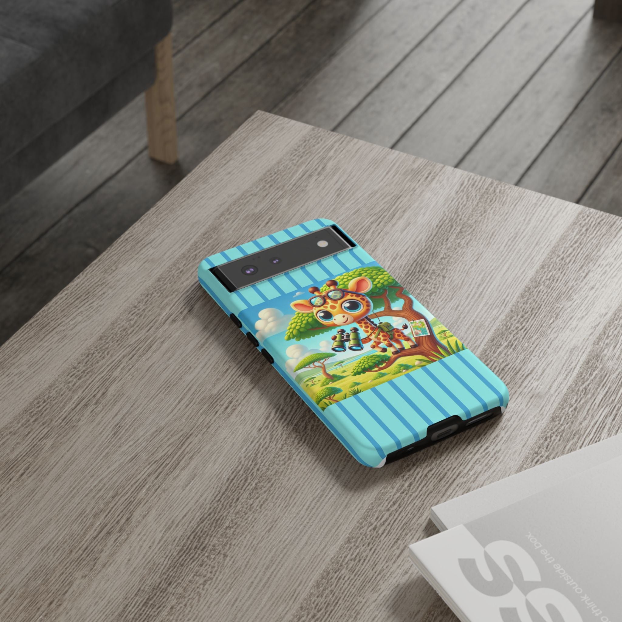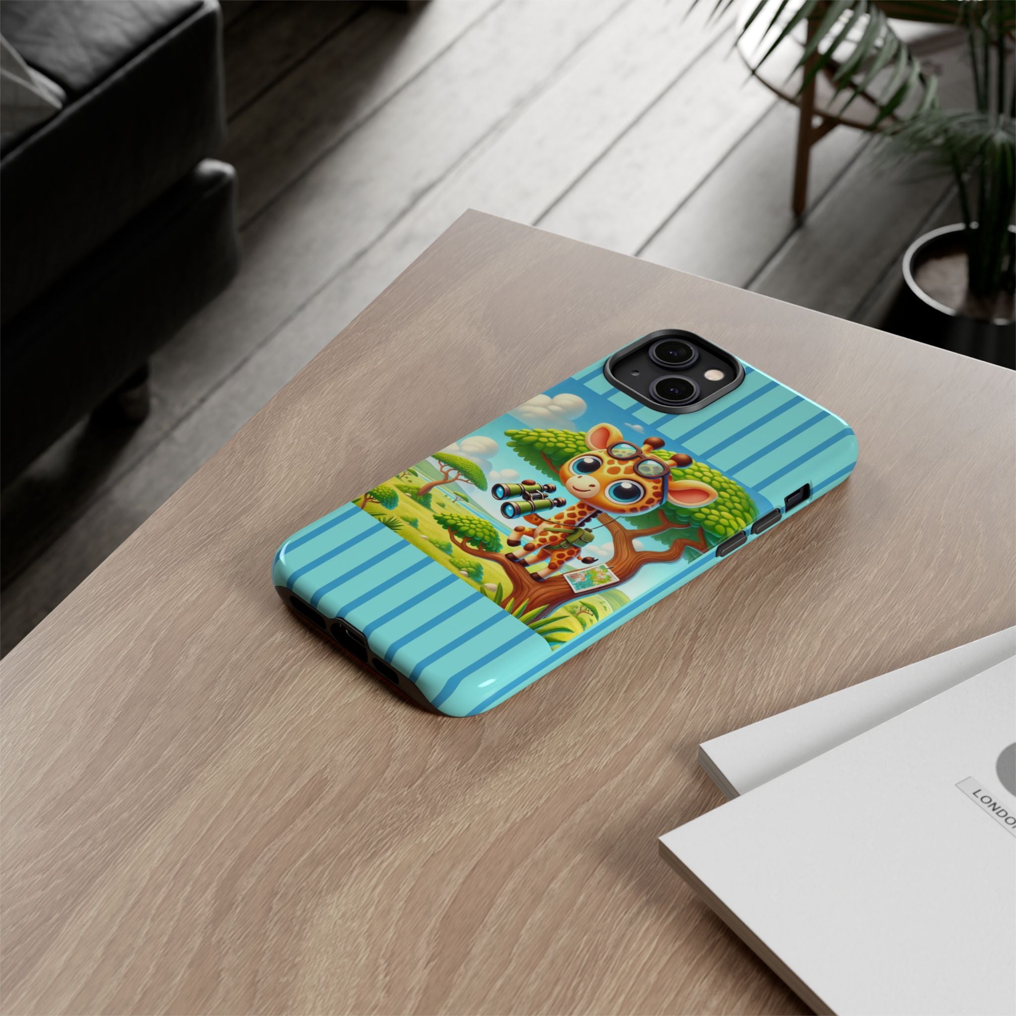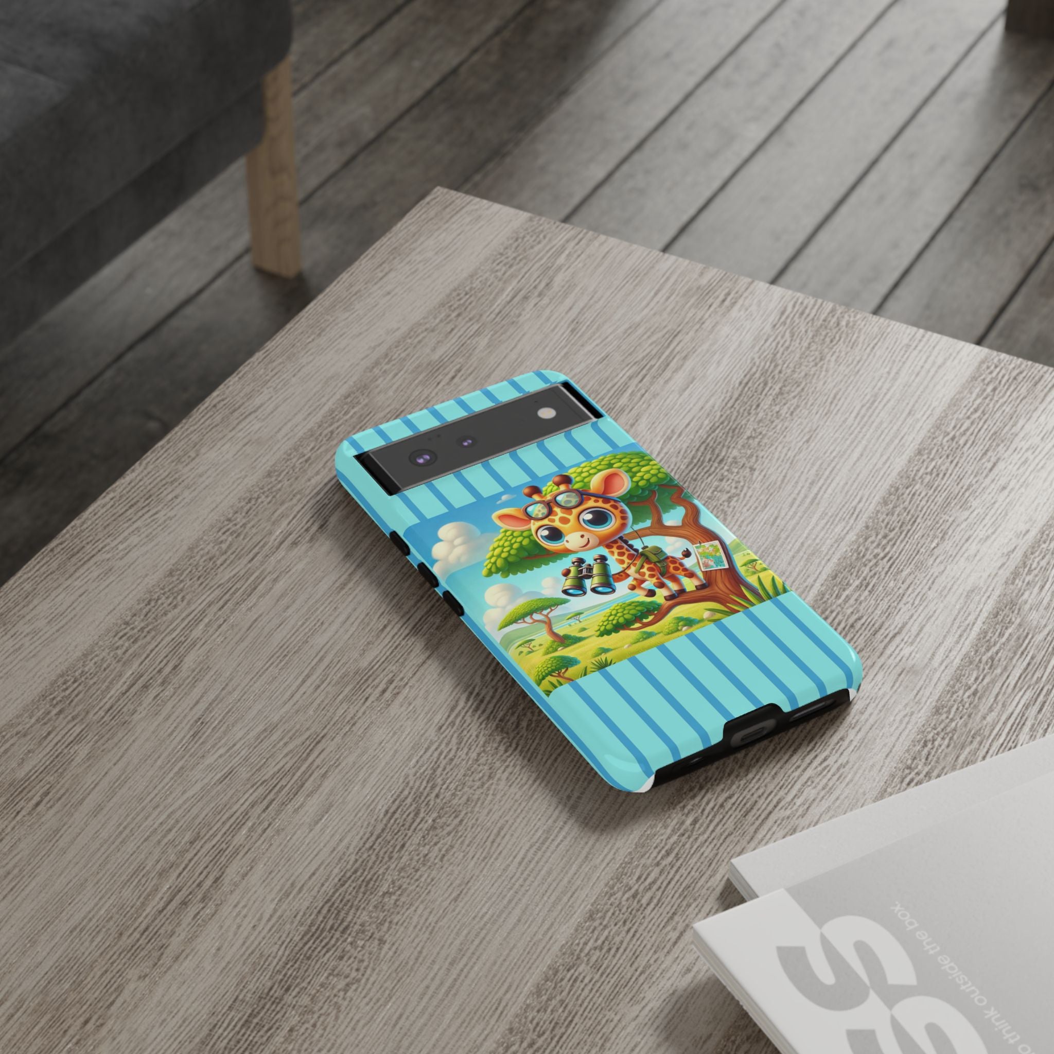 The enchanting illustration, Giraffe Lookout, features a tall, inquisitive giraffe perched high in a tree-top with a map and binoculars in hand, scanning the horizon for discovery. The scene captures a spirit of exploration and wonder, blending warm tones, expressive textures, and a touch of humor. With its whimsical charm and imaginative composition, this artwork transforms your phone into a joyful celebration of curiosity and creativity.