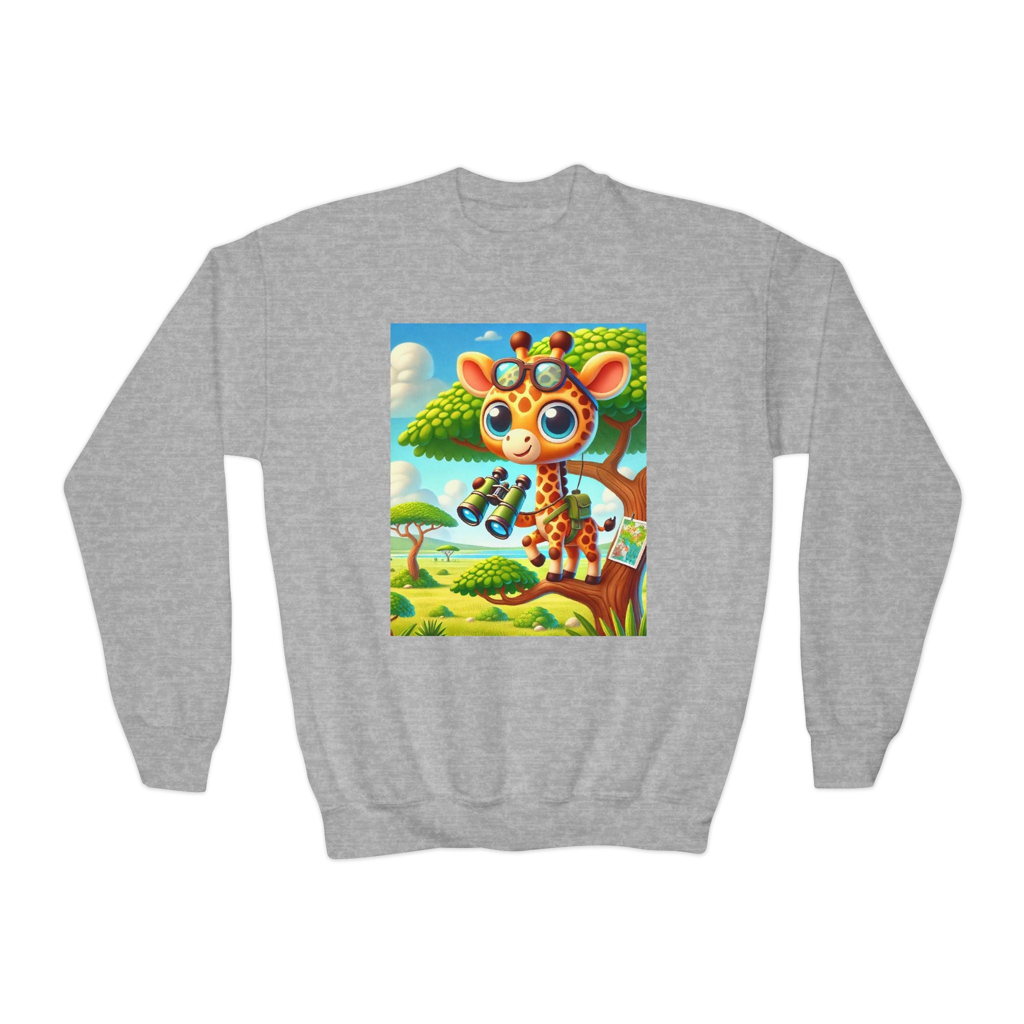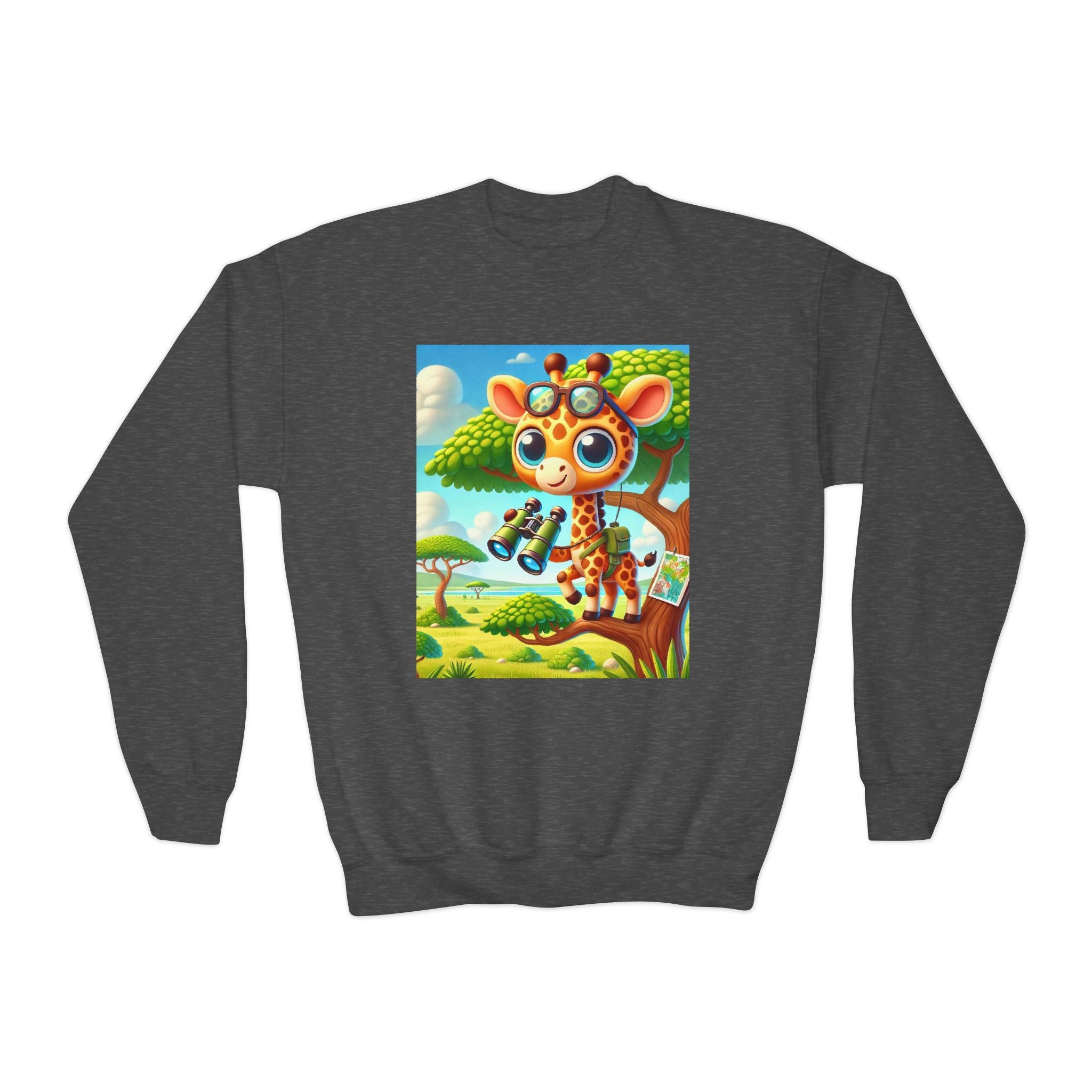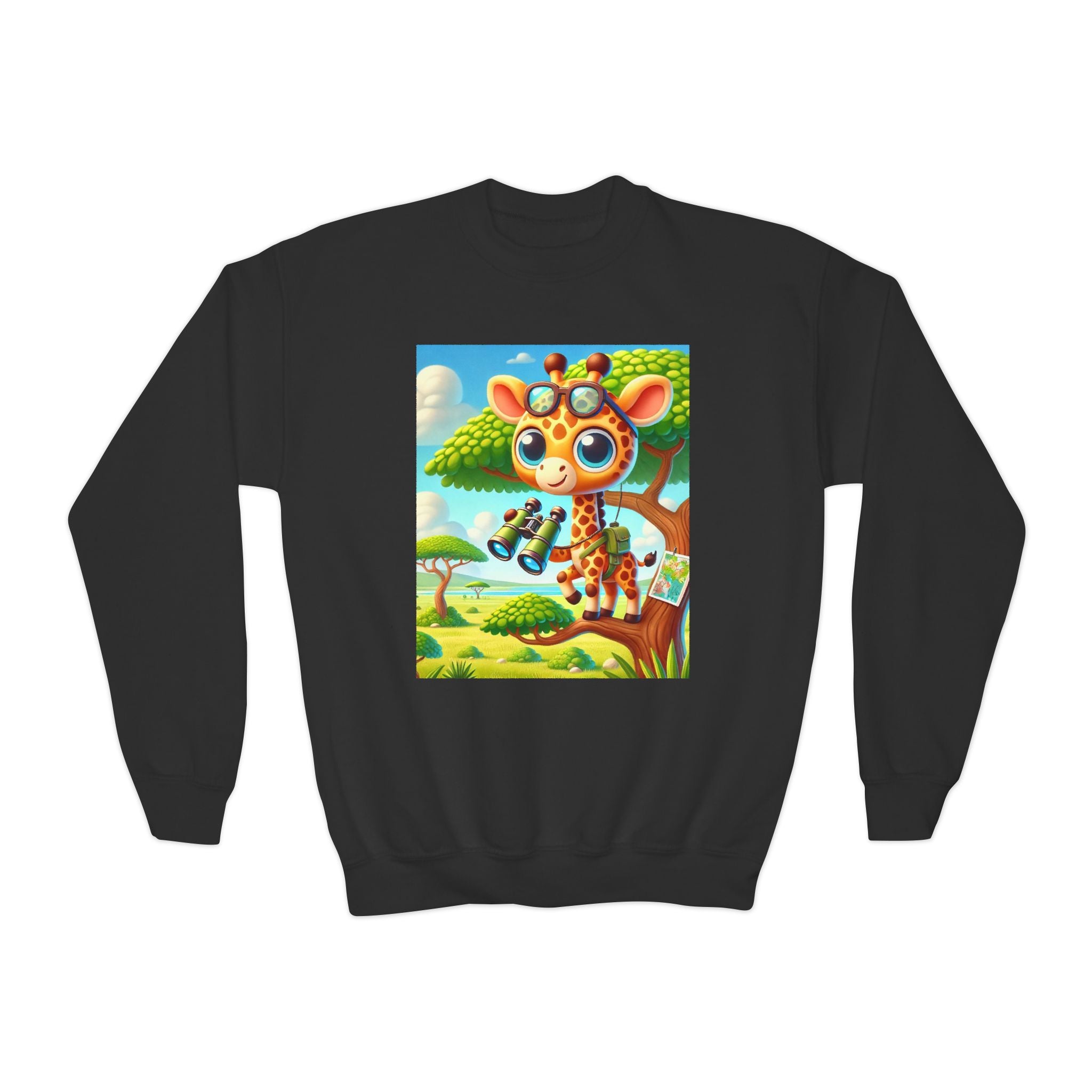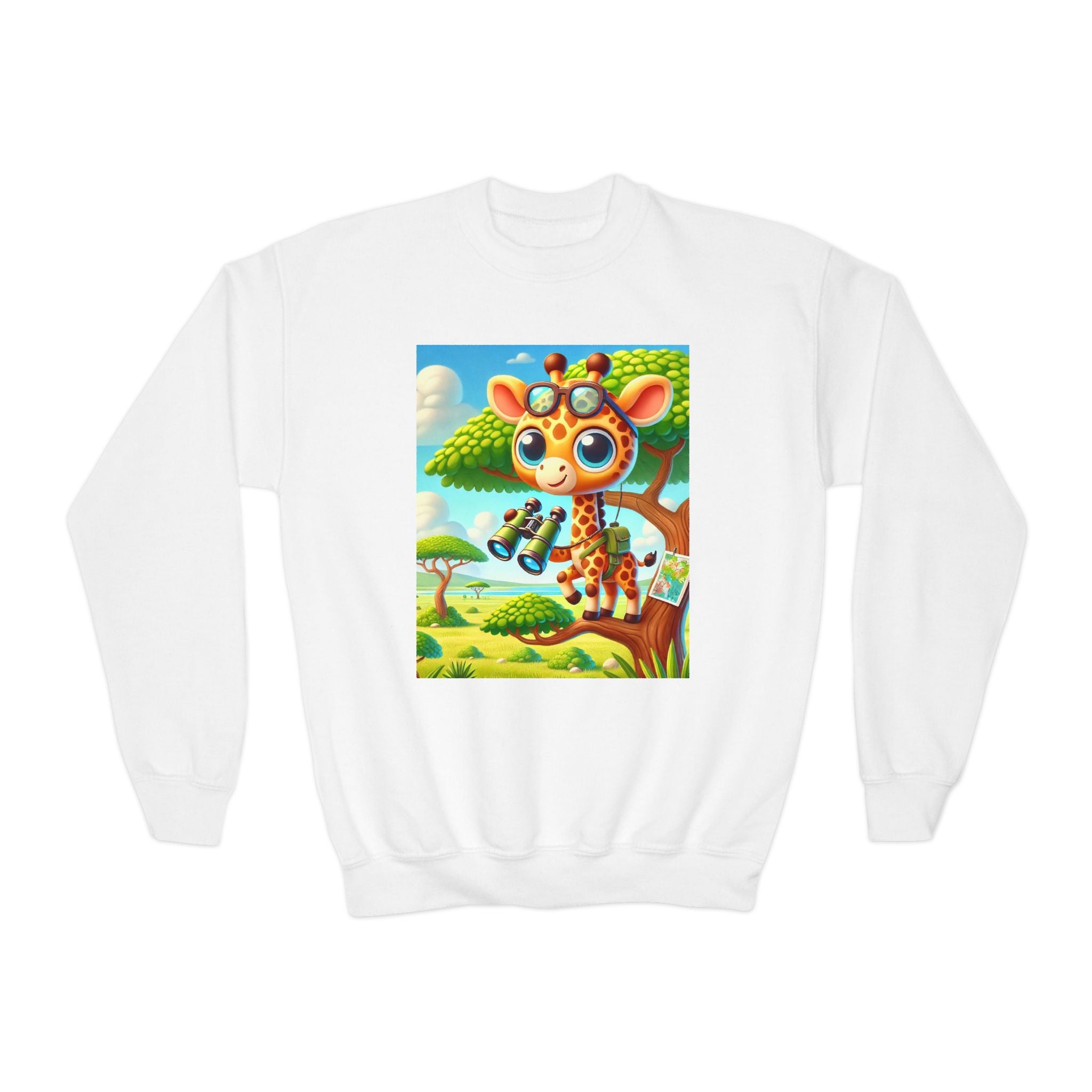This whimsical illustration features a tall giraffe perched in a treetop lookout, peering through binoculars while holding a map. The scene captures a spirit of adventure, curiosity, and exploration, brought to life through cheerful colors and gentle humor. Perfect for young explorers and dreamers, this sweatshirt adds a touch of imagination and joy to everyday wear.