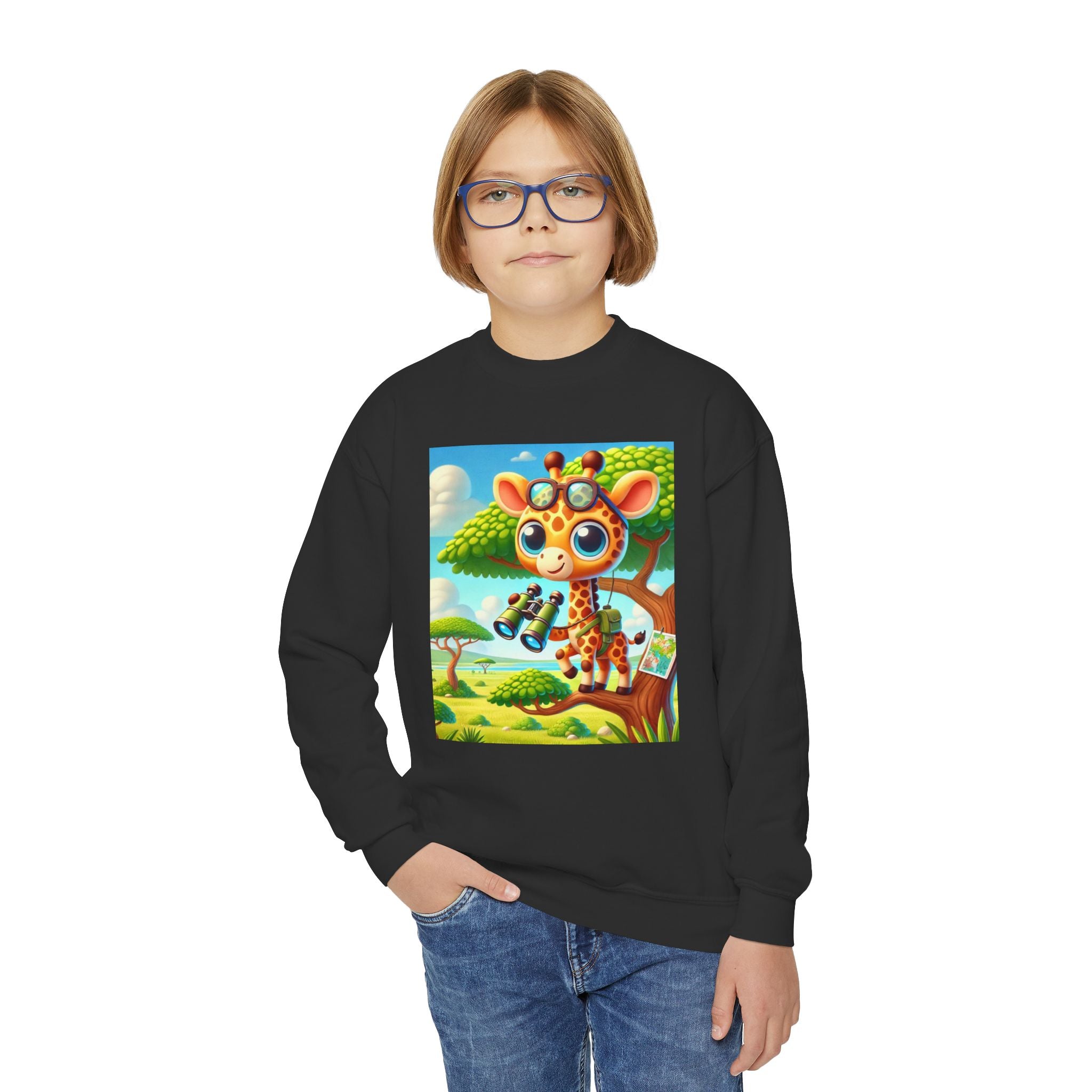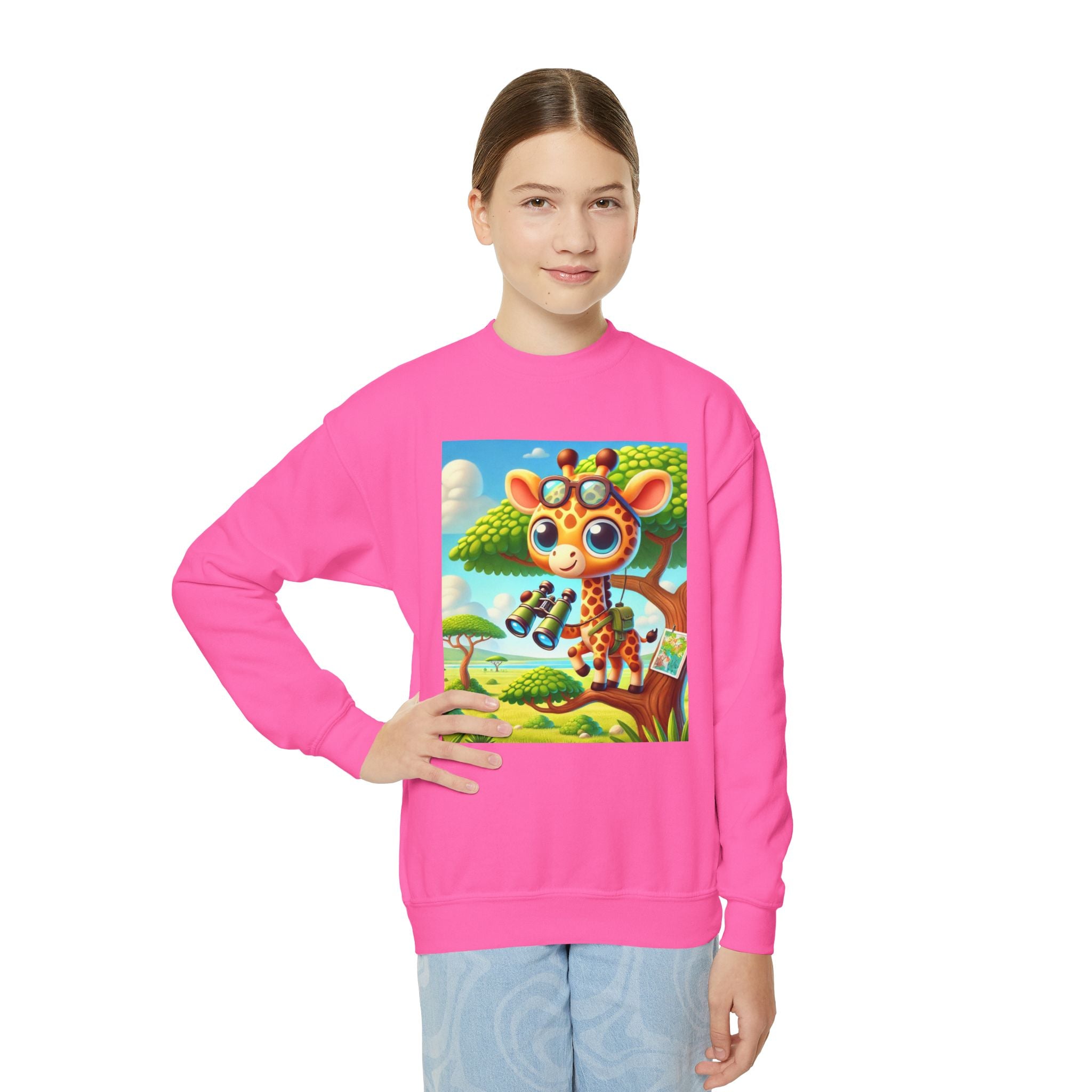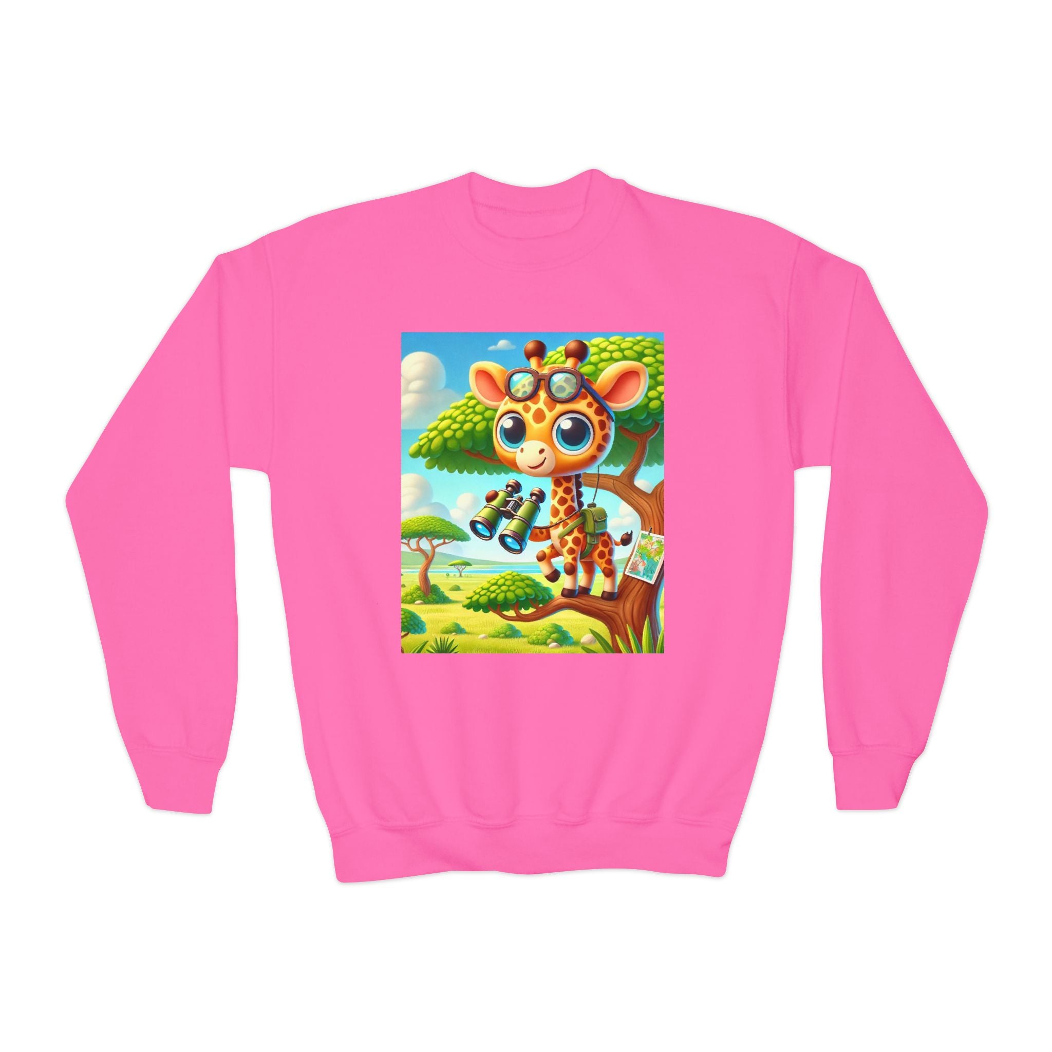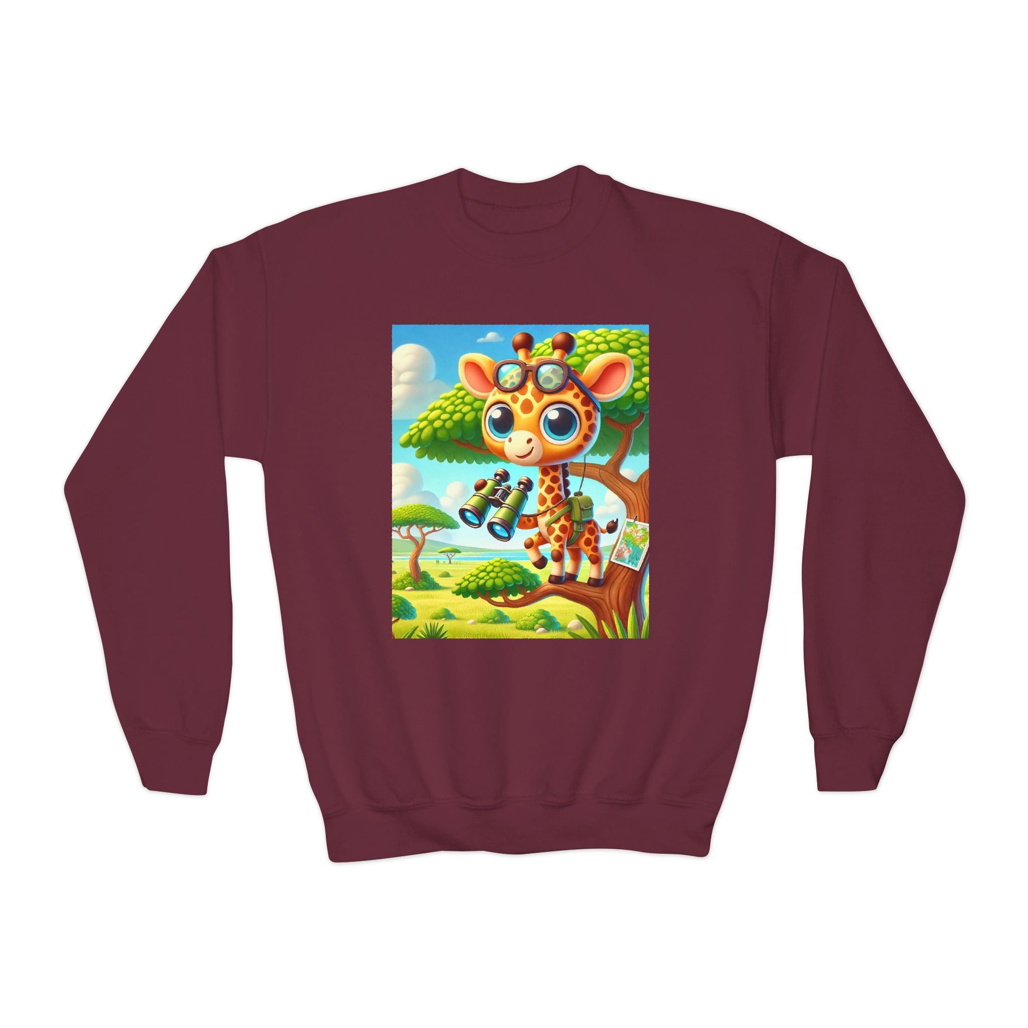 This whimsical illustration features a tall giraffe perched in a treetop lookout, peering through binoculars while holding a map. The scene captures a spirit of adventure, curiosity, and exploration, brought to life through cheerful colors and gentle humor. Perfect for young explorers and dreamers, this sweatshirt adds a touch of imagination and joy to everyday wear.