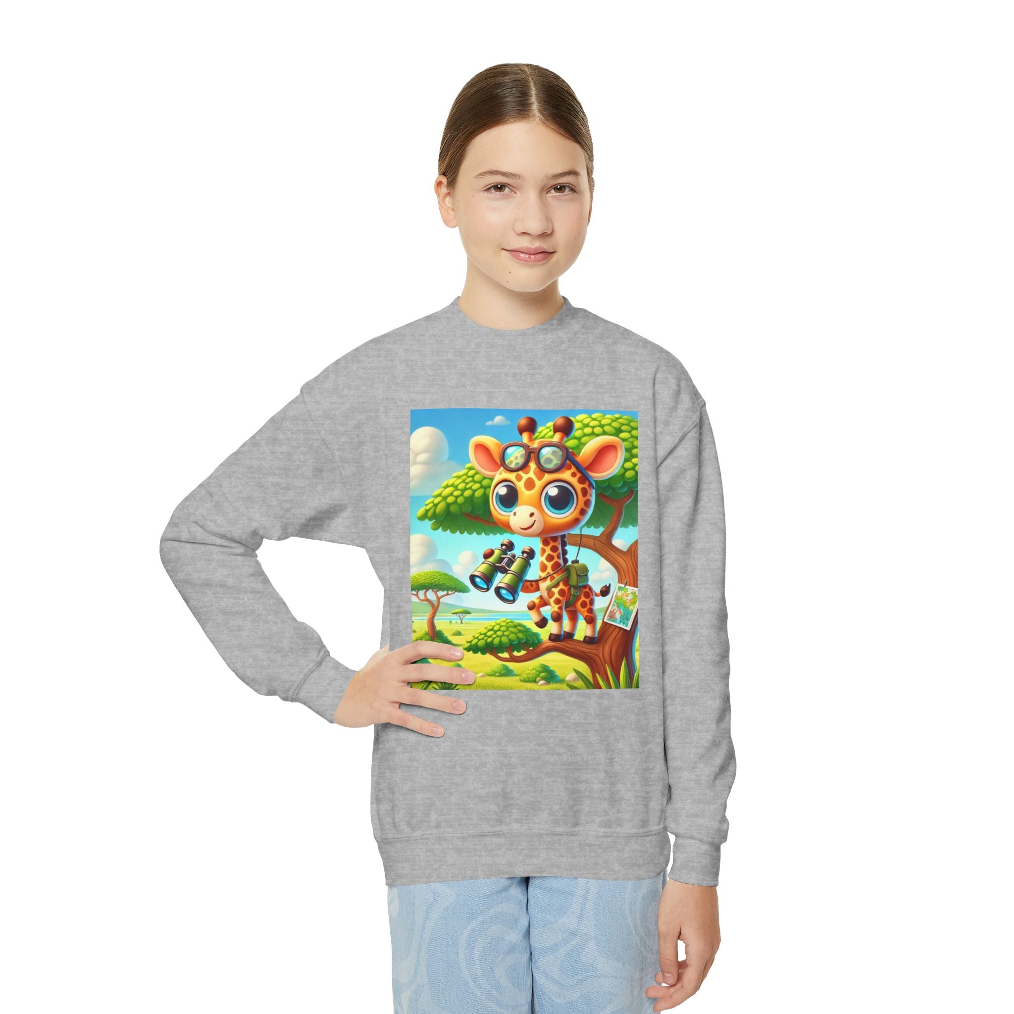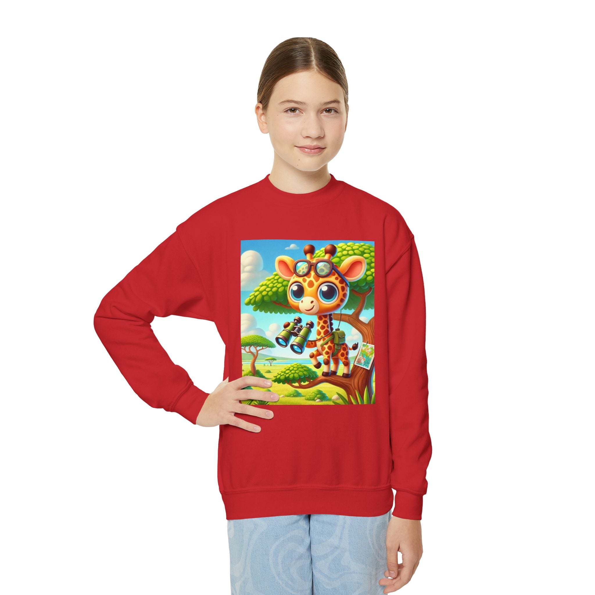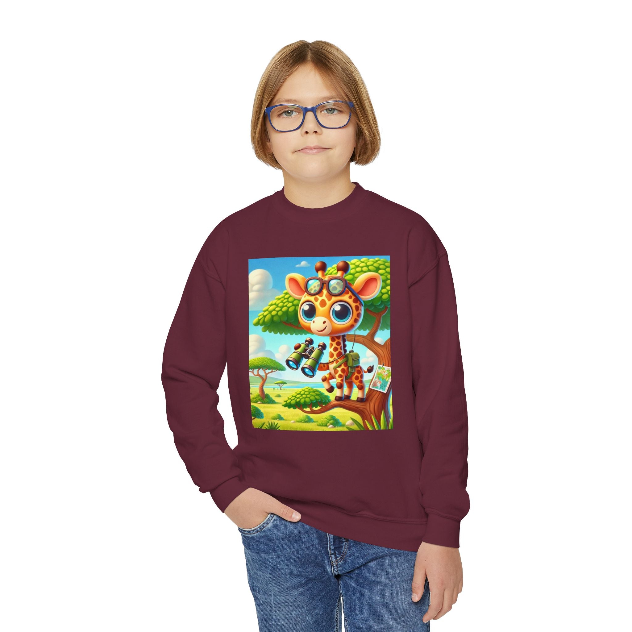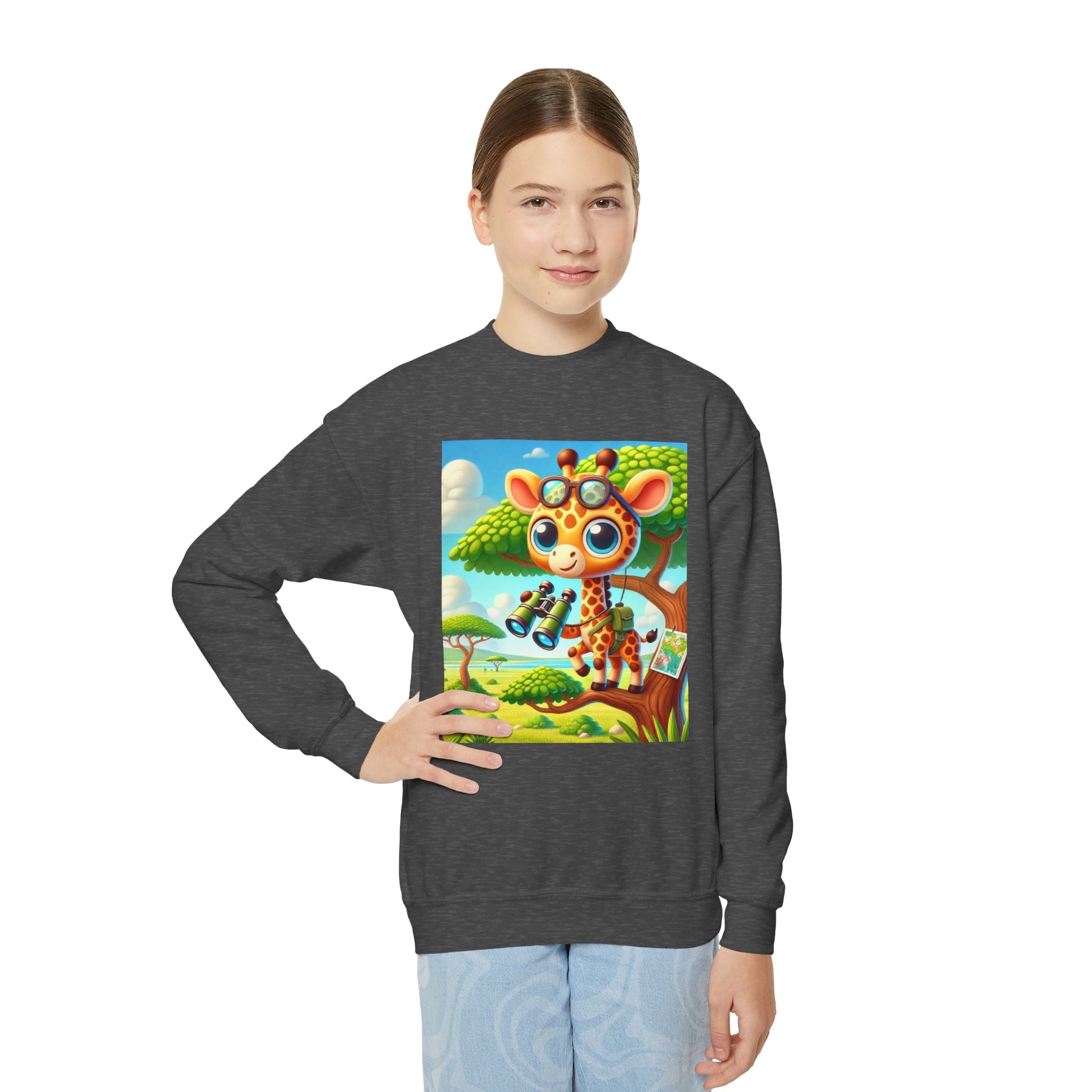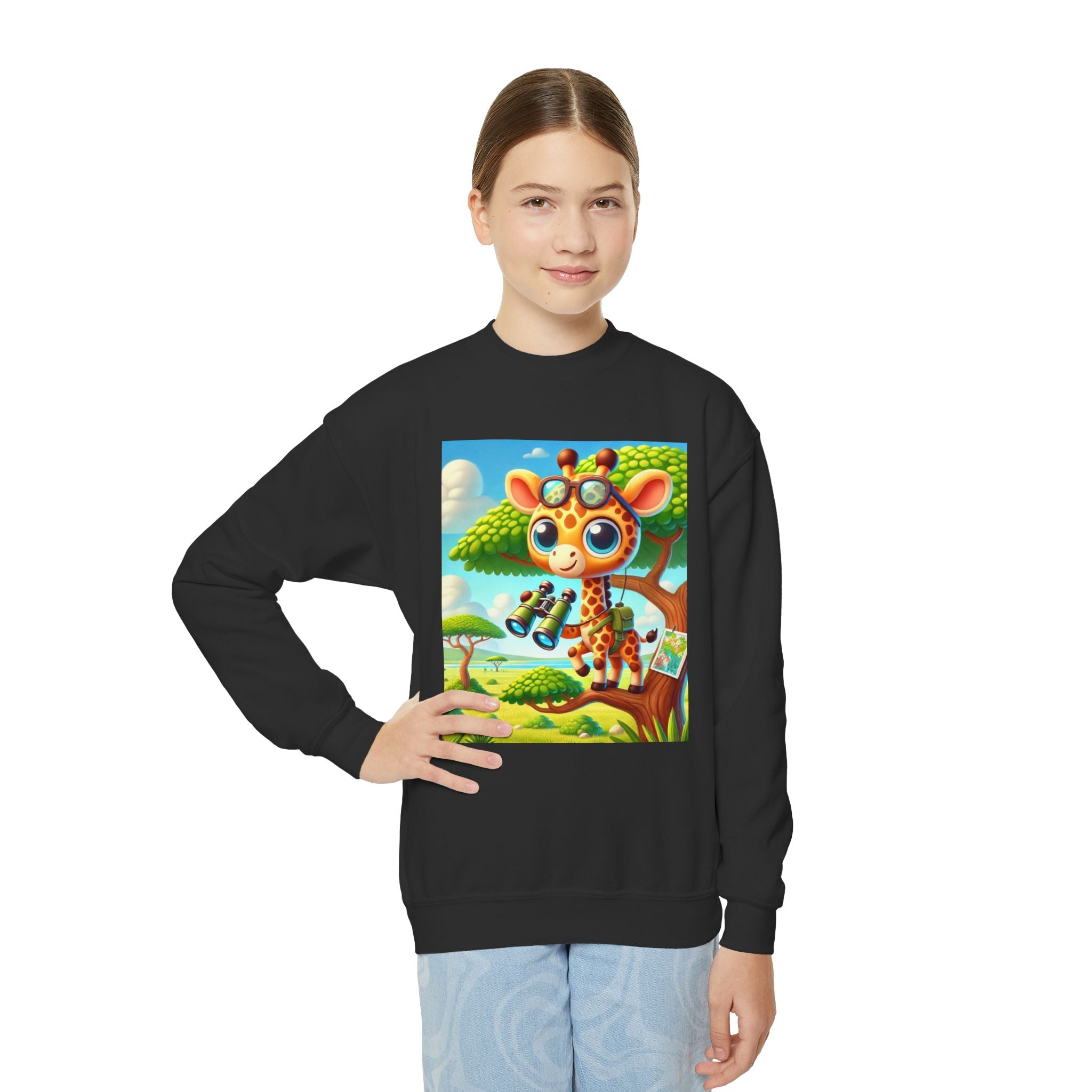 This whimsical illustration features a tall giraffe perched in a treetop lookout, peering through binoculars while holding a map. The scene captures a spirit of adventure, curiosity, and exploration, brought to life through cheerful colors and gentle humor. Perfect for young explorers and dreamers, this sweatshirt adds a touch of imagination and joy to everyday wear.