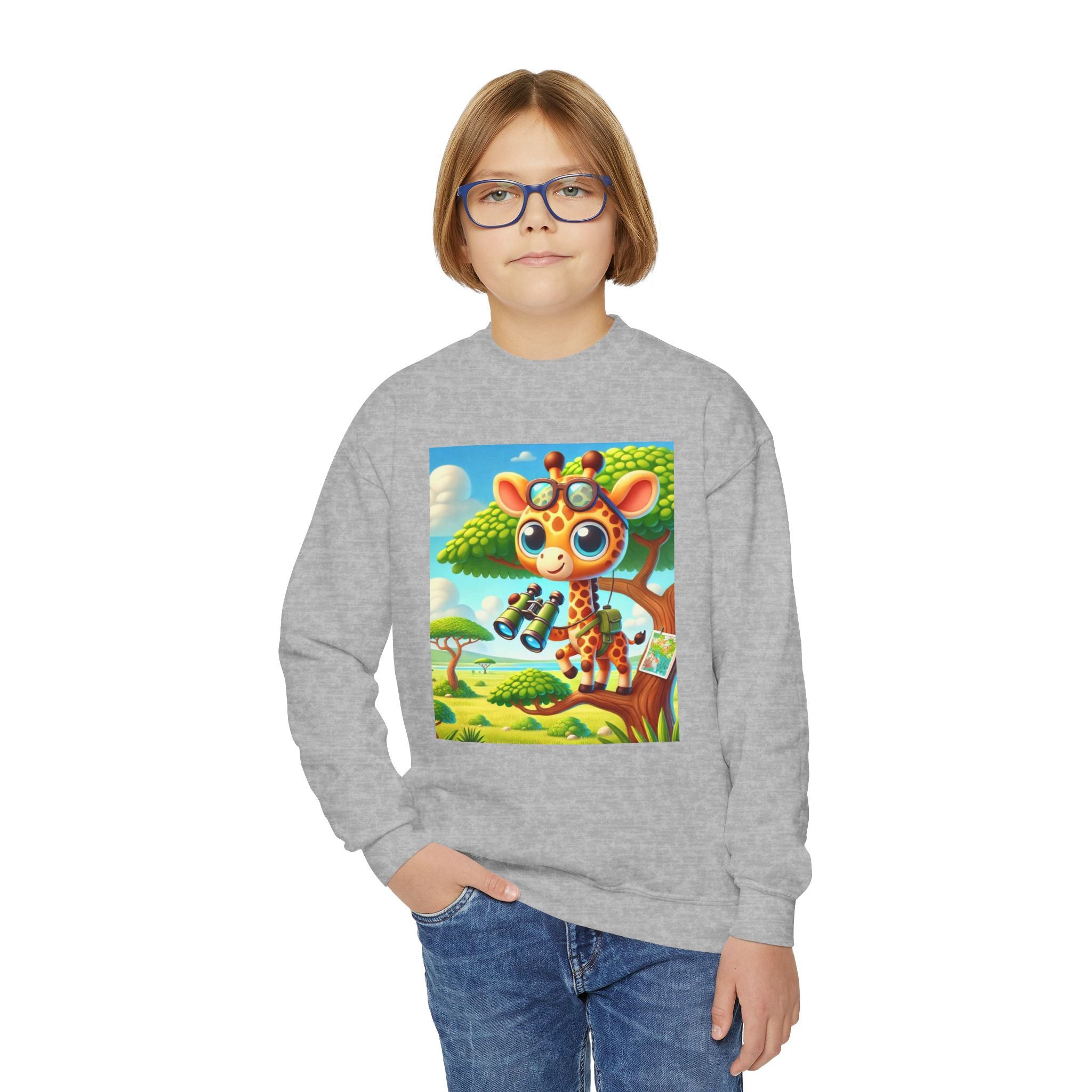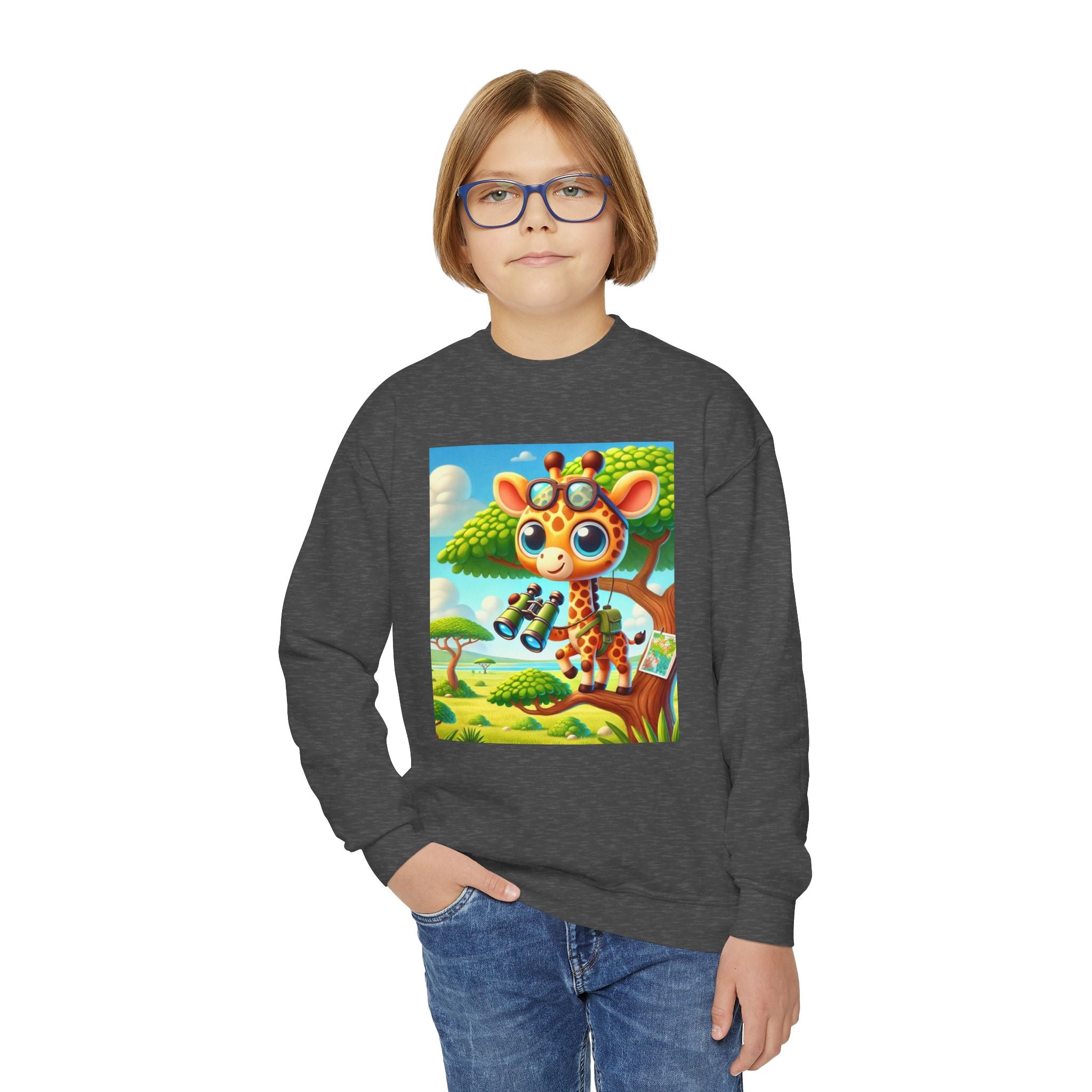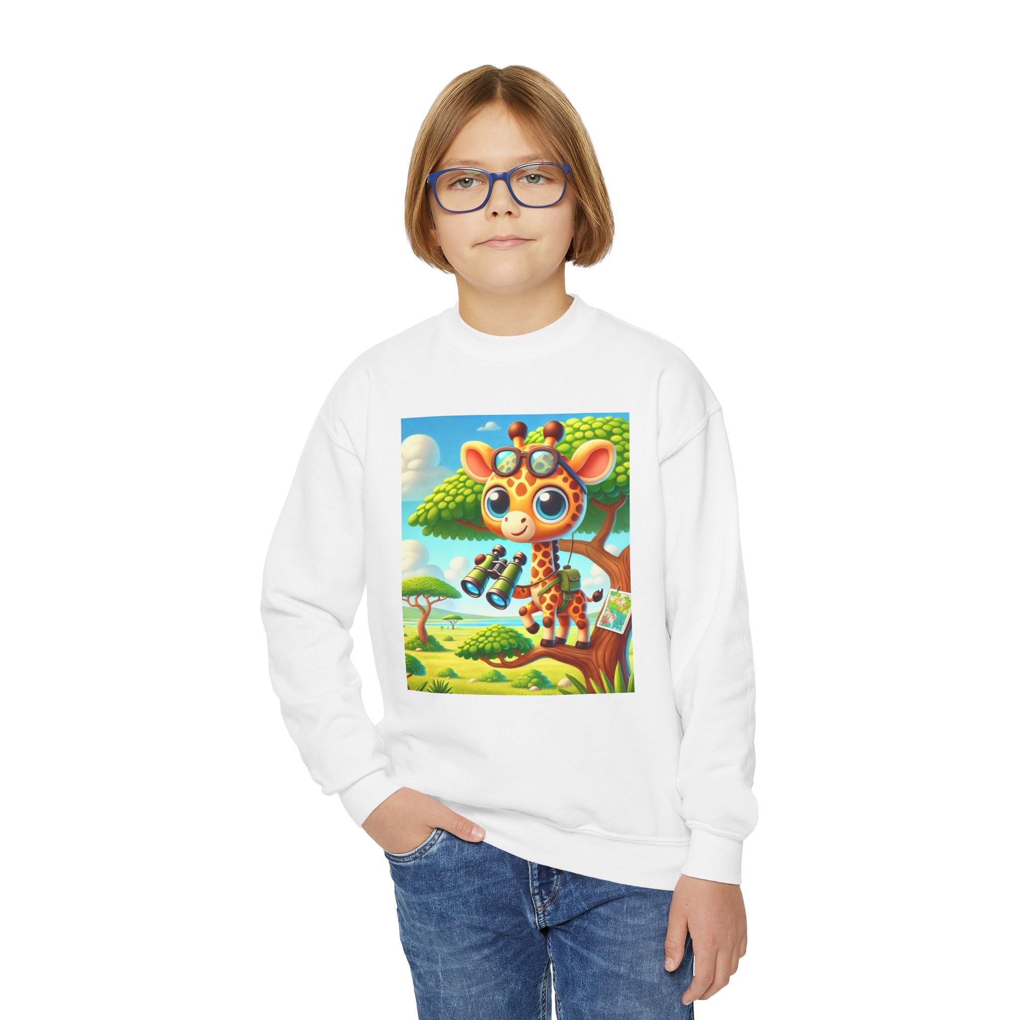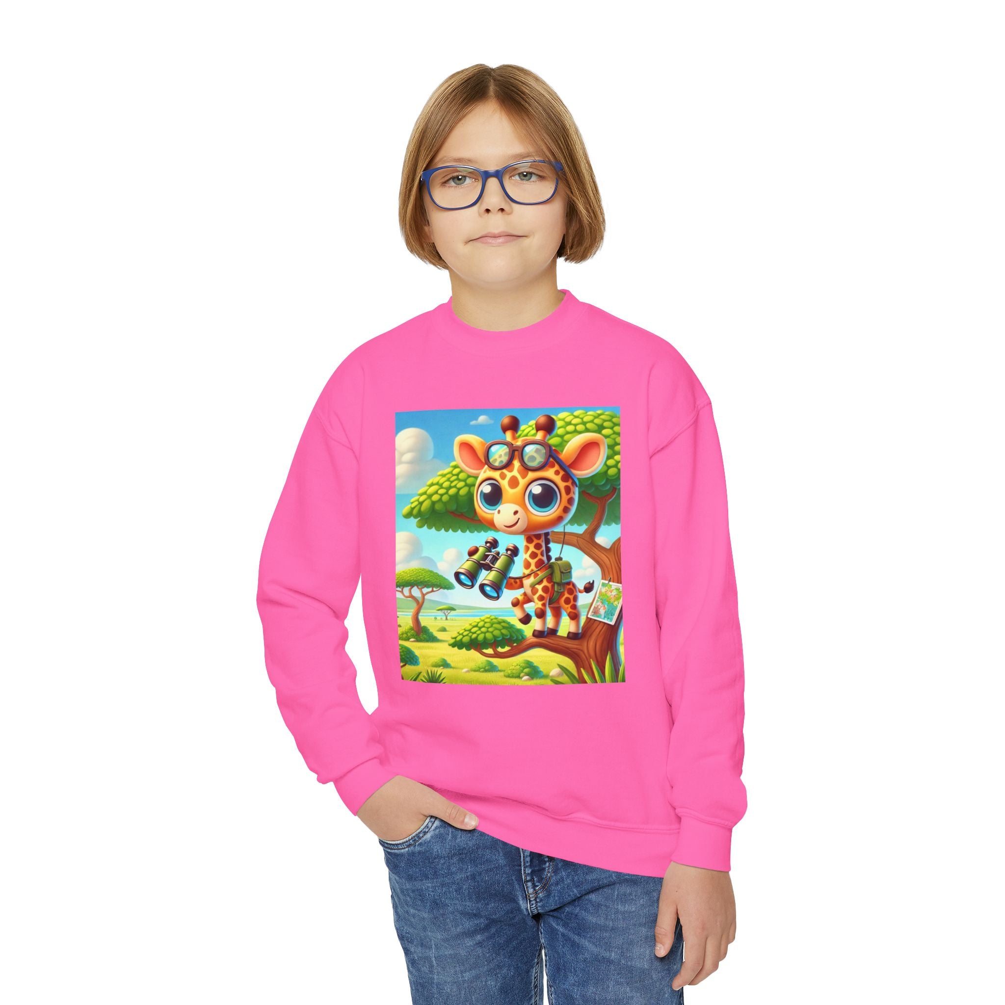 This whimsical illustration features a tall giraffe perched in a treetop lookout, peering through binoculars while holding a map. The scene captures a spirit of adventure, curiosity, and exploration, brought to life through cheerful colors and gentle humor. Perfect for young explorers and dreamers, this sweatshirt adds a touch of imagination and joy to everyday wear.