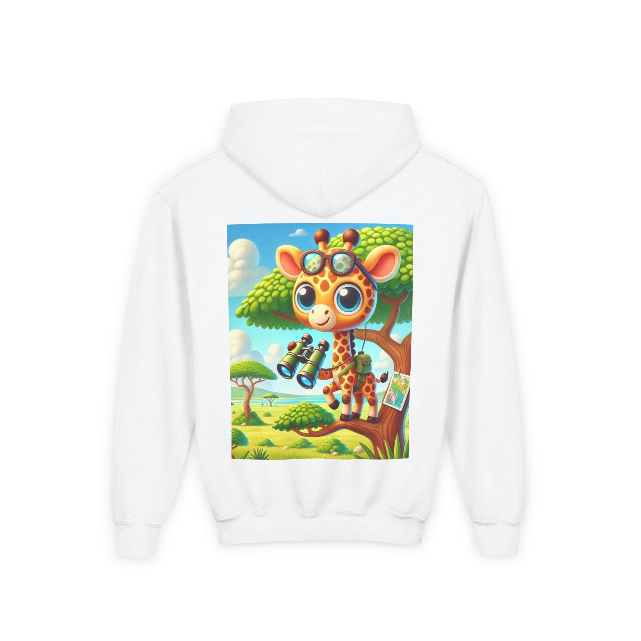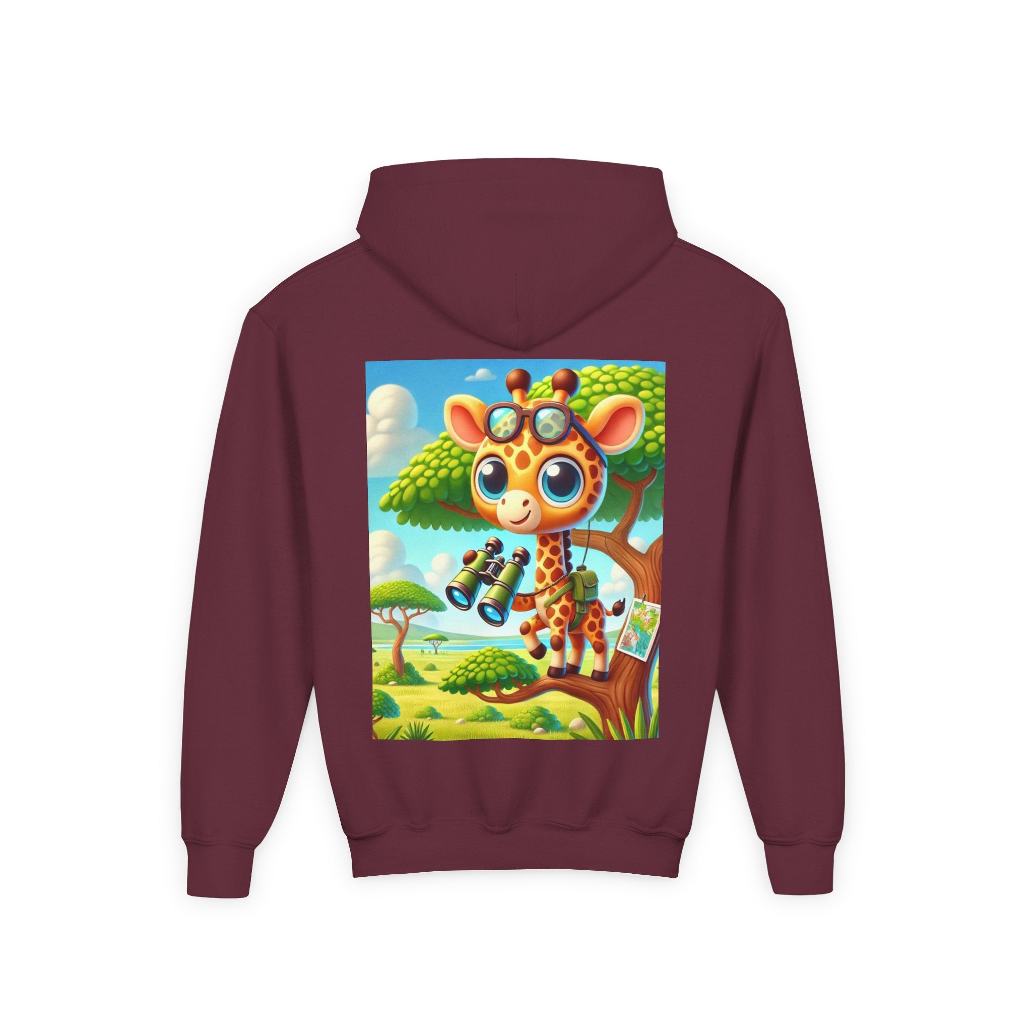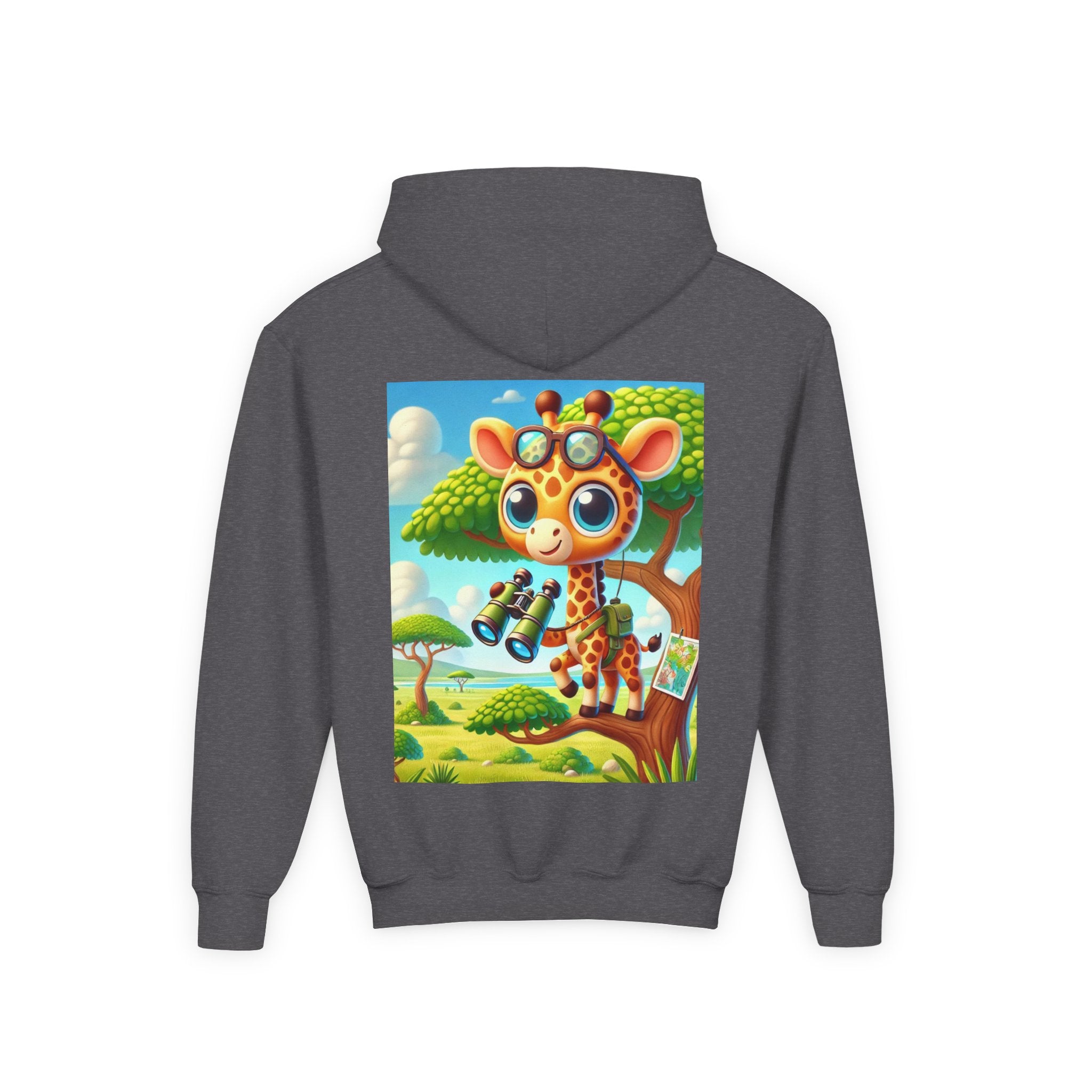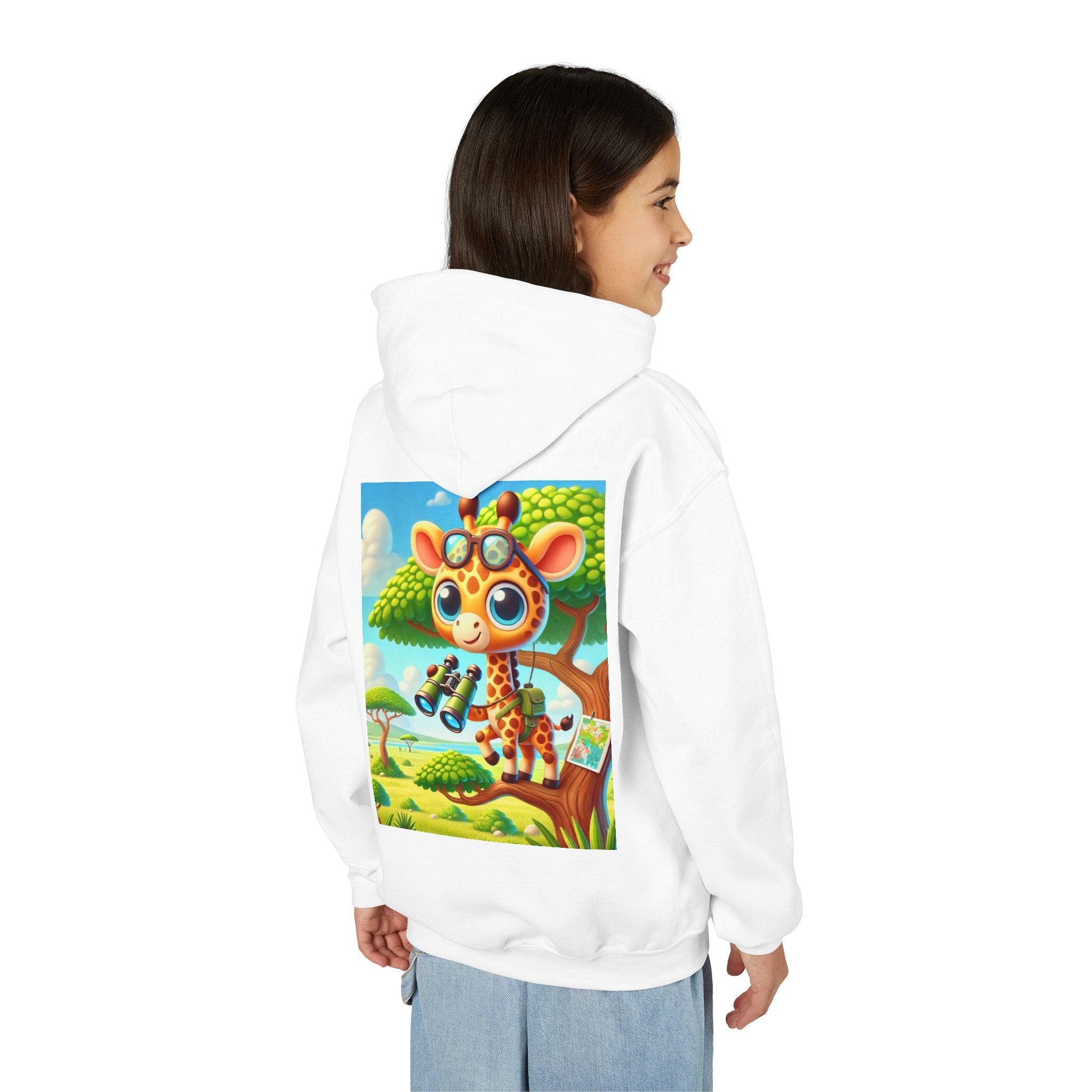 Giraffe Lookout Youth Heavy Blend Hooded Sweatshirt combines cozy comfort with imaginative adventure. Made from ultra-soft, preshrunk fleece, this hoodie feels smooth against the skin and resists lint buildup for long-lasting wear. The 50/50 cotton-polyester blend offers the perfect balance of warmth, softness, and durability. With a roomy kangaroo pocket and twill-reinforced neck, it’s designed for everyday comfort and playful exploration. Please note: due to the fabric properties, the White color variant may appear slightly off-white.