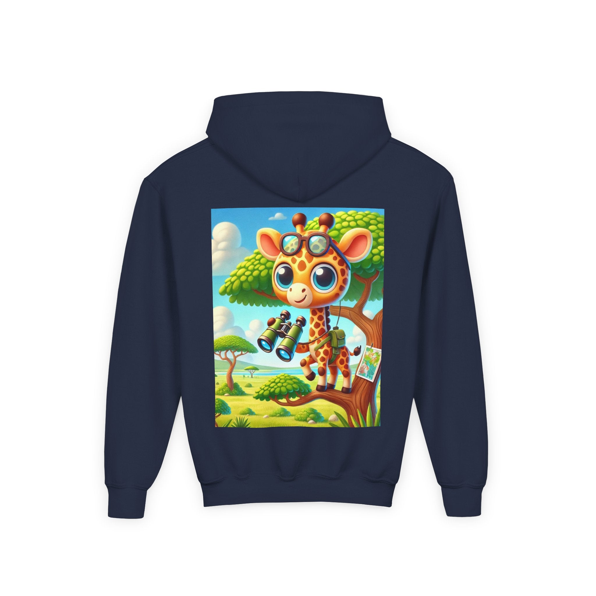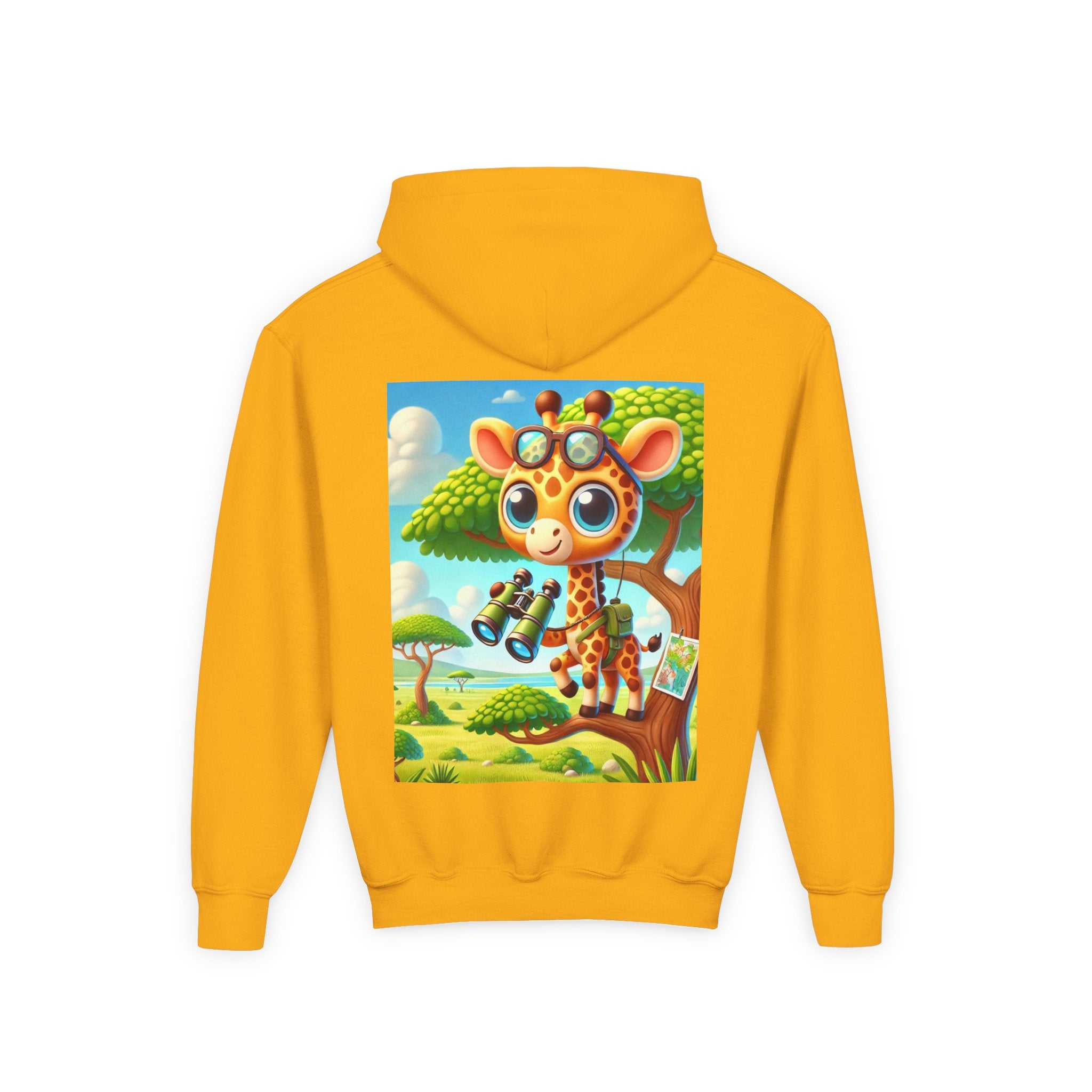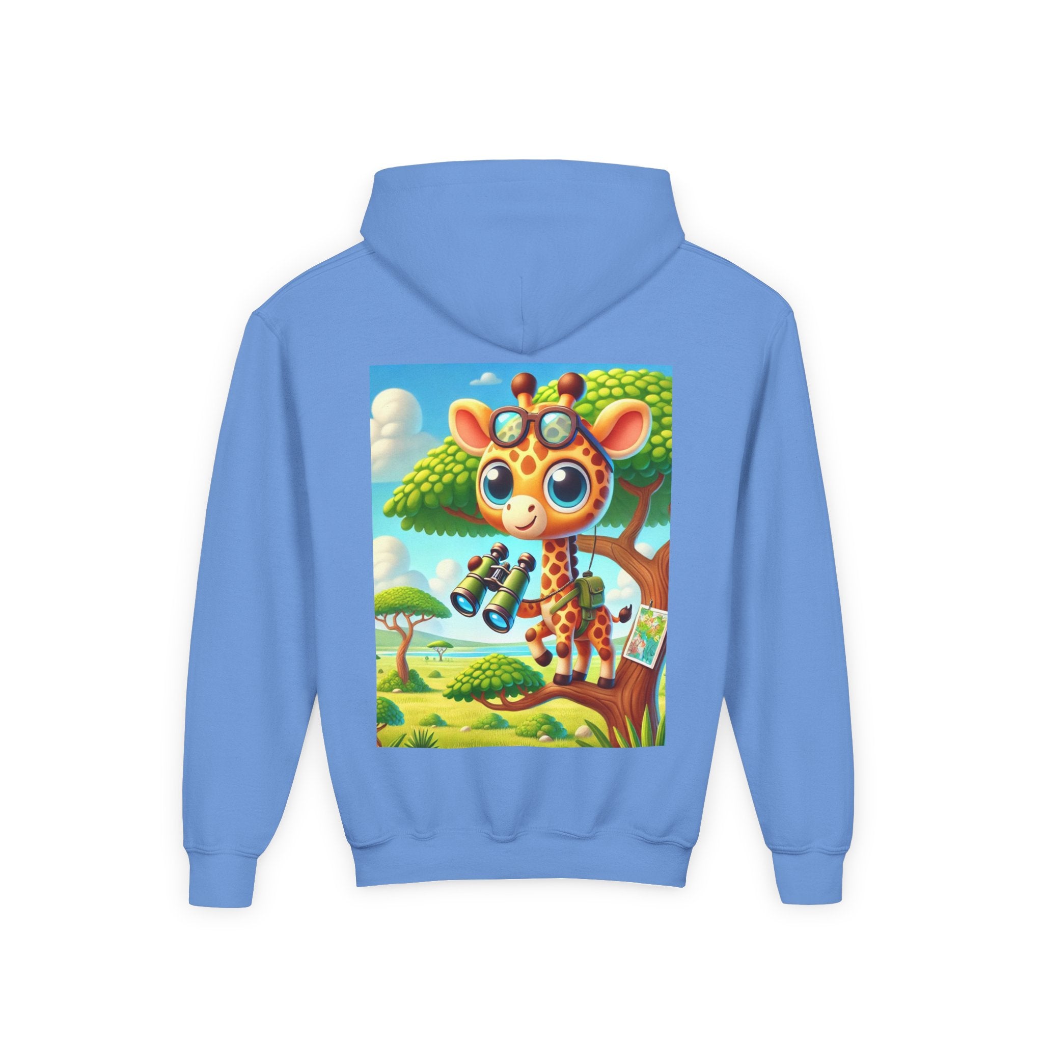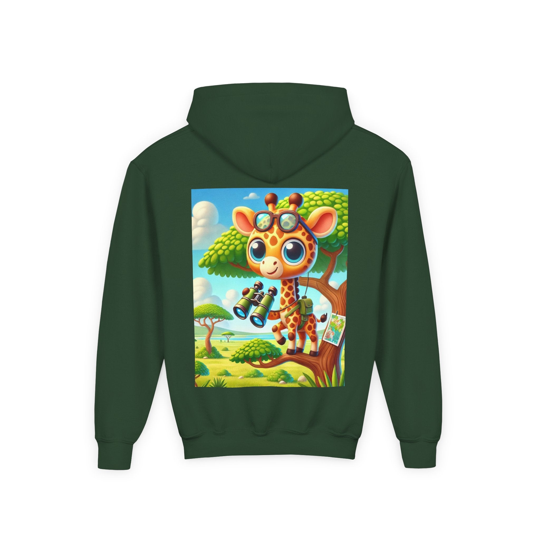 Giraffe Lookout Youth Heavy Blend Hooded Sweatshirt combines cozy comfort with imaginative adventure. Made from ultra-soft, preshrunk fleece, this hoodie feels smooth against the skin and resists lint buildup for long-lasting wear. The 50/50 cotton-polyester blend offers the perfect balance of warmth, softness, and durability. With a roomy kangaroo pocket and twill-reinforced neck, it’s designed for everyday comfort and playful exploration. Please note: due to the fabric properties, the White color variant may appear slightly off-white.