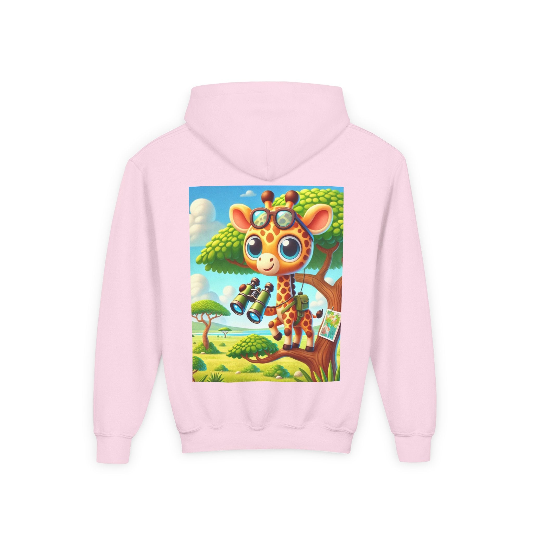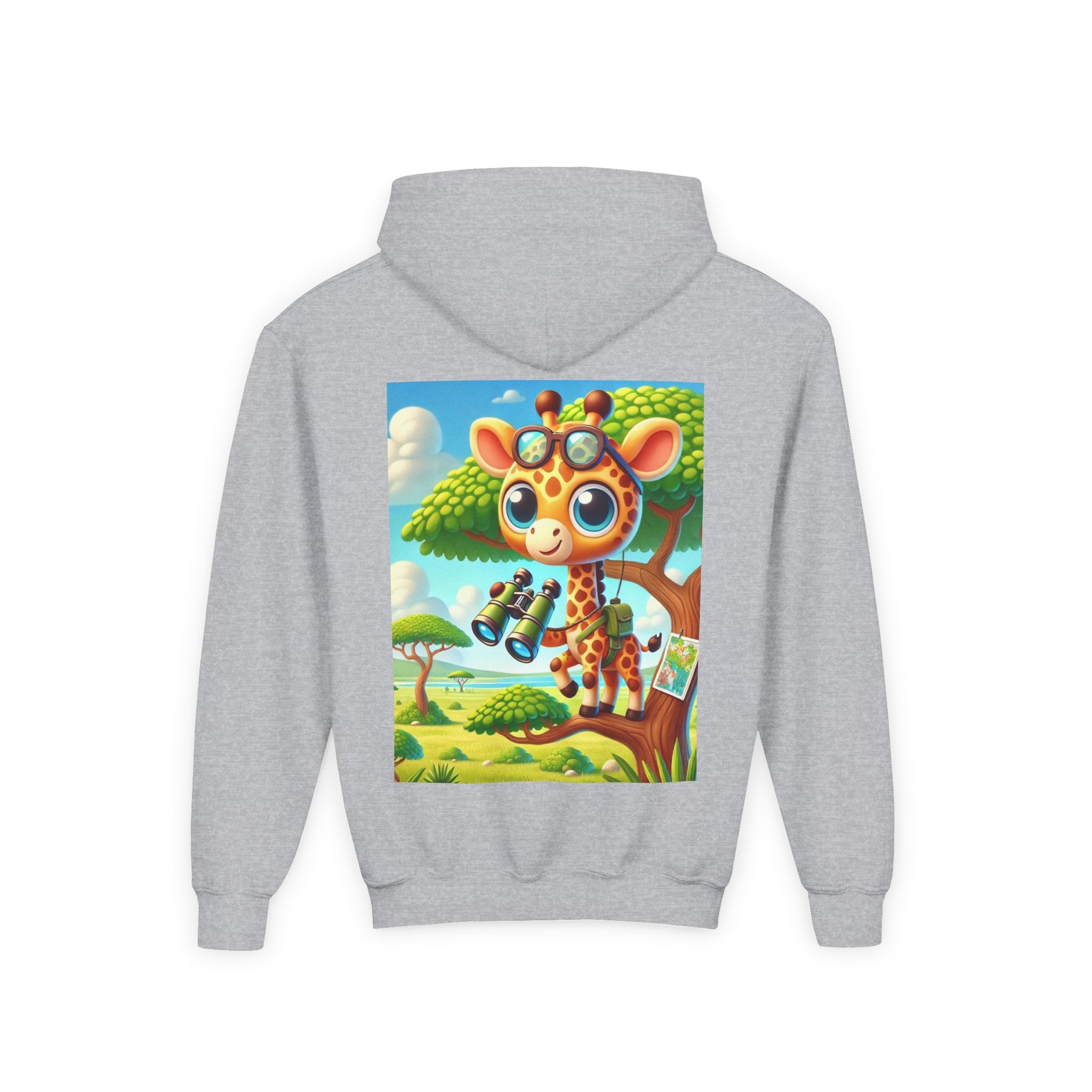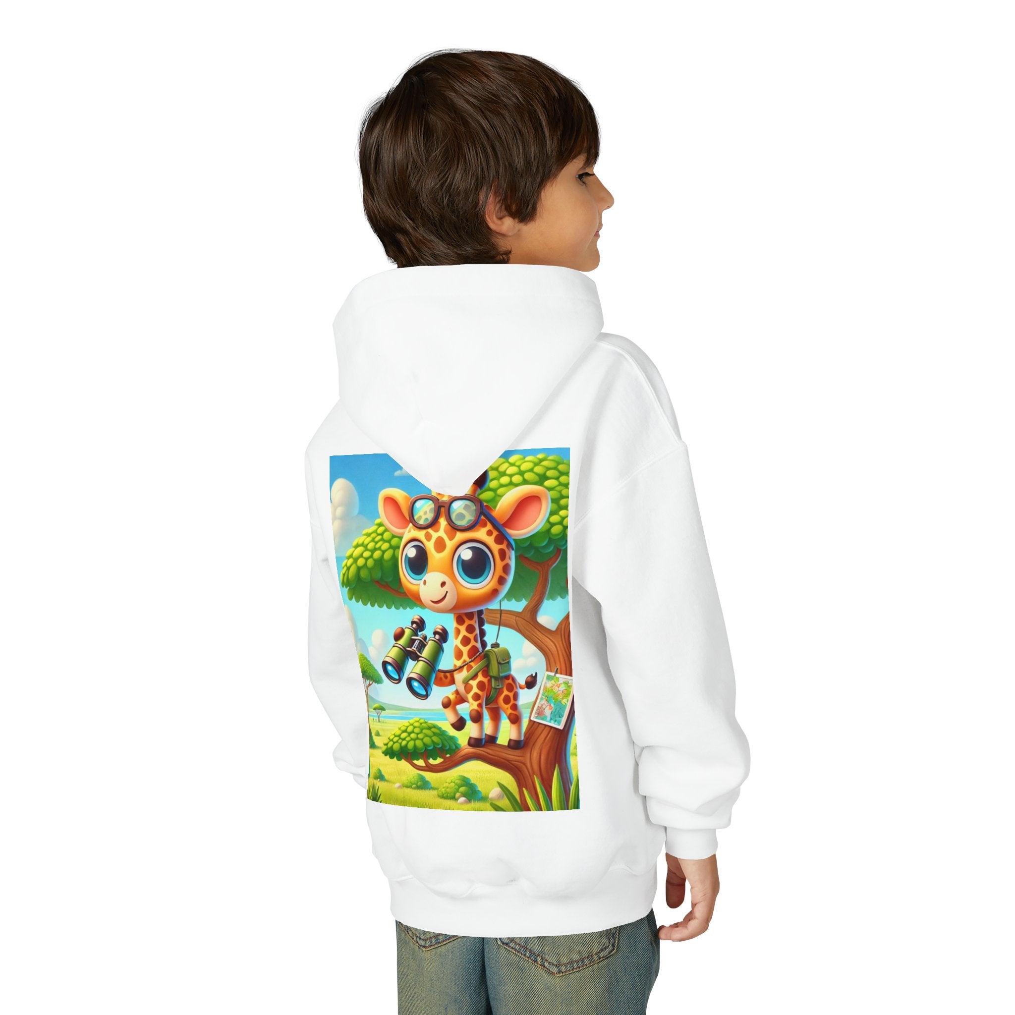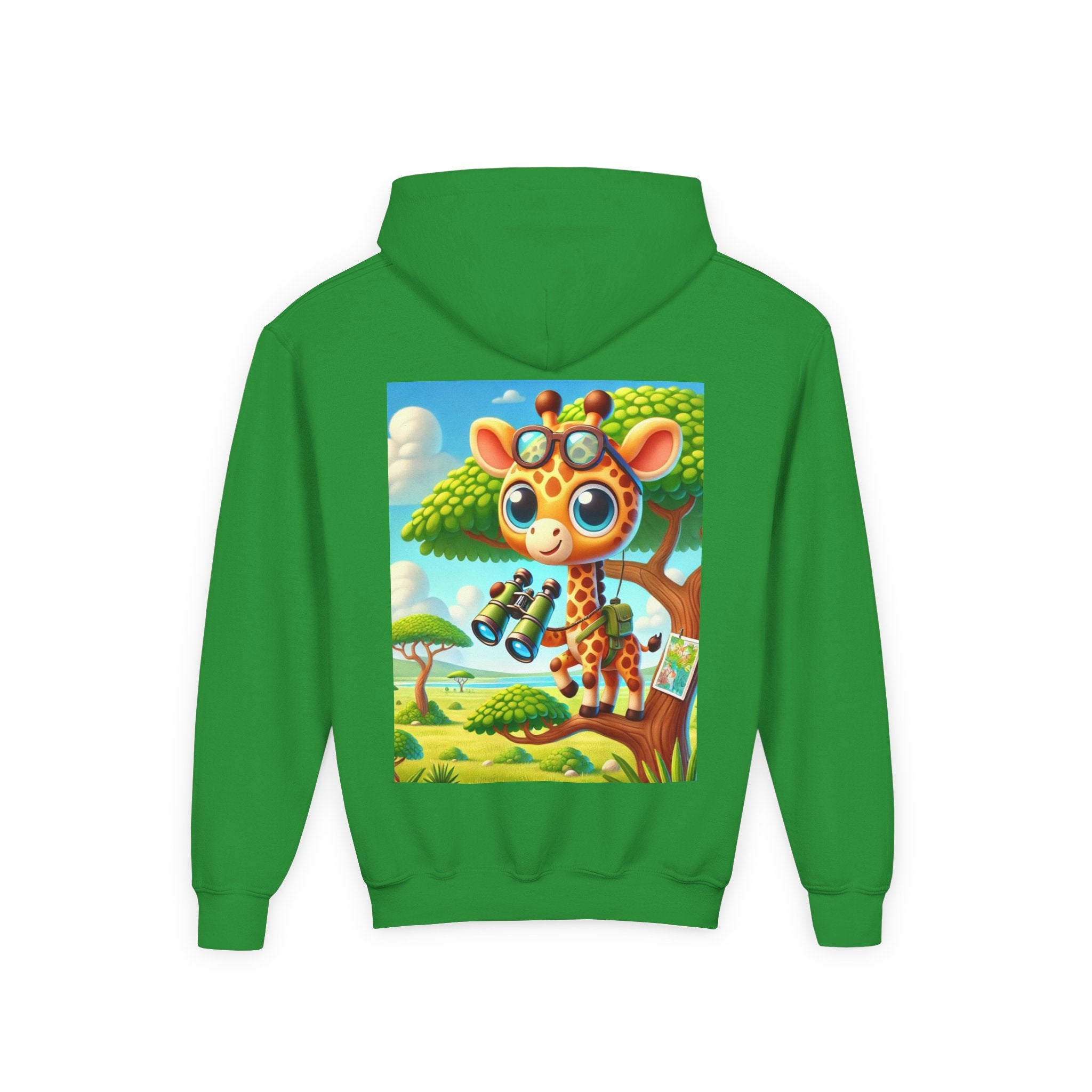 Giraffe Lookout Youth Heavy Blend Hooded Sweatshirt combines cozy comfort with imaginative adventure. Made from ultra-soft, preshrunk fleece, this hoodie feels smooth against the skin and resists lint buildup for long-lasting wear. The 50/50 cotton-polyester blend offers the perfect balance of warmth, softness, and durability. With a roomy kangaroo pocket and twill-reinforced neck, it’s designed for everyday comfort and playful exploration. Please note: due to the fabric properties, the White color variant may appear slightly off-white.