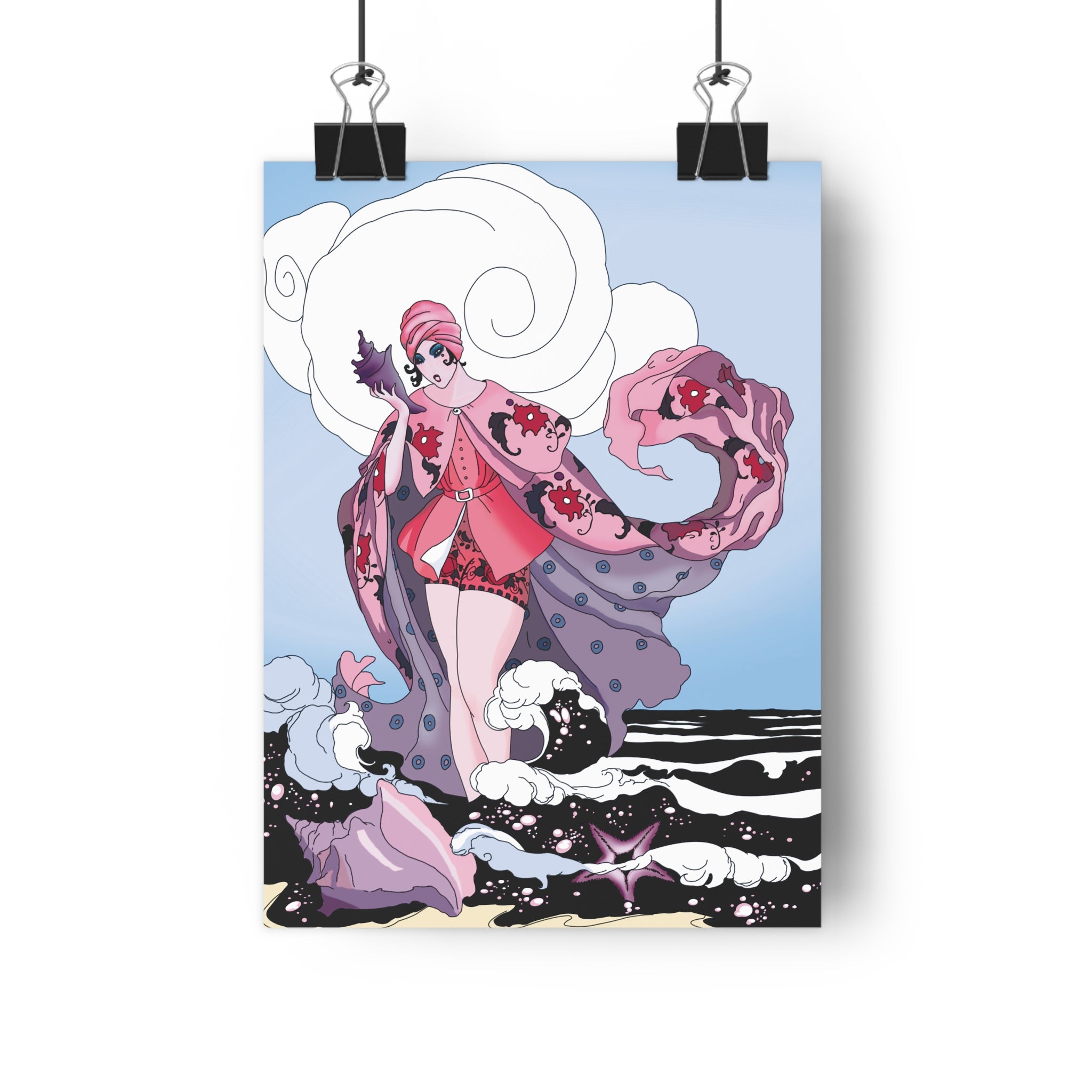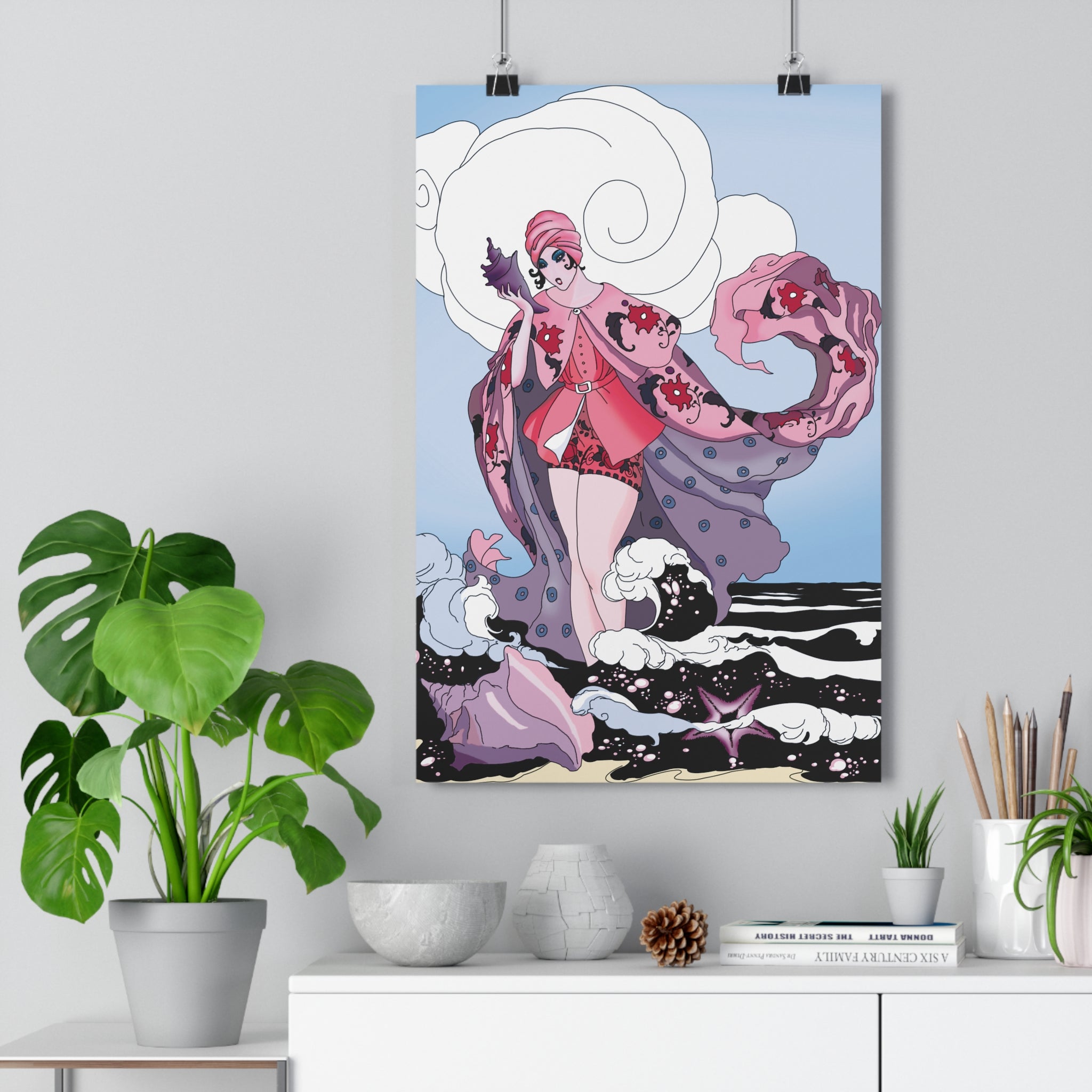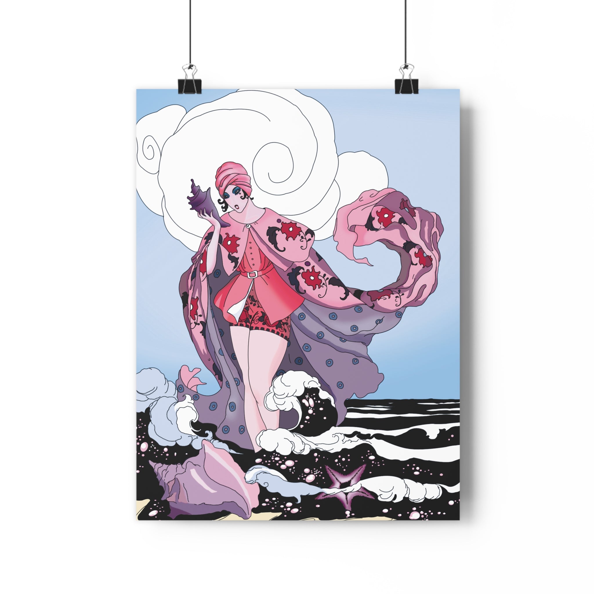 This elegant Art Print features an Art Deco woman standing in a stylized black ocean with swirling waves, wearing a... Read more