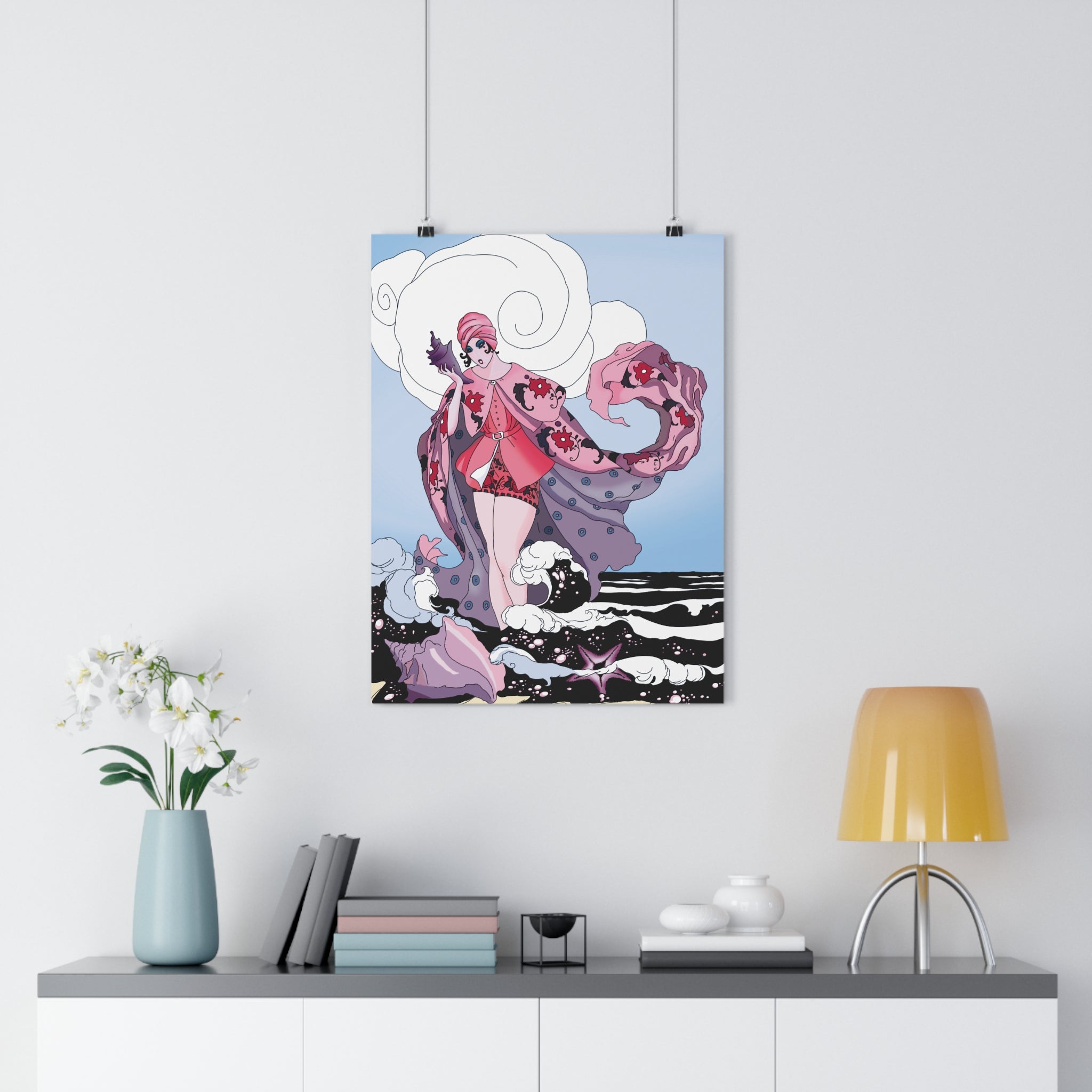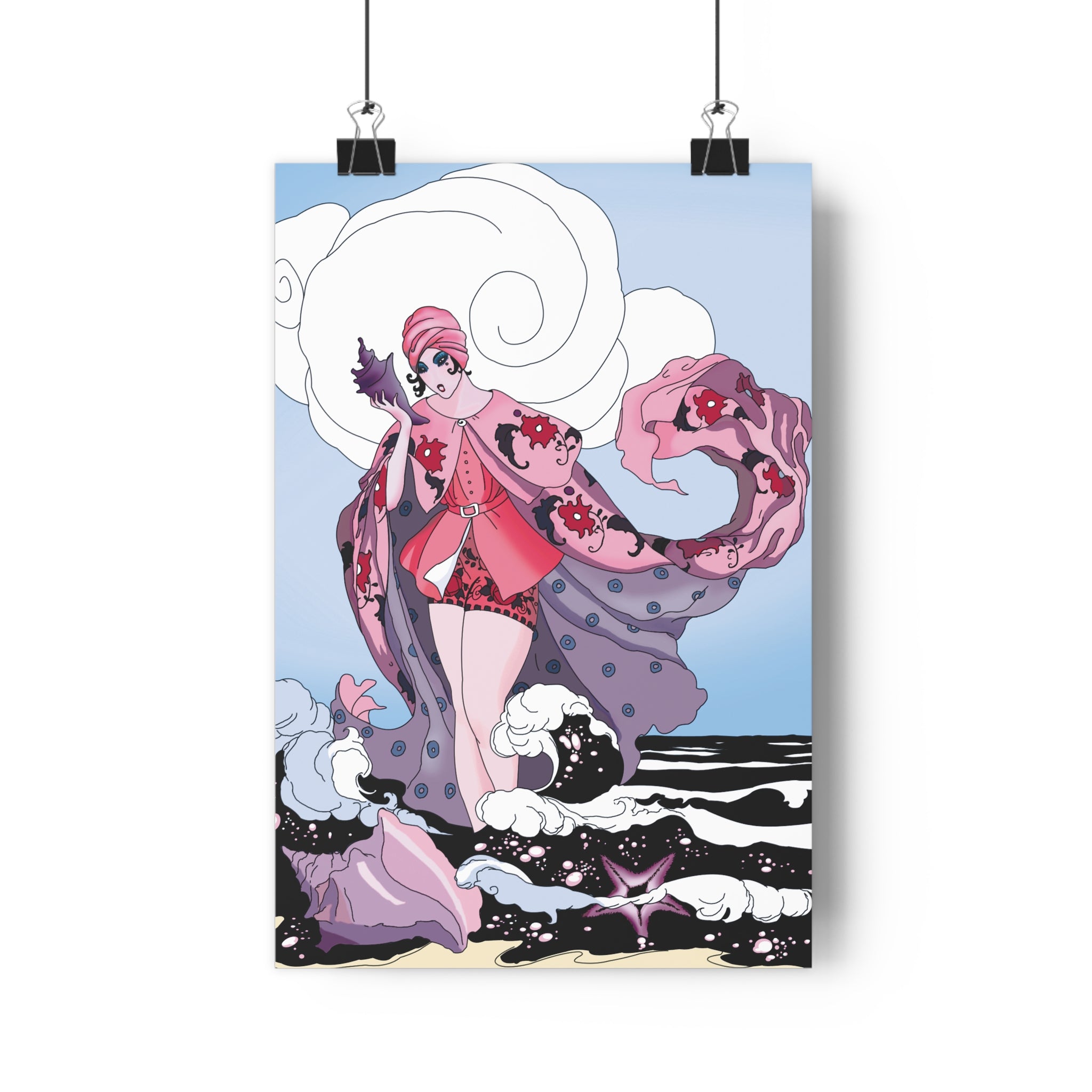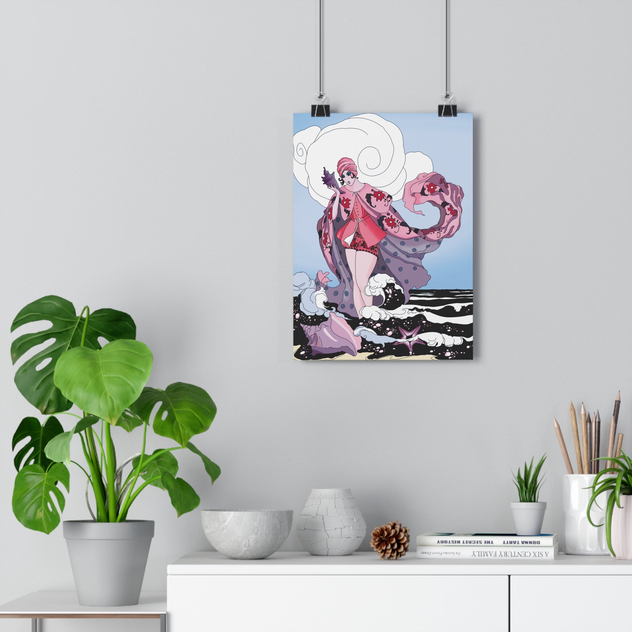 This elegant Art Print features an Art Deco woman standing in a stylized black ocean with swirling waves, wearing a... Read more