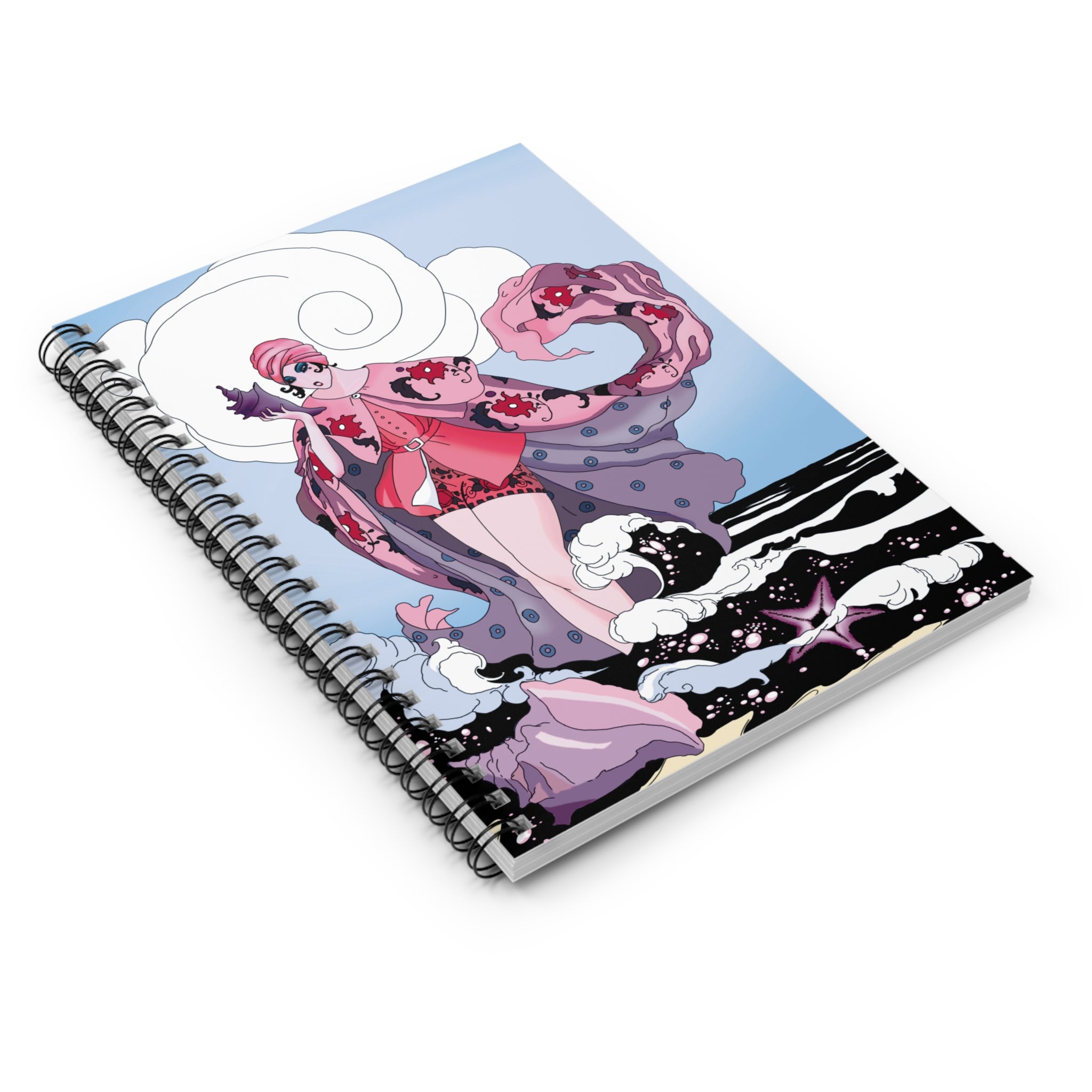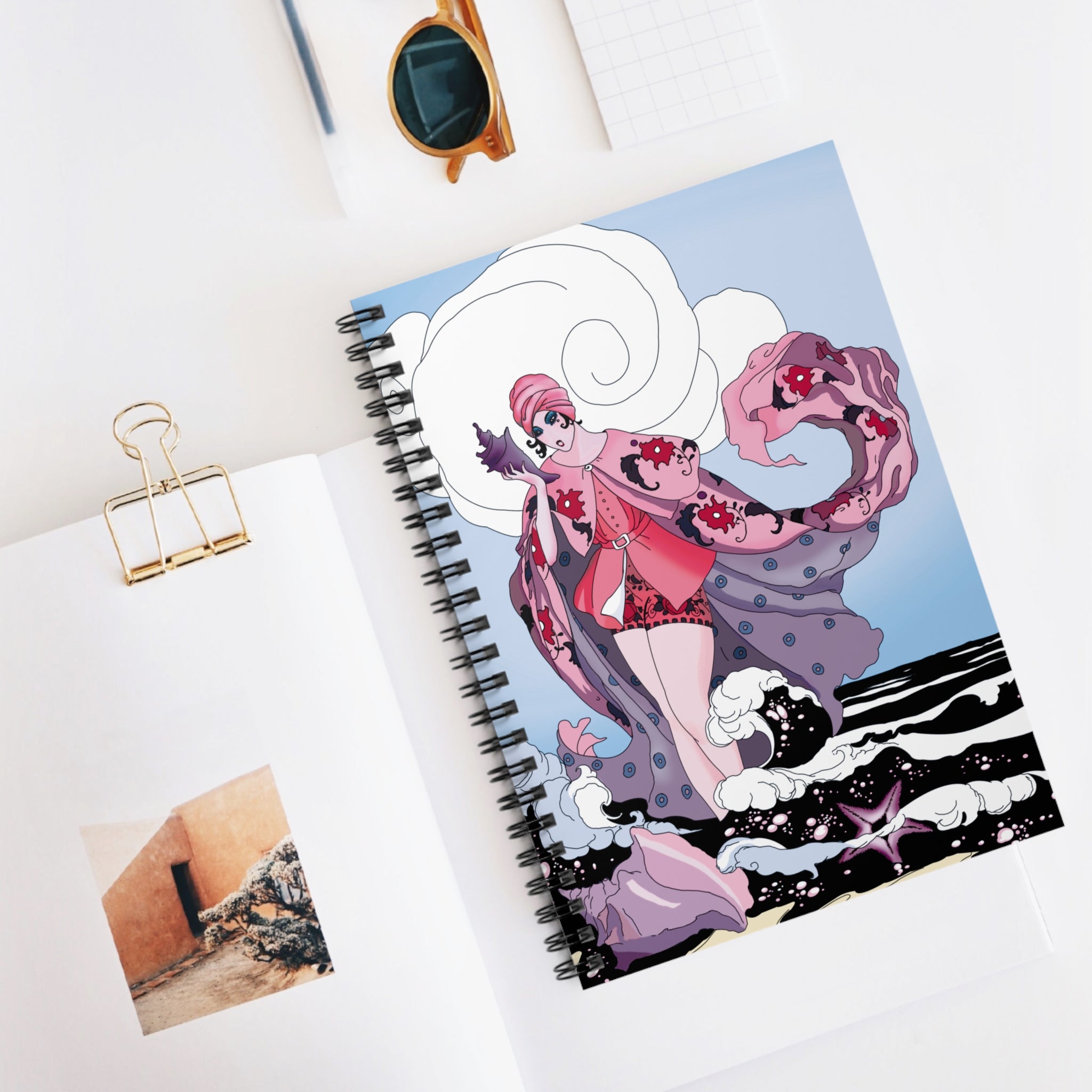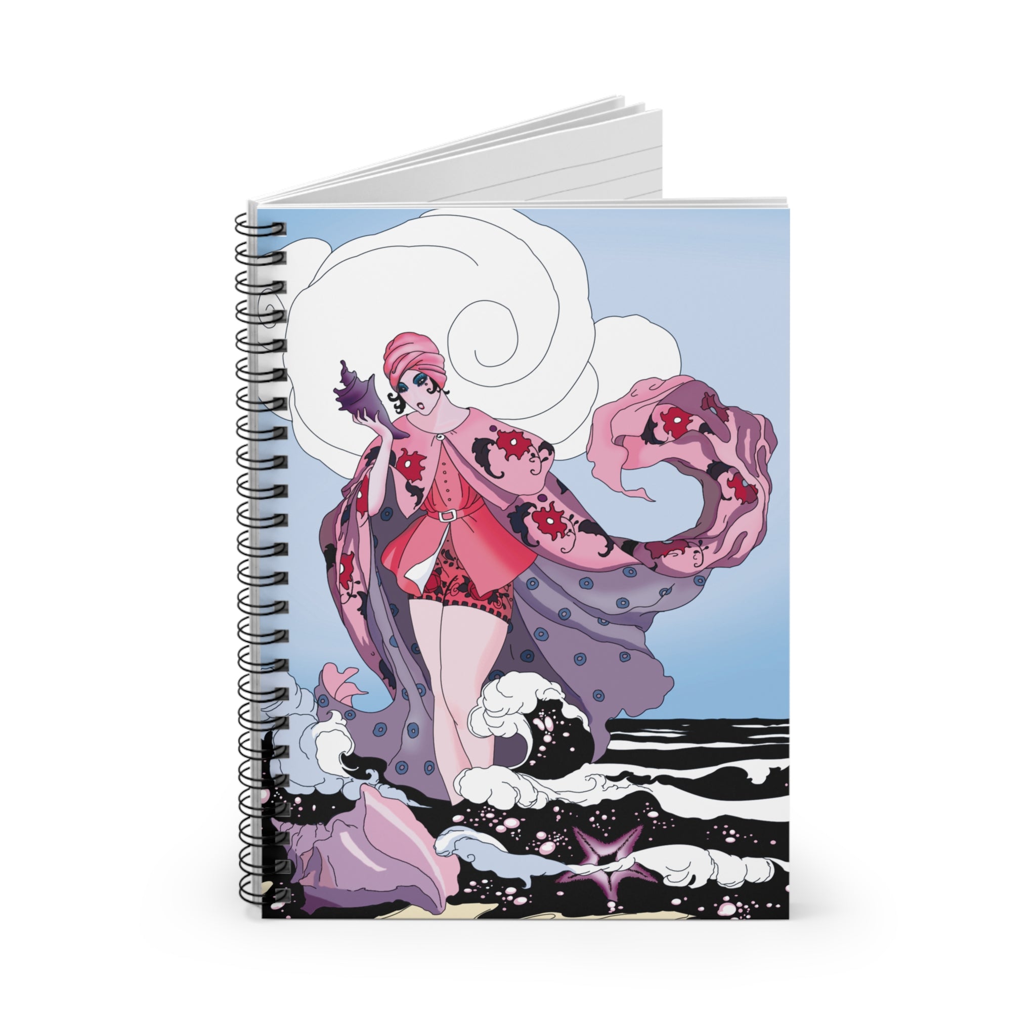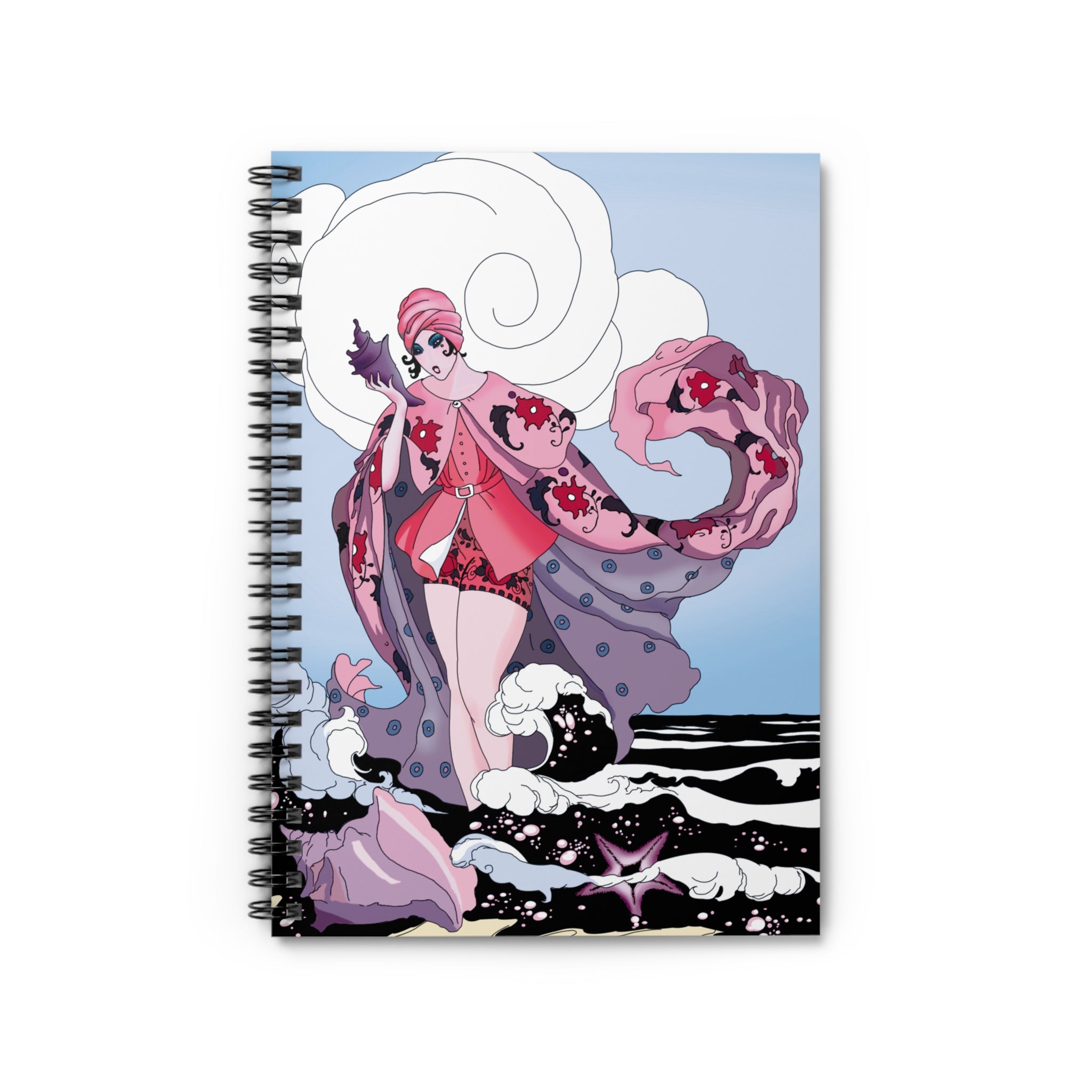 Shopping lists, school notes, or poems—this 118-page spiral notebook with ruled line paper is a stylish and practical companion for everyday thoughts. The cover features "Goddess of the Swirling Sea," an Art Deco-inspired illustration of a graceful woman standing in swirling black waves. Dressed in a red swimsuit and floral cape, she lifts a conch shell beneath a vivid sky—capturing a sense of strength, serenity, and vintage glamour.