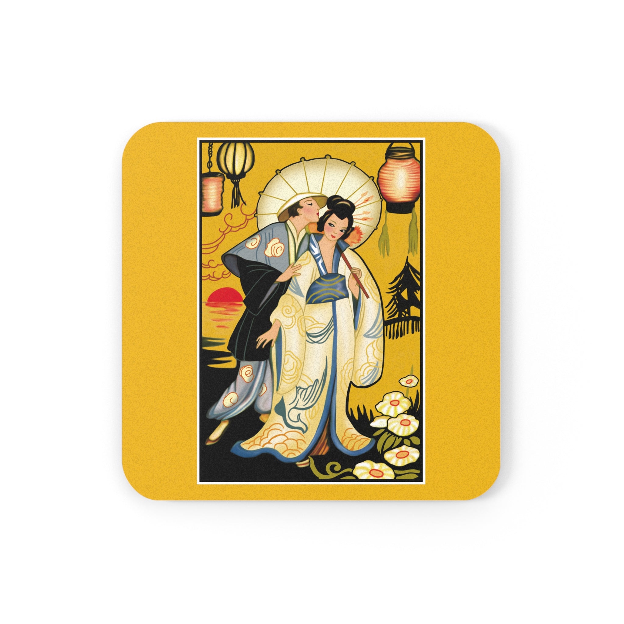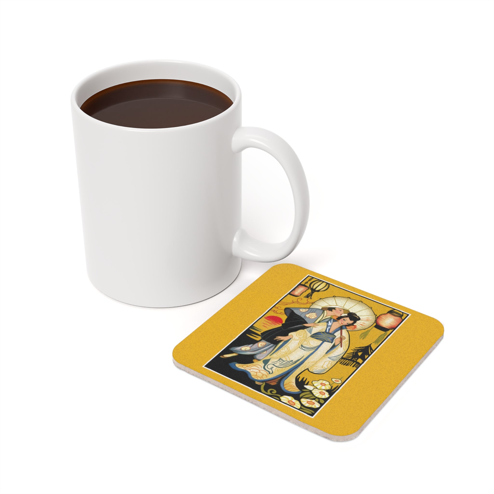Golden Embrace | Cork Back Coaster radiates warmth, elegance, and timeless Art Deco sophistication. This exquisite coaster transforms a moment of romance and serenity into a striking piece of functional art—perfect for collectors and lovers of vintage design.