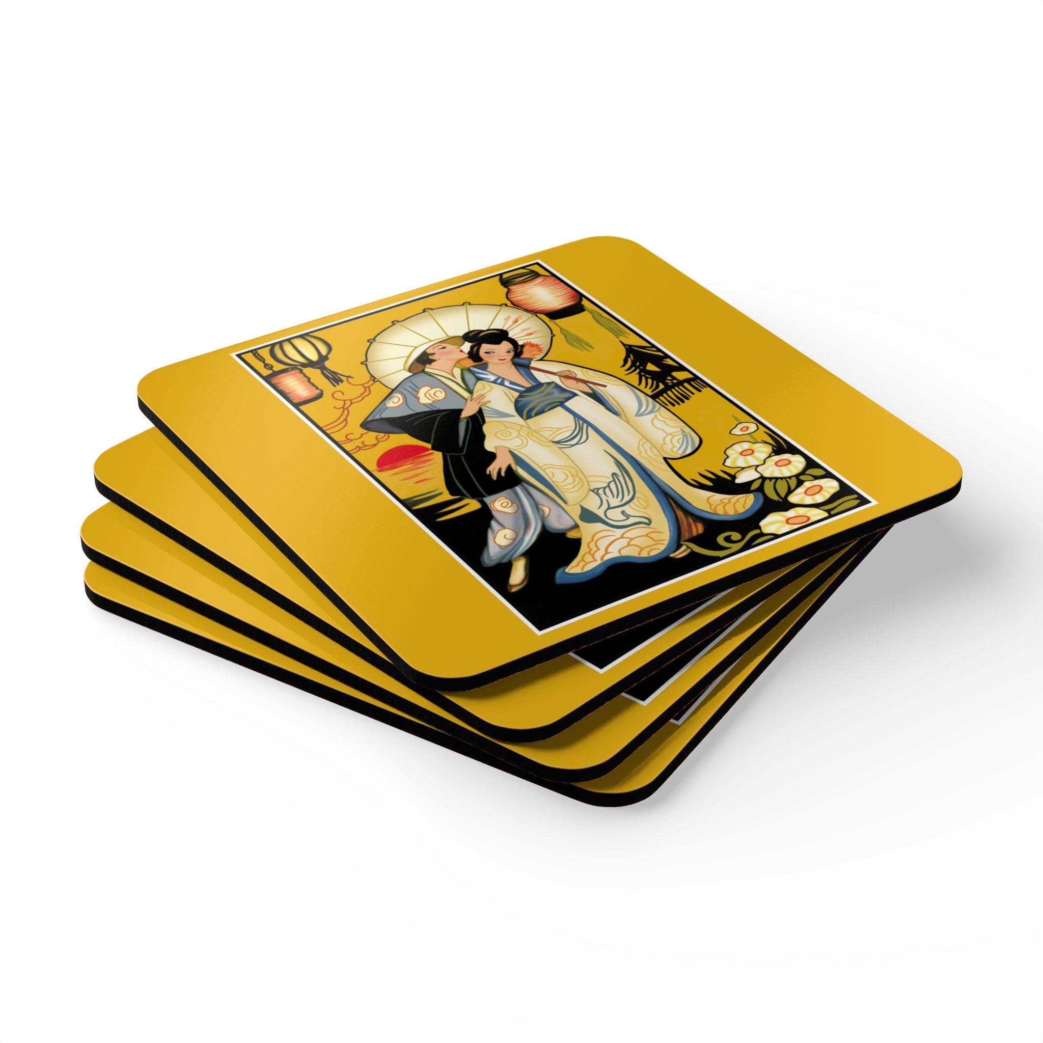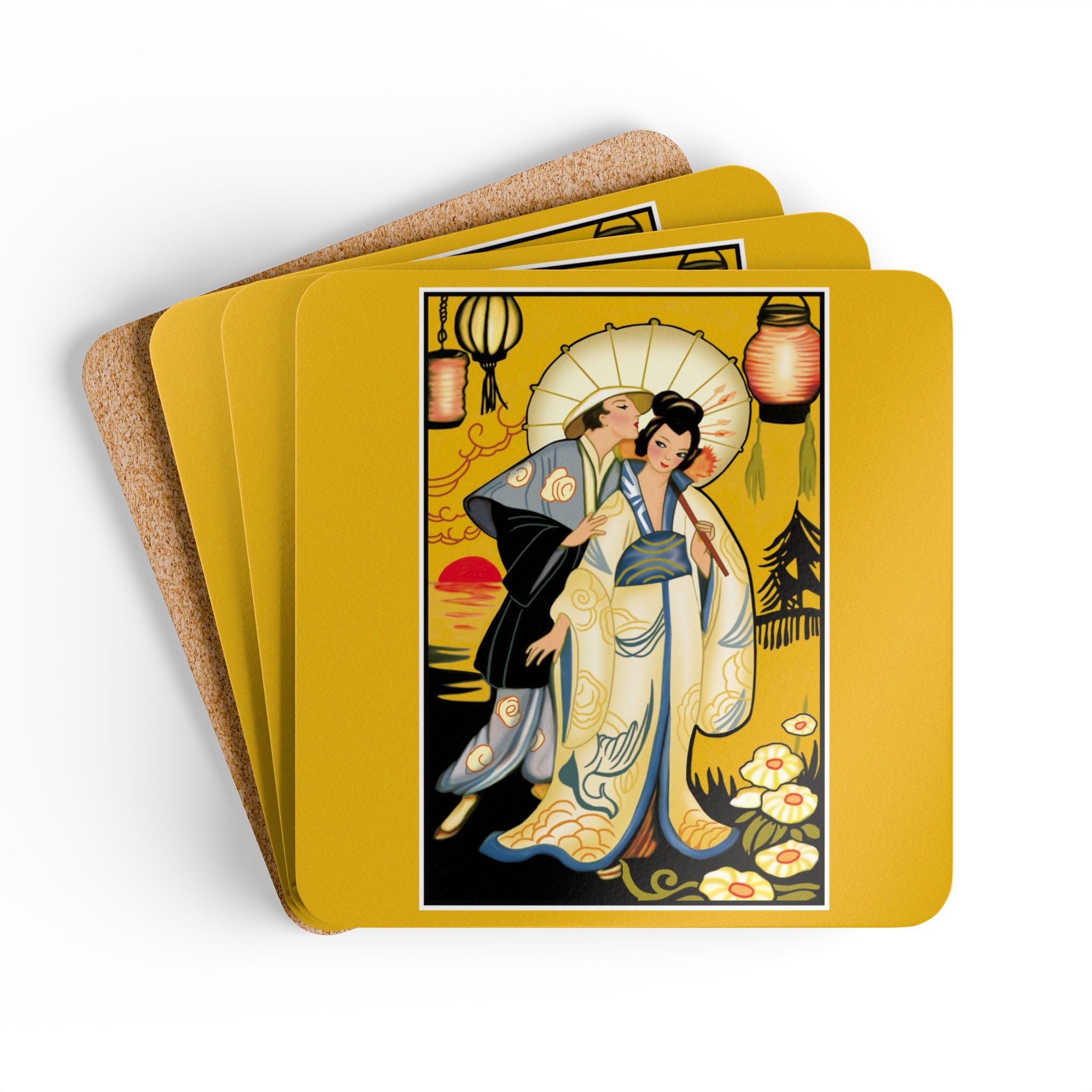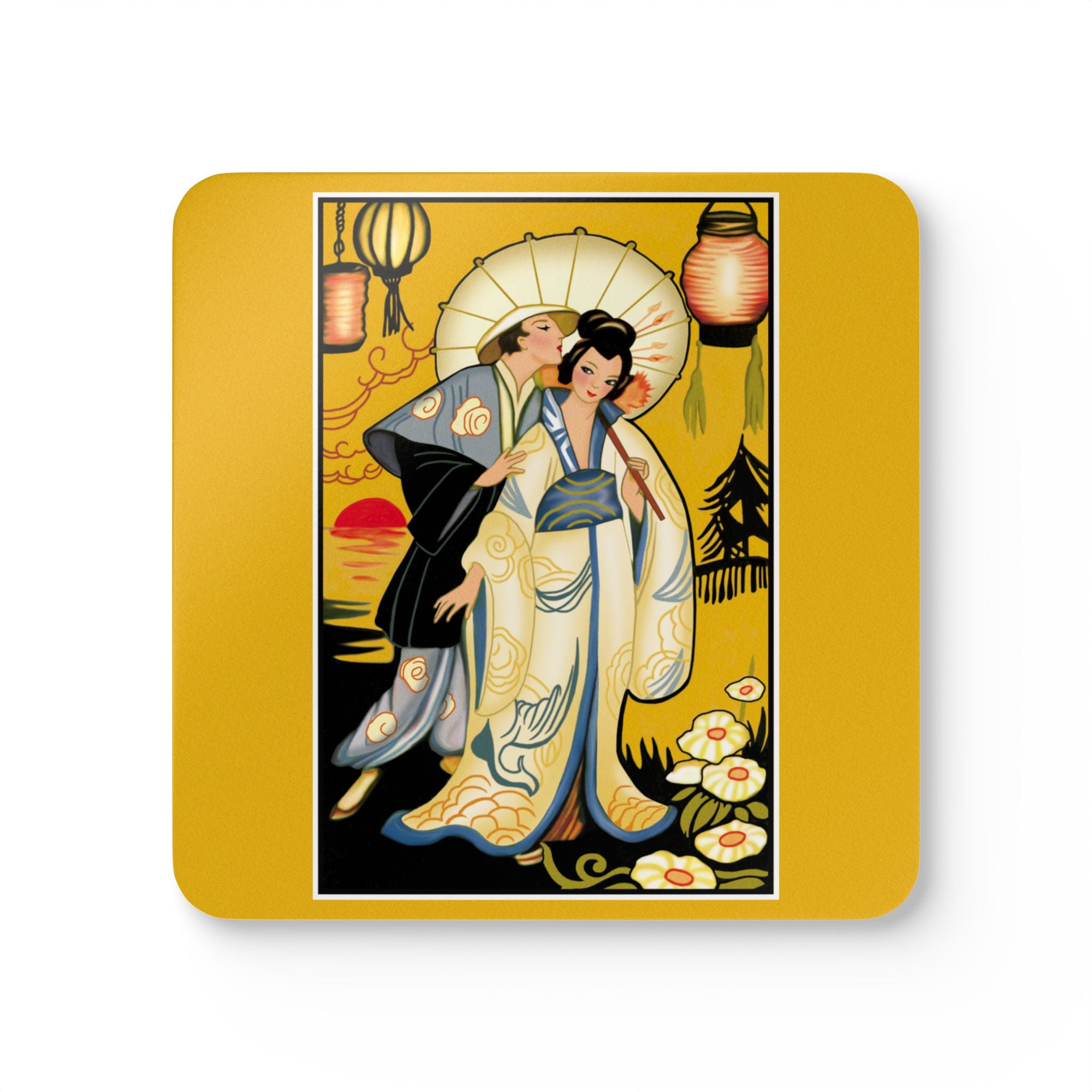 Artwork designed and digitally remastered by Sarasvati Designs. The vintage “Golden Embrace” image exudes elegance and intimacy, depicting an Asian couple in a tender moment against a luminous golden backdrop. The soft composition and shimmering tones highlight the romance and serenity of the scene, echoing the refined grace of early twentieth-century Art Deco design. This coaster set adds a timeless touch of cultural beauty and tranquil sophistication to any decor.