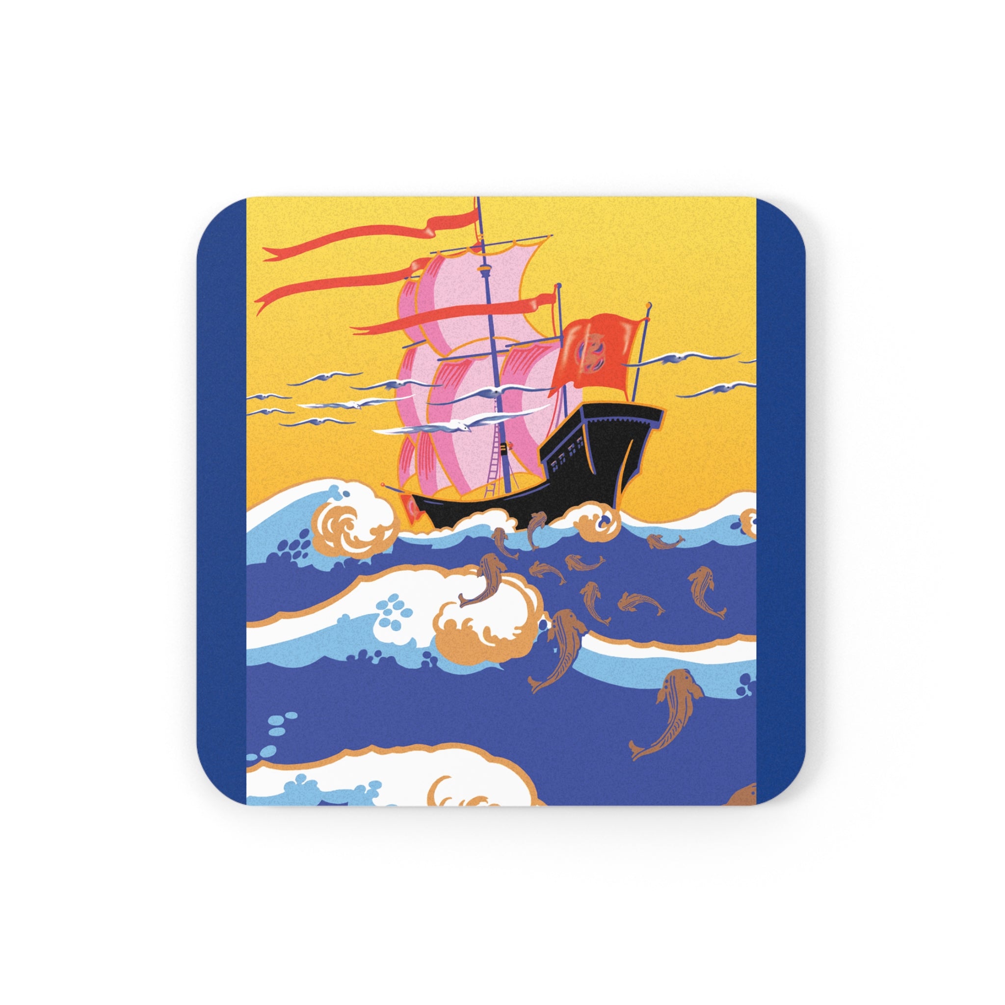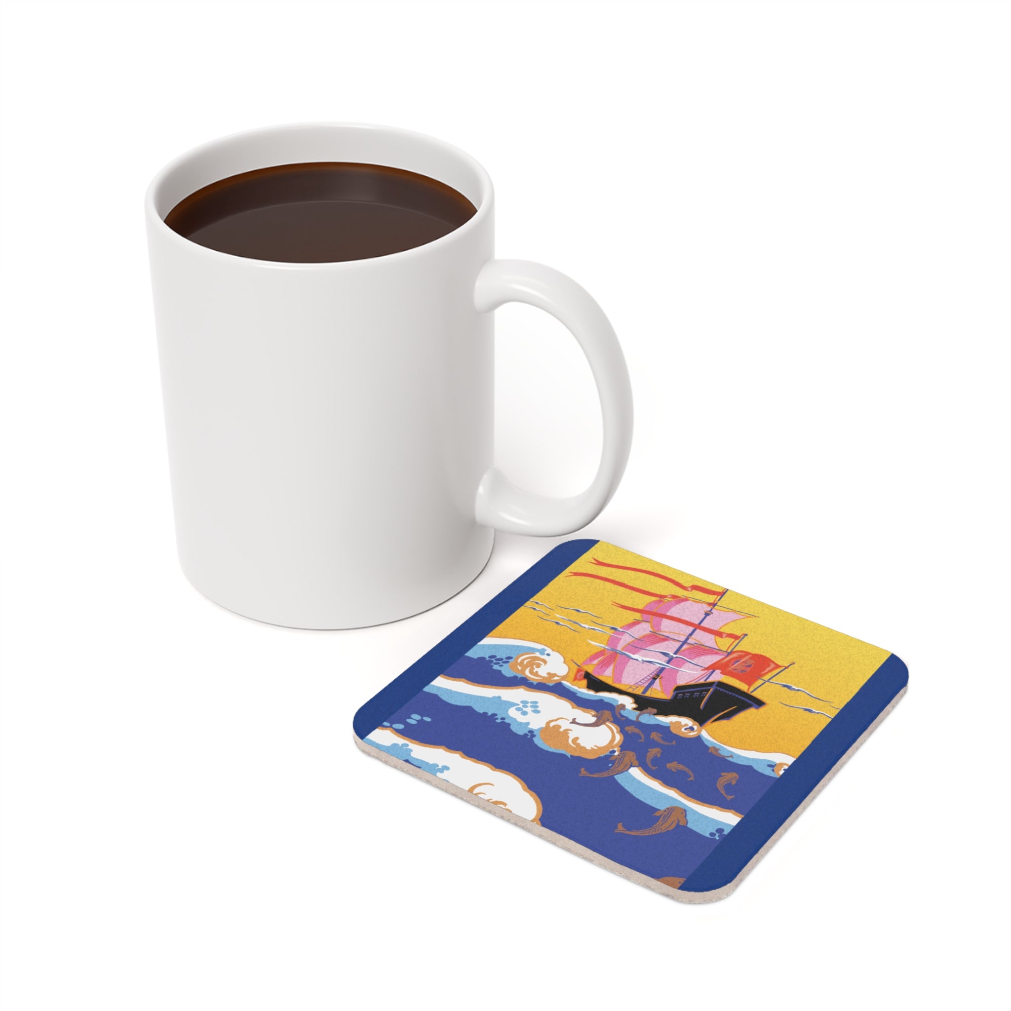 Golden Seas and Whimsical Dreams | Cork Back Coaster captures the splendor and imagination of the Art Deco era in a radiant maritime fantasy. With its harmonious balance of color, movement, and design, this coaster transforms any table into a scene of elegance and adventure.
