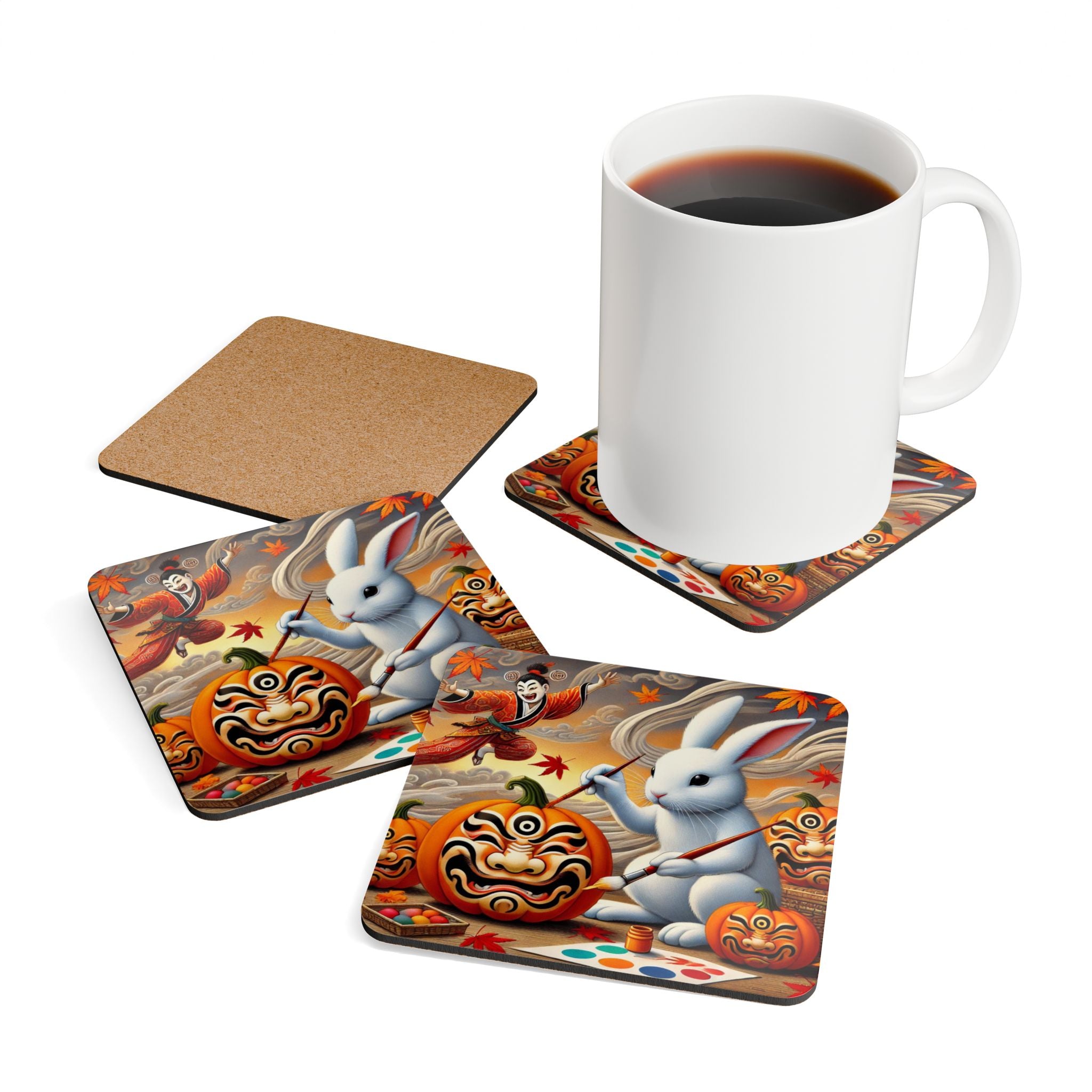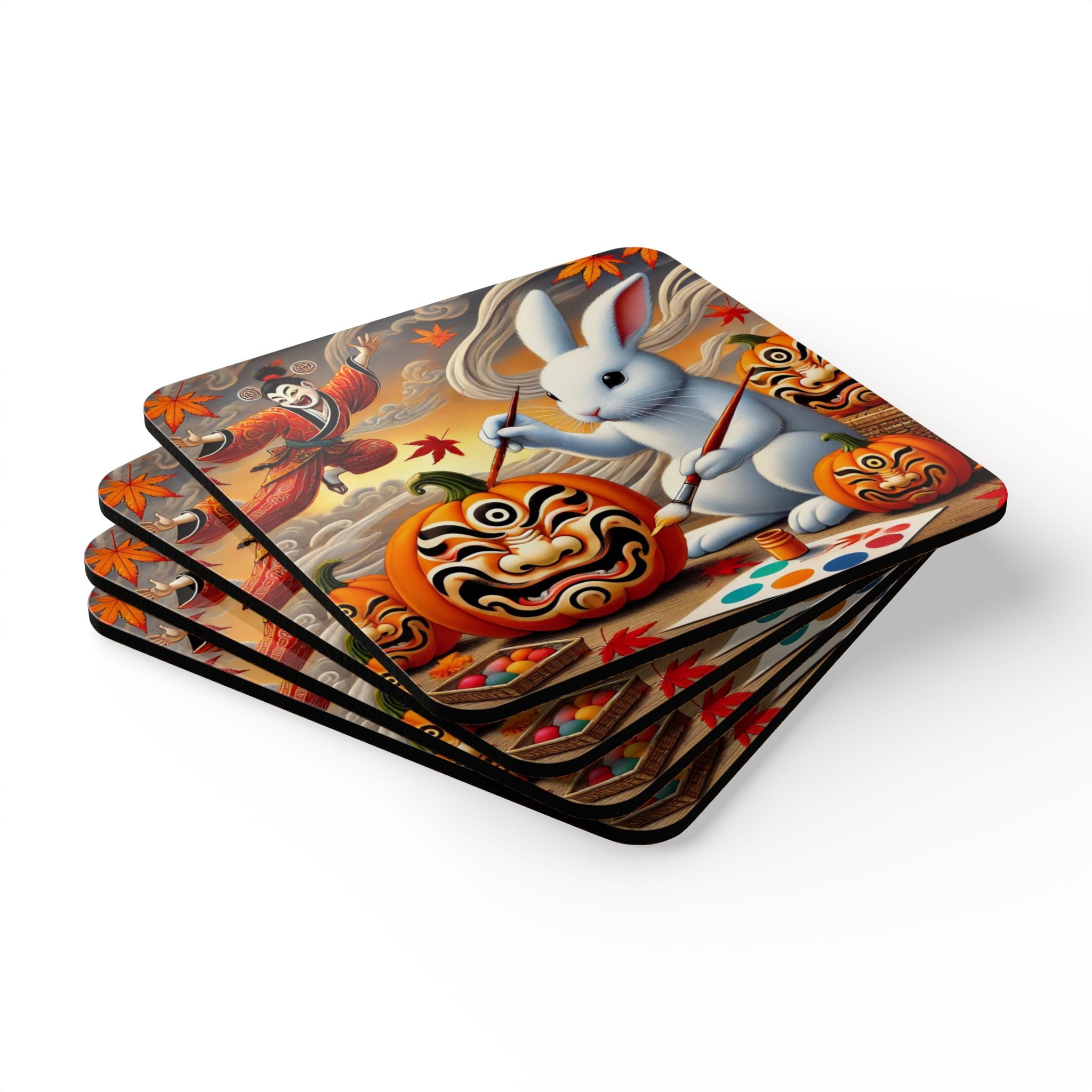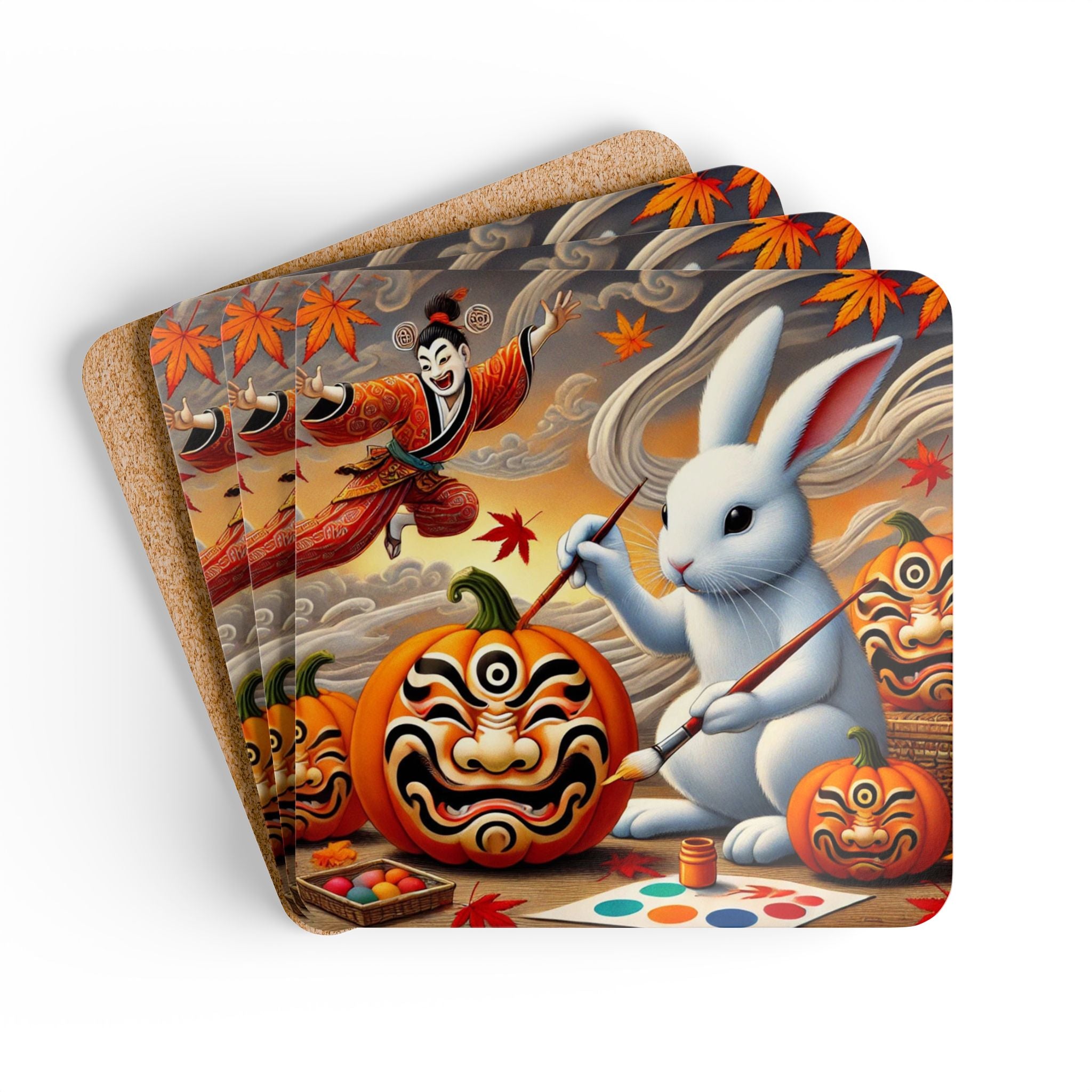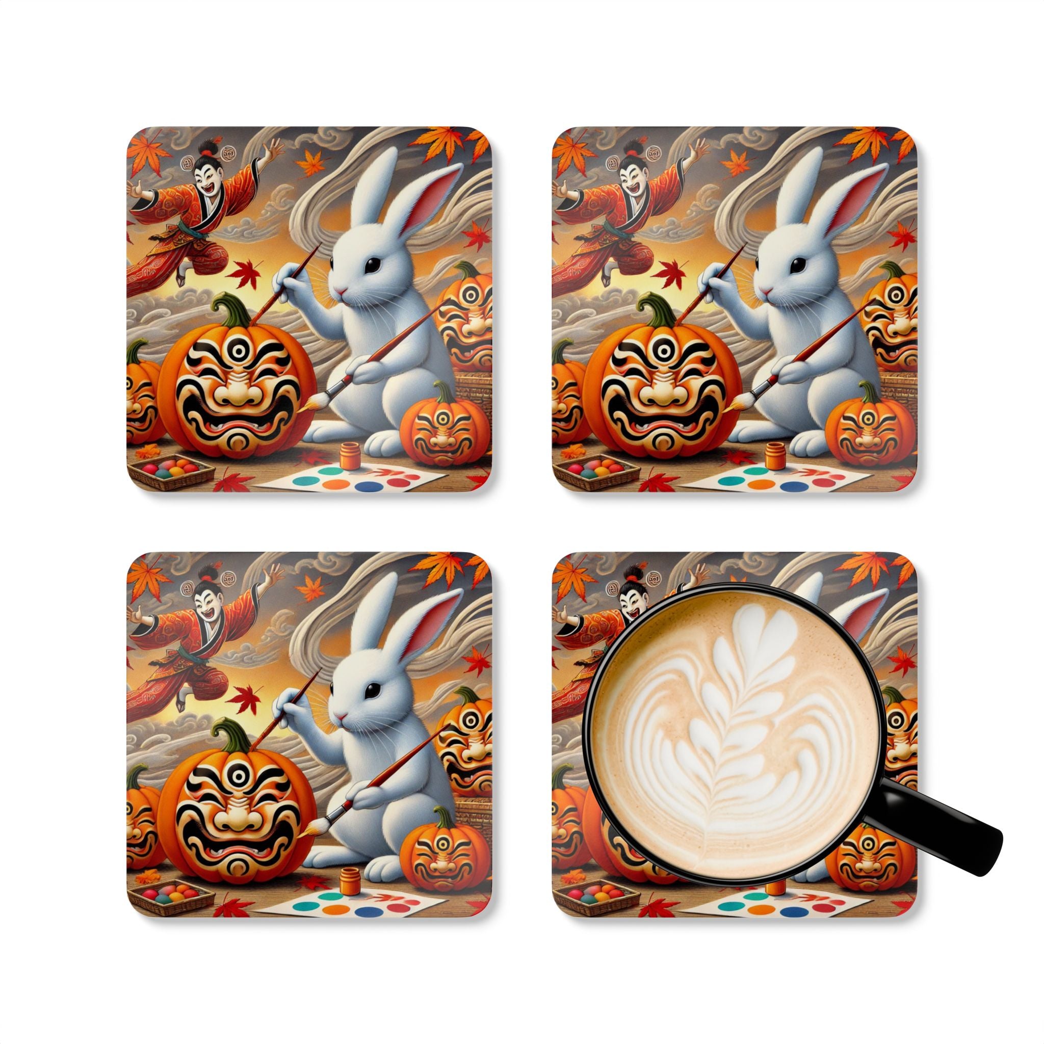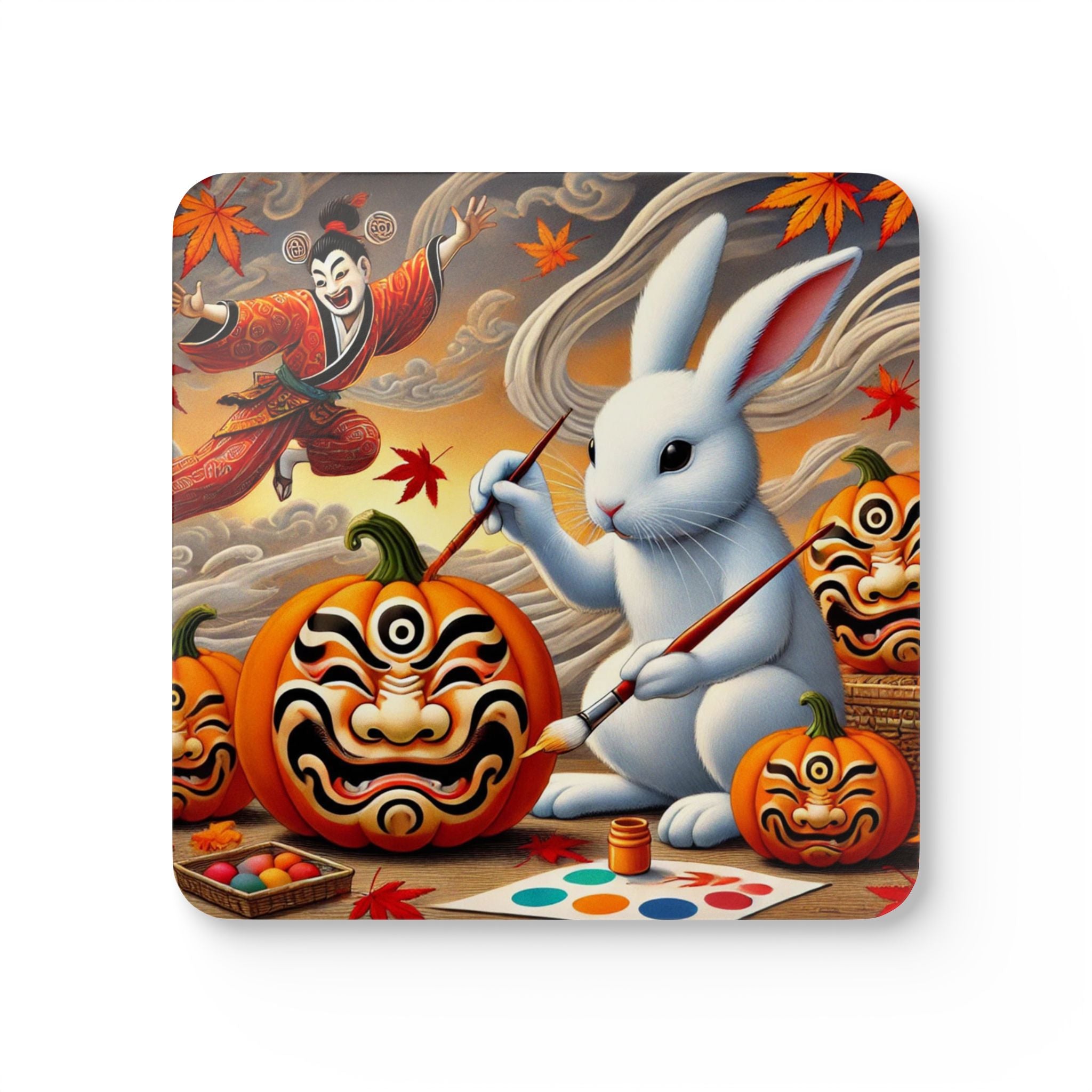Across each glossy surface, a whimsical rabbit sits among pumpkins, carefully painting jack-o’-lanterns with bold Kabuki mask faces. Every pumpkin becomes a tiny work of theatrical art, blending the drama of Japanese tradition with the playful spirit of Halloween. Radiating creativity and fantasy, the design turns an ordinary autumn night into a celebration of color, culture, and imagination, making these coasters as enchanting as they are functional.