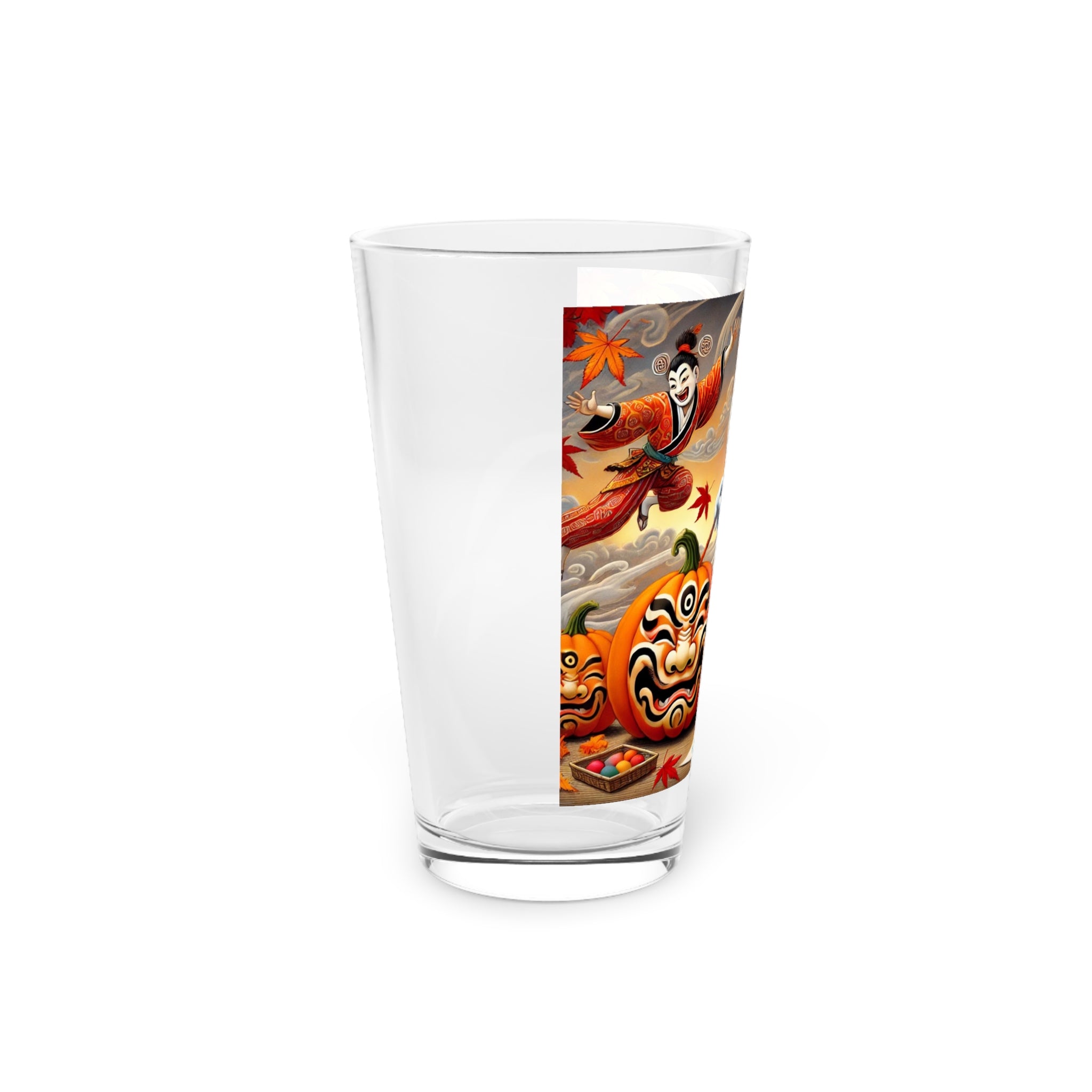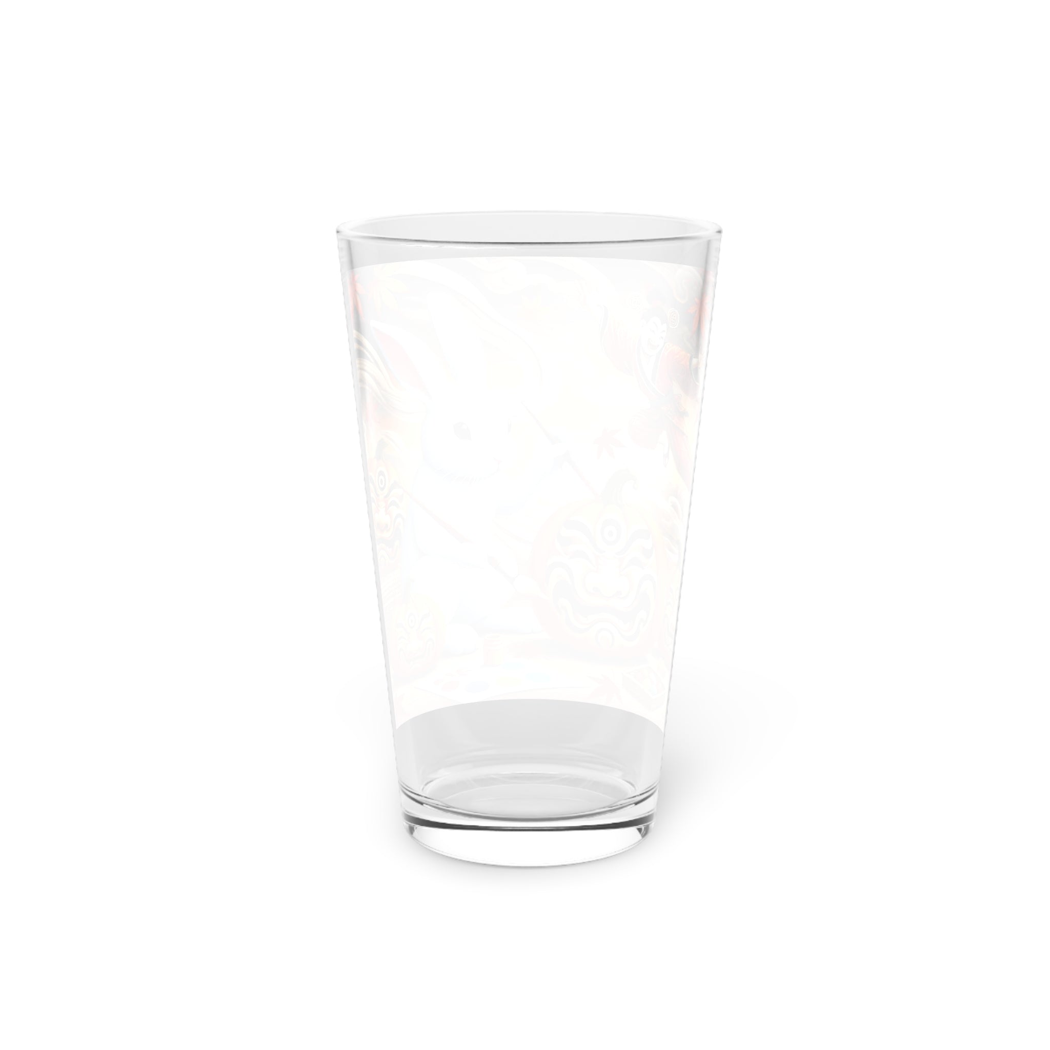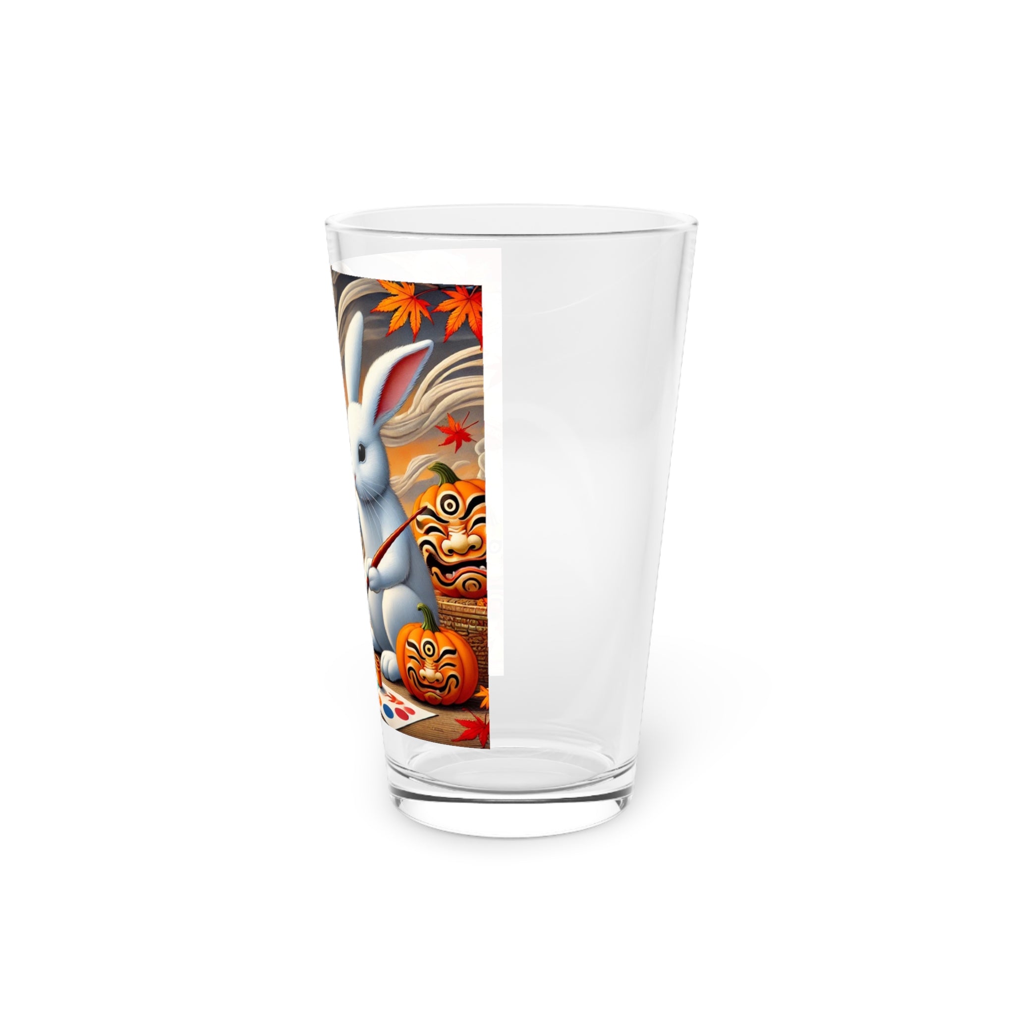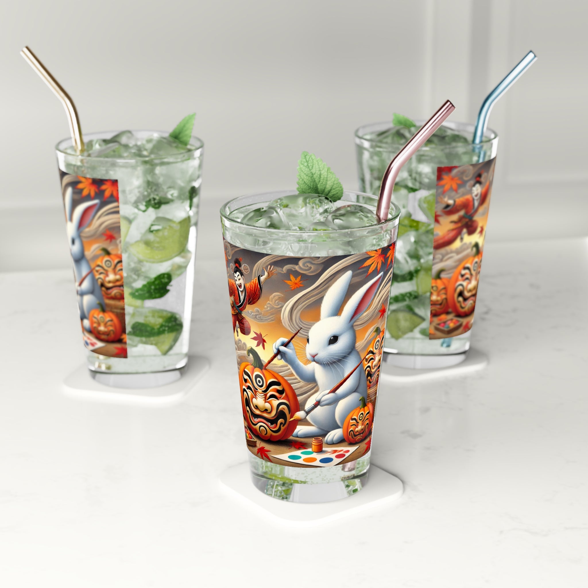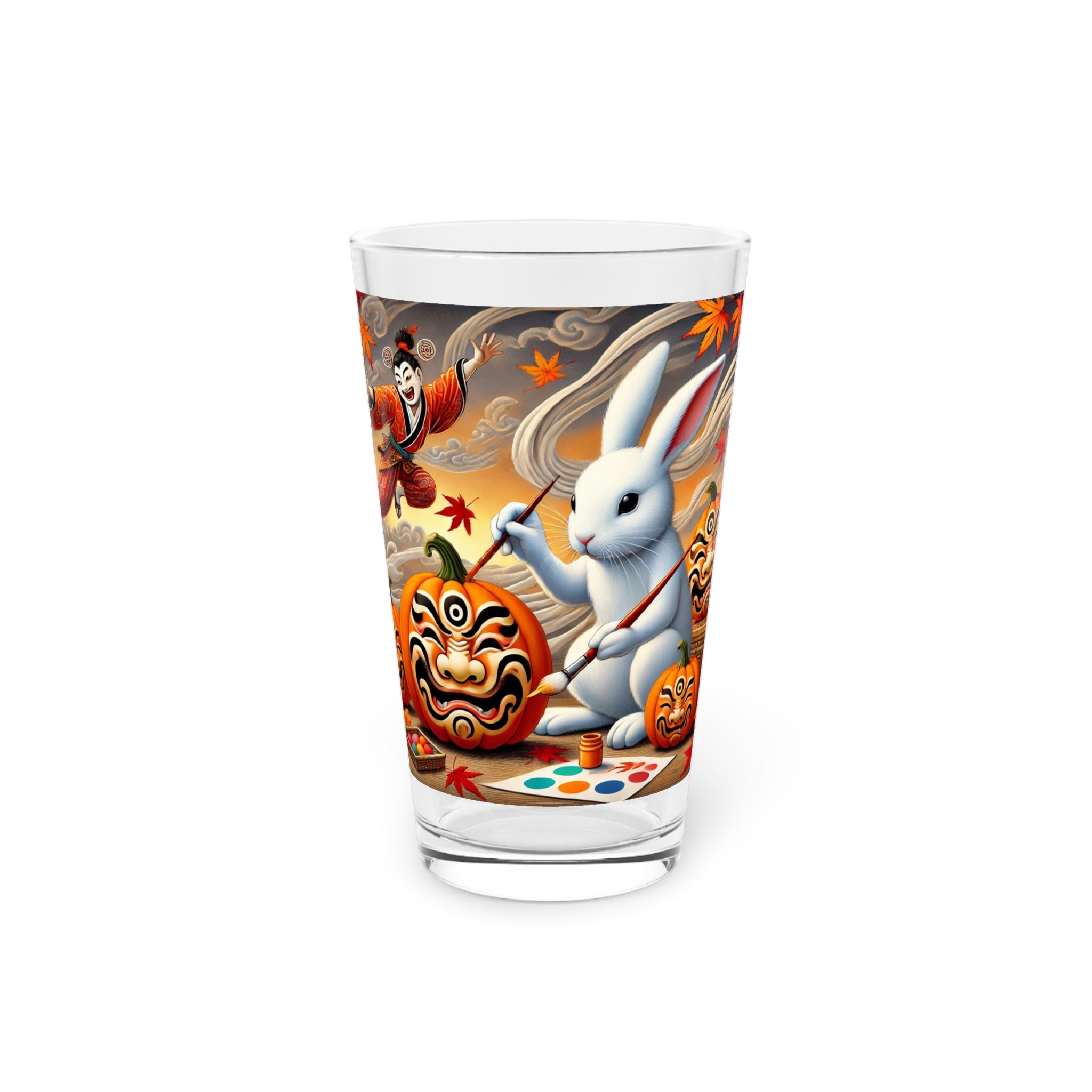 Bring art and function together with this 16oz printed pint glass, perfect for daily use or as a festive housewarming gift. Its tall, transparent design is versatile for any beverage, while the high-quality print transforms it into a collectible piece. The artwork features a whimsical rabbit seated among pumpkins, painting jack-o’-lanterns with bold Kabuki mask faces. Each glowing pumpkin becomes a miniature stage of theatrical flair, blending Japanese tradition with the playful spirit of Halloween. This glass adds both charm and creativity to your seasonal drinkware collection.