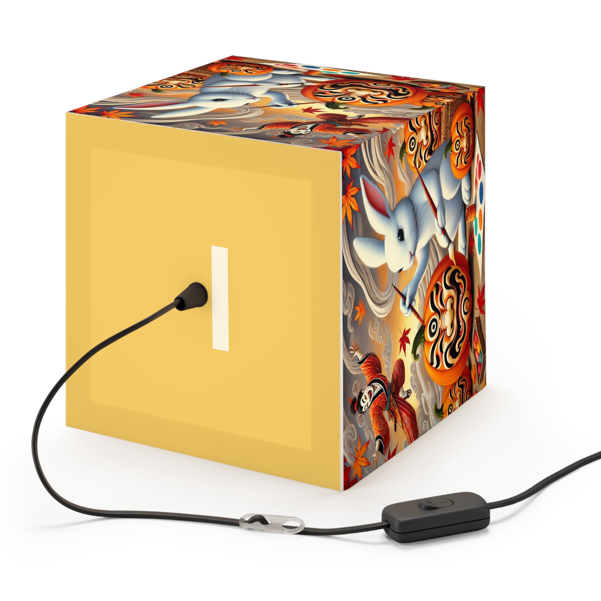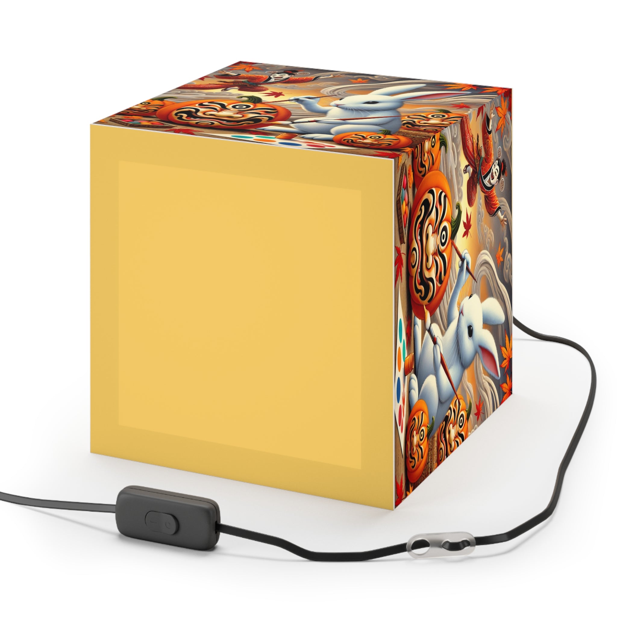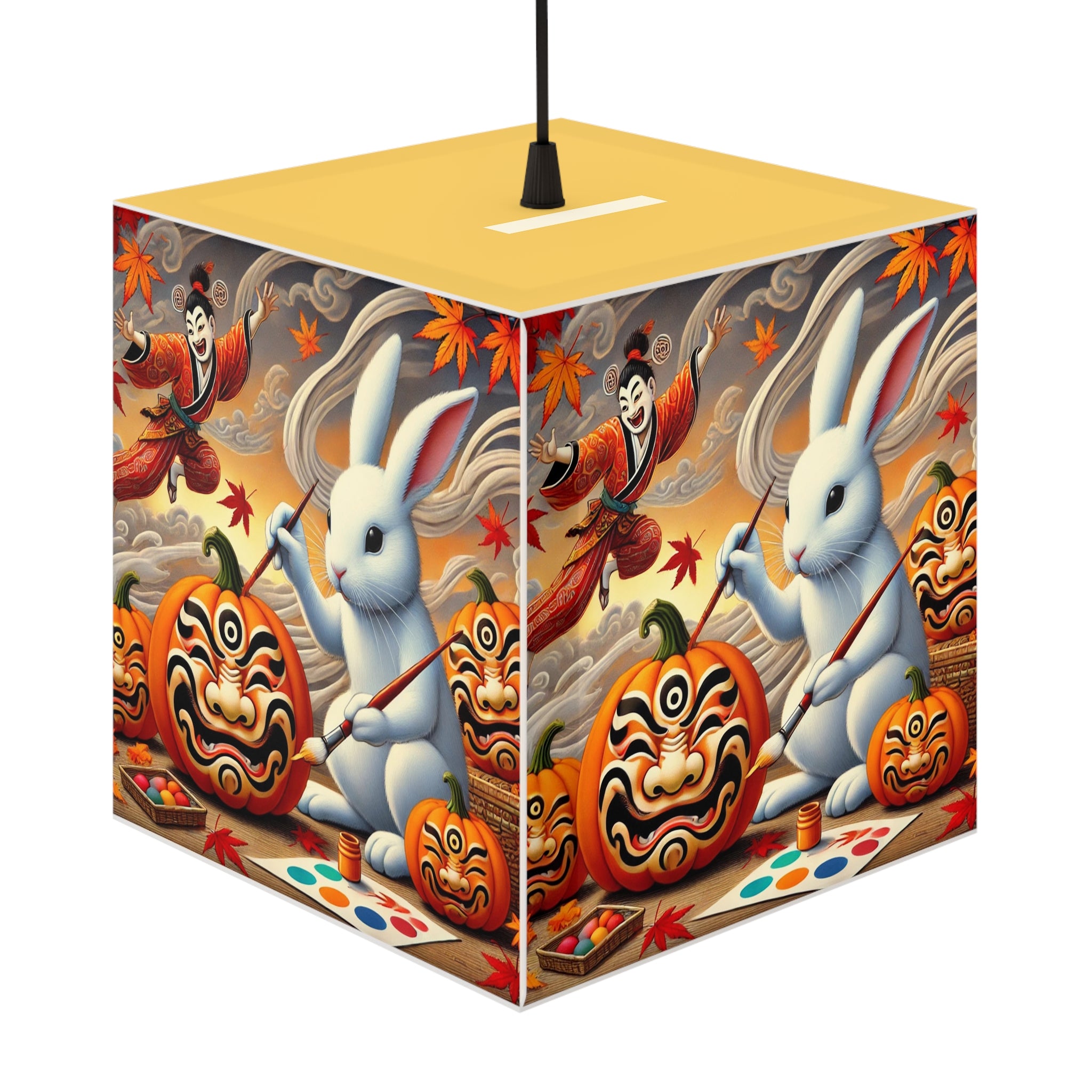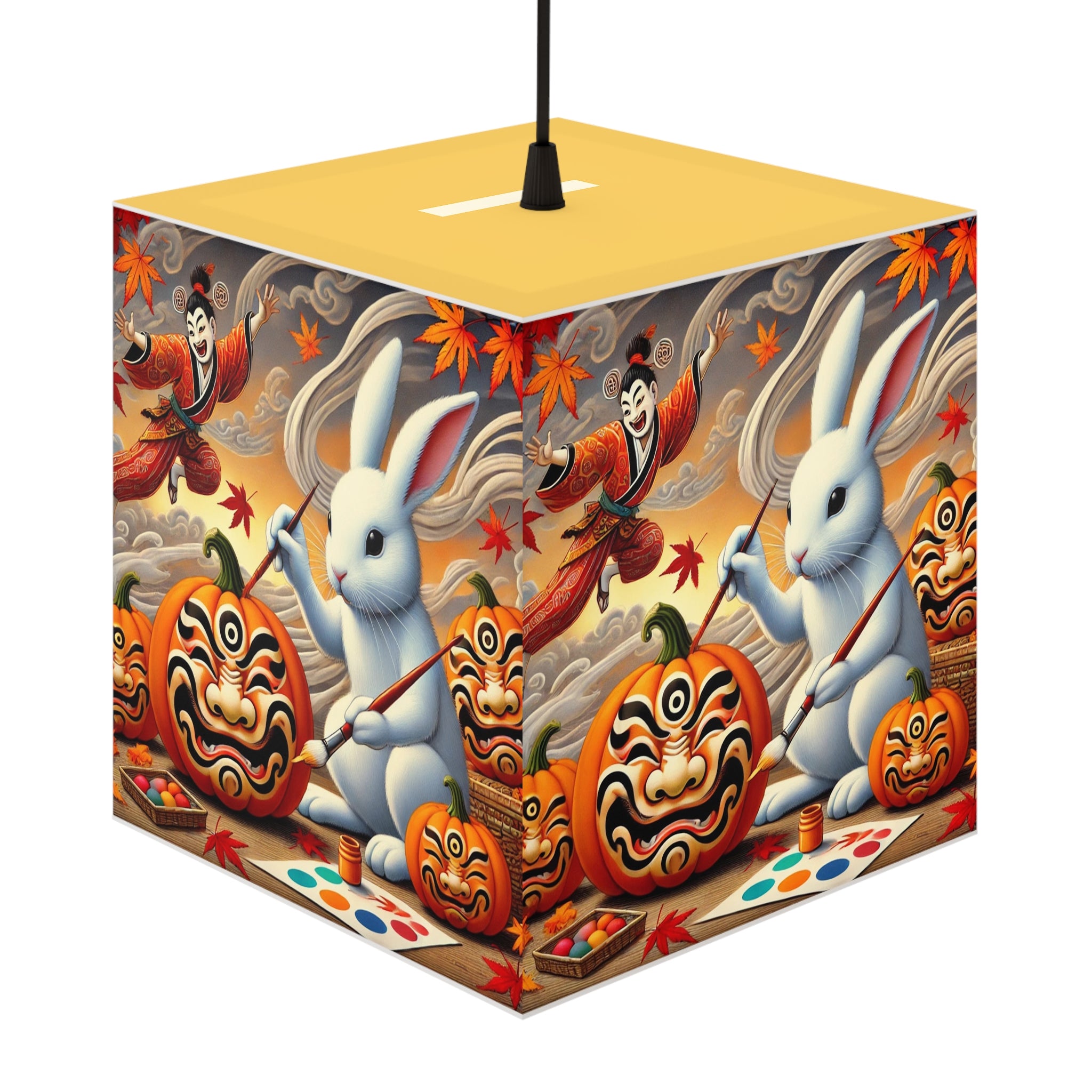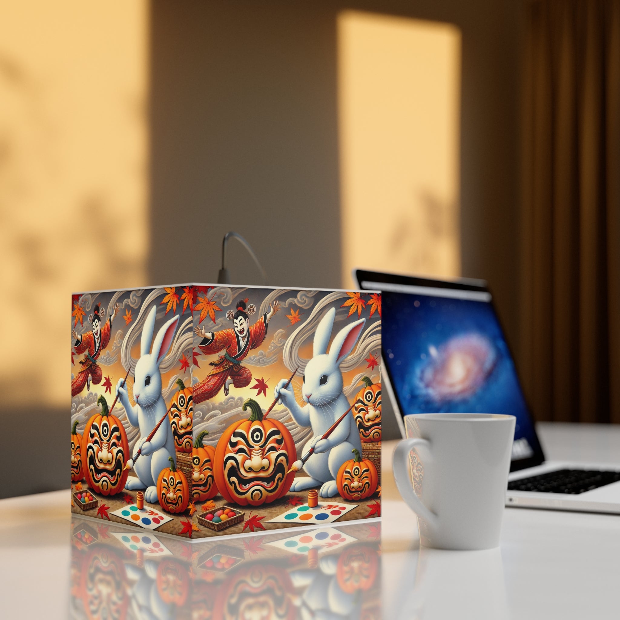 Illuminated across its surface, a whimsical rabbit sits among glowing pumpkins, painting each one into a theatrical masterpiece. Jack-o’-lanterns come alive with bold Kabuki mask faces, their expressions blending Japanese tradition with the playful magic of Halloween. As the lamp casts its light, the scene radiates creativity, fantasy, and seasonal enchantment, turning an ordinary autumn night into a stage of imagination and wonder.