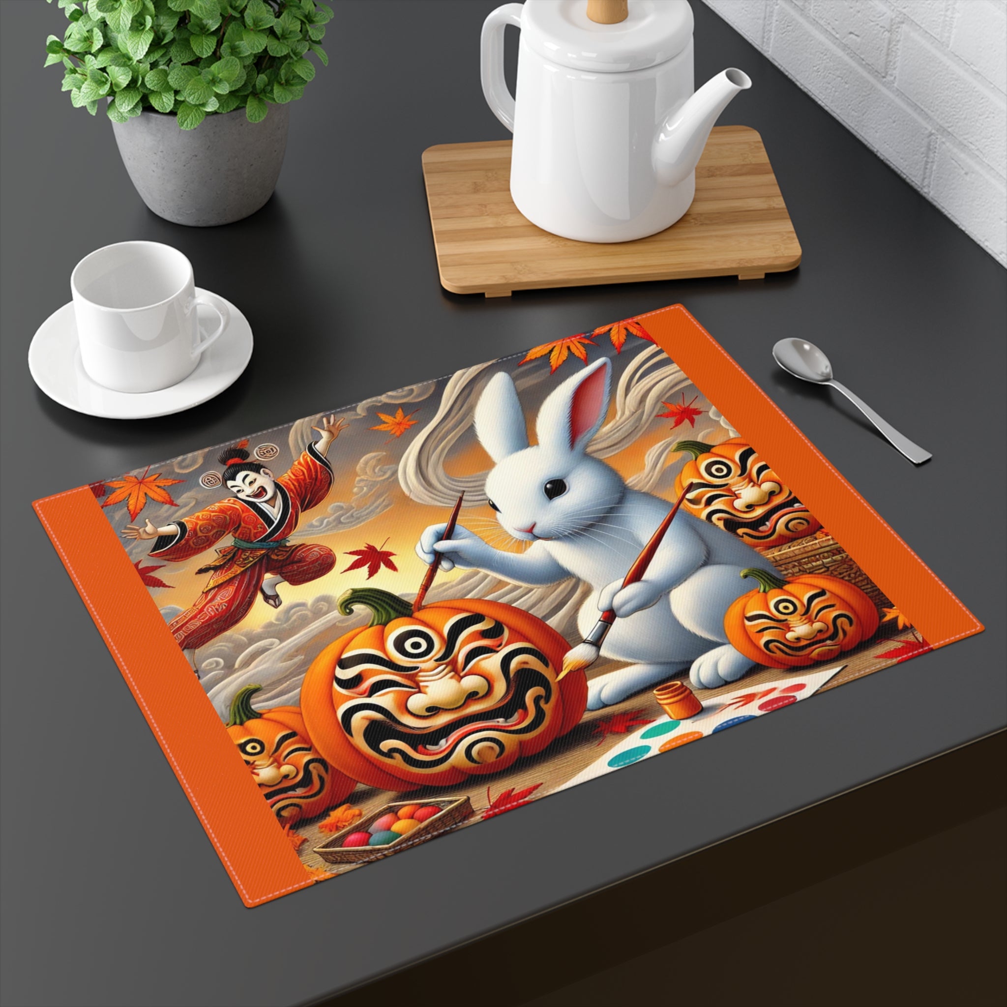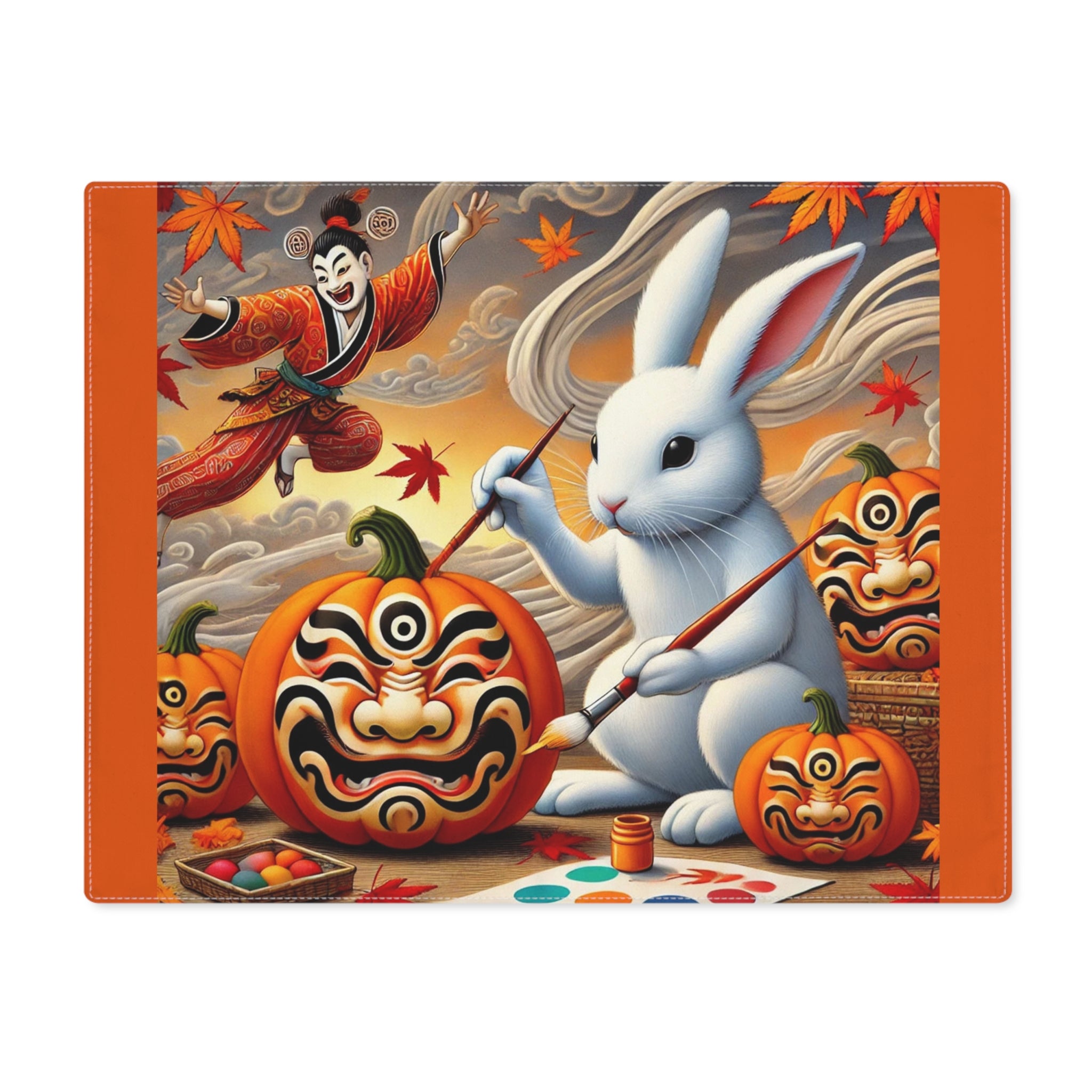 Across its surface, a whimsical rabbit sits surrounded by glowing pumpkins, each transformed into a theatrical jack-o’-lantern painted with bold Kabuki mask faces. Every pumpkin becomes a miniature work of art, merging the drama of Japanese tradition with the playful spirit of Halloween. This imaginative design radiates creativity and fantasy, turning an ordinary autumn evening into a magical celebration of light, color, and storytelling woven into your table décor.