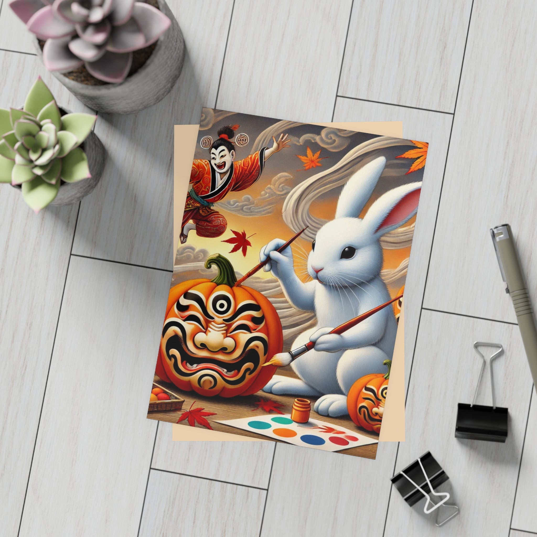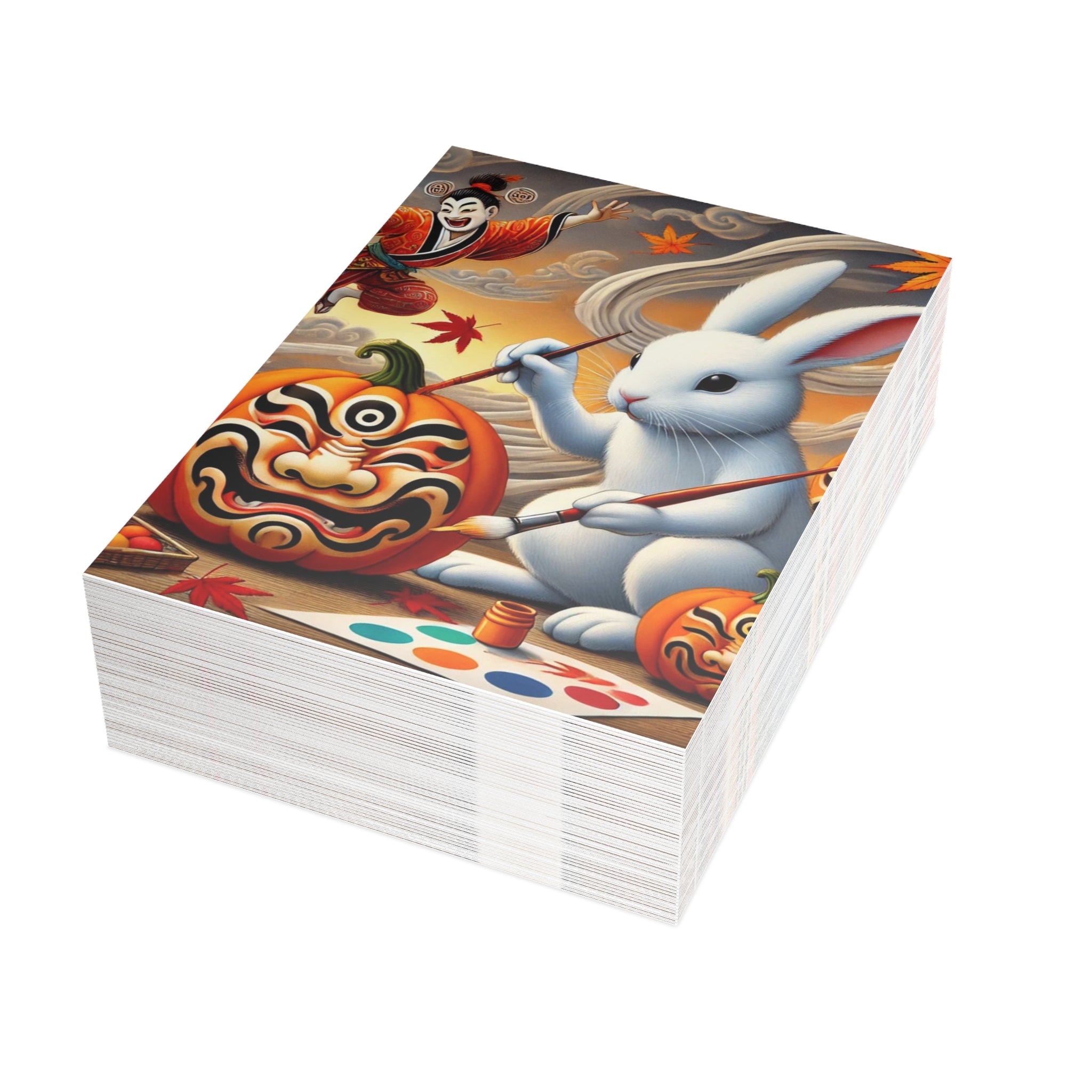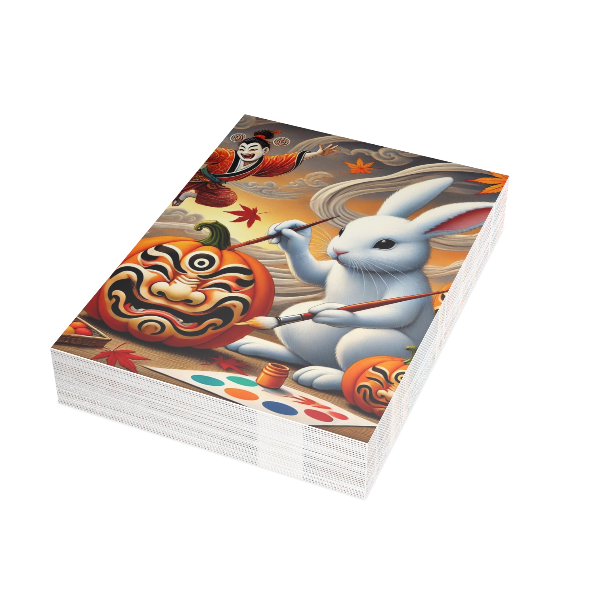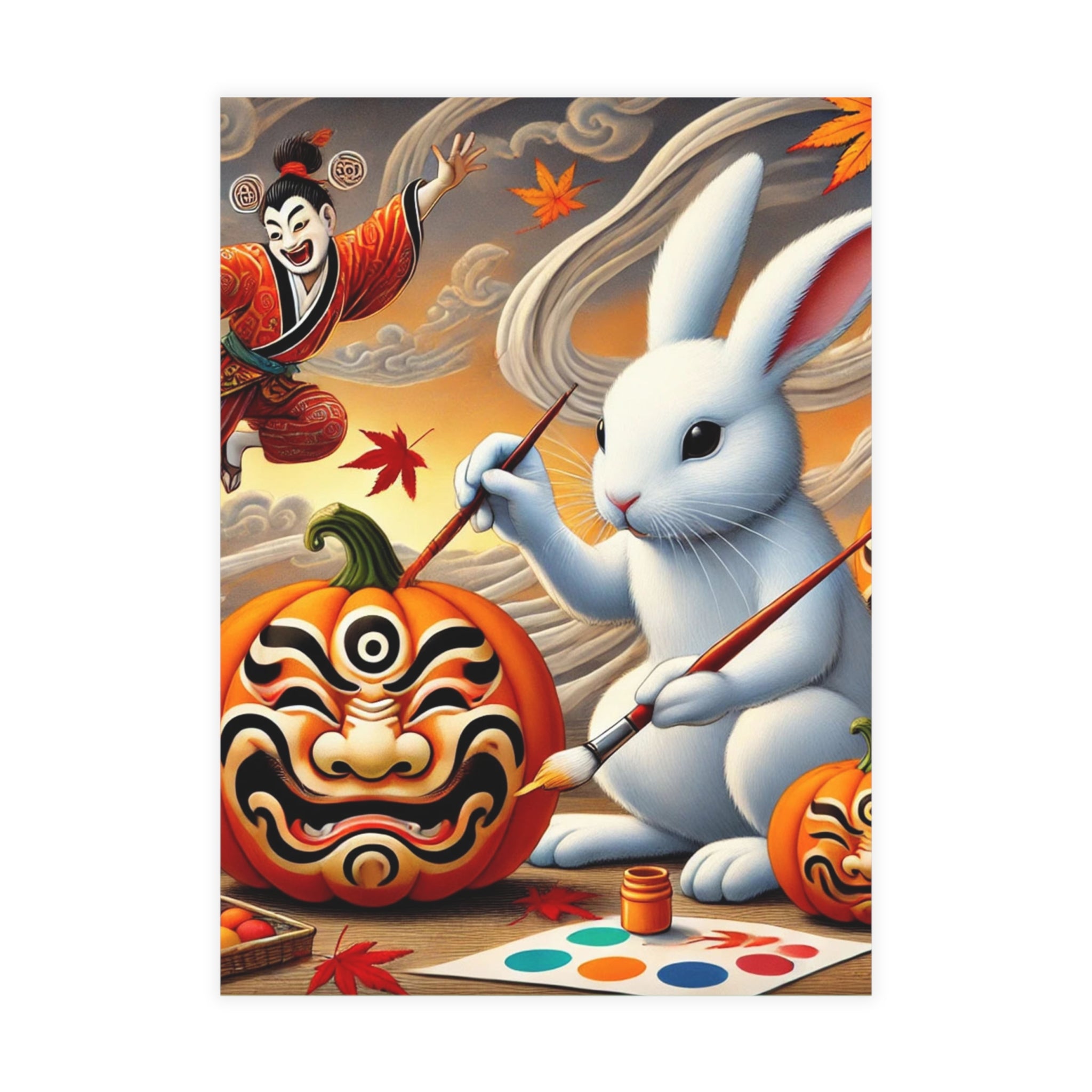 Send Halloween greetings with a touch of artistry. These postcards, available in bundles of 10, 30, or 50 and printed on your choice of four premium finishes (matte, uncoated, one-side coat, or two-side coat), combine quality with creativity. The design features a whimsical rabbit surrounded by pumpkins, each hand-painted with bold Kabuki mask faces that transform into glowing jack-o’-lanterns. Blending Japanese theatrical flair with playful seasonal spirit, this artwork turns every message into a magical Halloween celebration.