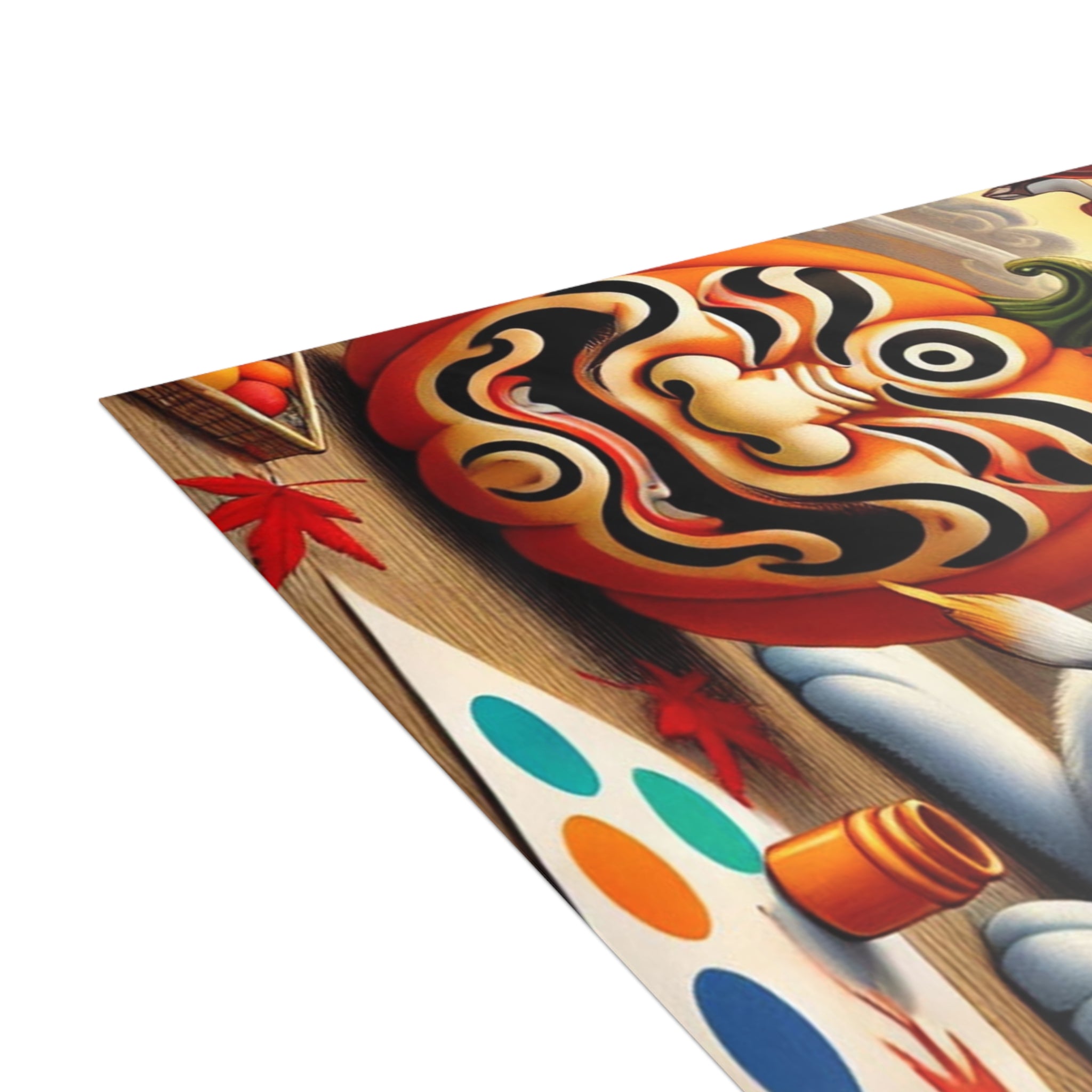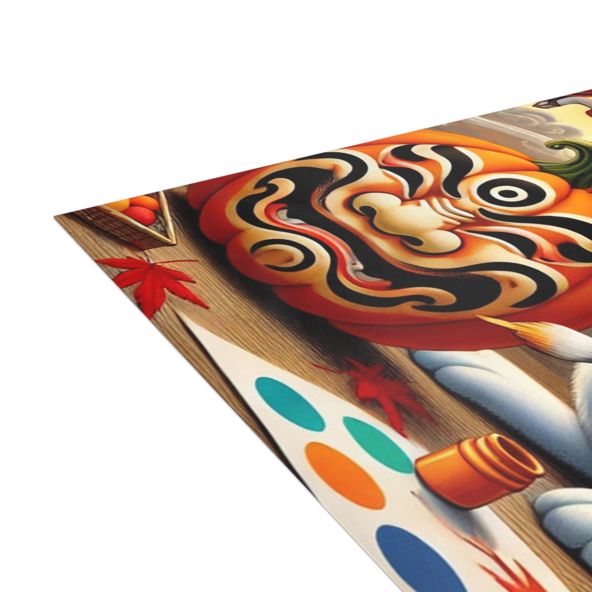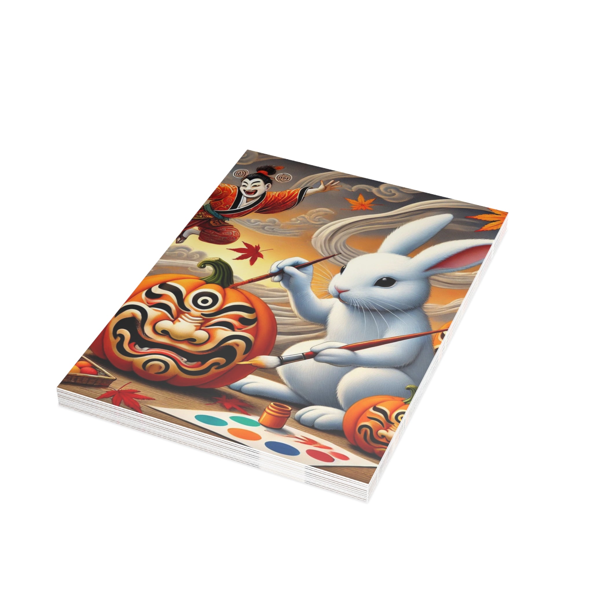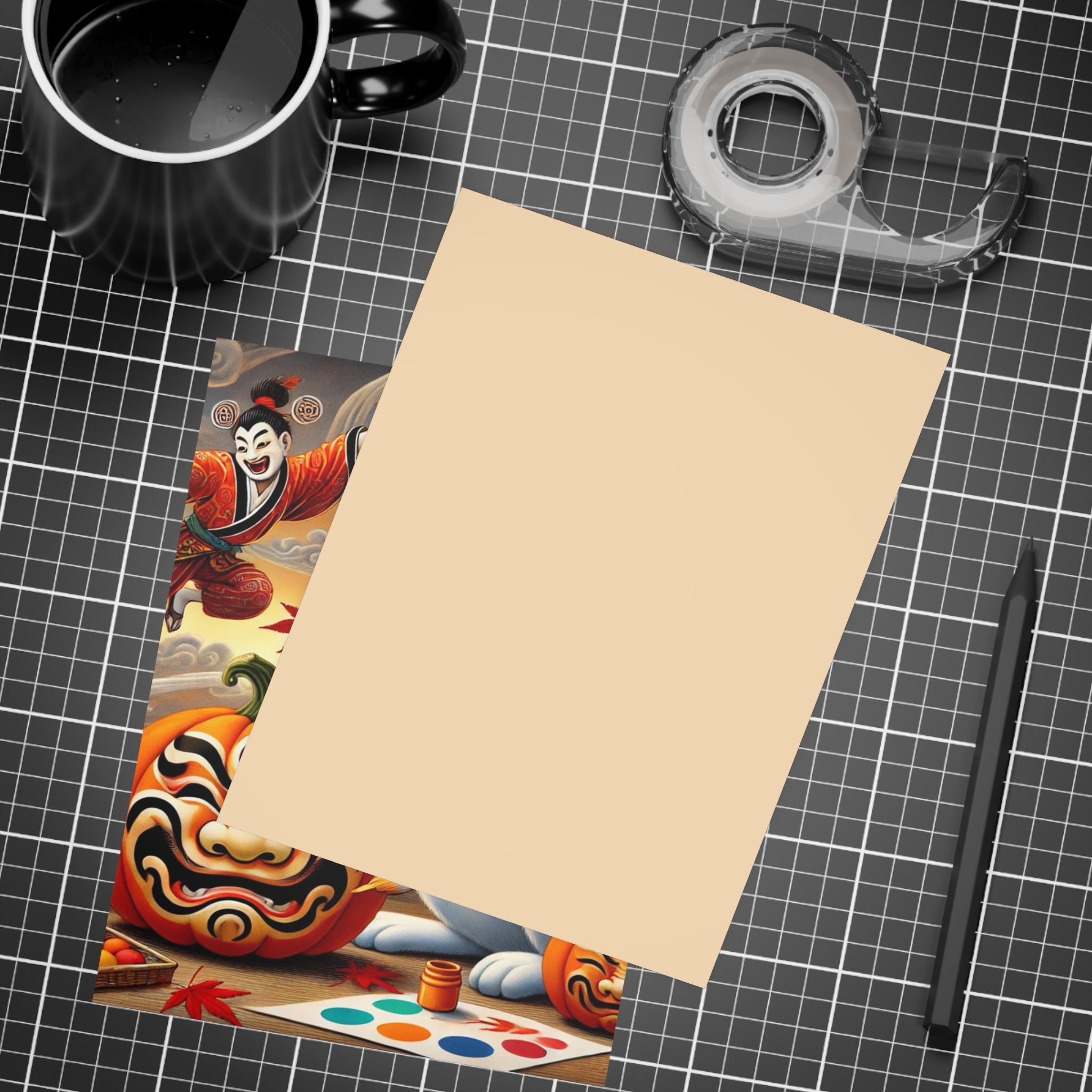 Send Halloween greetings with a touch of artistry. These postcards, available in bundles of 10, 30, or 50 and printed on your choice of four premium finishes (matte, uncoated, one-side coat, or two-side coat), combine quality with creativity. The design features a whimsical rabbit surrounded by pumpkins, each hand-painted with bold Kabuki mask faces that transform into glowing jack-o’-lanterns. Blending Japanese theatrical flair with playful seasonal spirit, this artwork turns every message into a magical Halloween celebration.