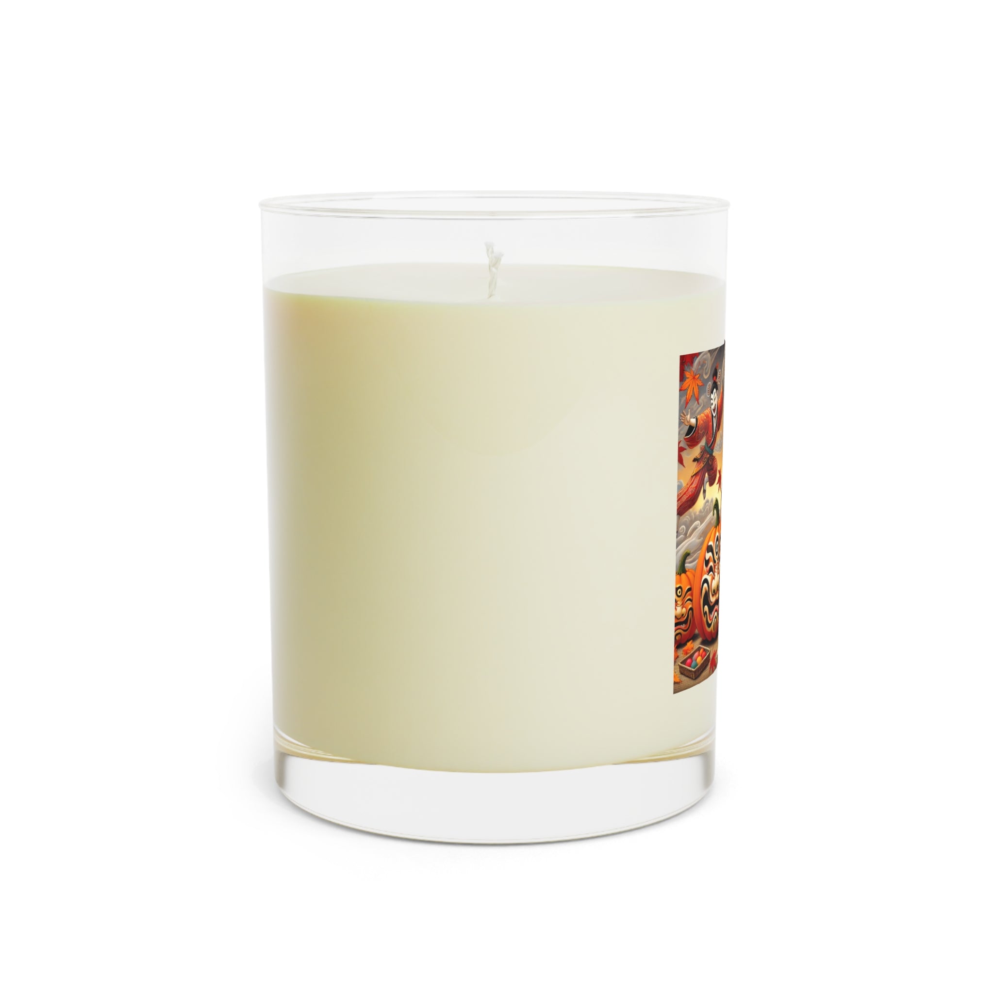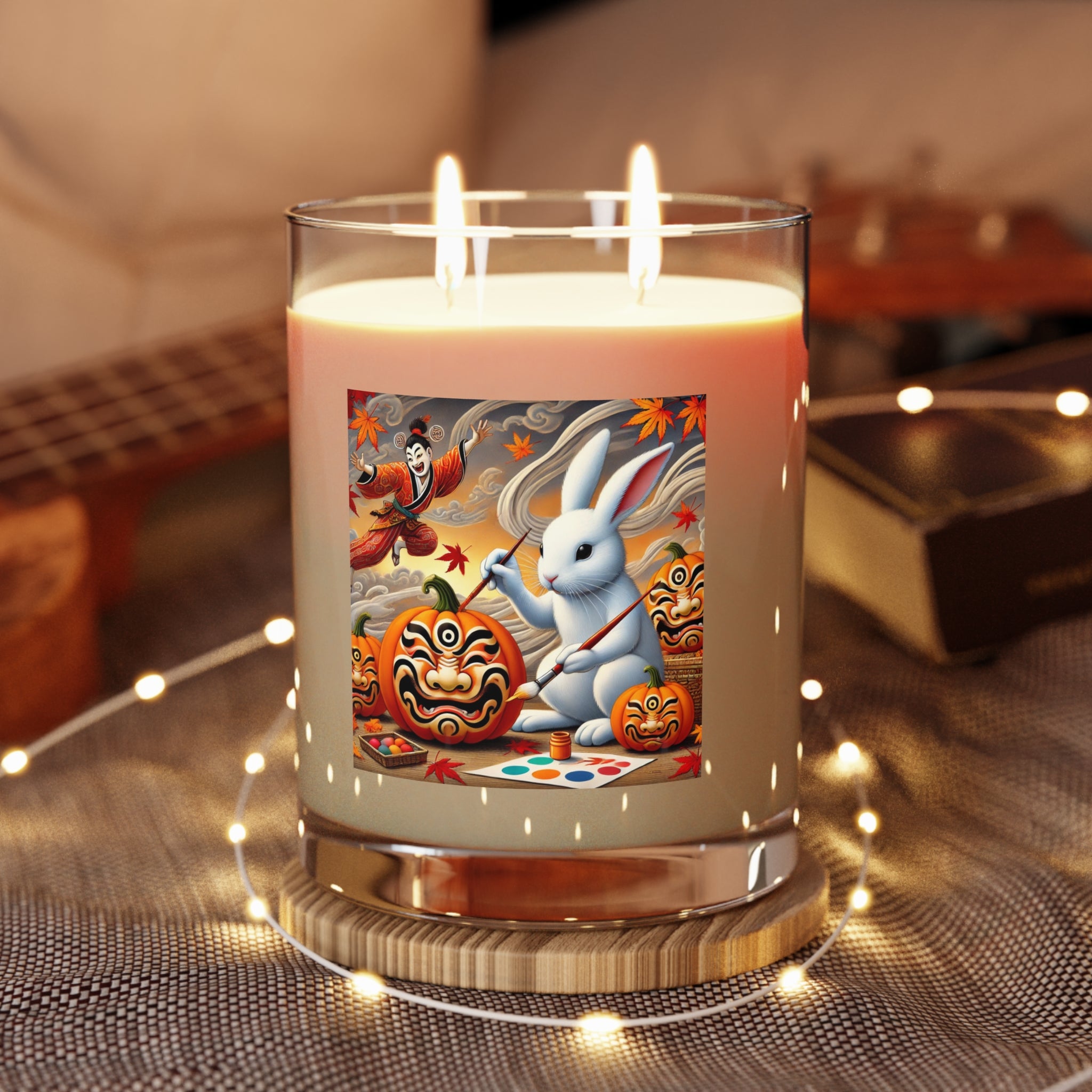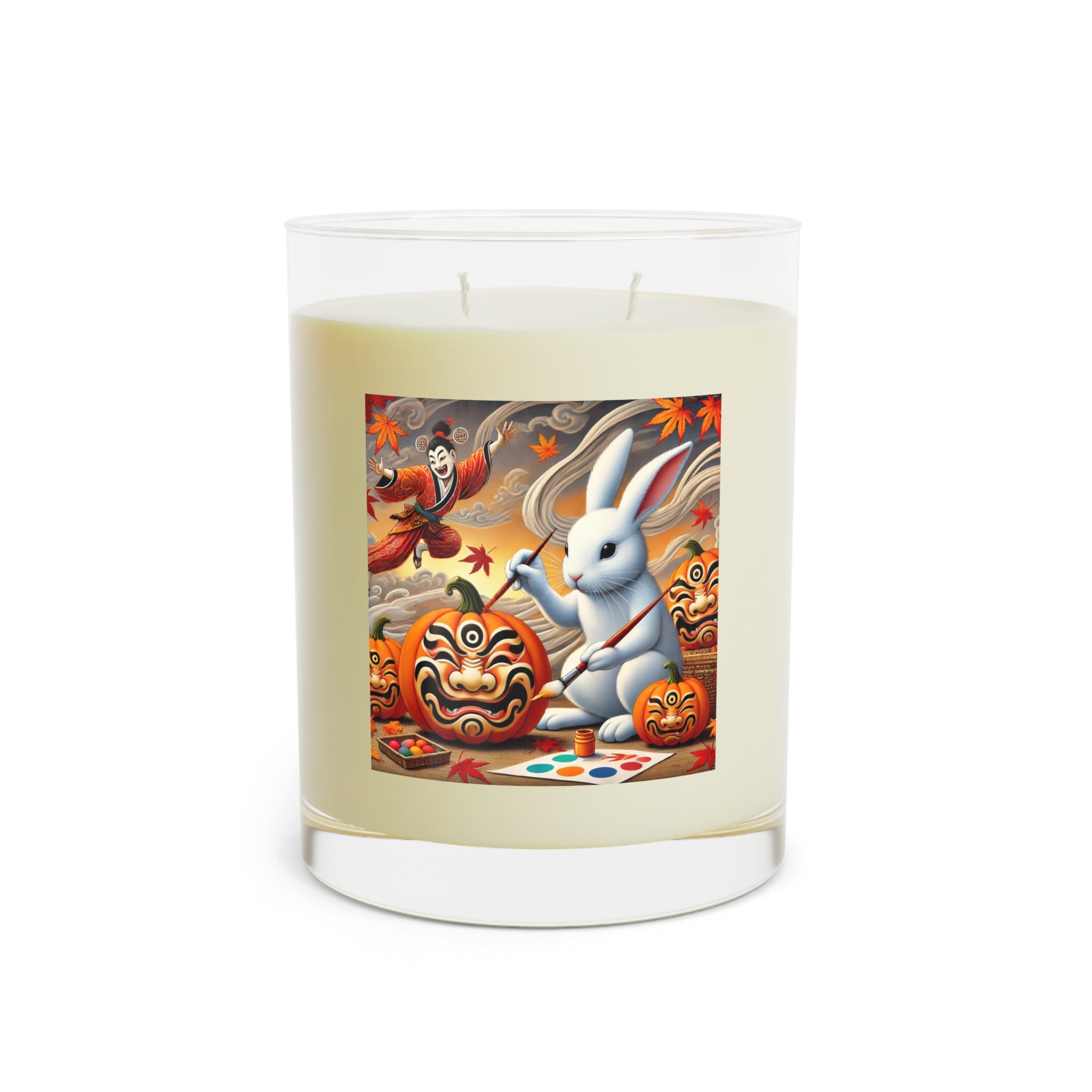 The candle features Halloween Rabbit’s Kabuki Jack-o’-Lanterns, a whimsical scene of a playful rabbit painting pumpkins with bold Kabuki mask faces. The design merges Japanese theatrical drama with the magic of Halloween, turning an ordinary candle into a unique piece of seasonal art that fills your space with both fragrance and imagination.
