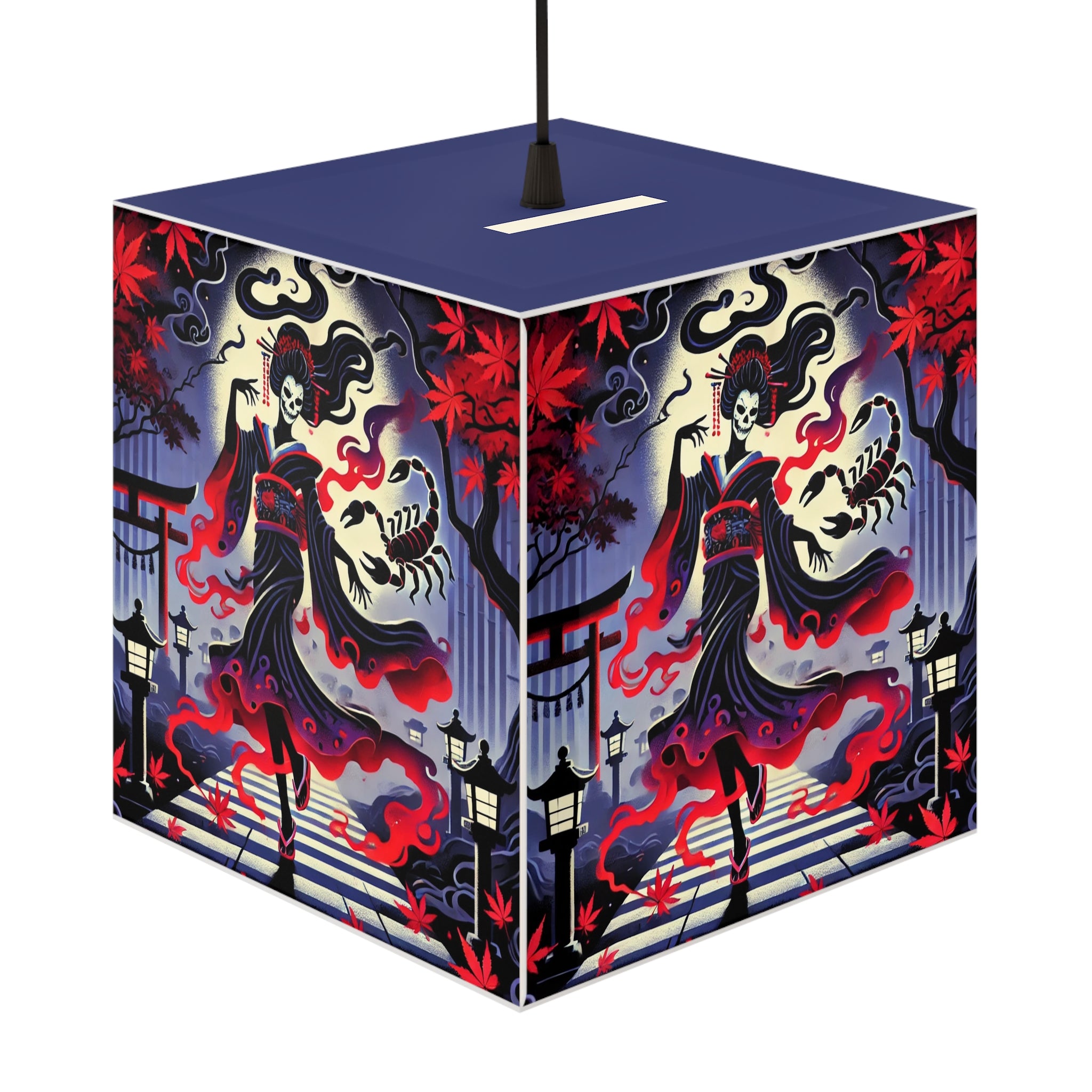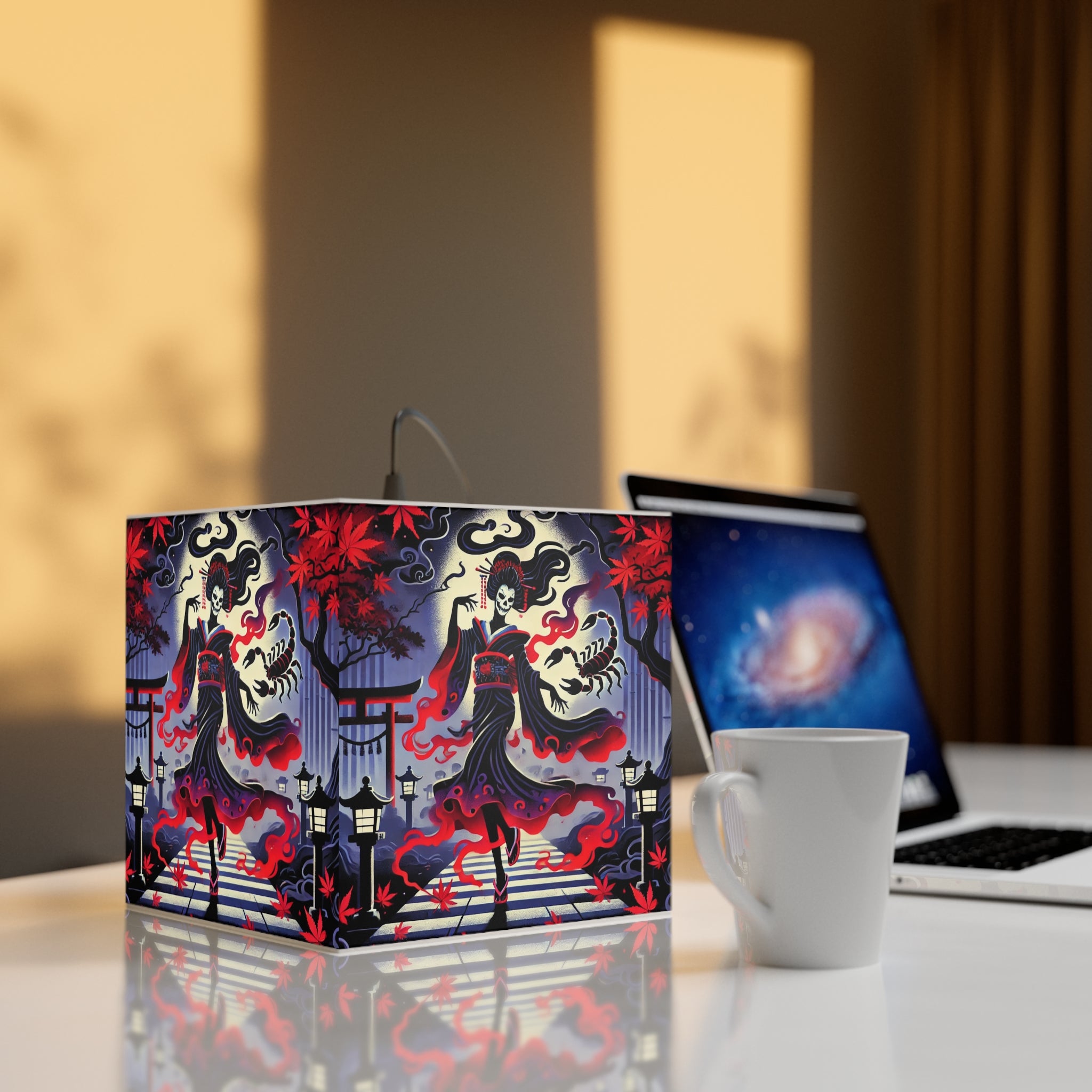 As the lamp shines, a supernatural sorceress emerges across its glowing surface, striding through a swirling storm of crimson and fiery autumn leaves. Her presence is both eerie and elegant, a vision that blends the enchantment of Halloween with bold bursts of color. Just as the lamp fills a room with light, the design fills it with mystery and artistry, making this piece perfect for those who love seasonal décor that is both spooky and stylish.