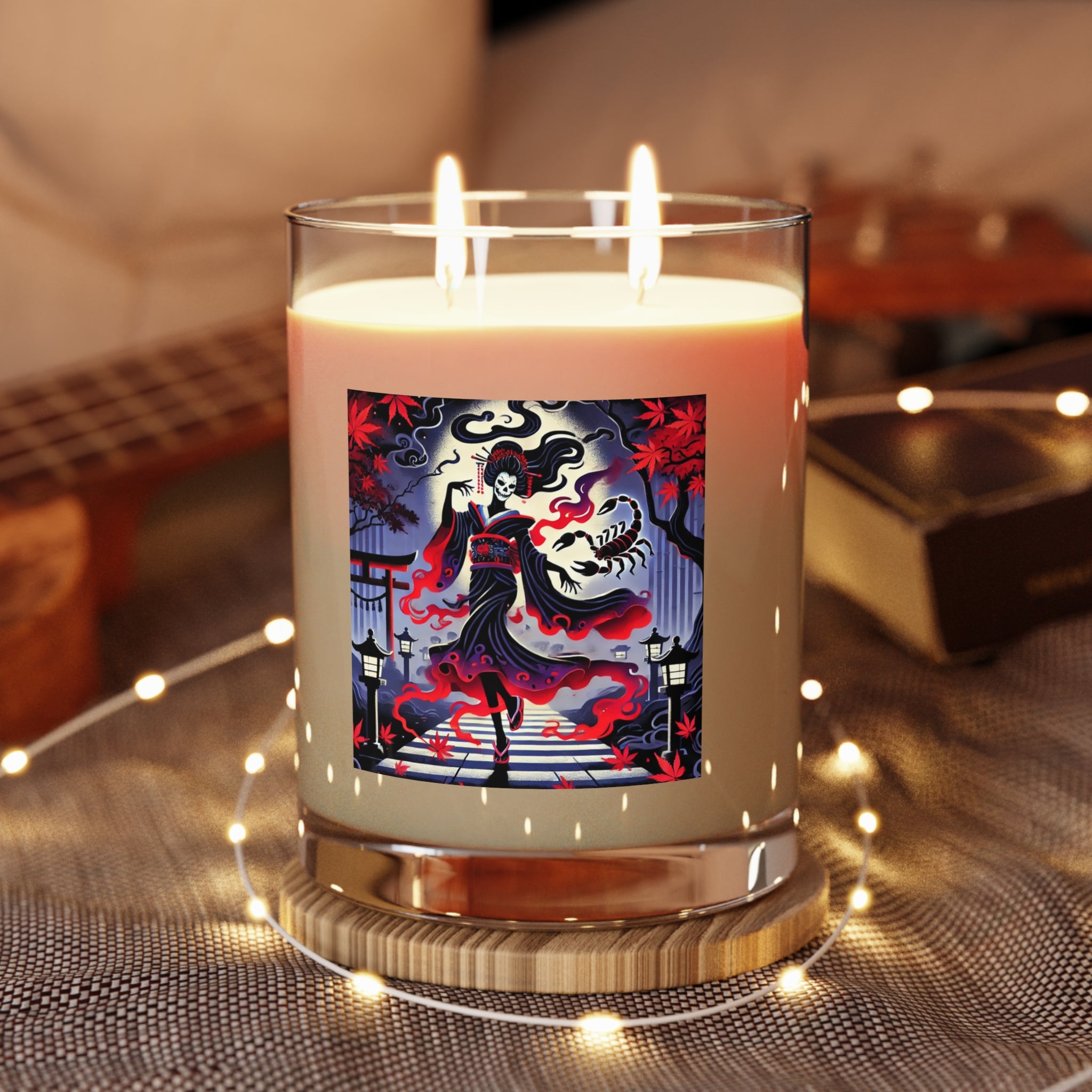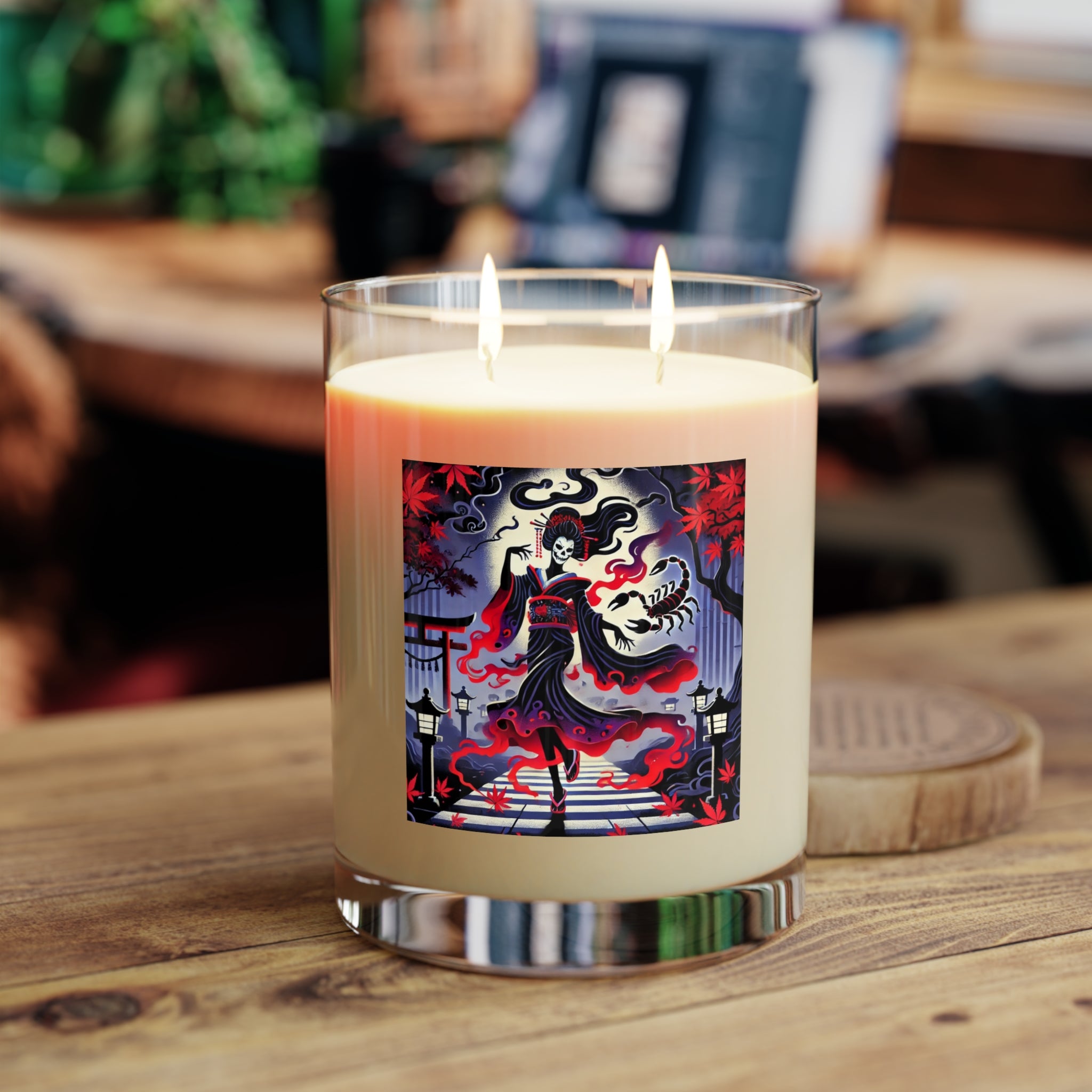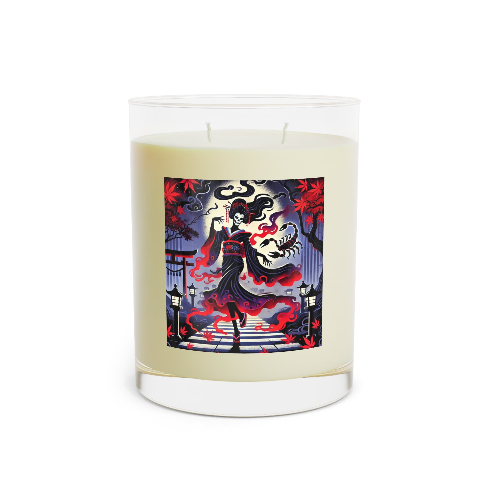 Light up your space with both fragrance and artistry. This 11oz full-glass scented candle features a hauntingly beautiful Halloween scene, where a supernatural sorceress walks through a storm of crimson and fiery leaves. The design glows with each flicker, blending spooky elegance with bold seasonal color. Made with 100% food-grade soy wax and premium fragrance oils, this phthalate- and lead-free candle offers up to 65 hours of clean burn time. Available in three enchanting scents—White Tea & Fig, Lavender & Sage, and Ocean Mist & Moss—it transforms everyday aromatherapy into a magical ritual of mystery and style.