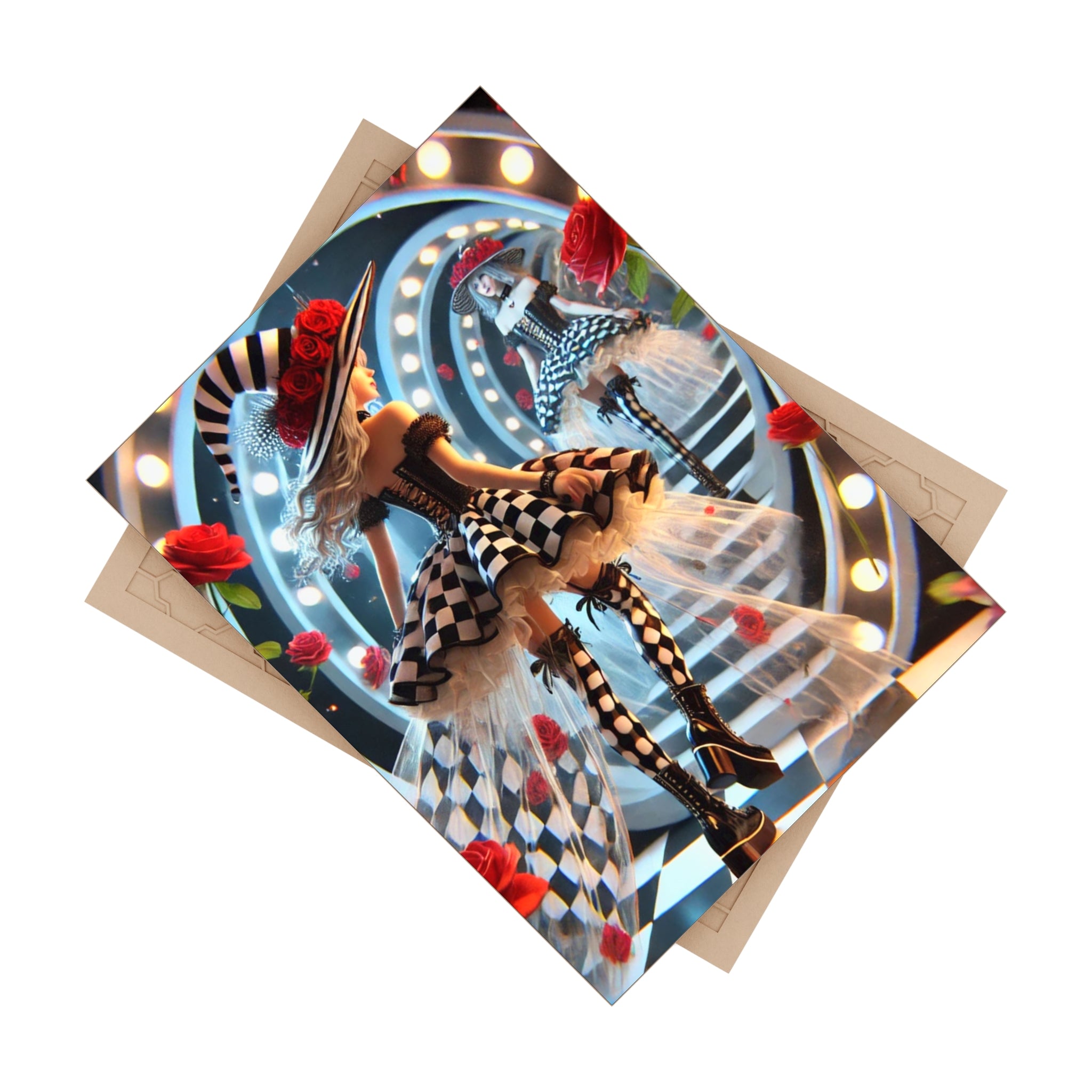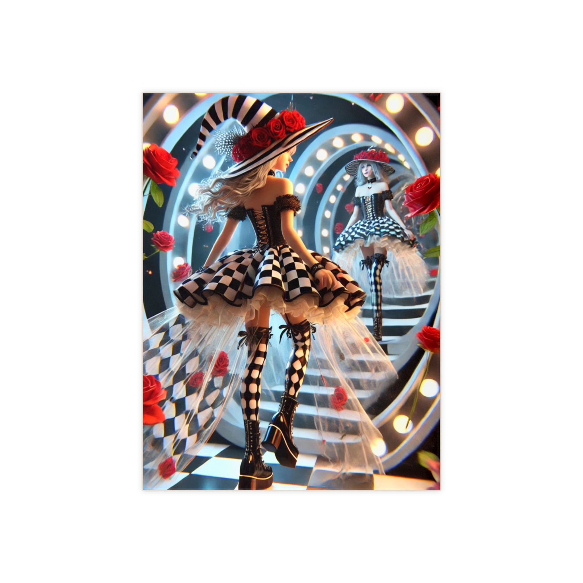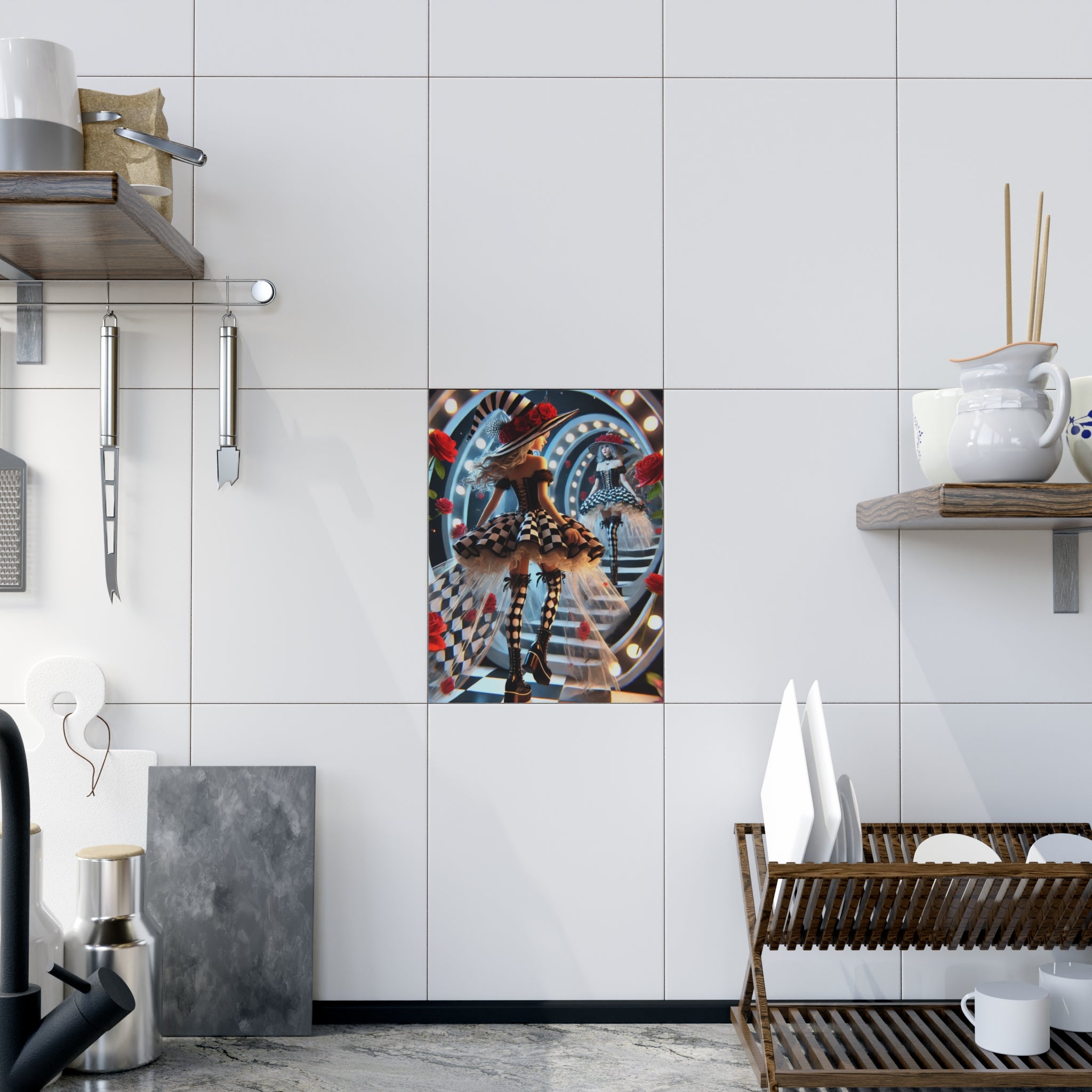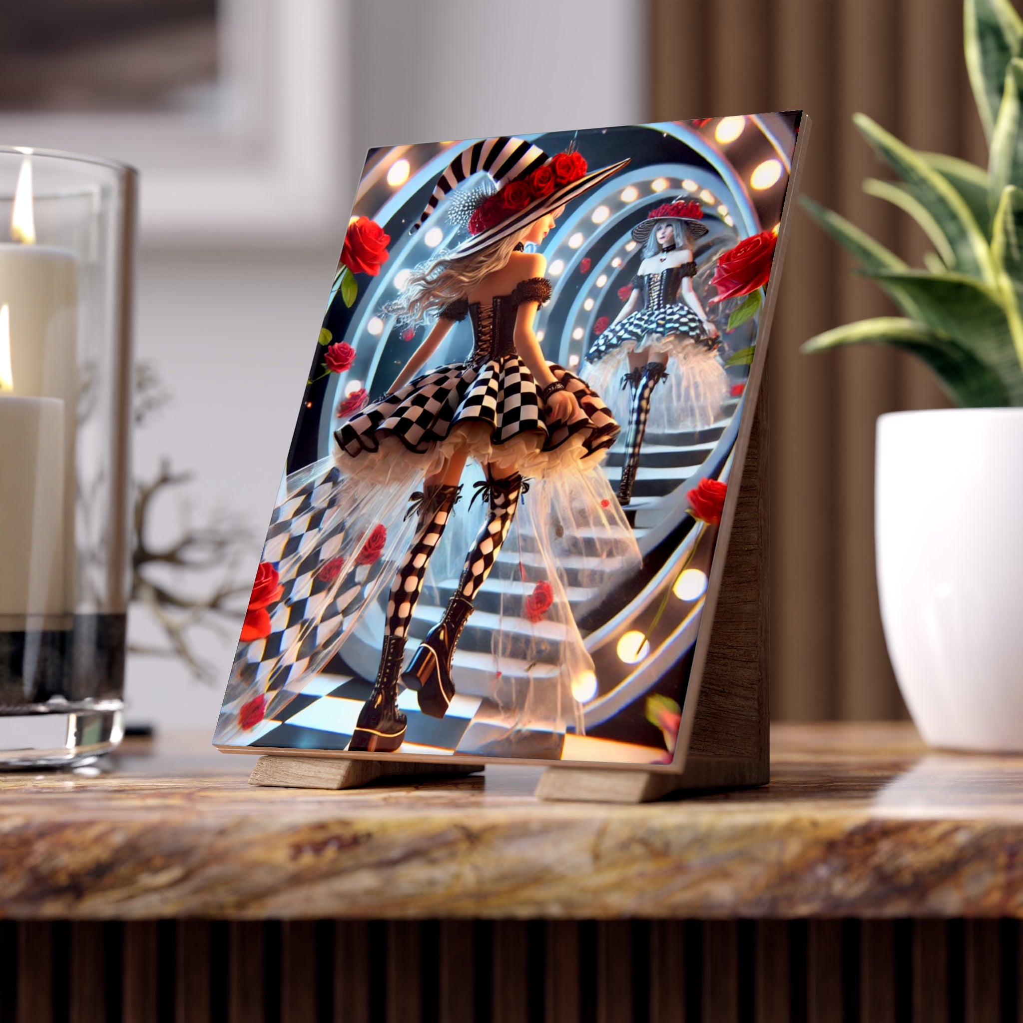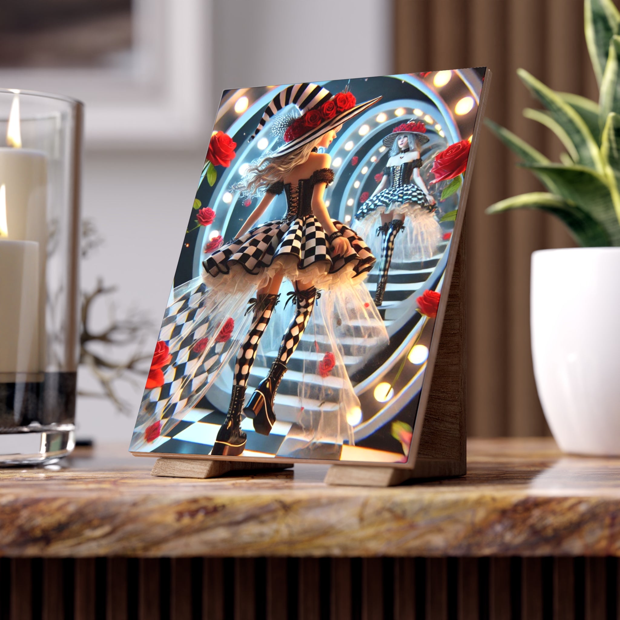Add a surreal touch of Halloween magic to your home with this custom ceramic tile, available in a glossy or matte finish. The design features a stylish young witch stepping through a glowing vanity-style mirror, her reflection gazing back as the line between reality and illusion blurs. Around her, radiant red roses bloom and bold black-and-white checkerboard patterns spiral into infinity, creating a dramatic and fashionable dreamscape. Both decorative and functional, this tile captures the enchantment of Halloween with an artistic edge, making it perfect as a display piece, trivet, or accent in your seasonal décor.