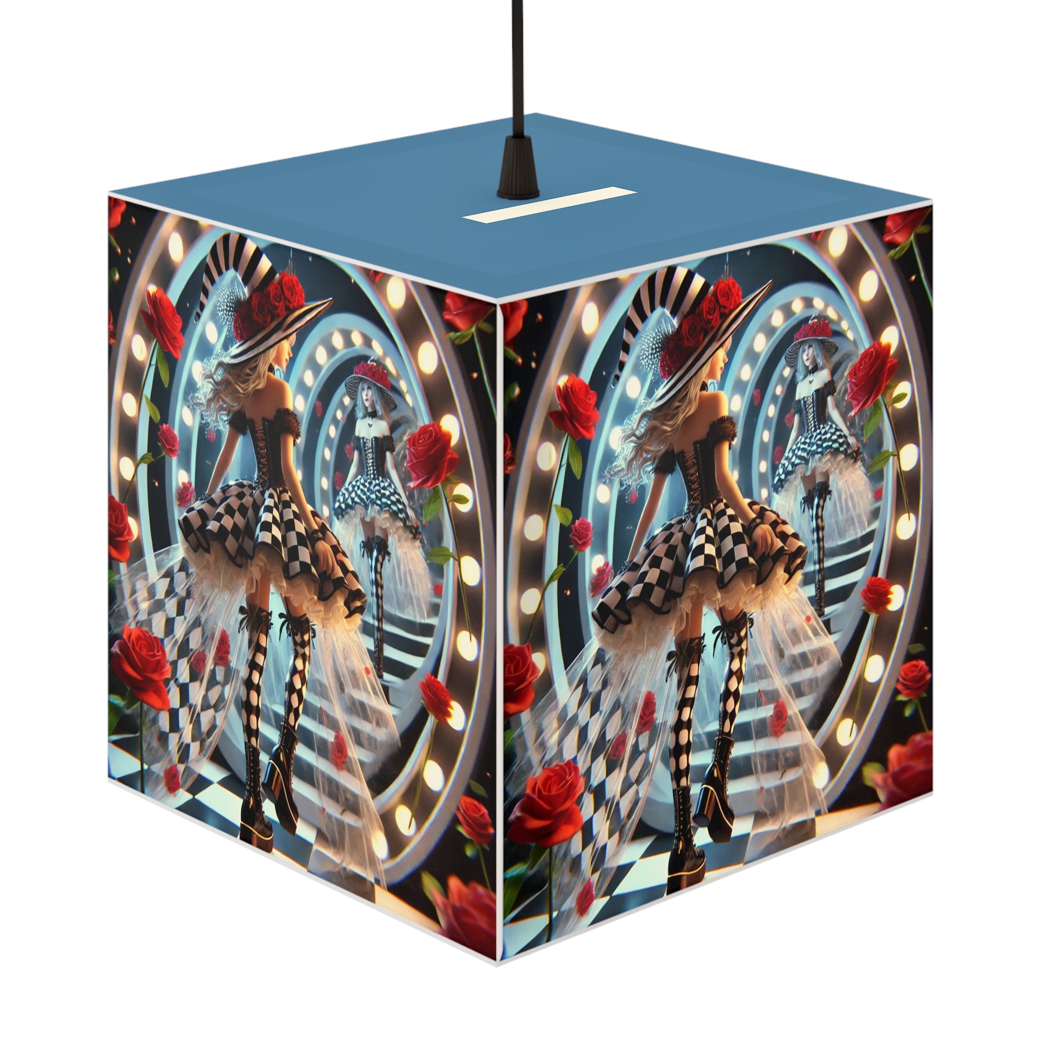 Across its luminous panels, a hip young witch steps through a life-size mirror framed with glowing vanity bulbs. Her reflection meets her gaze from the other side, blurring the boundary between illusion and reality. Surrounding her, red roses shimmer with supernatural light while bold black-and-white checkerboard patterns spiral into infinity. Just as the lamp casts its tranquil glow, the artwork captures the allure of stepping beyond the ordinary into a world where fashion, fantasy, and mystery collide.