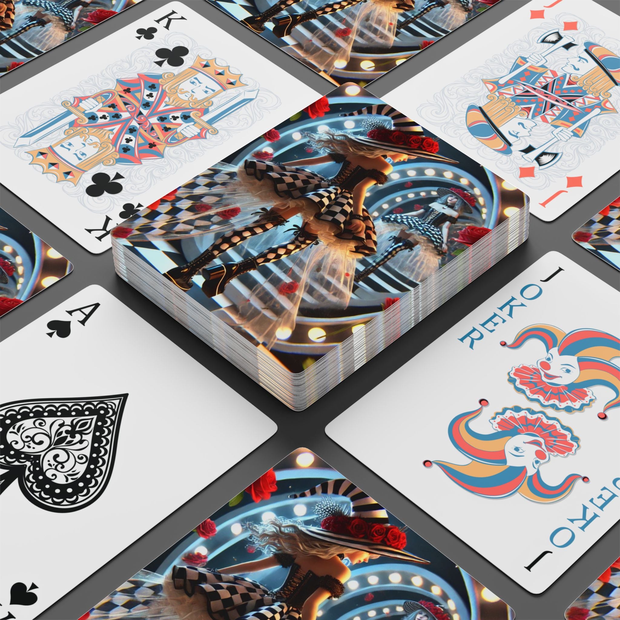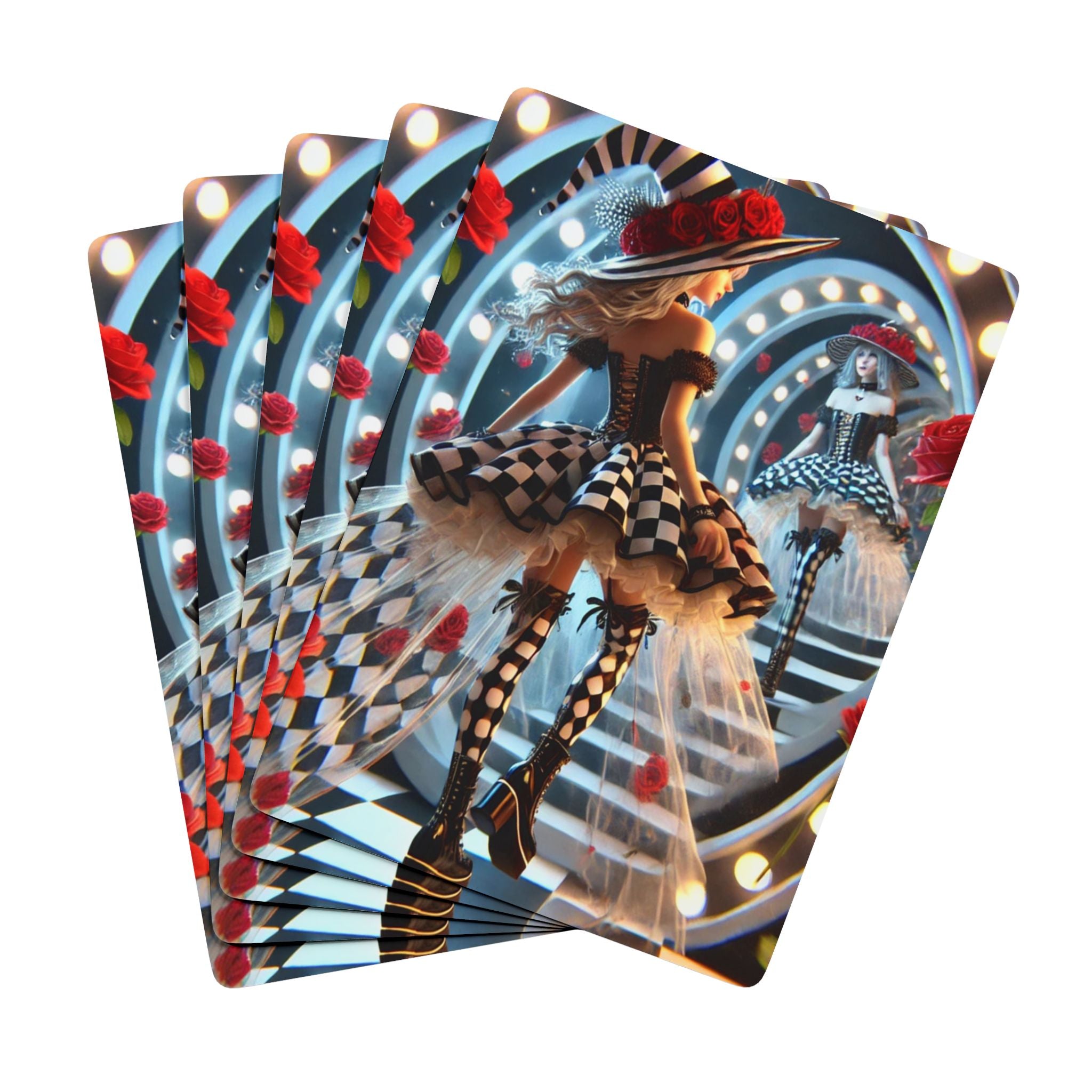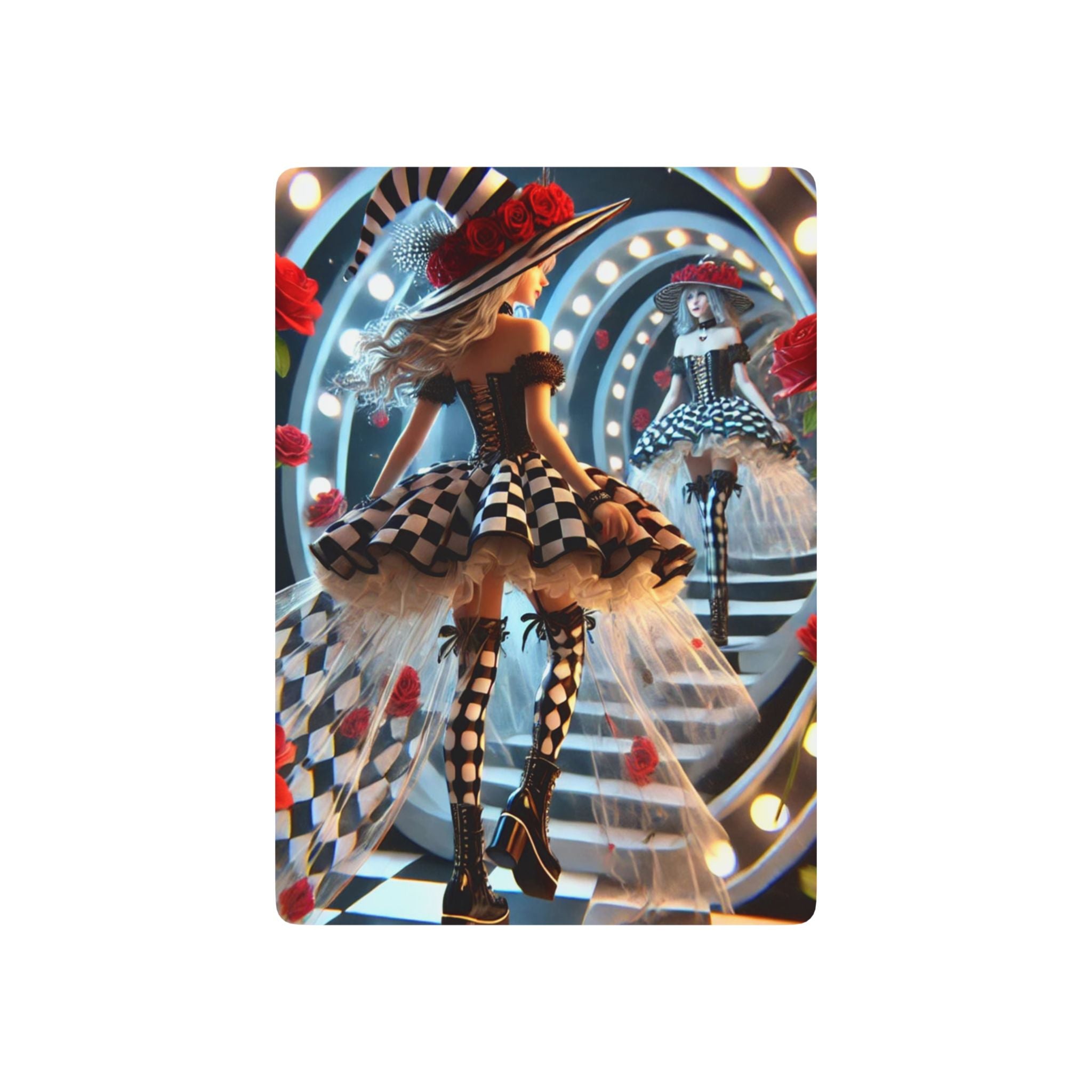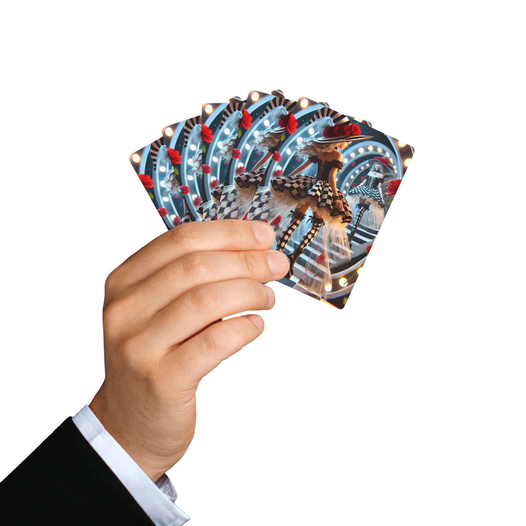 Adorning the backs is a surreal Halloween vision: a hip young witch steps boldly through a glowing life-size mirror framed with vanity bulbs, her reflection gazing back as reality and illusion blur. Around her, radiant red roses bloom under a mystical glow while bold black-and-white checkerboard patterns spiral endlessly into the distance. This design merges fashion, fantasy, and mystery, turning each hand of cards into a captivating journey beyond the ordinary.