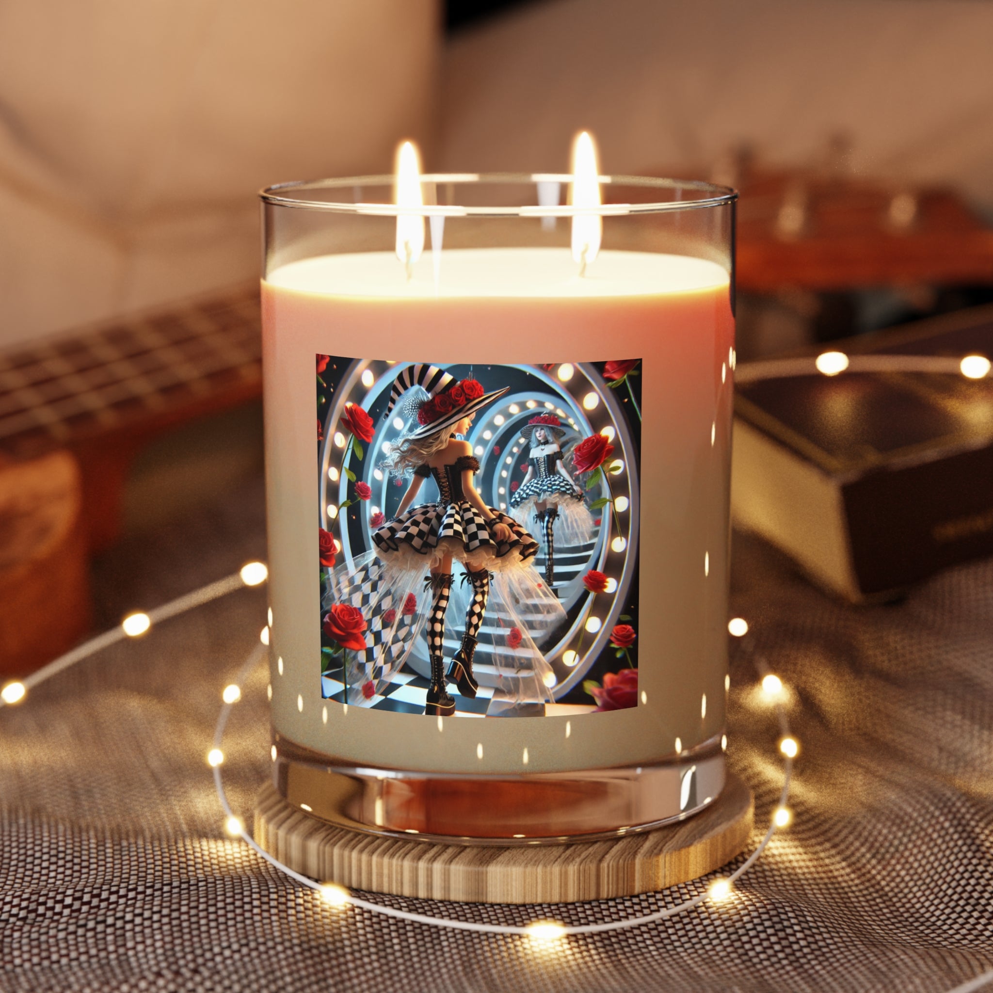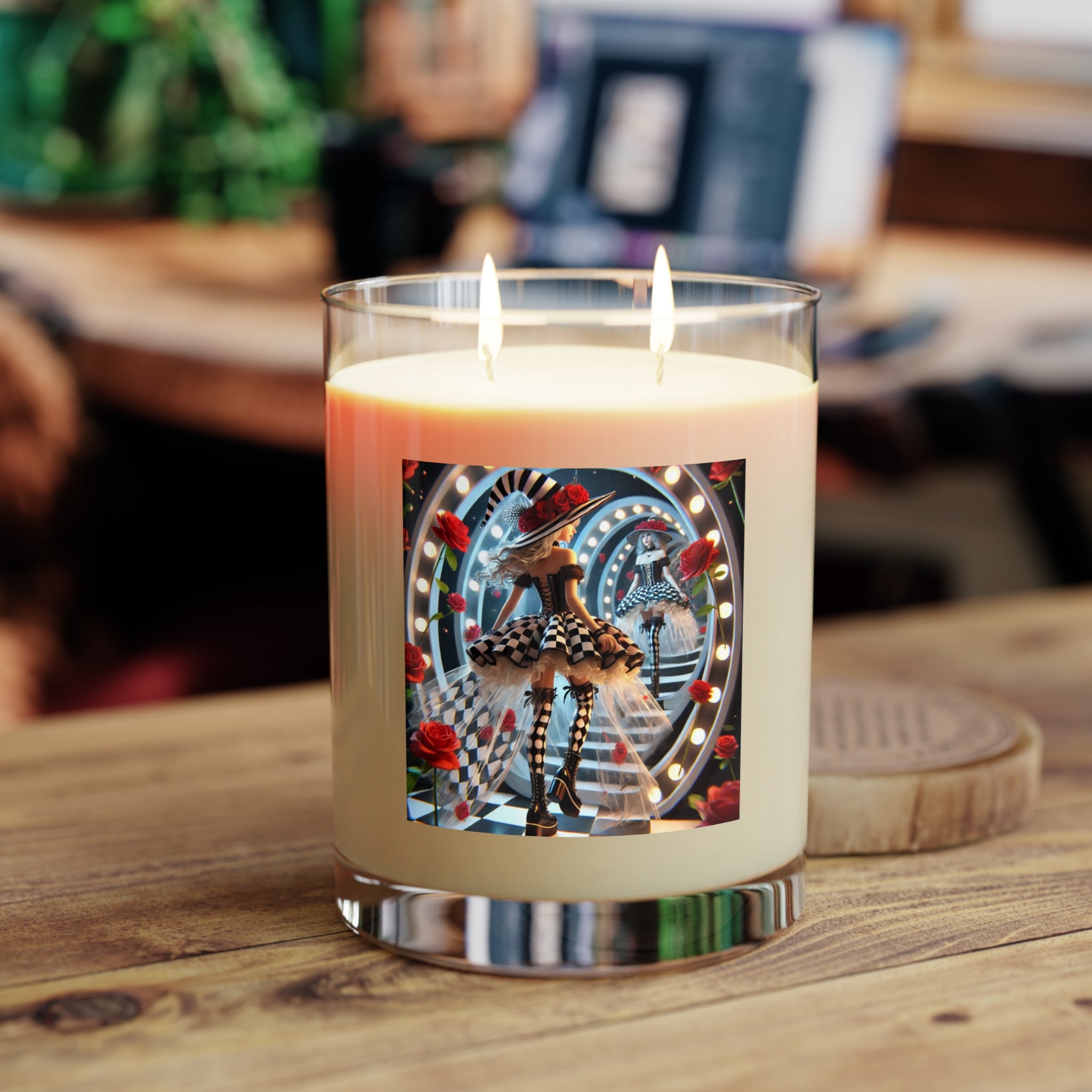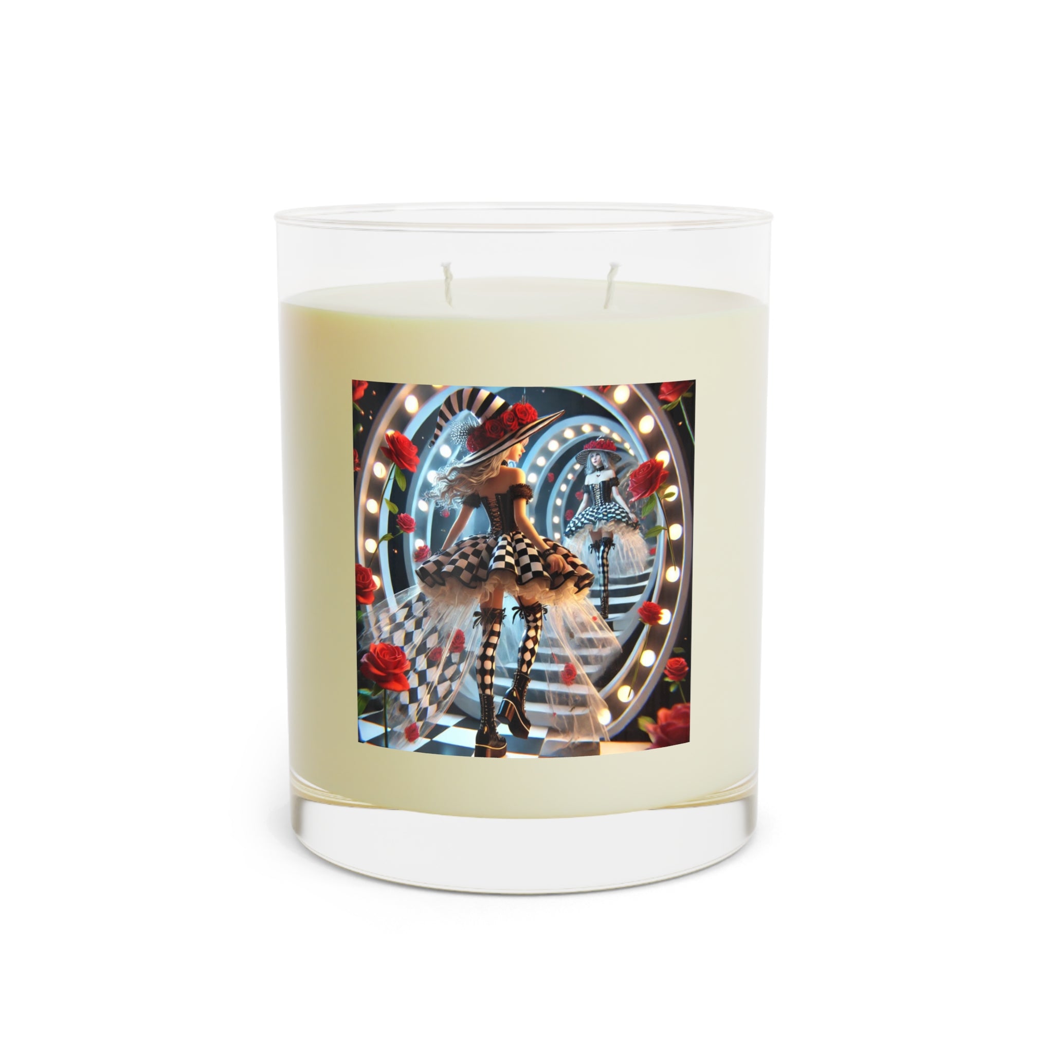 The design features a surreal Halloween scene of a chic young witch stepping through a glowing mirror framed with vanity bulbs, her reflection staring back as red roses glow and checkerboard patterns spiral into infinity. Blending fashion, fantasy, and enchantment, this candle adds both soothing fragrance and hauntingly beautiful décor to your home.