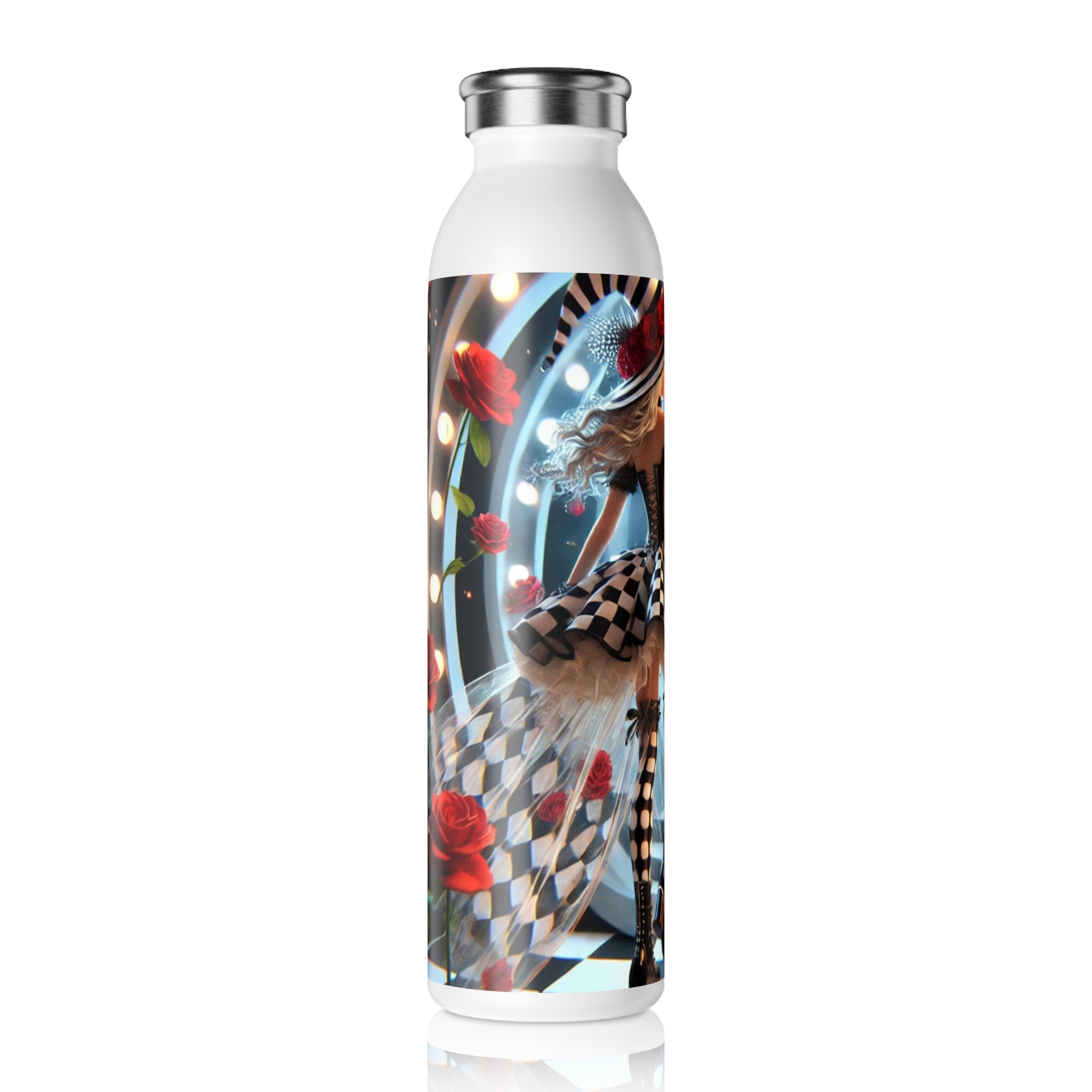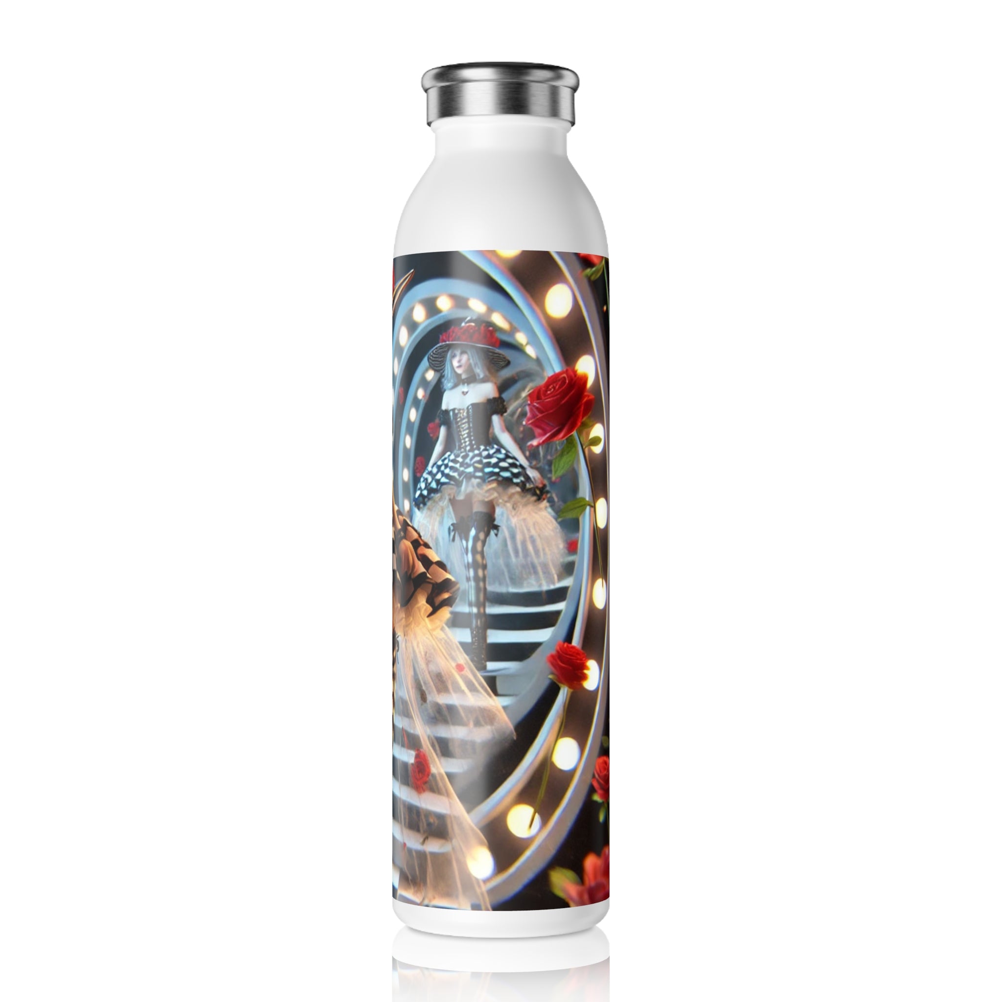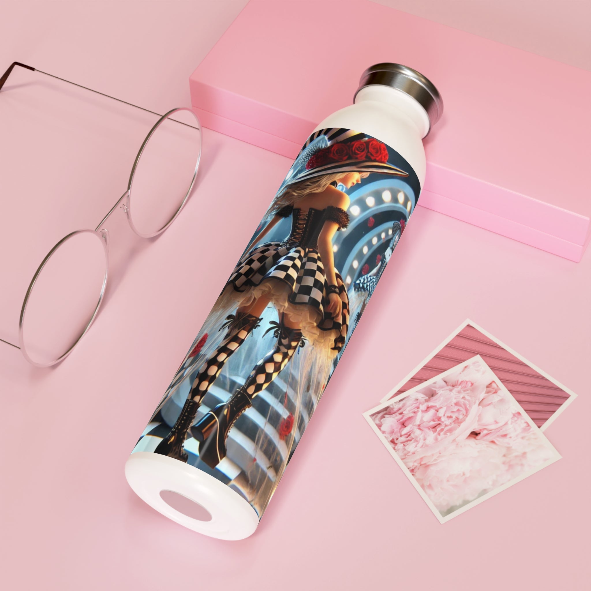 Wrapped around its sleek surface, a hip young witch steps through a glowing life-size mirror framed with vanity bulbs. Her reflection stares back from the other side, blurring the boundary between illusion and reality. Surrounding her, red roses glow with supernatural radiance, while bold black-and-white checkerboard patterns spiral endlessly into the distance. Just as this water bottle holds both warmth and coolness within, the design captures the spellbinding tension between elegance and the surreal, transforming everyday hydration into a dreamlike ritual.