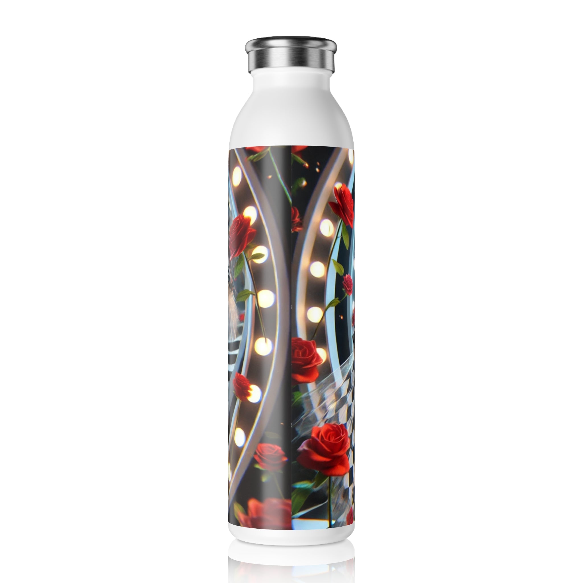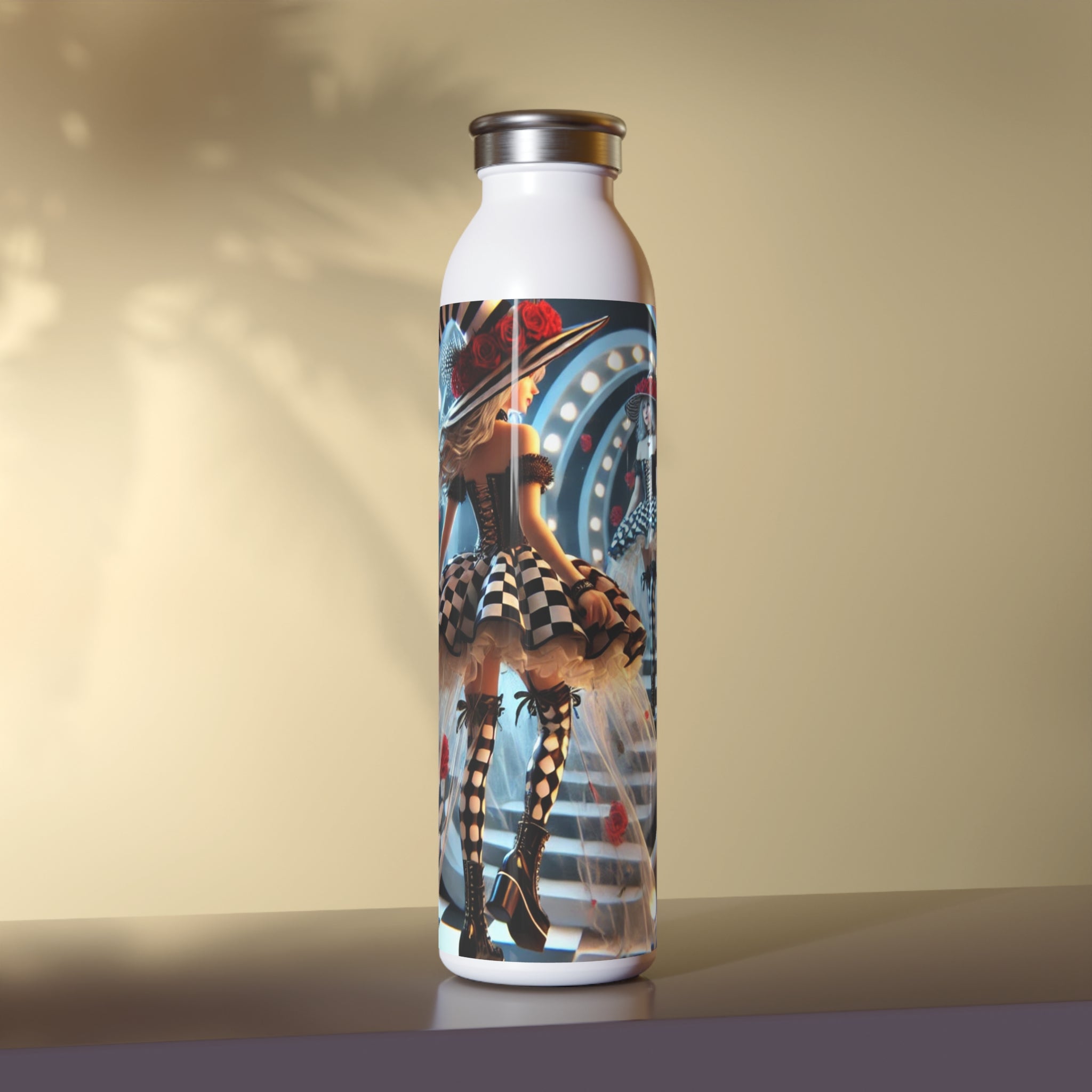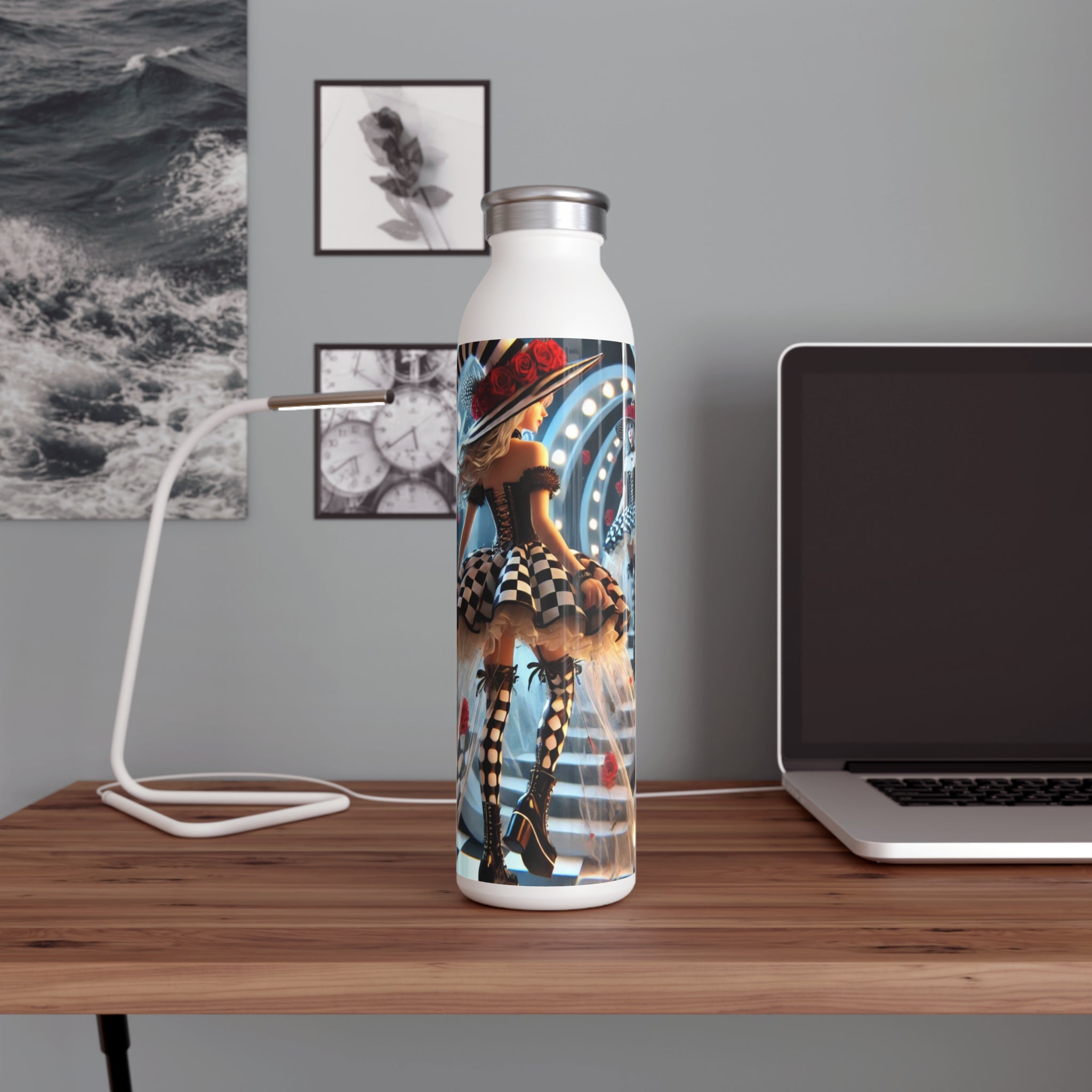 Wrapped around its sleek surface, a hip young witch steps through a glowing life-size mirror framed with vanity bulbs. Her reflection stares back from the other side, blurring the boundary between illusion and reality. Surrounding her, red roses glow with supernatural radiance, while bold black-and-white checkerboard patterns spiral endlessly into the distance. Just as this water bottle holds both warmth and coolness within, the design captures the spellbinding tension between elegance and the surreal, transforming everyday hydration into a dreamlike ritual.
