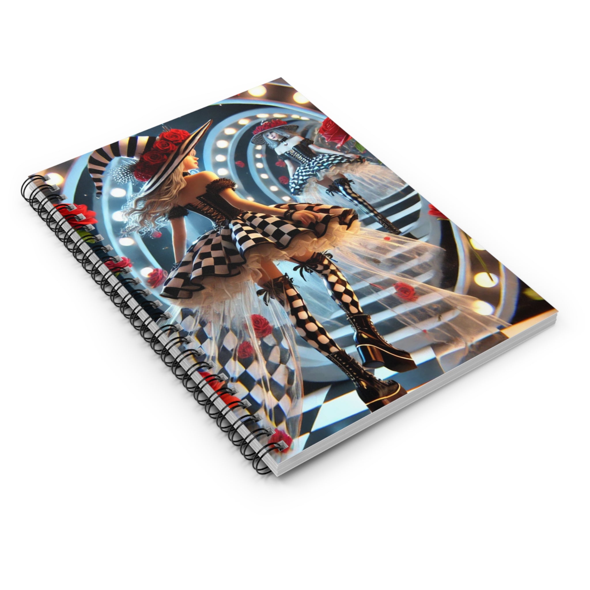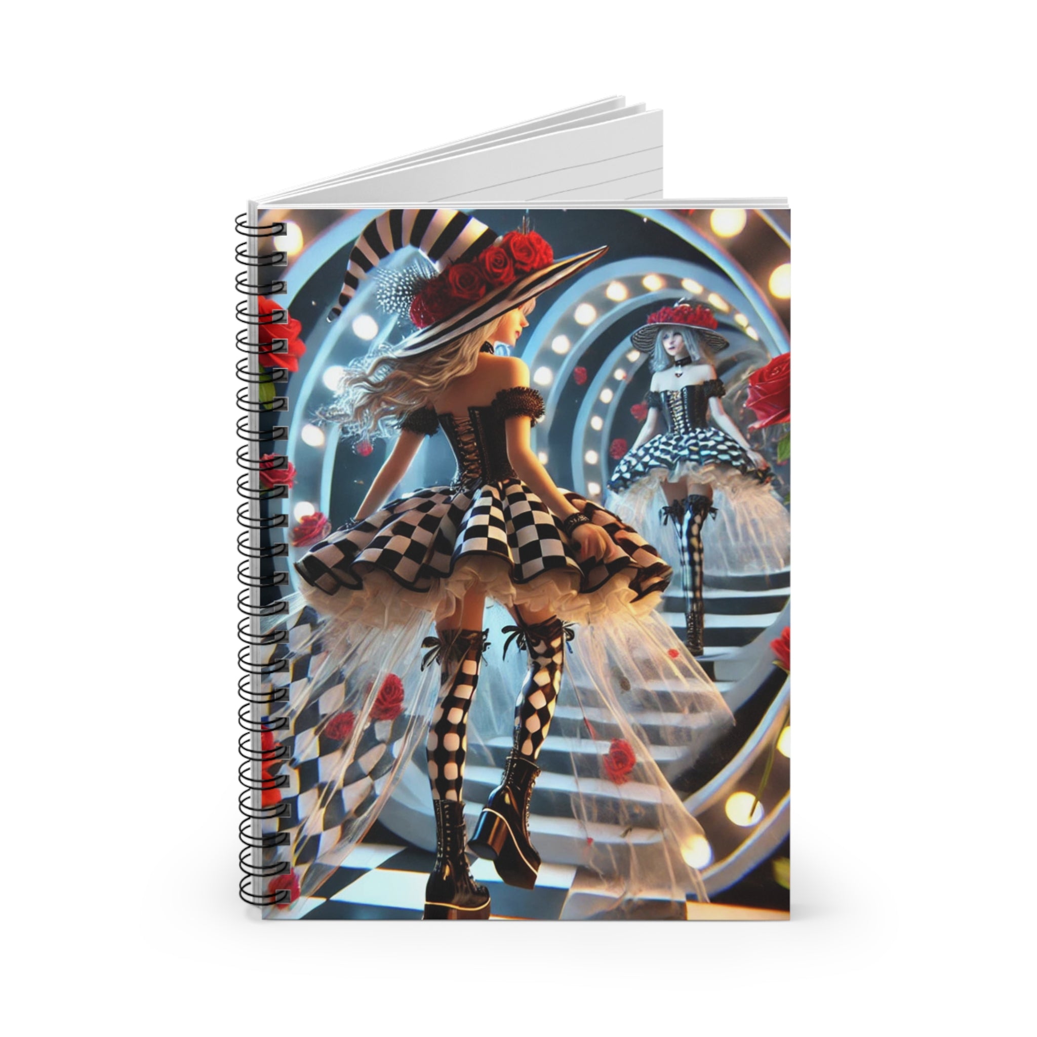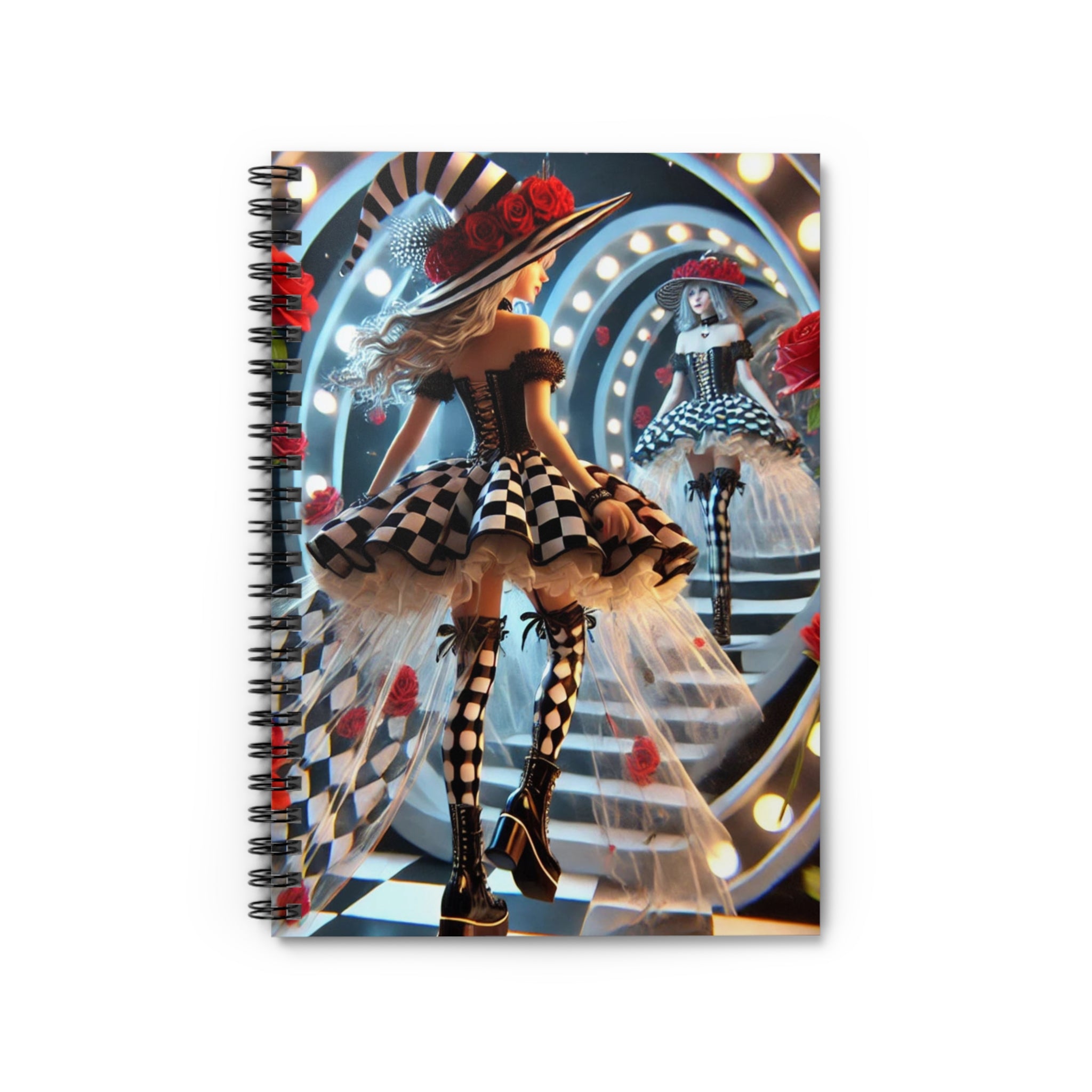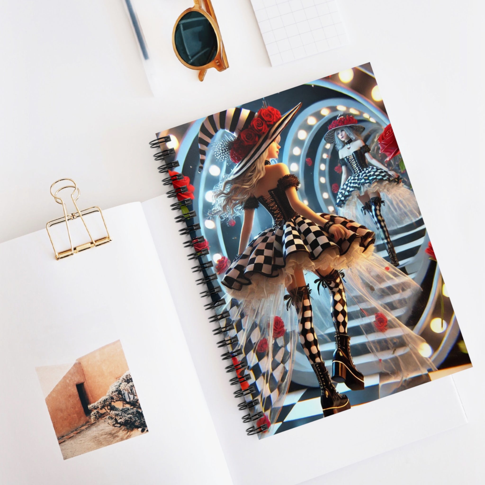 Bring a touch of spooky elegance to your everyday notes with this 118-page spiral notebook featuring ruled line paper—perfect for school, journaling, or creative writing. The durable printed cover showcases a surreal Halloween scene where a stylish young witch steps through a glowing vanity-style mirror, her reflection blurring the line between reality and illusion. Surrounded by glowing red roses and hypnotic black-and-white checkerboard spirals, the design captures the mystery of fashion, fantasy, and Halloween magic. Practical and enchanting, this notebook is as functional as it is artistic, making it a unique companion for work, study, or seasonal décor.
