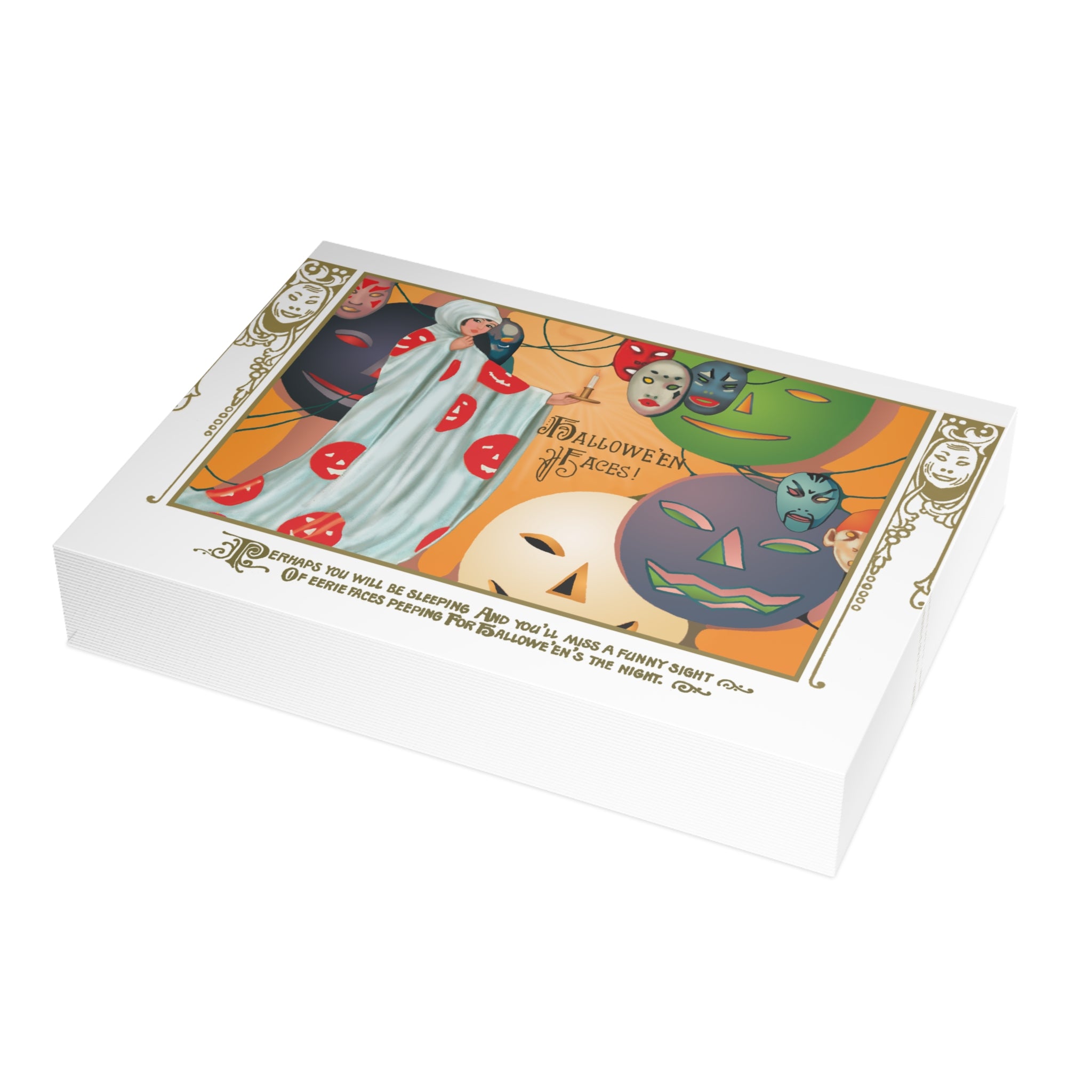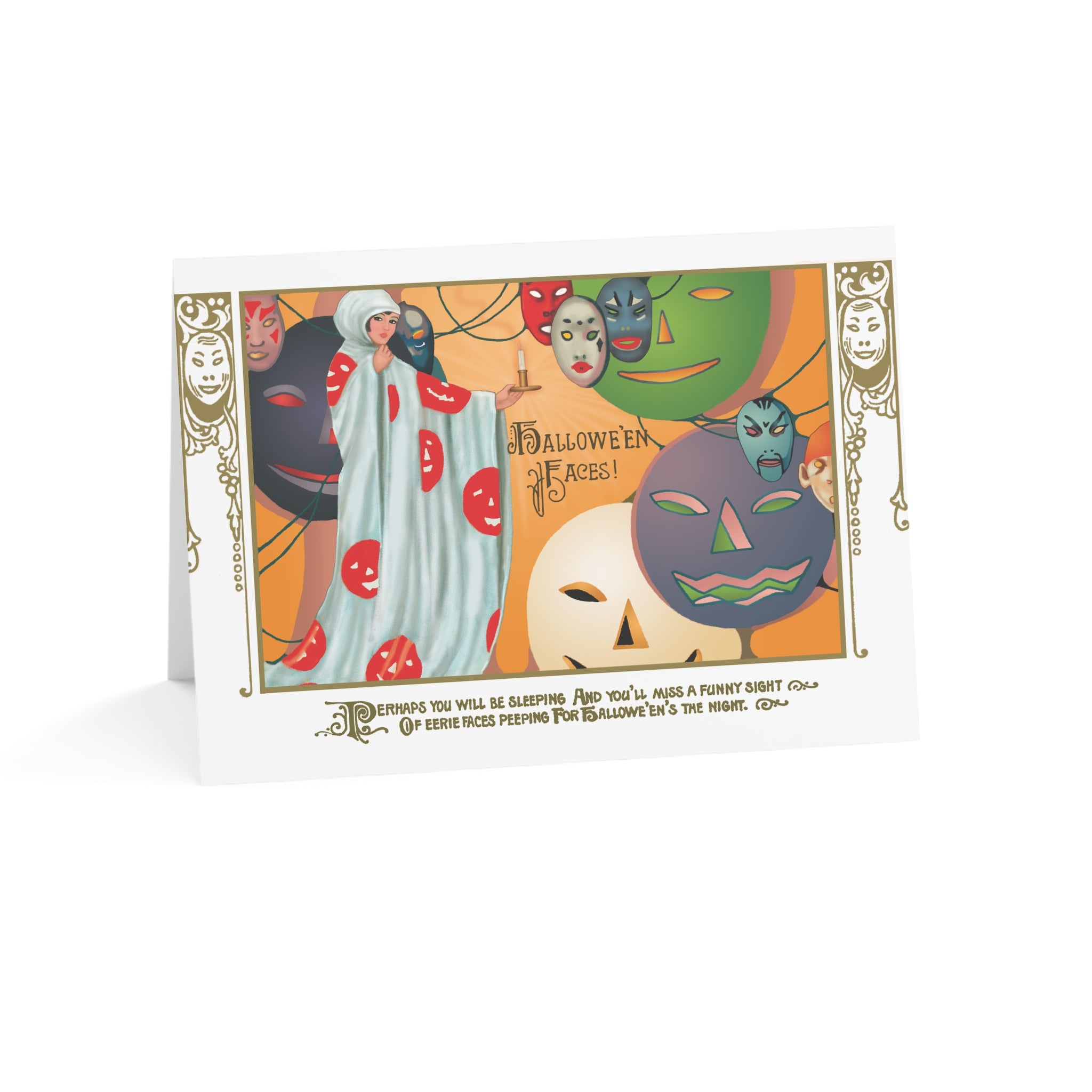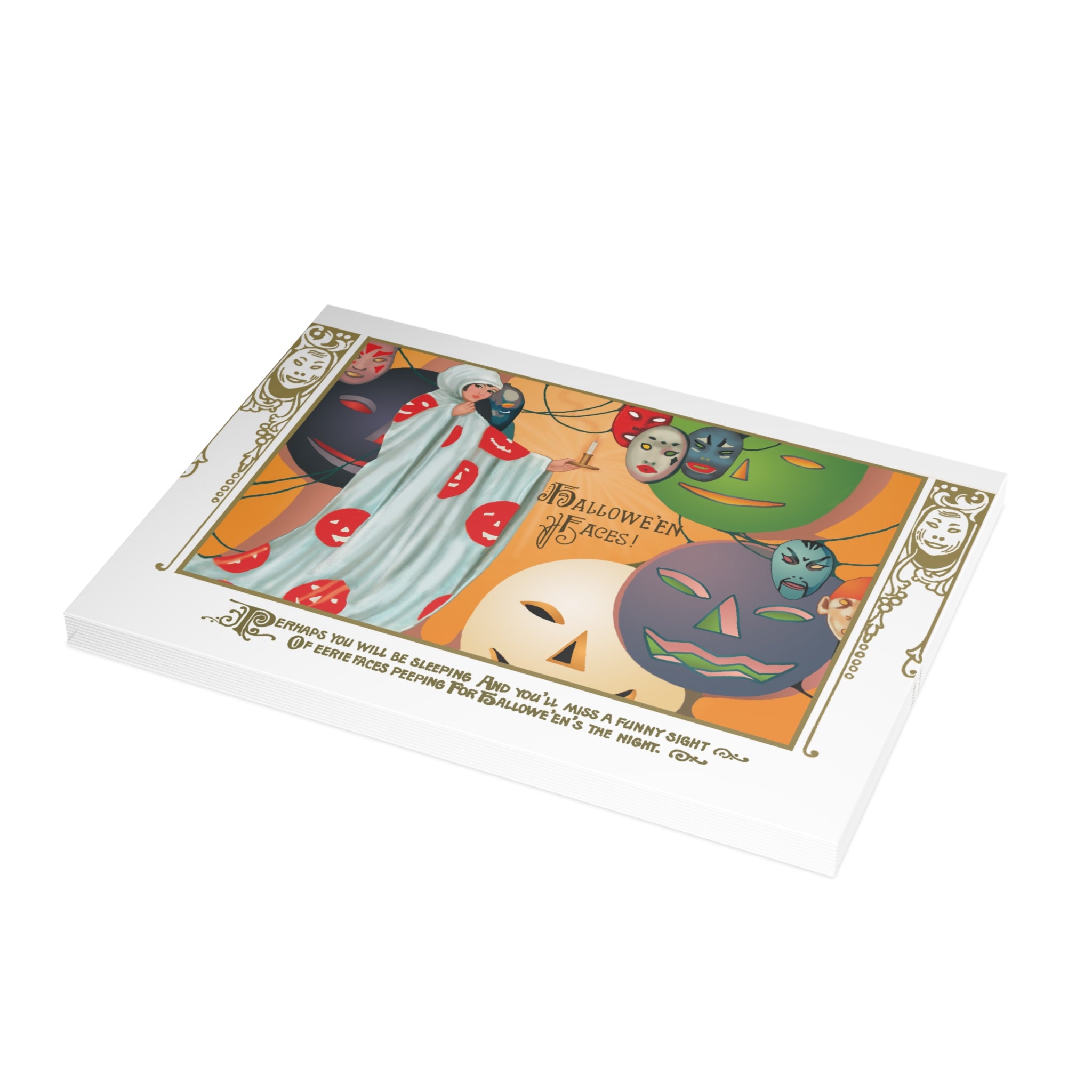 These enchanting Halloween greeting cards bring vintage elegance to every message. Featuring a repainted artwork of a glamorous woman in a floor-length white cape with a dramatic hood, her pumpkin-patterned cloak glows with festive charm as she stands among colorful whimsical masks. A timeless design blending mystery, glamour, and holiday spirit, perfect for greetings, party invites, or simply sharing a touch of seasonal magic.
