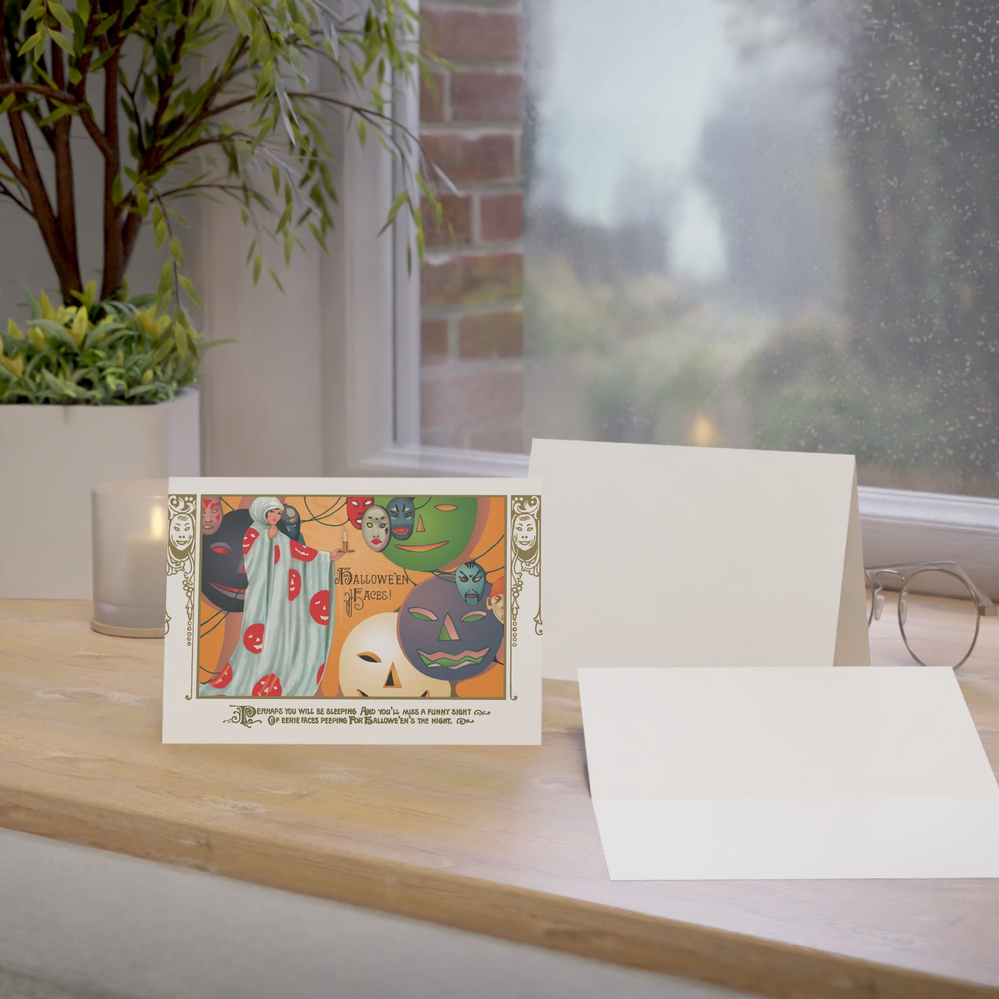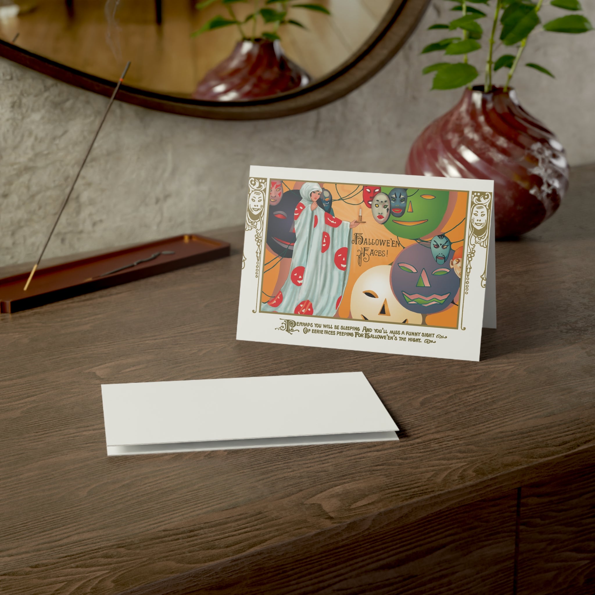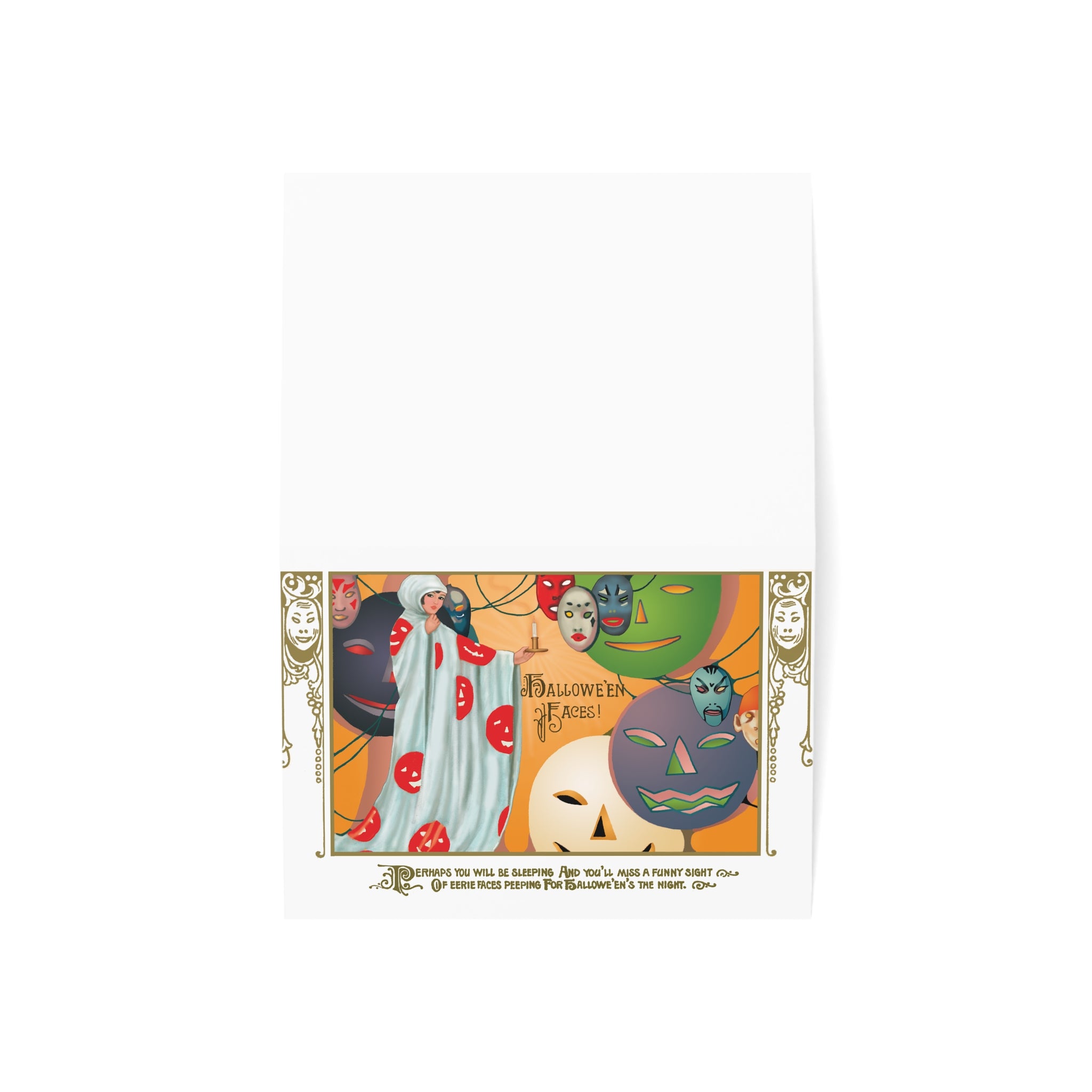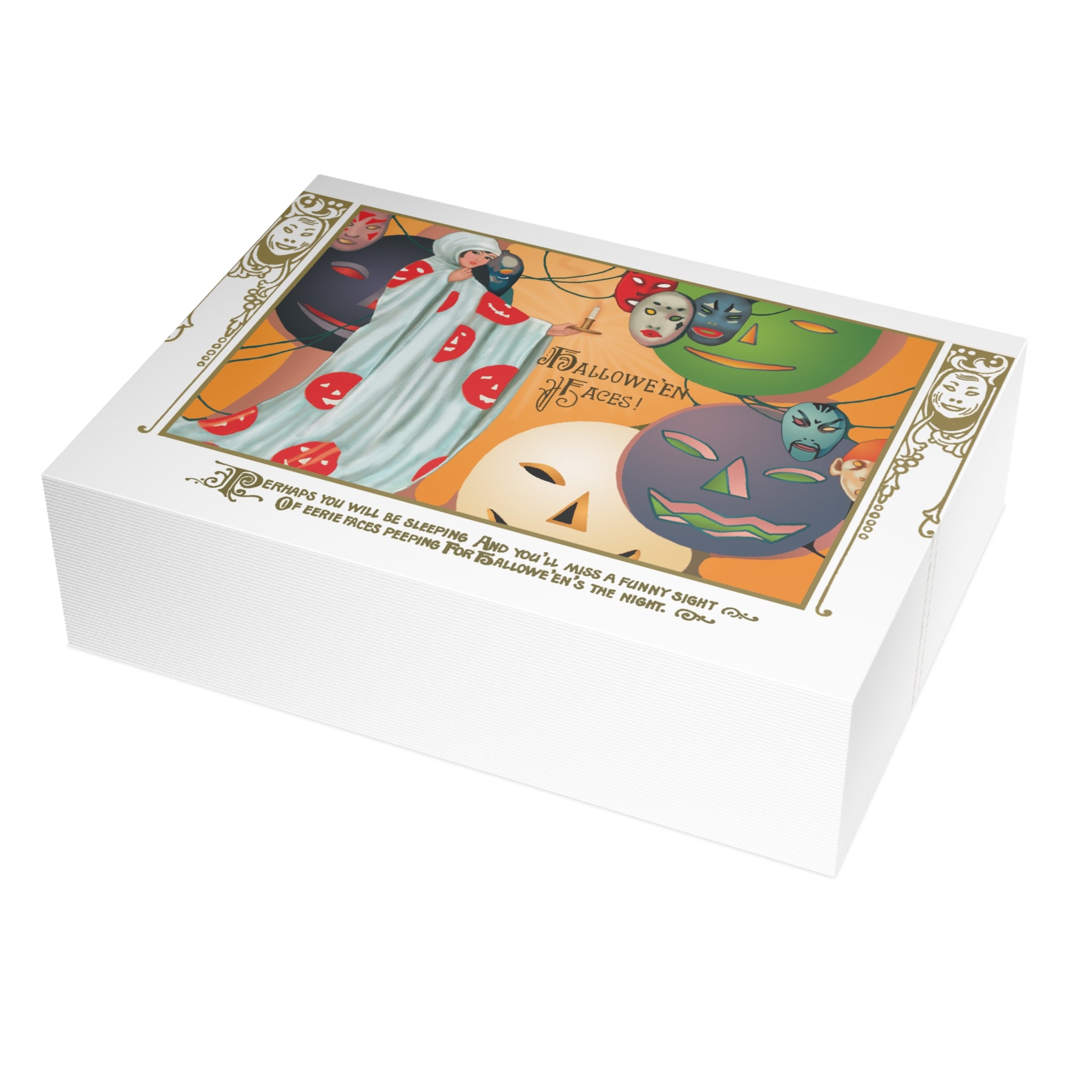 These enchanting Halloween greeting cards bring vintage elegance to every message. Featuring a repainted artwork of a glamorous woman in a floor-length white cape with a dramatic hood, her pumpkin-patterned cloak glows with festive charm as she stands among colorful whimsical masks. A timeless design blending mystery, glamour, and holiday spirit, perfect for greetings, party invites, or simply sharing a touch of seasonal magic.