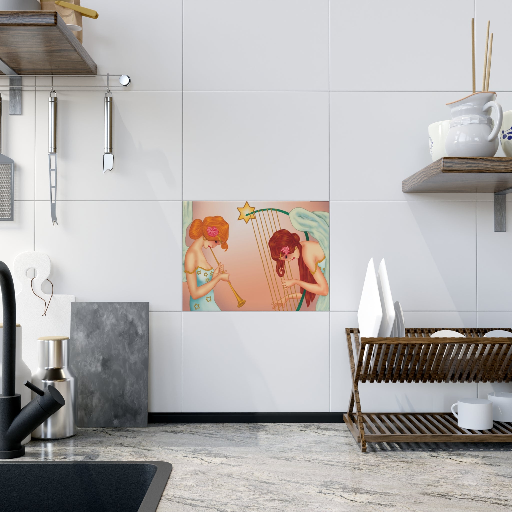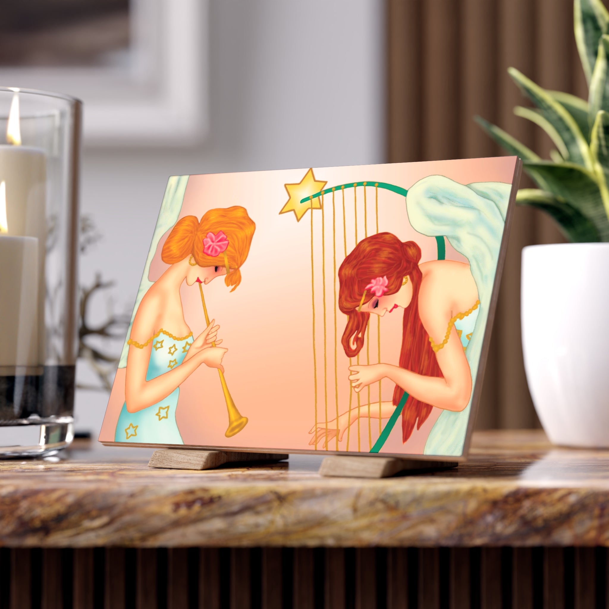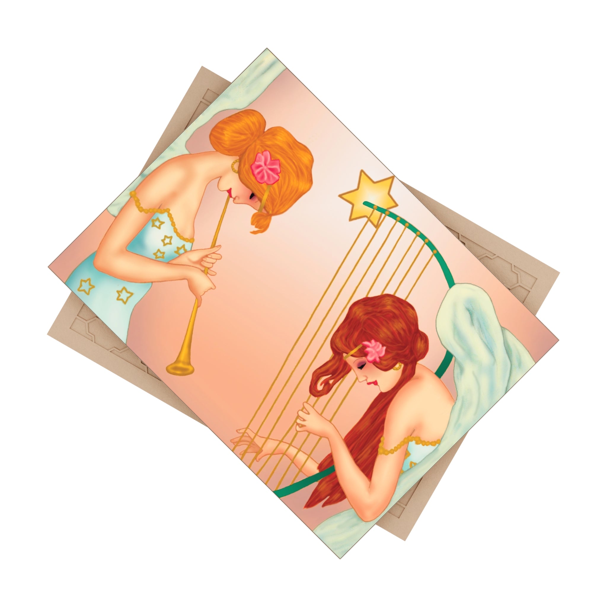 The surface comes alive with the Heavenly Angel Duet – Christmas Harp & Trumpet Artwork. Two graceful angels take center stage, one lifting a golden trumpet while the other gently strums a star-crowned harp. Their flowing gowns shimmer with golden stars, delicate pink flowers adorn their hair, and their soft white wings spread in harmony.