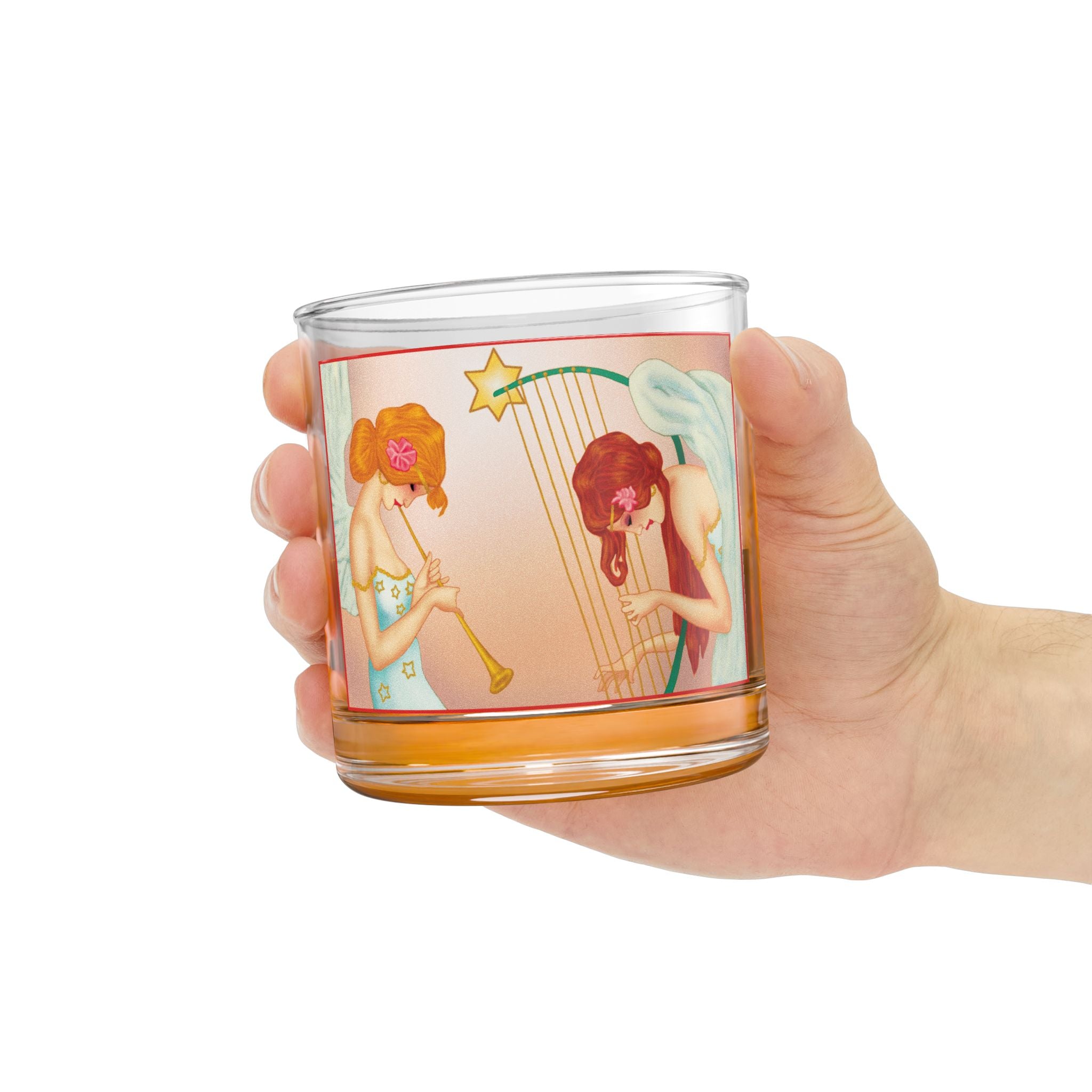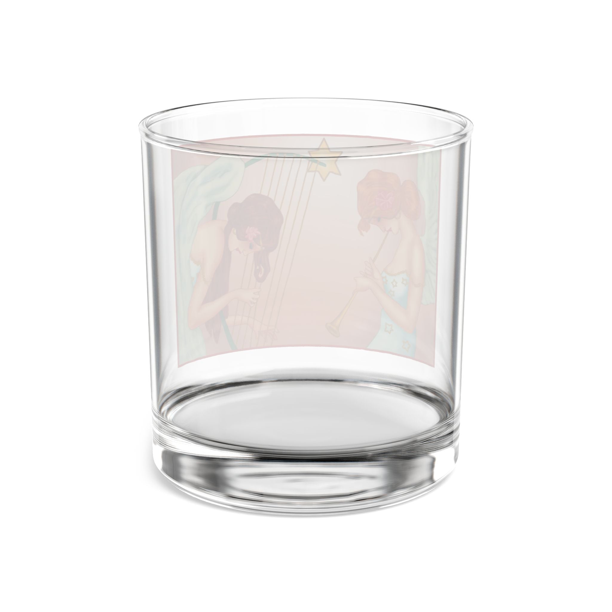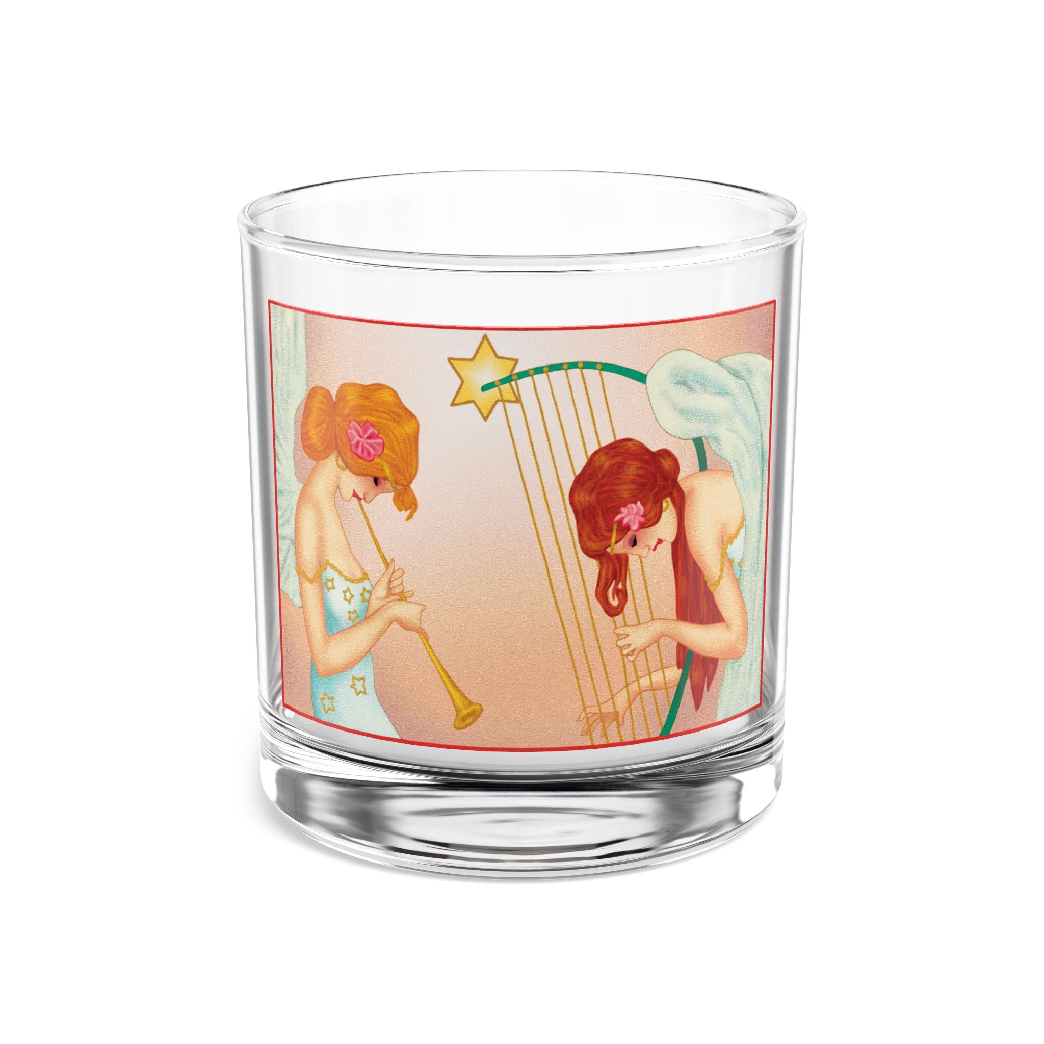 Elevate your holiday gatherings with the Heavenly Angel Duet Rocks Glass, a 10oz vessel crafted from clear tempered glass for both style and durability. Its FDA certification and BPA-free material ensure every sip of your favorite drink is safe and worry-free, while the weight and clarity of the glass make it a timeless choice for festive moments. Wrapped around the surface is a radiant artwork that brings celestial beauty into your season: two graceful angels immersed in music, one sounding a golden trumpet, the other strumming a star-crowned harp. Their flowing gowns shimmer with golden stars, delicate pink flowers crown their hair, and their soft white wings glow against a peach-toned background that radiates warmth and serenity. Together, the craftsmanship of the glass and the elegance of the artwork create a piece that is as practical as it is enchanting—a perfect balance of function and festive artistry.