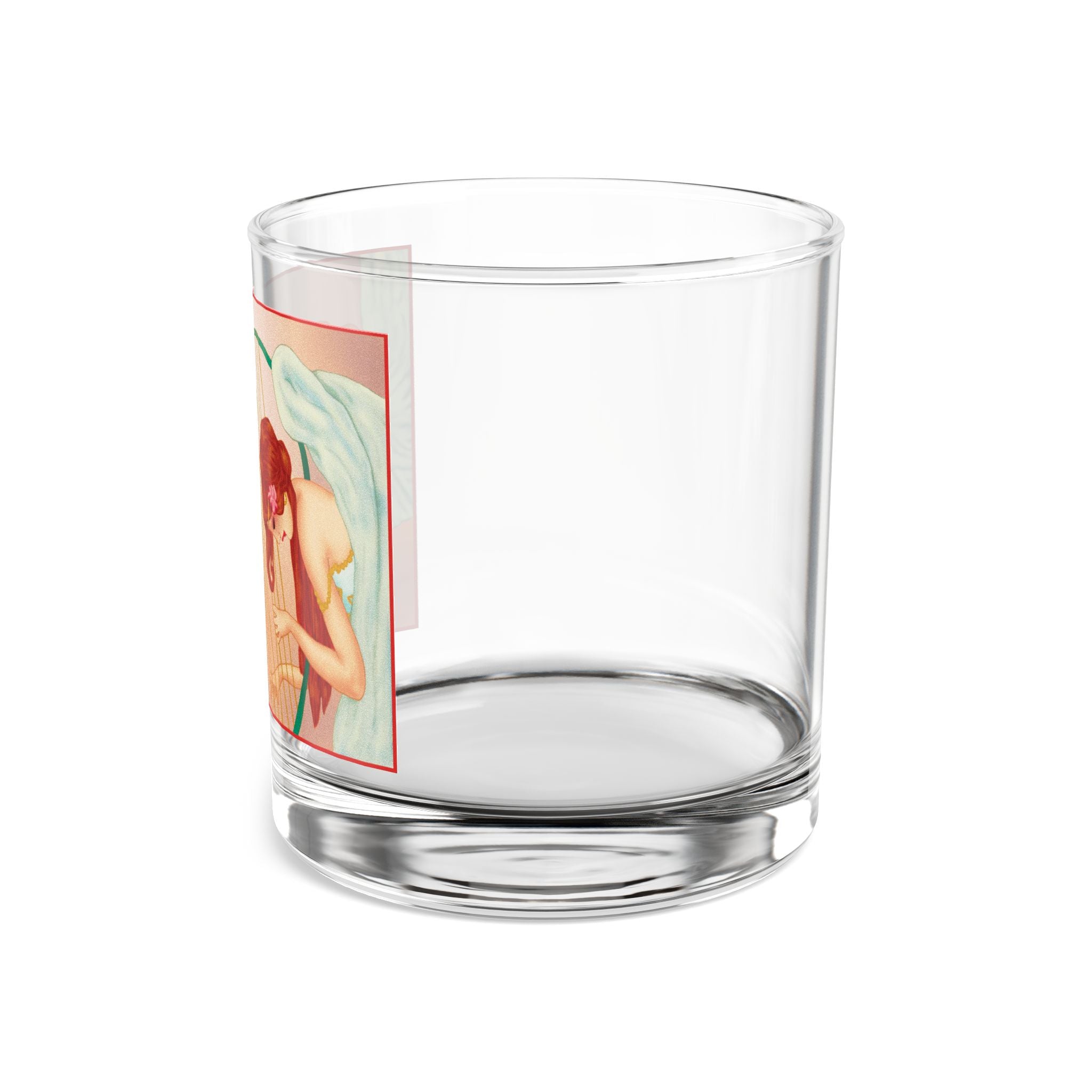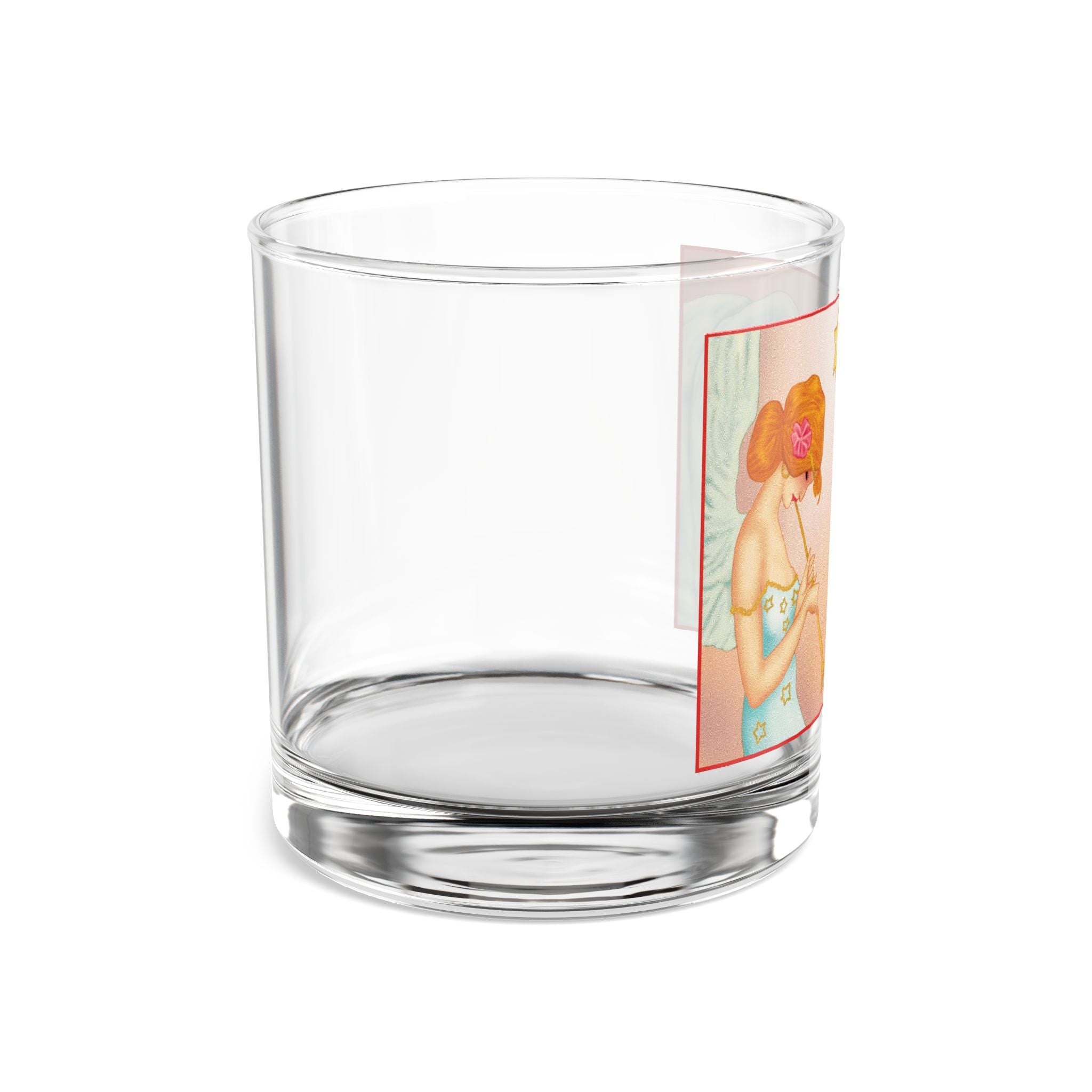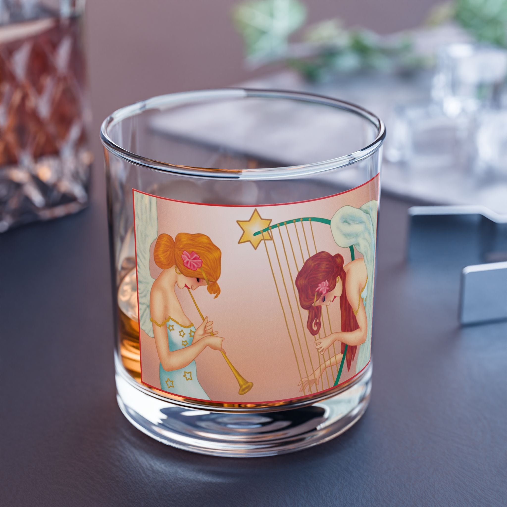Elevate your holiday gatherings with the Heavenly Angel Duet Rocks Glass, a 10oz vessel crafted from clear tempered glass for both style and durability. Its FDA certification and BPA-free material ensure every sip of your favorite drink is safe and worry-free, while the weight and clarity of the glass make it a timeless choice for festive moments. Wrapped around the surface is a radiant artwork that brings celestial beauty into your season: two graceful angels immersed in music, one sounding a golden trumpet, the other strumming a star-crowned harp. Their flowing gowns shimmer with golden stars, delicate pink flowers crown their hair, and their soft white wings glow against a peach-toned background that radiates warmth and serenity. Together, the craftsmanship of the glass and the elegance of the artwork create a piece that is as practical as it is enchanting—a perfect balance of function and festive artistry.